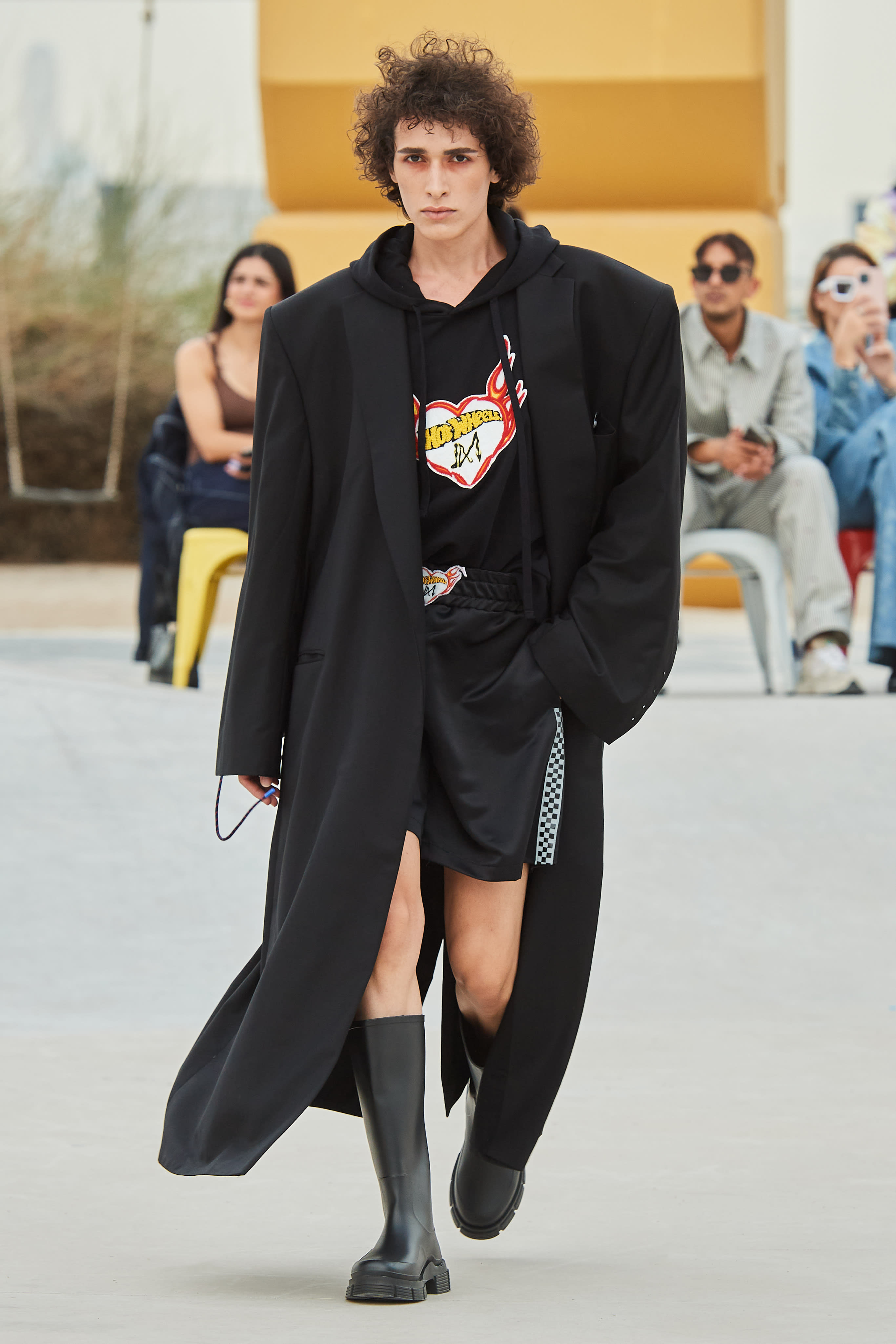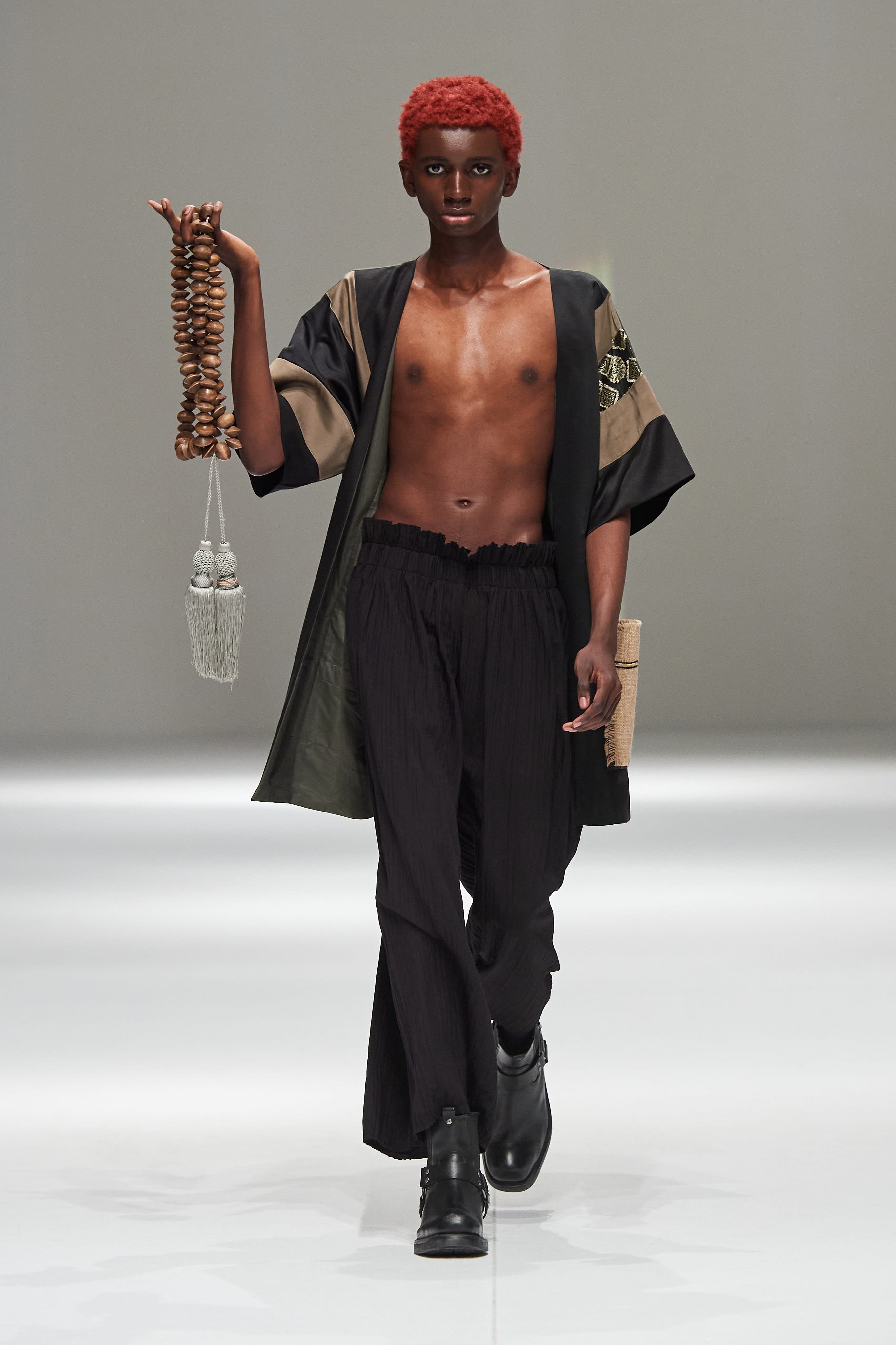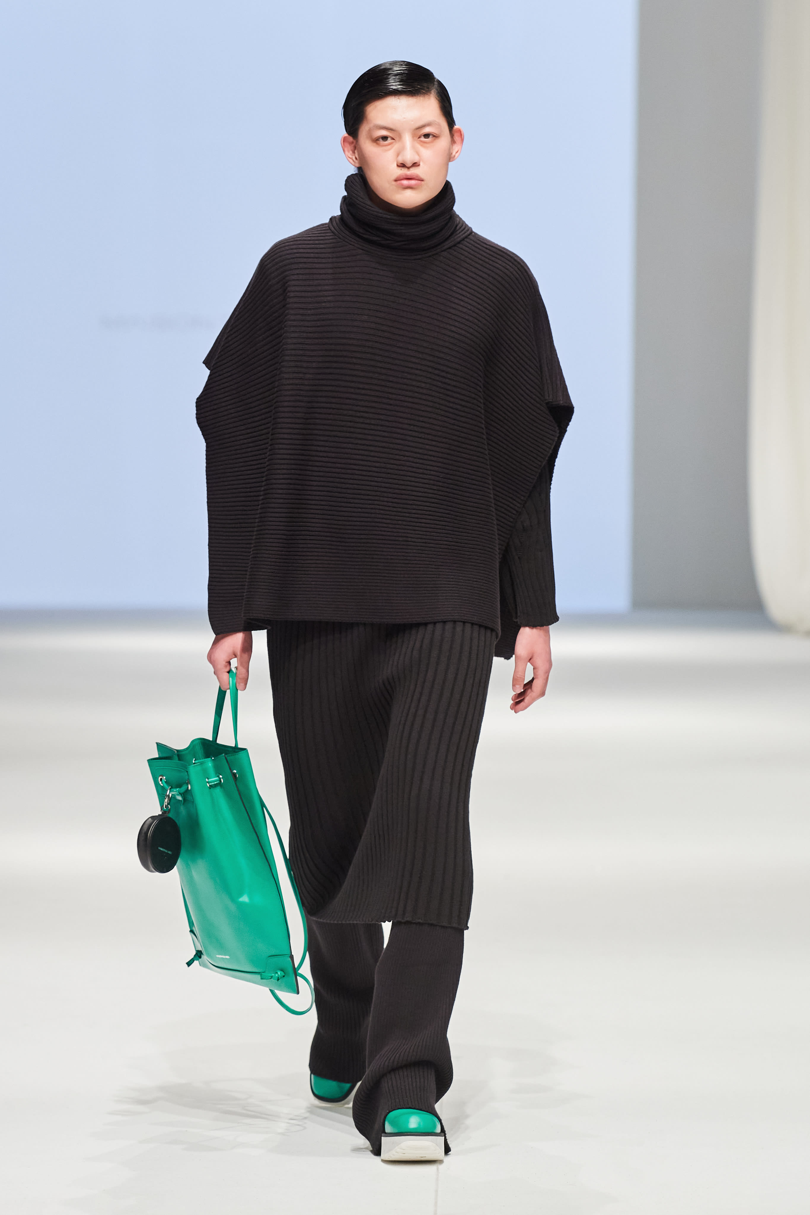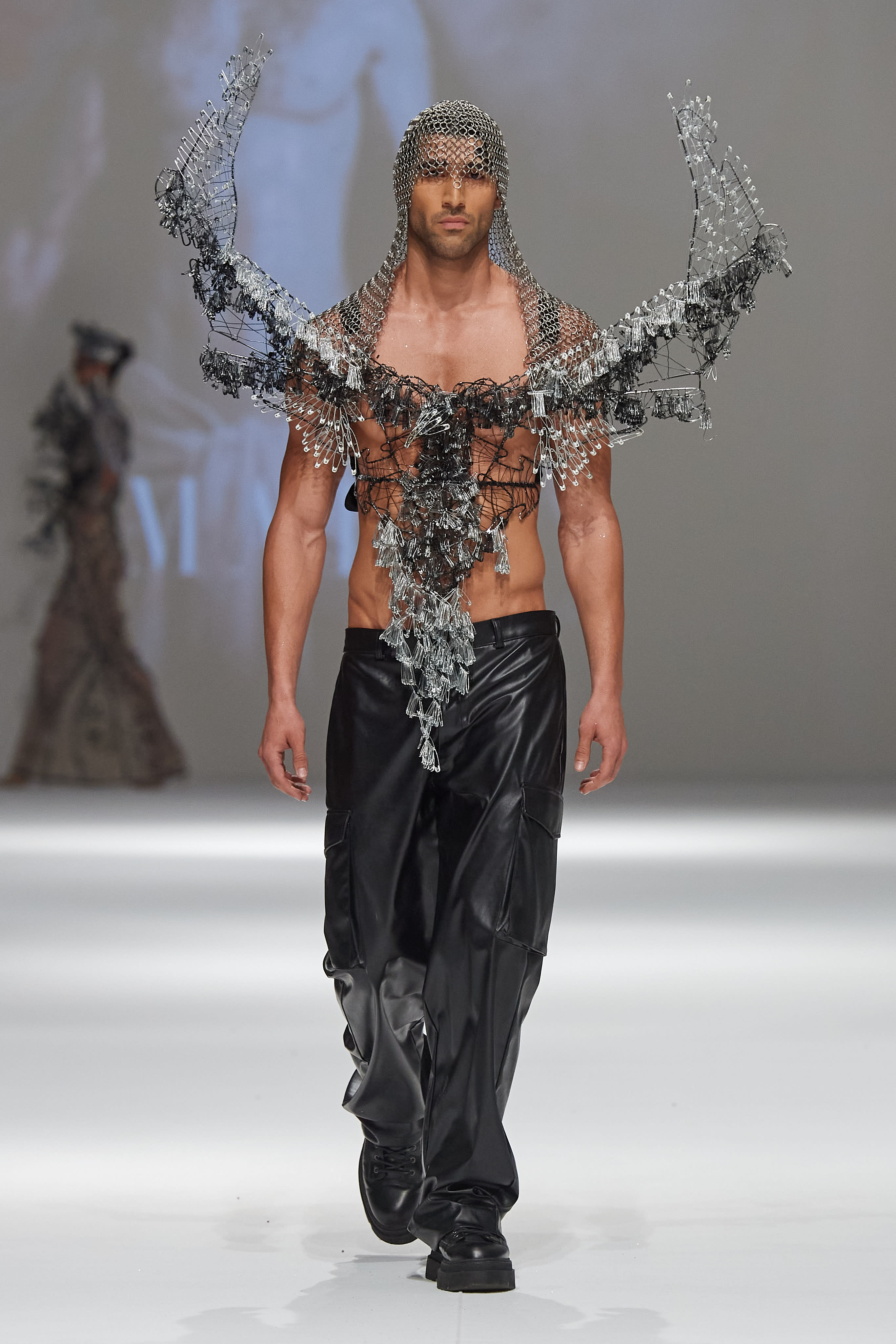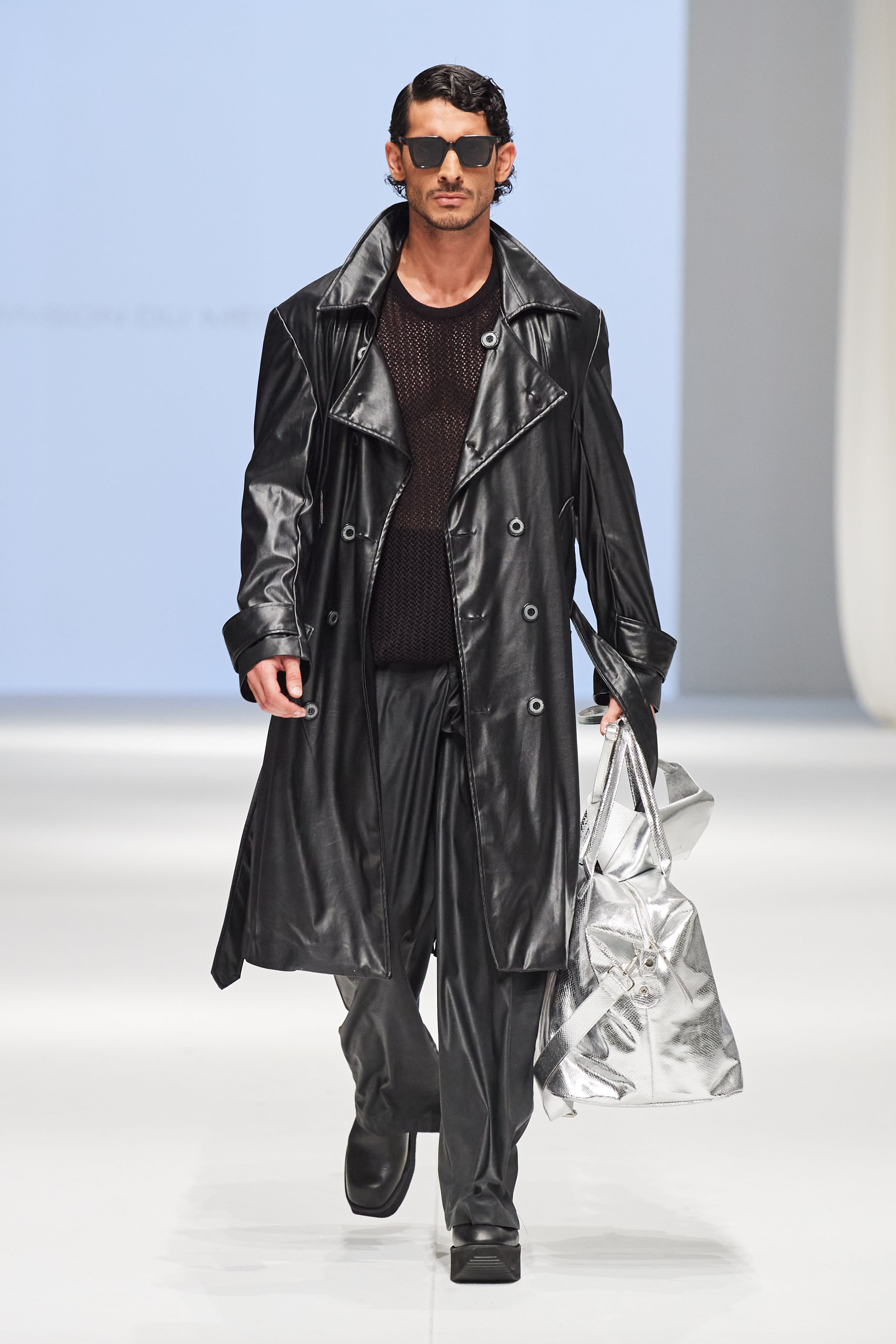 Maison Du Mec's collection showcases a mastery of minimalism and modern art, while staying true to the designer's identity. The collection takes everyday essentials and elevates them into sophisticated, yet simple pieces. The faultlessly tailored jackets, flowy fabrics, and futuristic designs break boundaries on the runway, reflecting the designer's non-conformist approach to fashion. The use of accents such as pink and green, along with hues of silver, grey, and black, uplift the collection, while the leather designs exude rebellion and edginess, perfectly reflecting the brand's signature style.