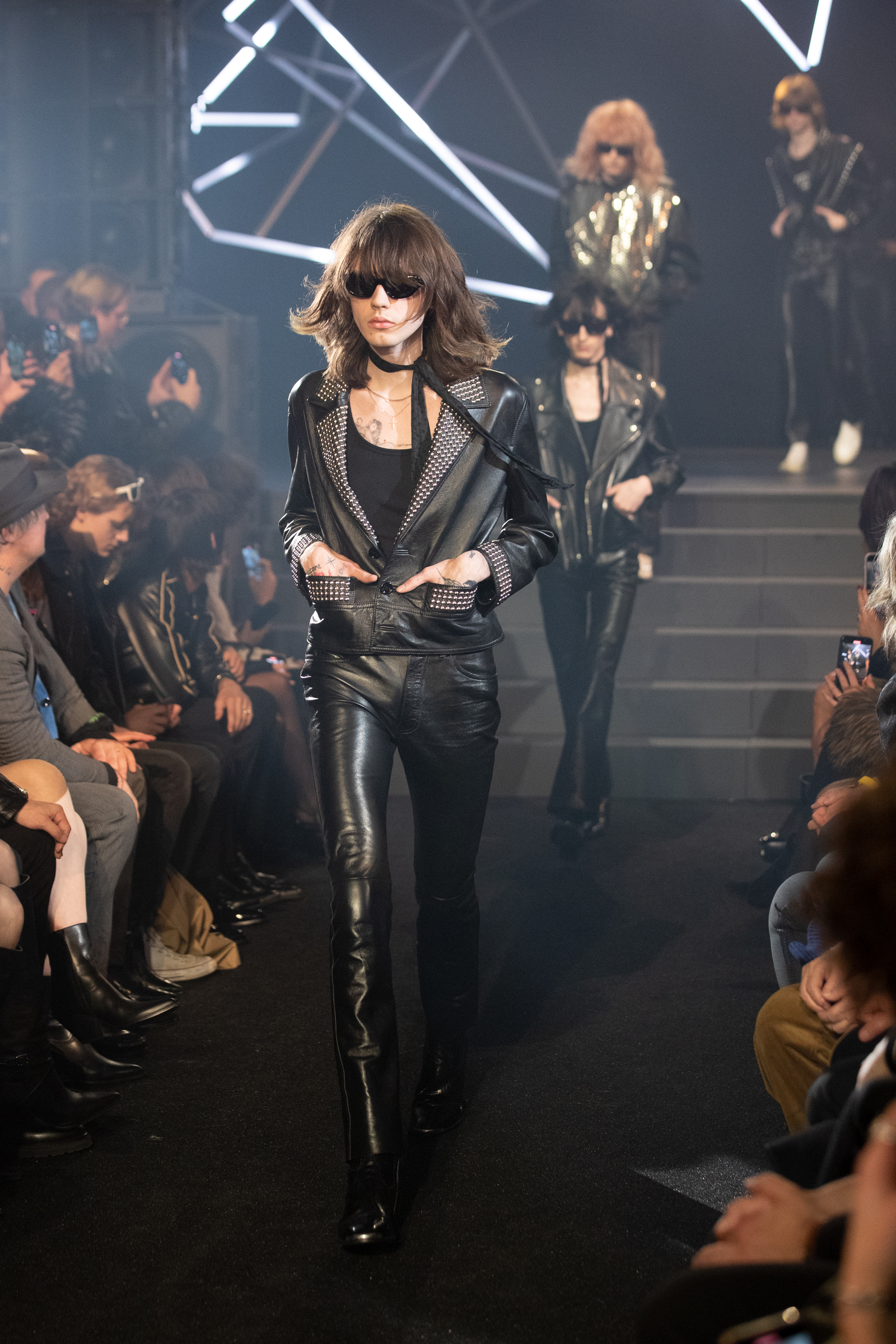 A sixties and seventies straightforwardness is utilised in single-breasted simplicity with gently flared trousers in suiting realised in off tones of rich wool melange. Here Nureyev's style and that of the practising dancer come into play, an attitude also seen in zipped wool jumpsuits and shorts, second-skin ribbed knits and duffle-inflected outerwear together with sumptuous leathers.