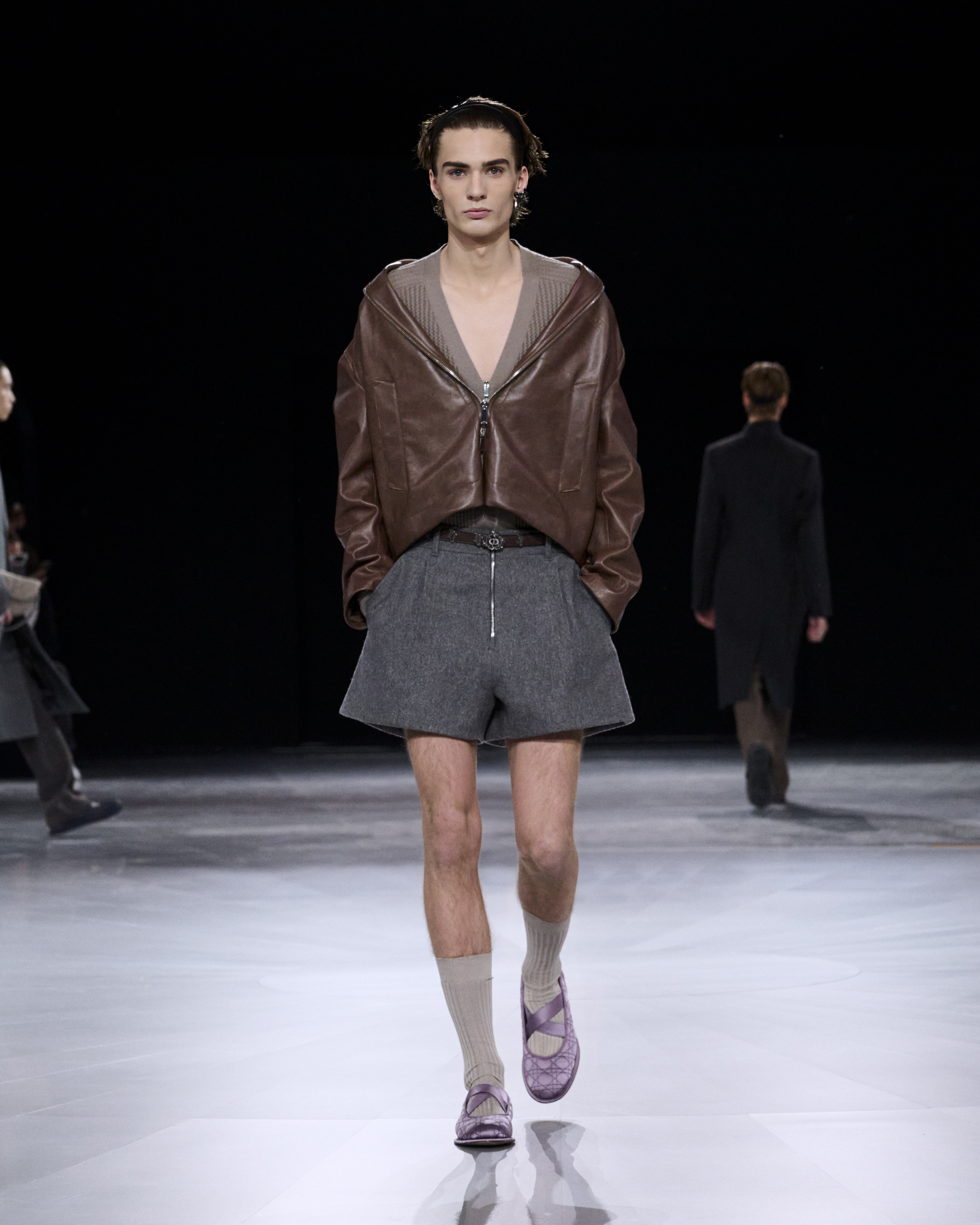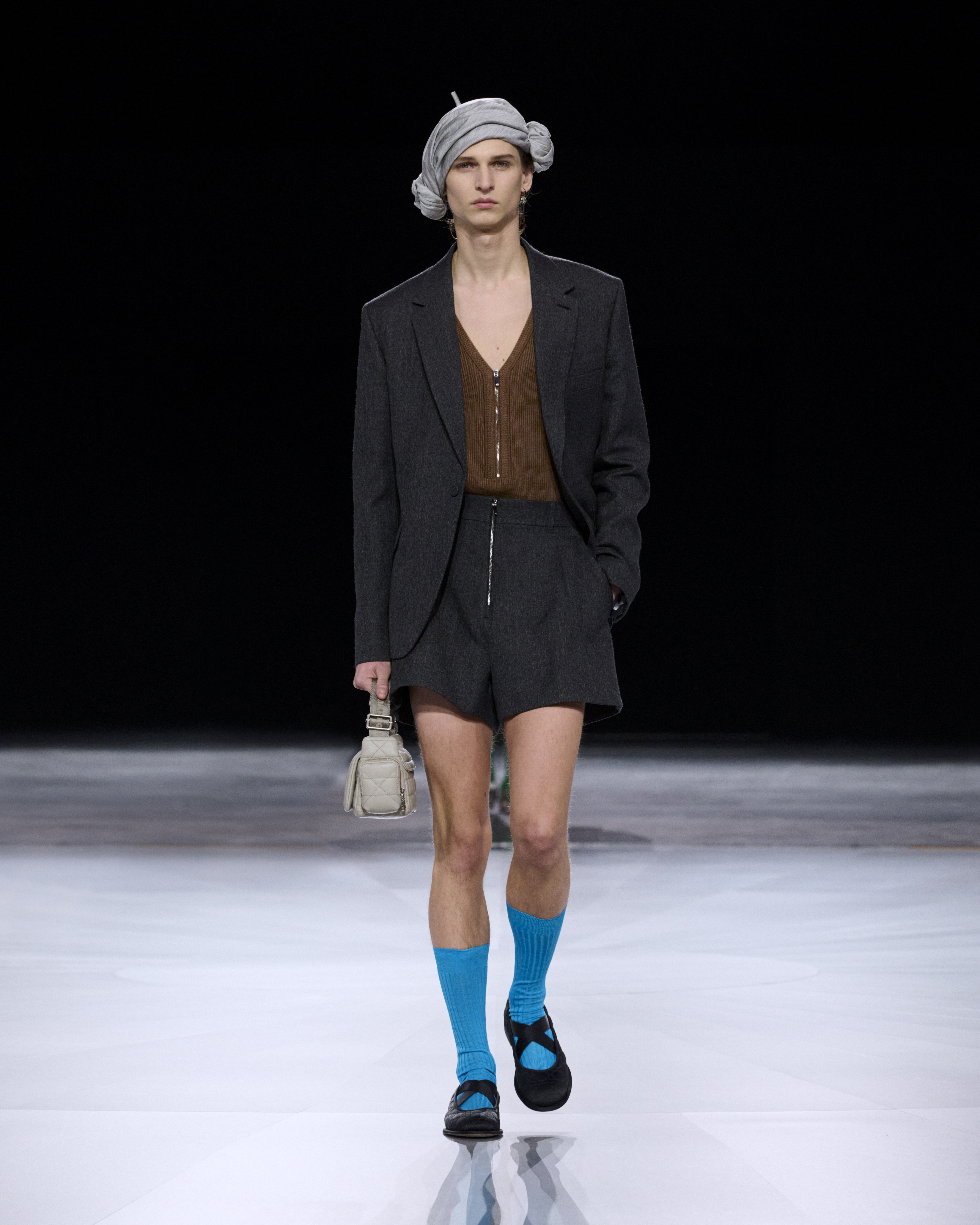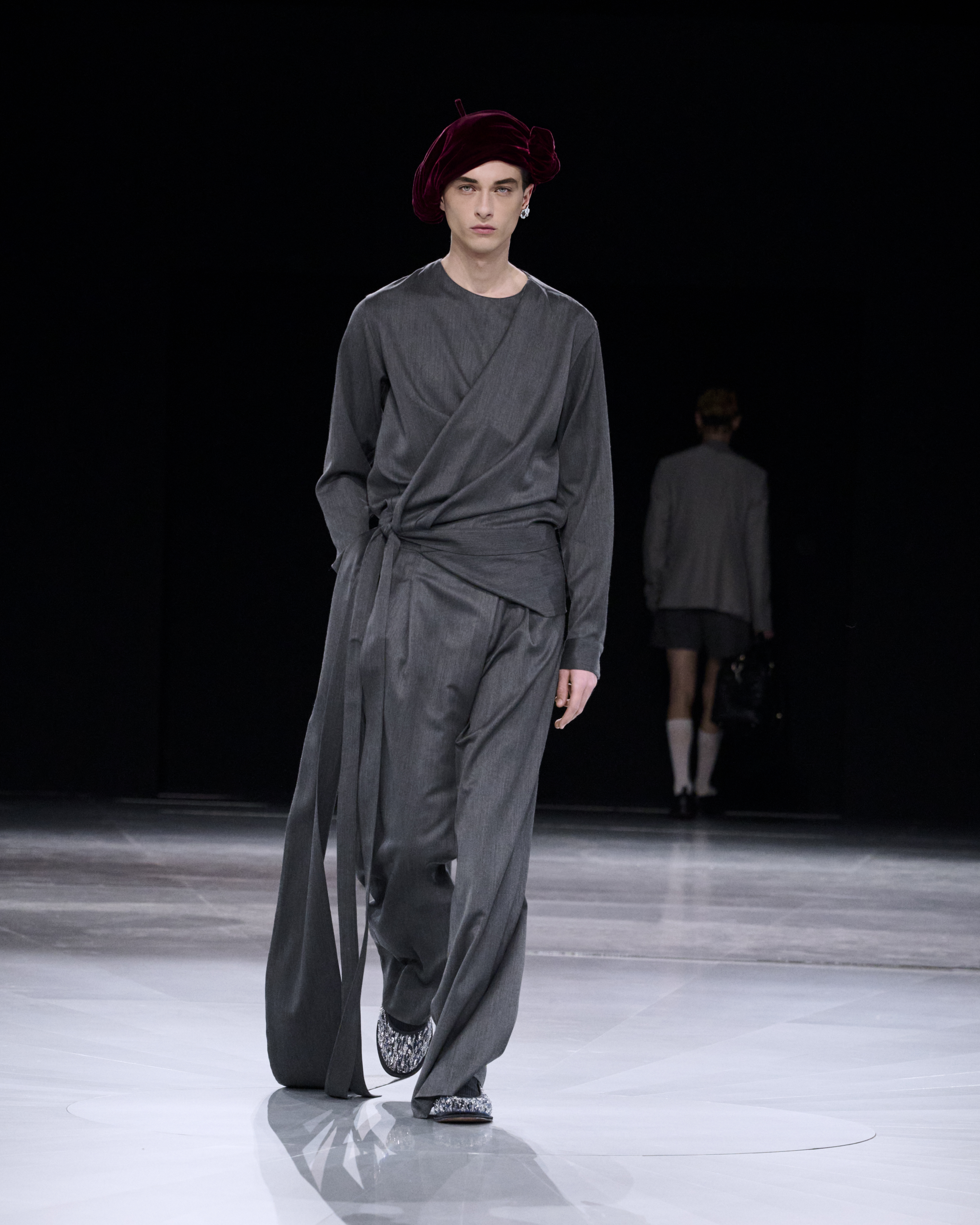 Accessories echo at once the simplicity, discipline and extravagance of the two worlds, sometimes at the same time. Echoing a dancing slipper while also drawing on masculine eveningwear traditions, a rigorous san crispino leather construction is contrasted with a silk-polyester Mary-Jane sneaker for men in the shoes. Softly constructed utilitarian bags that amplify house codes, such as oversized grained macrocannage camera and bum bags. Sumptuous velvet hats, originally designed by Stephen Jones in 1999 for Dior womenswear, now also find a masculine form as a twisted silk jersey dancer's turban.