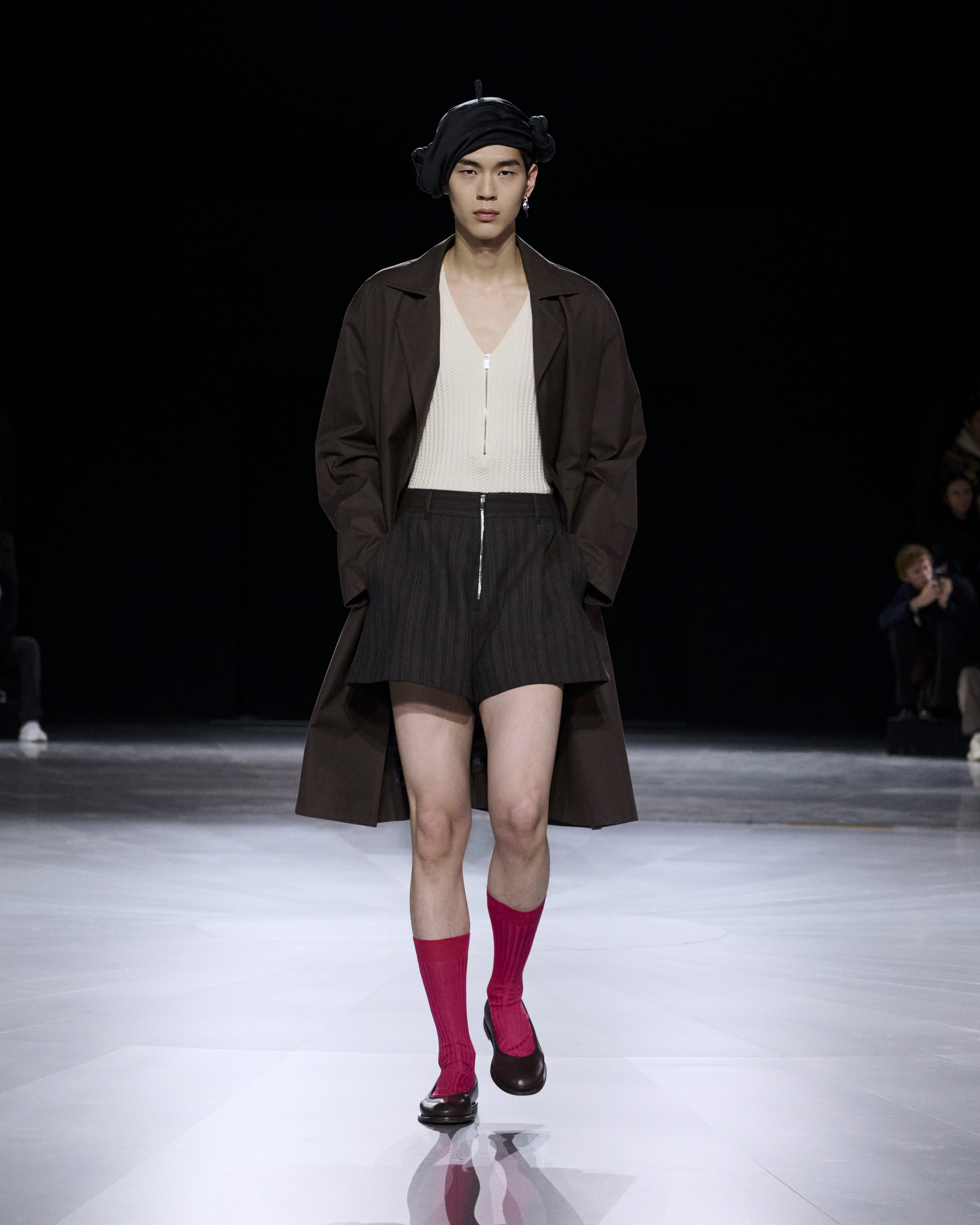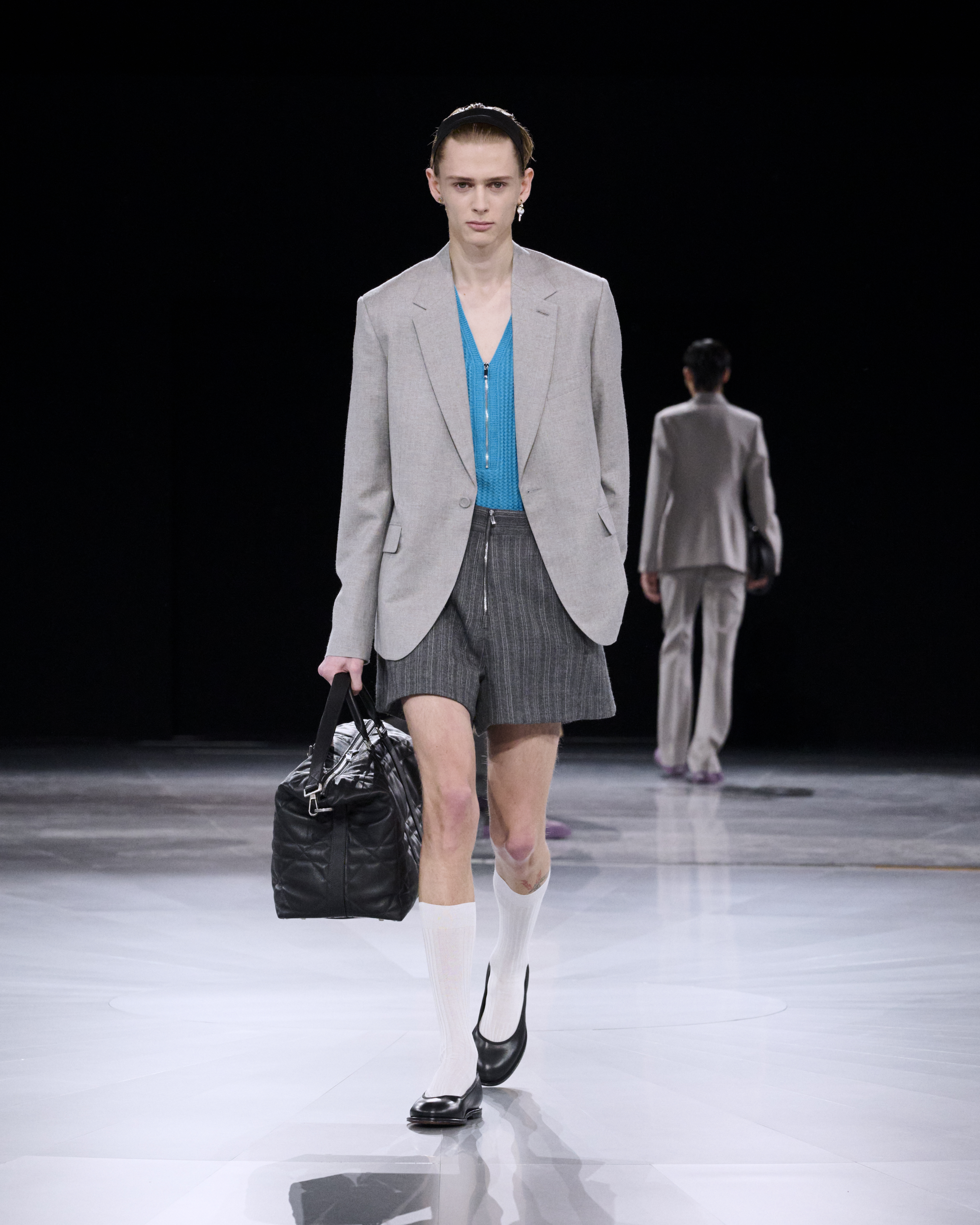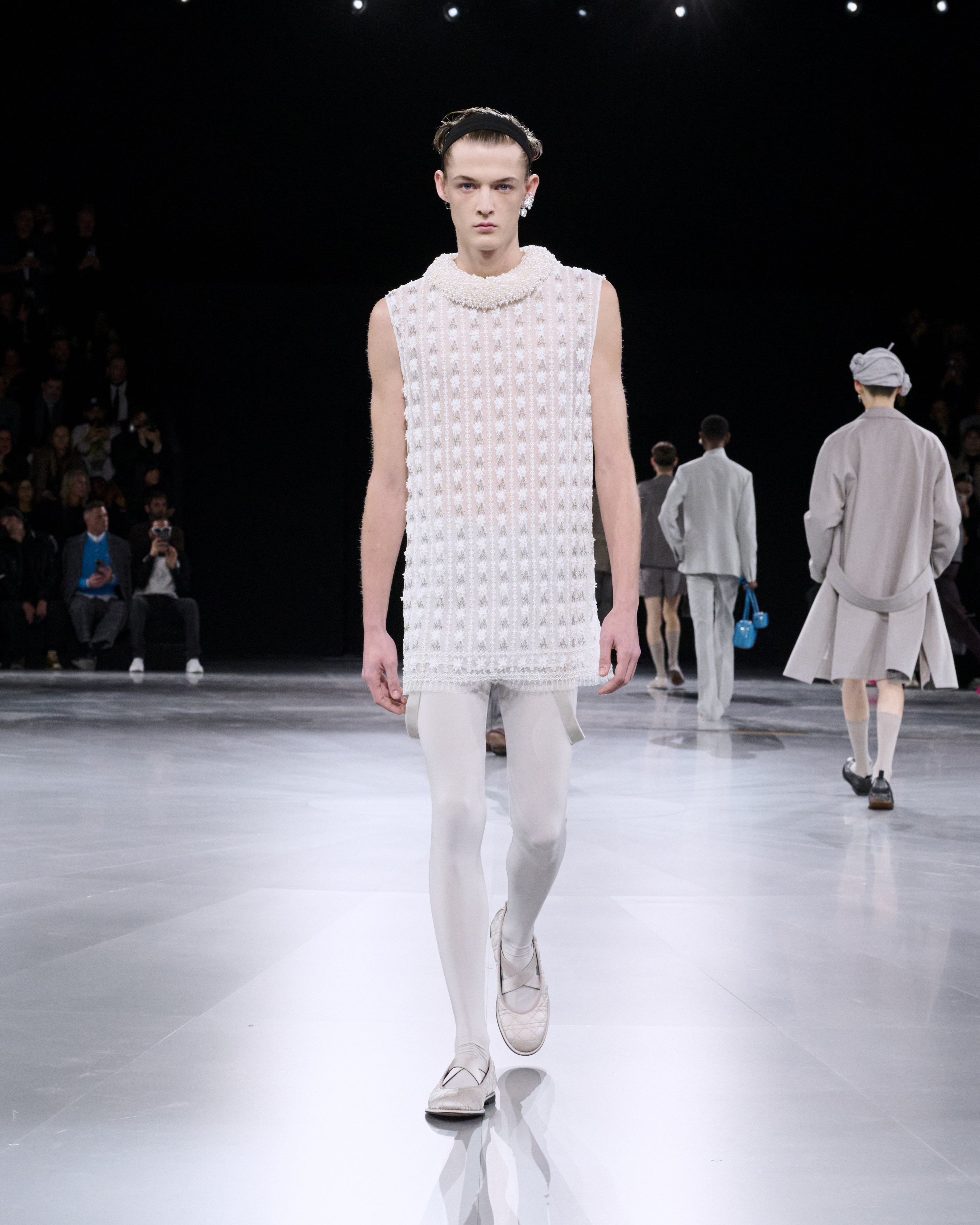Accessories echo at once the simplicity, discipline and extravagance of the two worlds, sometimes at the same time. Echoing a dancing slipper while also drawing on masculine eveningwear traditions, a rigorous san crispino leather construction is contrasted with a silk-polyester Mary-Jane sneaker for men in the shoes. Softly constructed utilitarian bags that amplify house codes, such as oversized grained macrocannage camera and bum bags. Sumptuous velvet hats, originally designed by Stephen Jones in 1999 for Dior womenswear, now also find a masculine form as a twisted silk jersey dancer's turban.