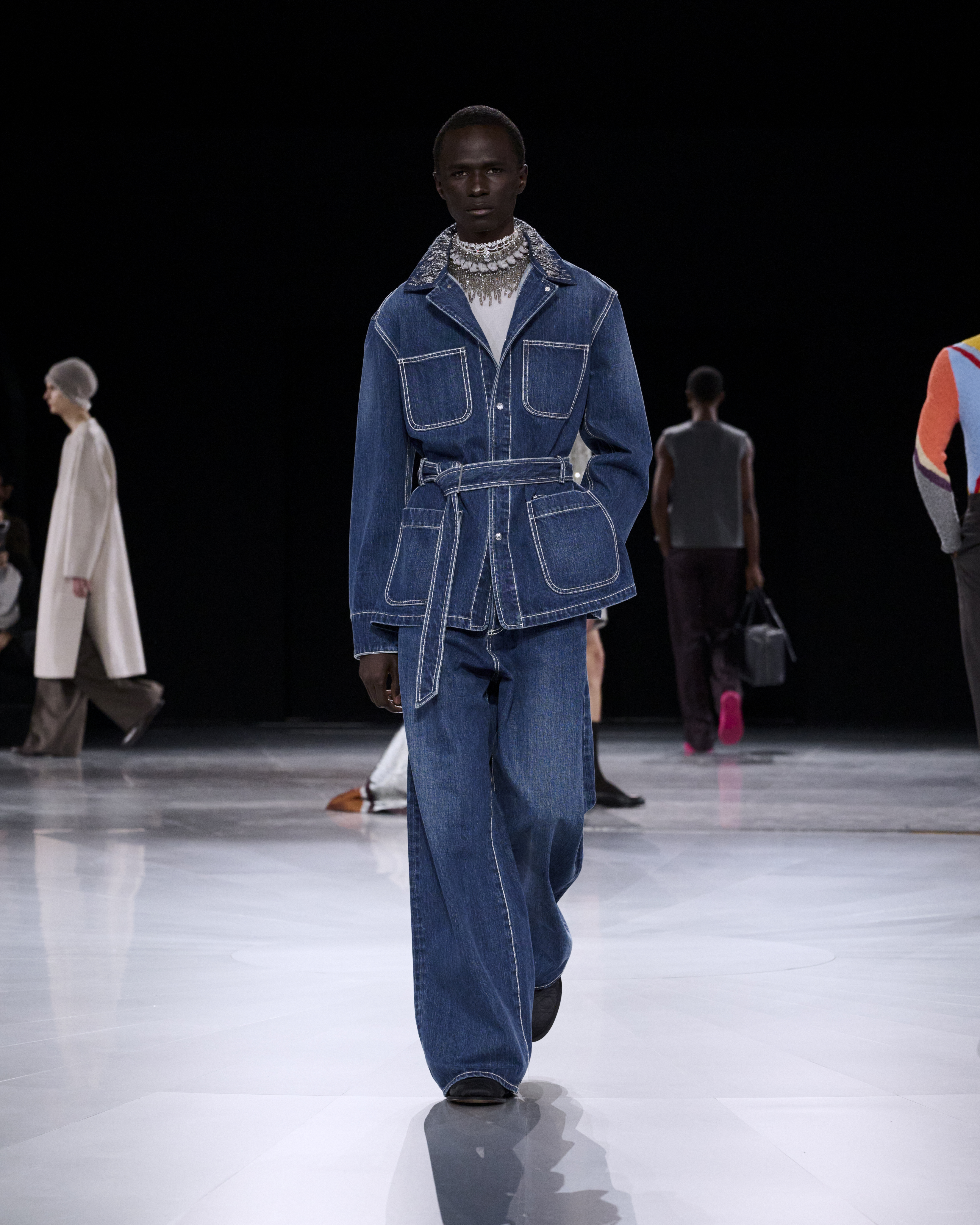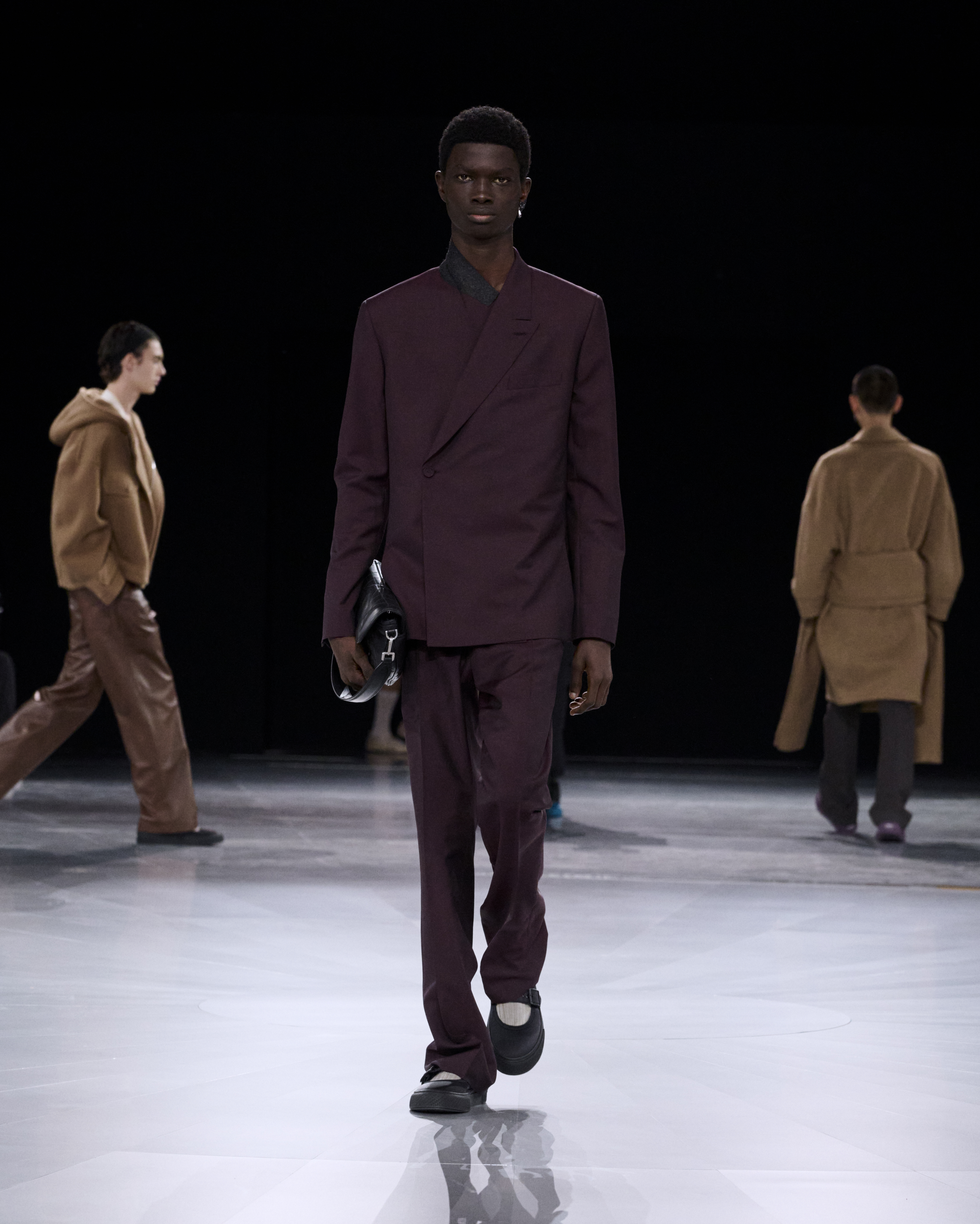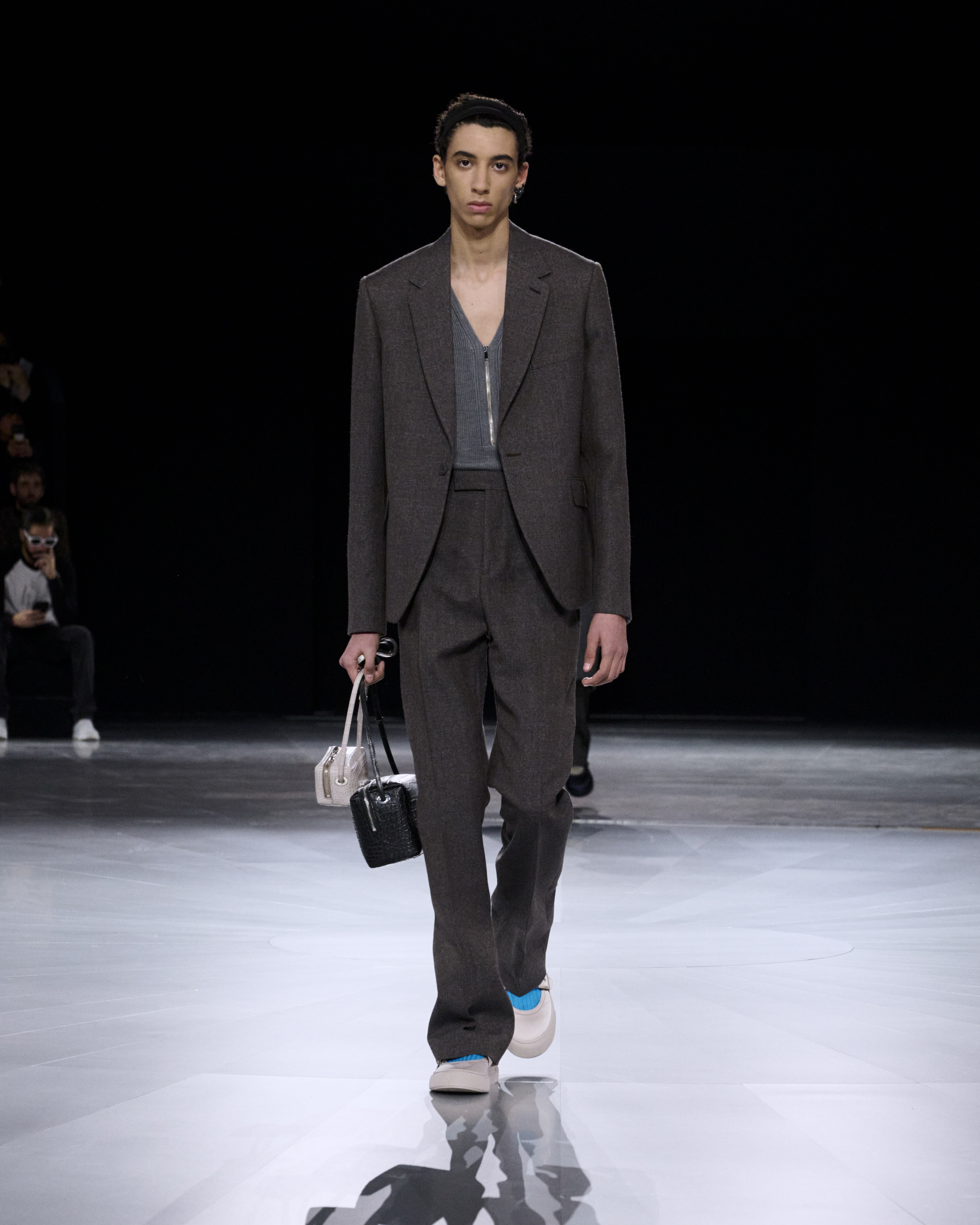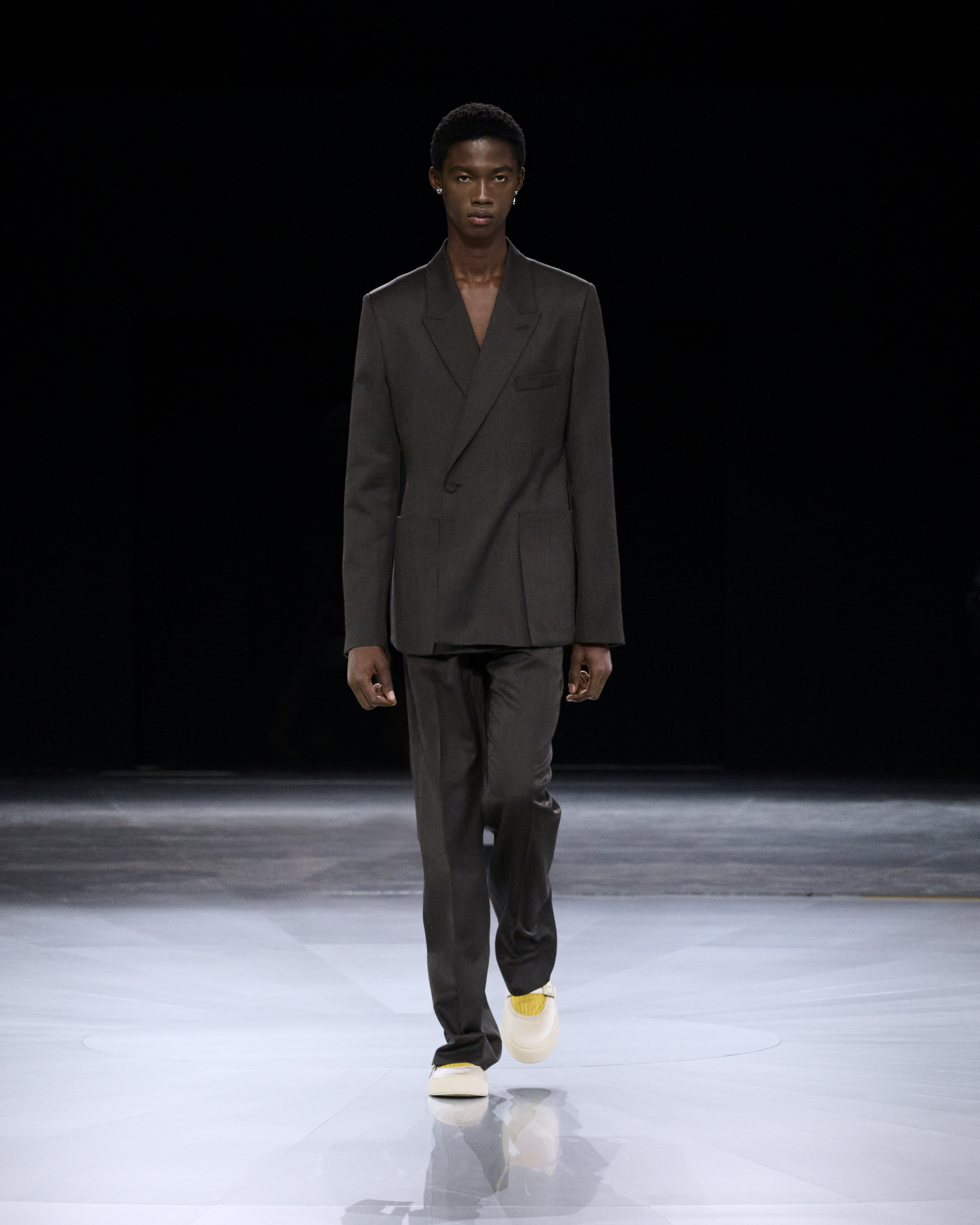 Once more drawing on the Dior archive inspiration, Saint Laurent's tailoring is again transmuted into the men's world, with a particular focus on his volumes, vents, pleats and necklines that run throughout. While Monsieur Dior's Bar features a new masculine iteration that combines with Jones' own Oblique - present from his collection for Dior - with its characteristic extended double-breated wrap united with a fluid bar waist curve.