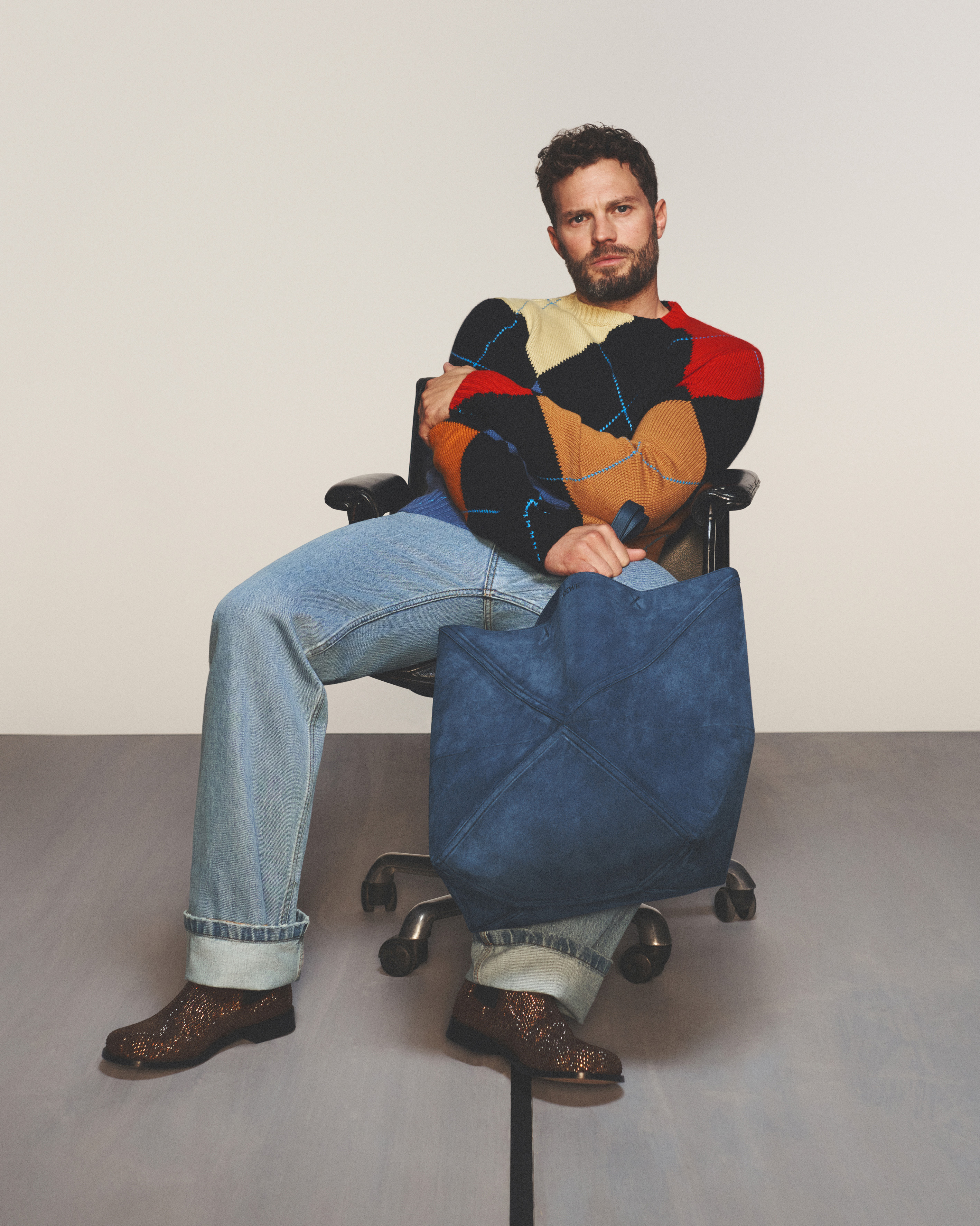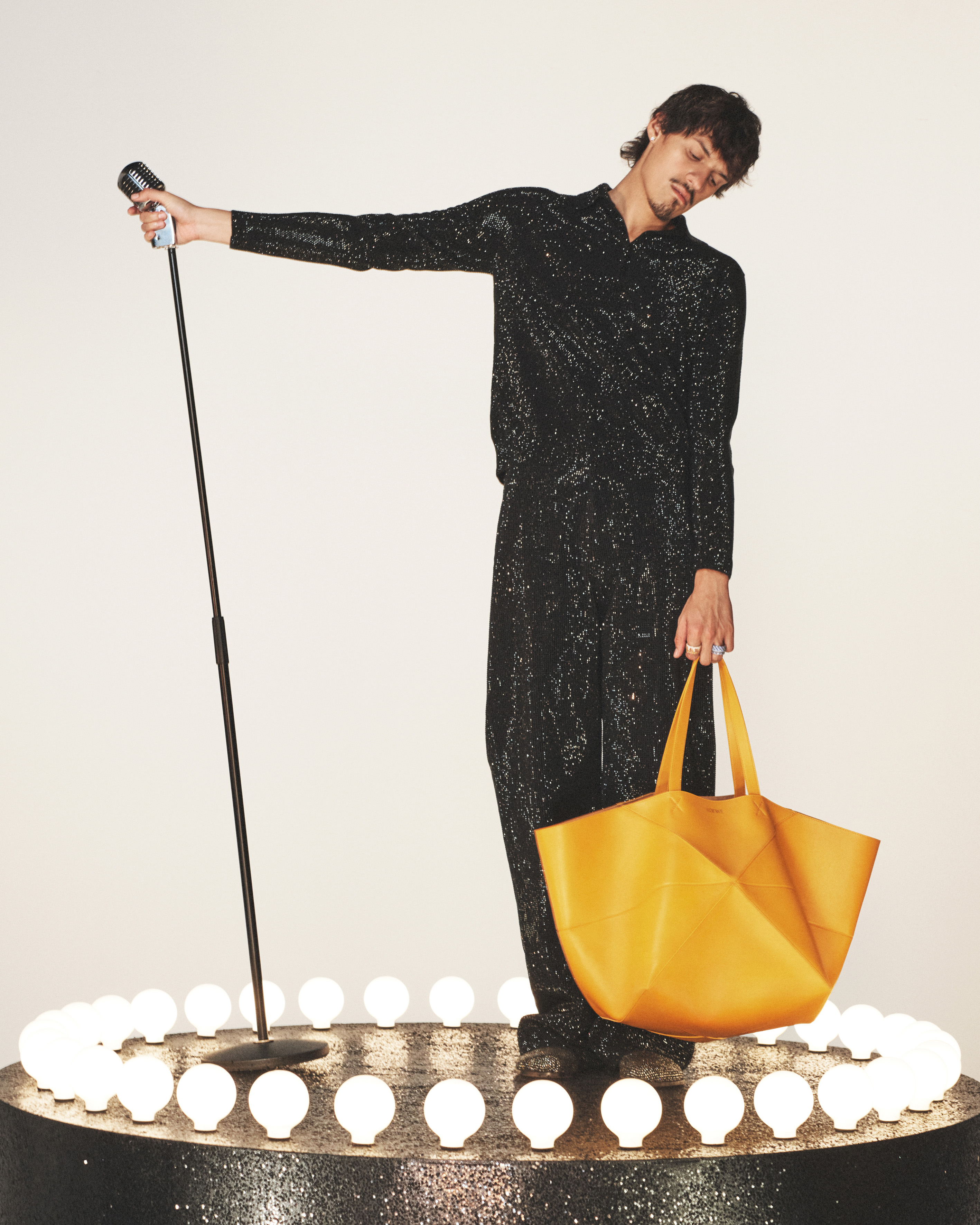 Protagonists of the images are Golden-Globe nominated actor, and newly appointed LOEWE Global Brand Ambassador, Jamie Dornan and singer and songwriter Omar Apollo: each one of them caught in a moment, mid-performance. Pensive and intense, Jamie is pictured as though he’s at an audition or screen test, leaning on a beaten leather chair in a non-descript environment, resting on a wall, sitting on a ladder in what looks like an atelier. Omar, in turn, is pictured performing on a circular stage lit by bulbs, a chrome microphone in his hand, or entering a glittery room. Expressions are intense, time seems to have been frozen. The intimacy of conversational emotion and the raw energy of performing come forward. The leathers, the knits, and the glittery surfaces of the clothes Jamie and Omar wear are depicted in their eerie normality, their textures becoming evident, while accessories create further nuance to the characters, suggesting other gestures: the Screen sunglasses shielding the gaze, the Puzzle Fold tote and the Puzzle bag held in the hands as the bodies lean. The still-life pictures are just as performative, depicting bags and shoes as caught in action too: collapsing, folding, standing on a podium.
