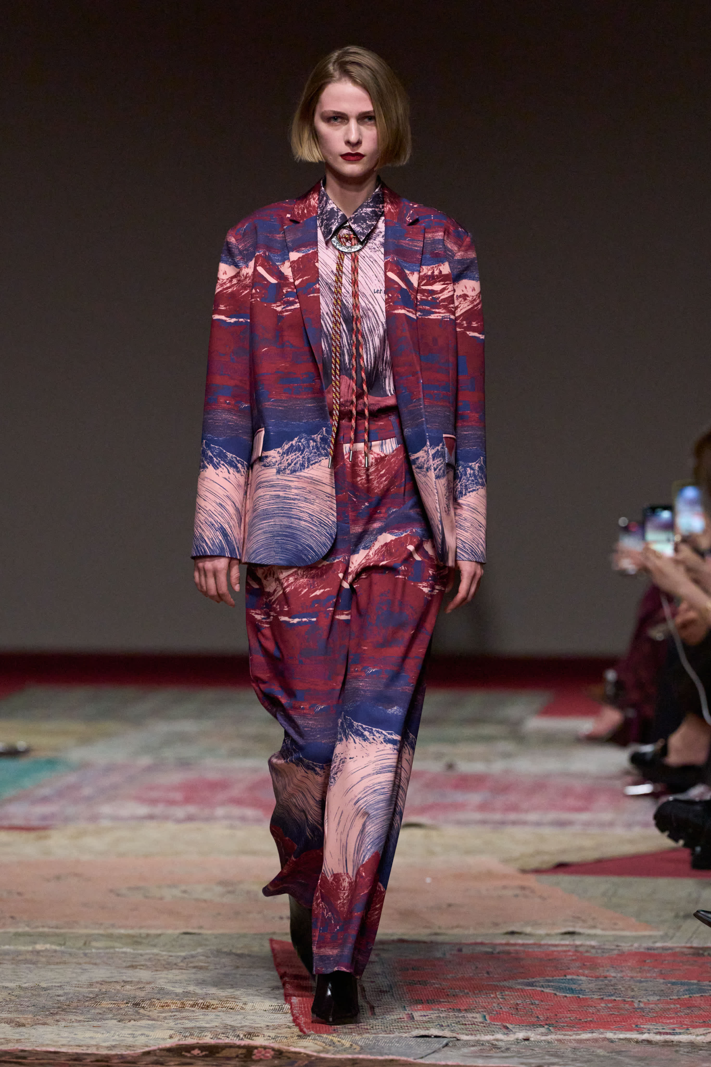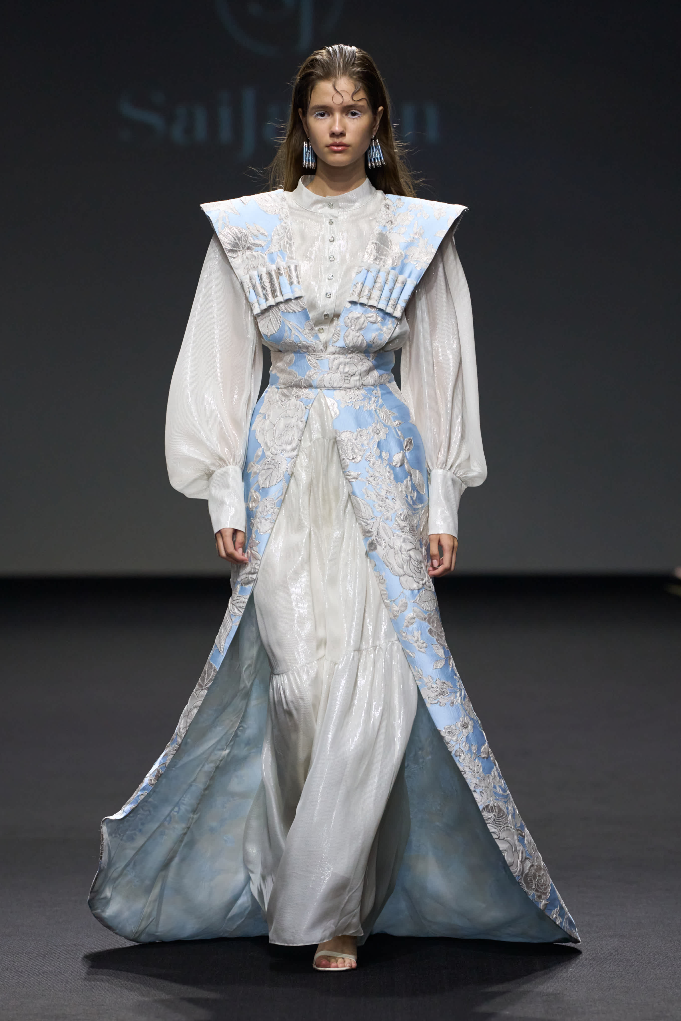 SaiJamin’s ‘Adiyuh: Memories and Dreams’ was a deeply personal collection, paying tribute to designer Jamilya Afashagova’s childhood and the influence of her father. Inspired by an old Kabardian song, the collection embraced nostalgia with flowing silk and jacquard fabrics in shades of blues, pinks, whites, and blacks — echoing the natural beauty of the Caucasus. The interplay of tradition and modernity reflected the designer’s heartfelt homage to independence, heritage, and emotional storytelling through fashion.