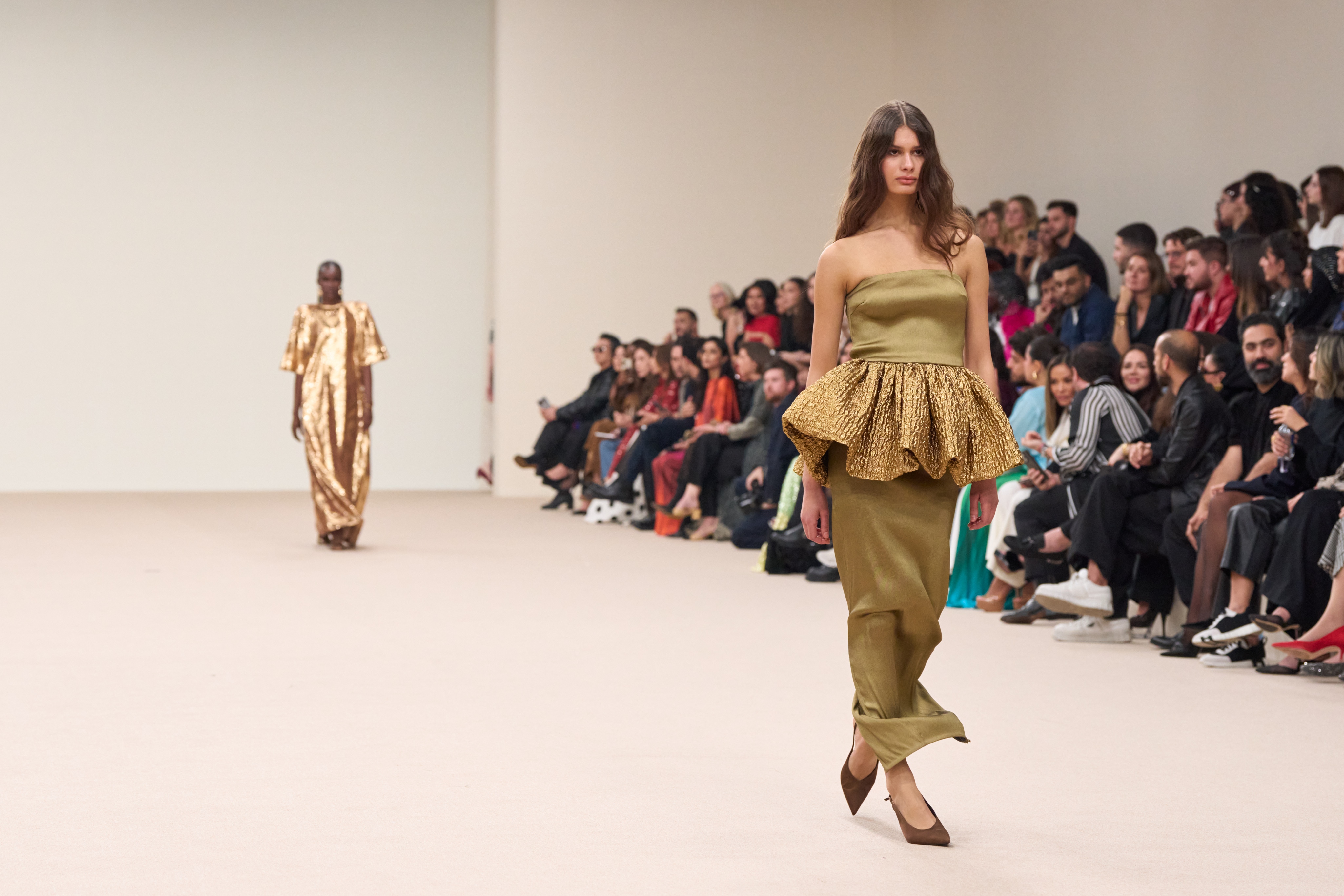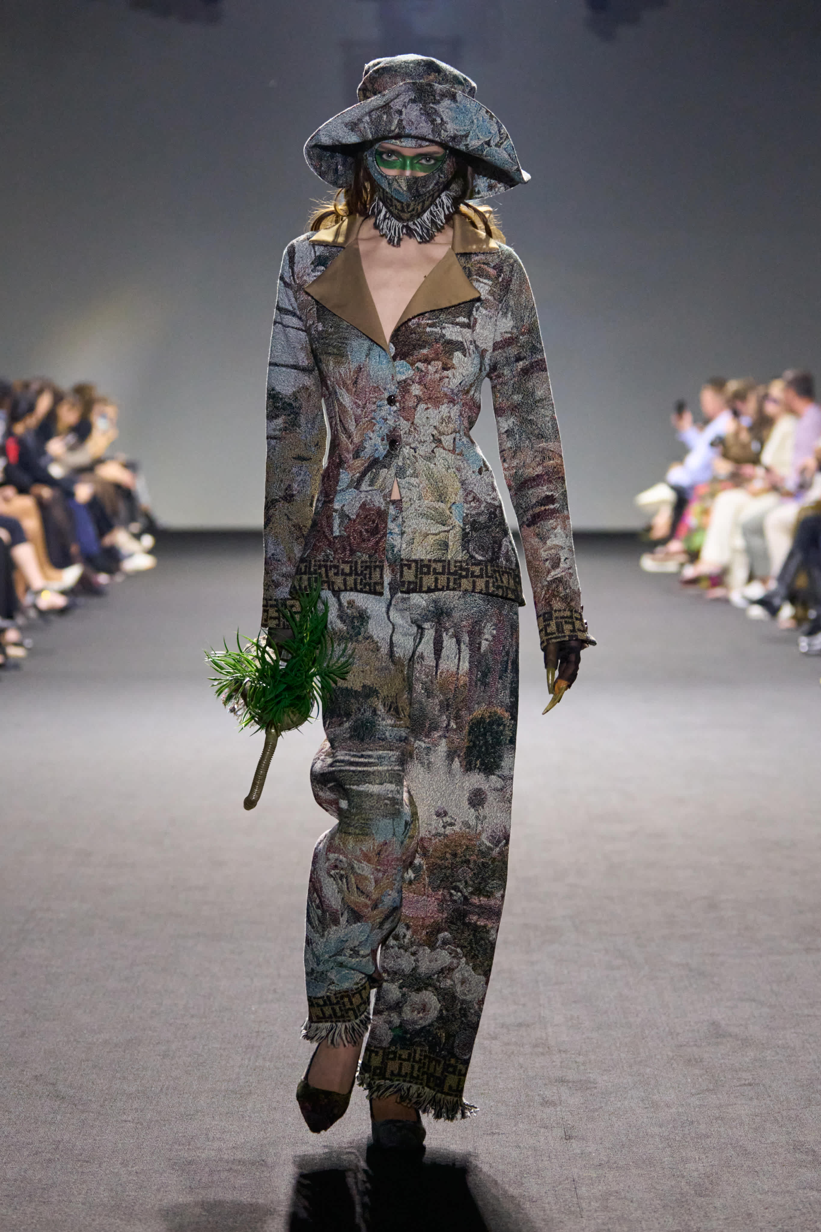 New York-based British-Iraqi designer Tara Babylon took center stage with her Autumn/Winter 2025 collection, Princess of Thieves. Infusing winter fashion with a warm, tropical vibe, Babylon reclaims desert narratives through Middle Eastern-inspired palm tree prints and earthy green tones. By weaving these elements into recycled cotton tapestry using a mix of traditional techniques—such as weaving, printing, hardware accents, and crochet—her collection offers stylish, sustainable pieces that marry texture, print, and eco-conscious design with a touch of regional charm.