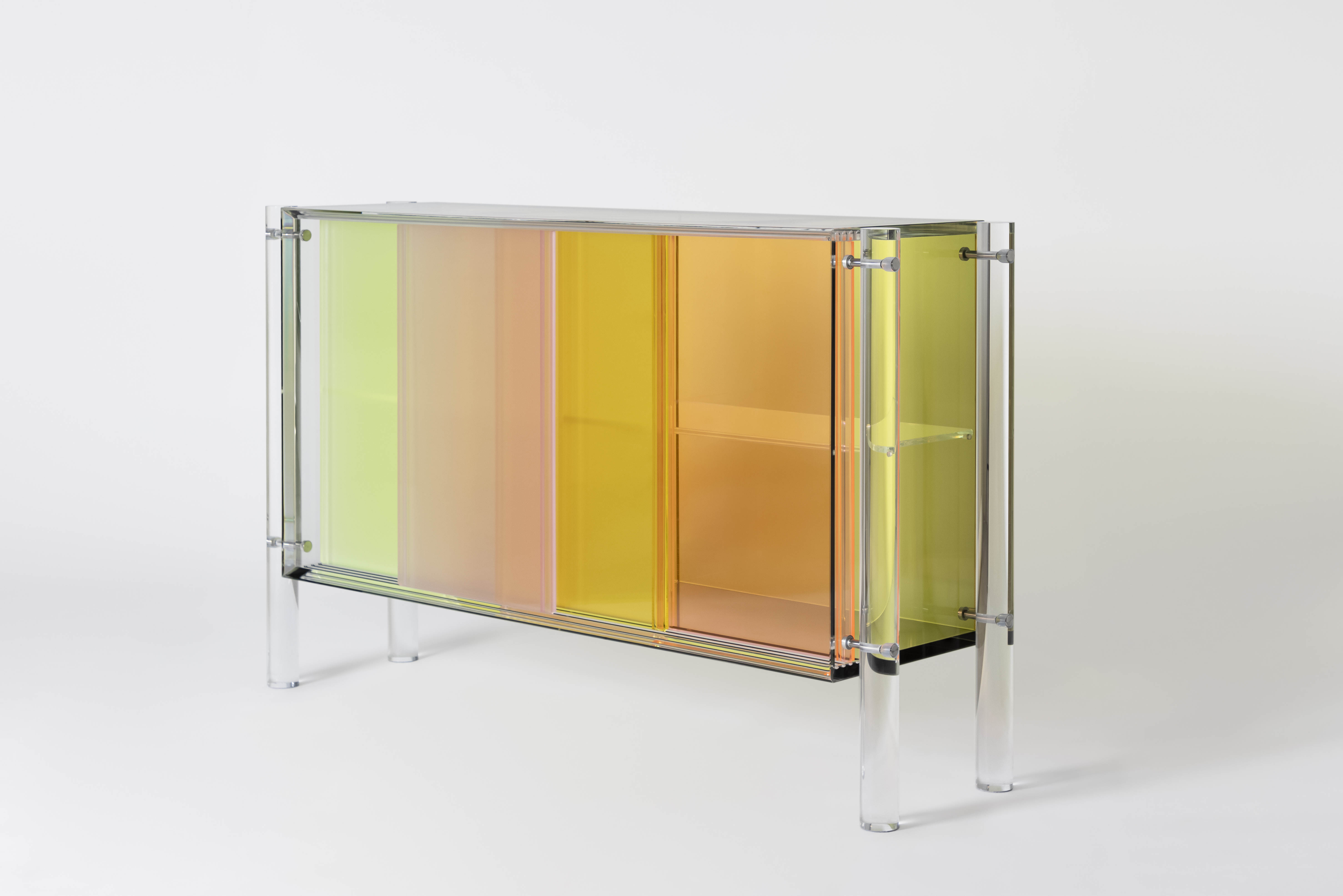 The heart of the show was Rescue Me, a new upcycling project that reimagined discarded pieces from the Heritage Collection. Through a meticulous process of transformation using resin, Lucite, and bold fluorescent hues, furniture like the Cadre sideboard was reborn with striking visual depth and luminous energy. Paired with the glowing Phebe lamps, the objects radiated emotion, suspended between dream and surprise.