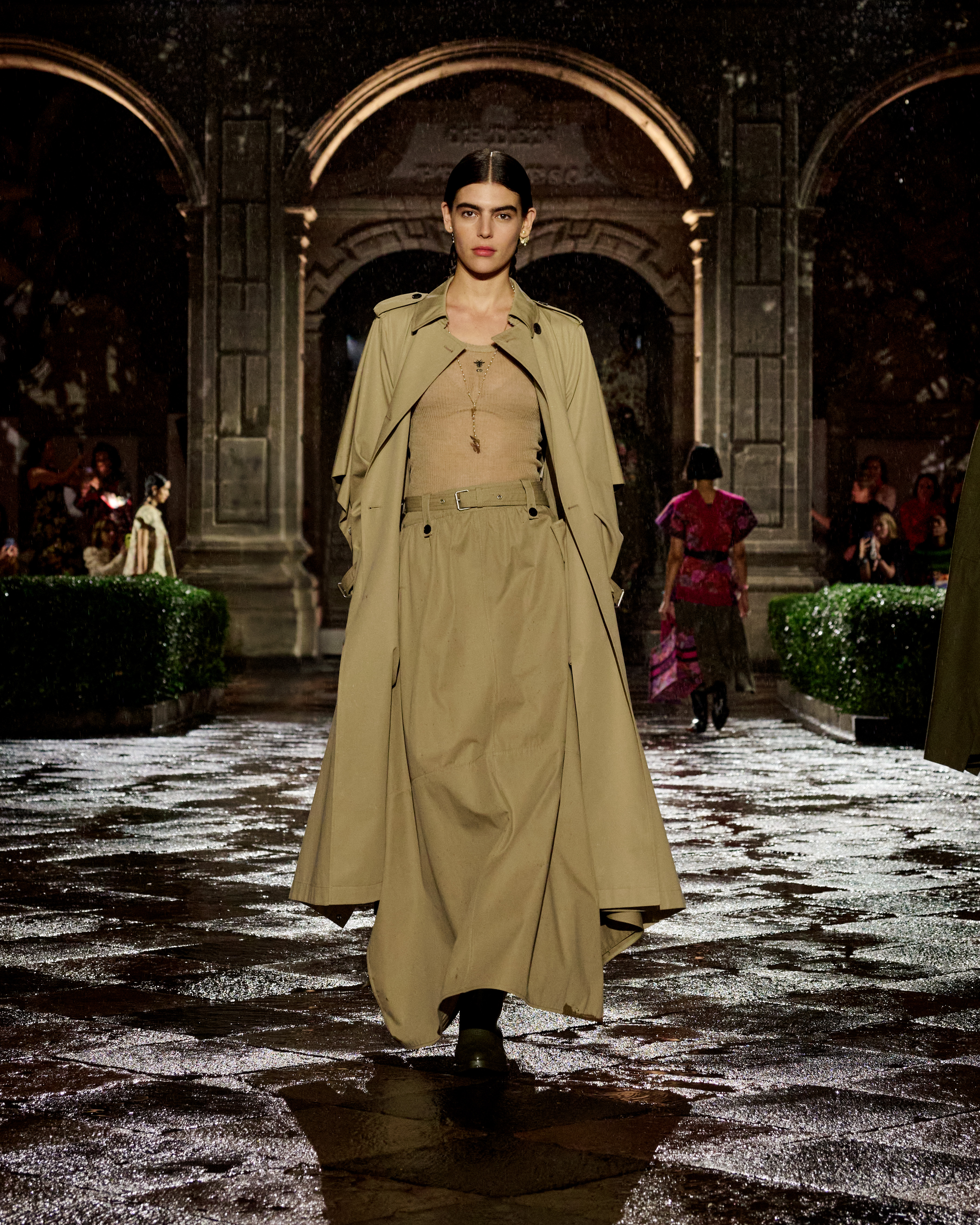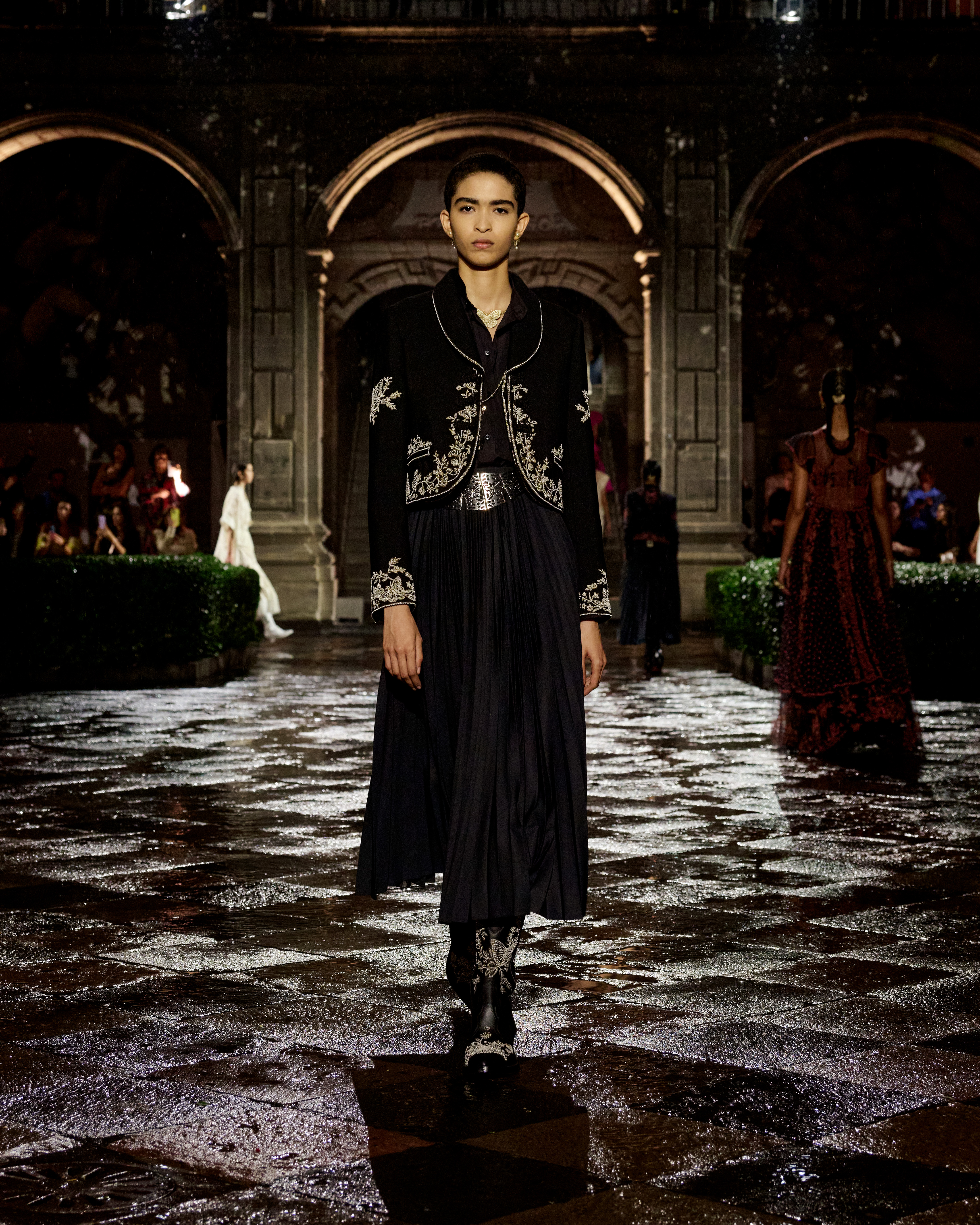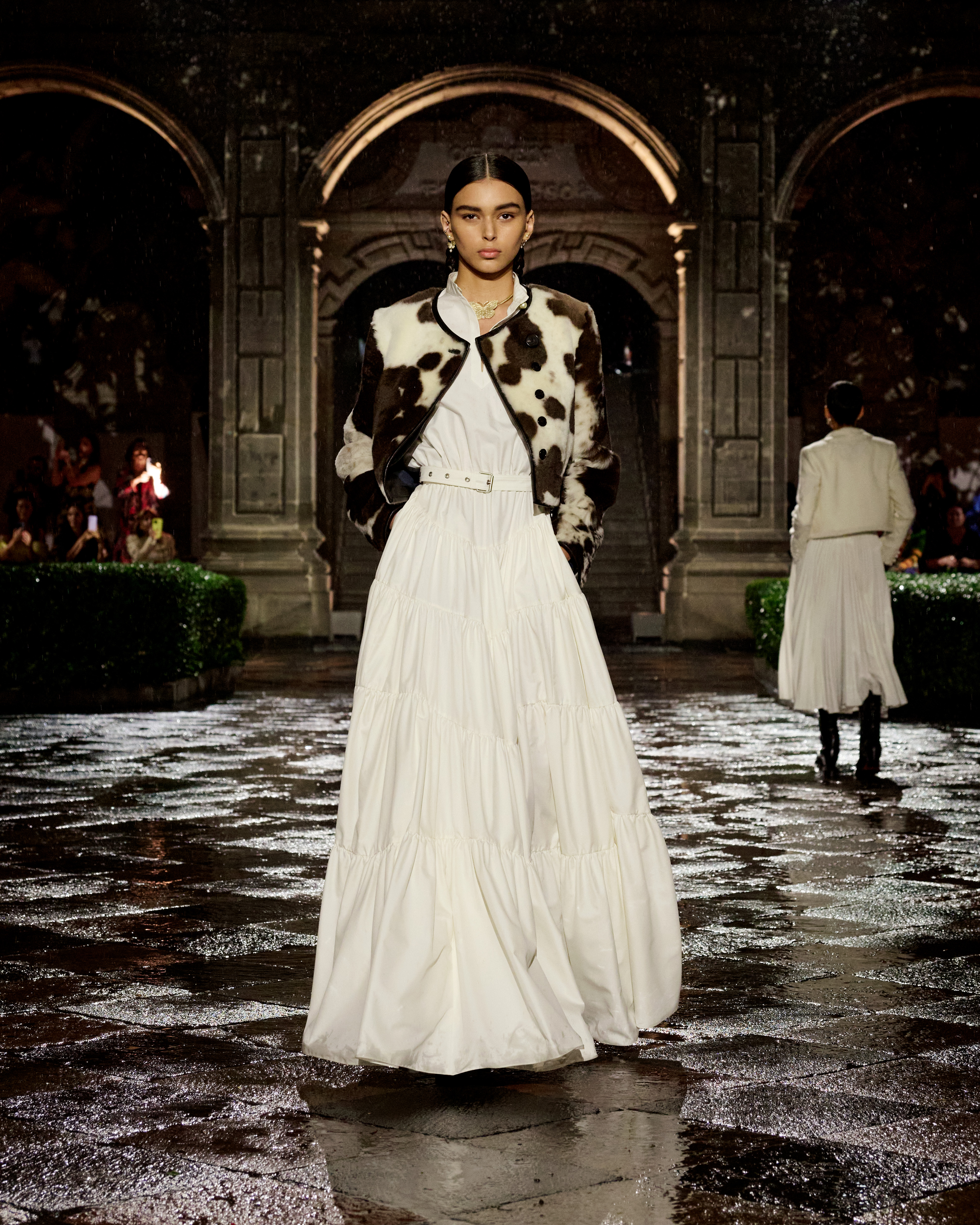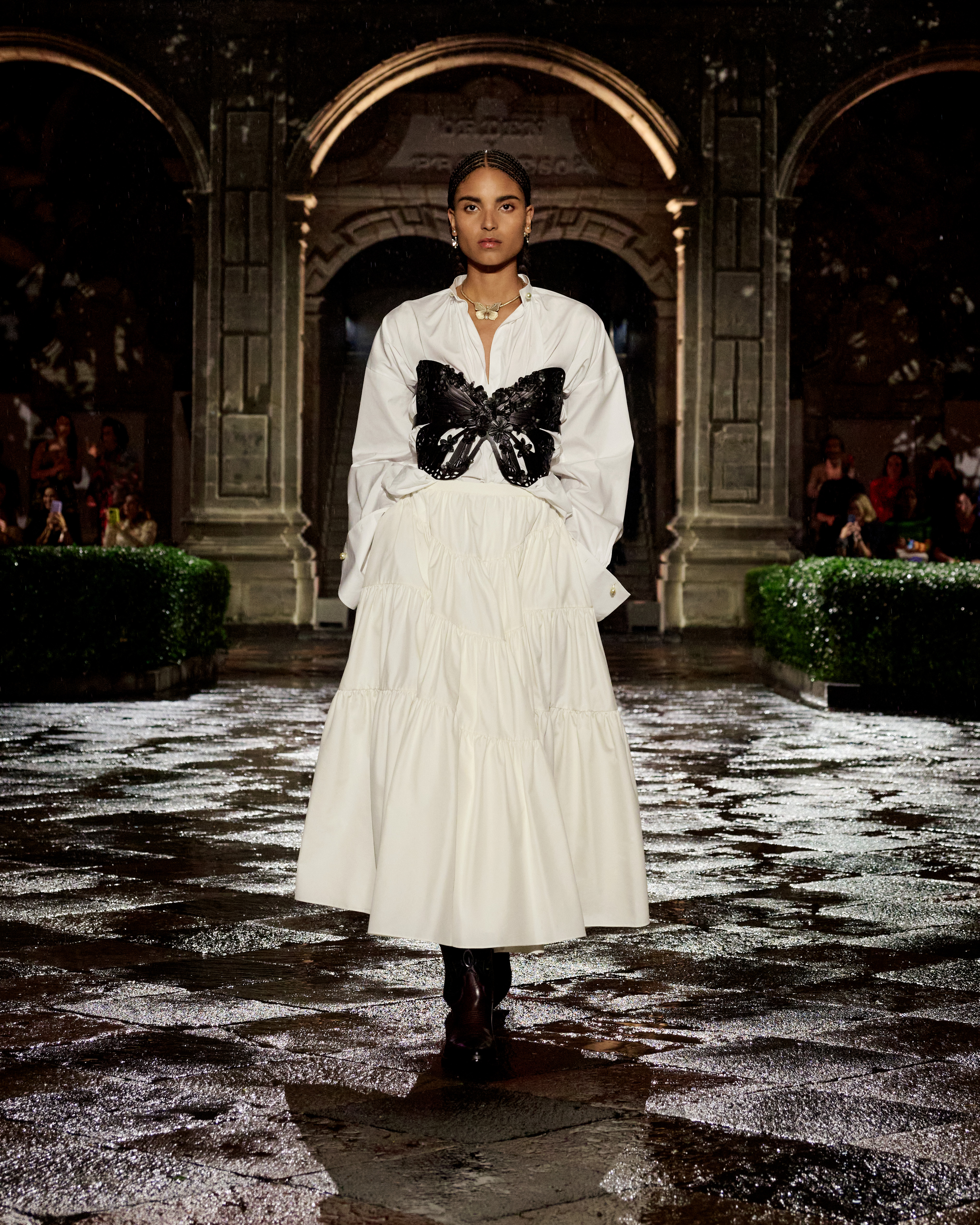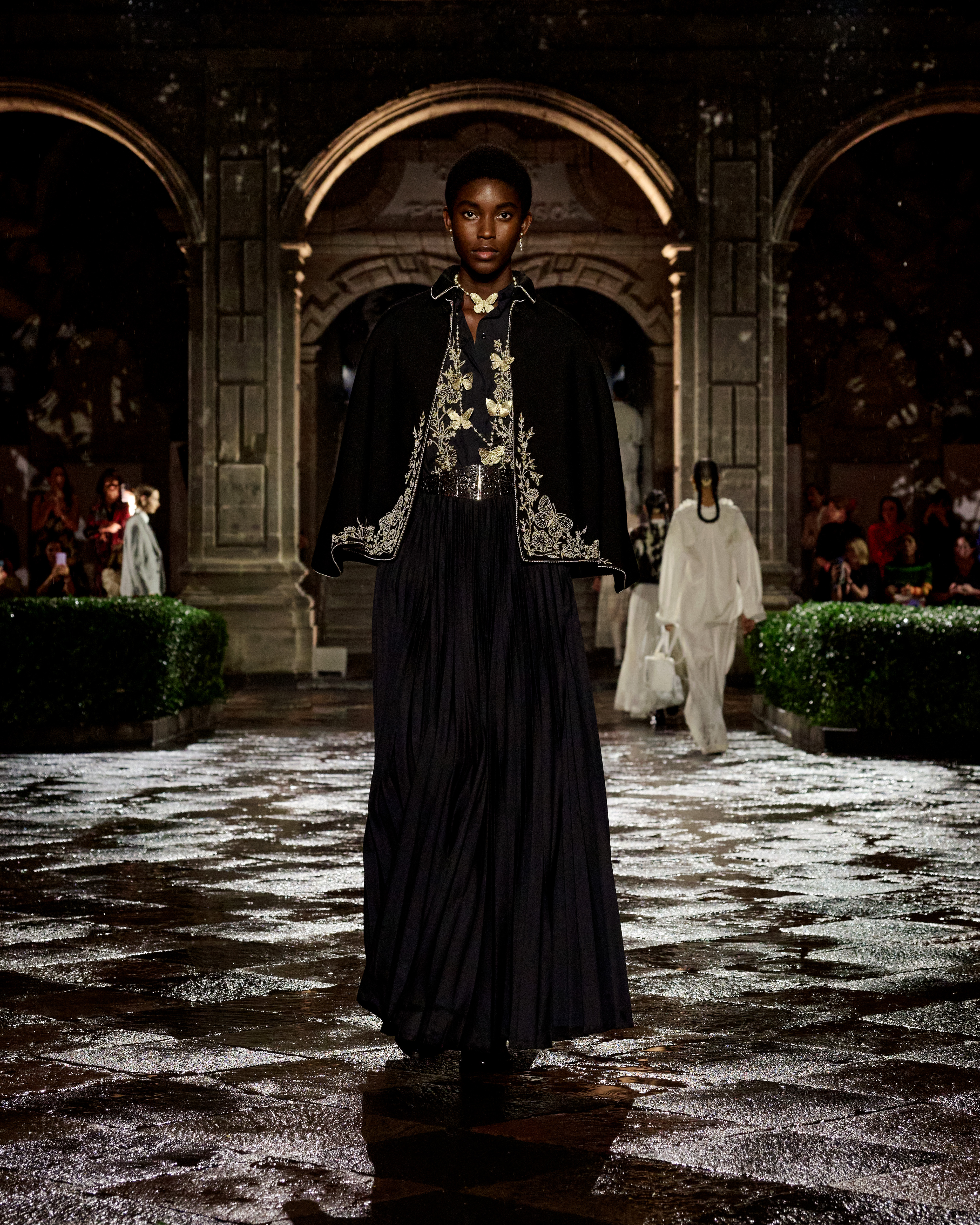 A constellation of places that spark emotions – this is what Mexico is to Maria Grazia Chiuri. A “place of the soul,” just as it was for surrealist artists. The emblematic figure of Frida Kahlo continues to offer a powerful connection to this culture, celebrated at the heart of the Dior cruise 2024 collection. The Mexican artist transcended her body through her clothes, which became representation, proclamation, protest, and affirmation. Like a precious jewel case for a broken body, a cocoon-case concealing a butterfly meta-morphed into a motif unfolding in multiple shades and forms, through a series of prints. The captivating beauty of fragility is further enhanced by the variety of cotton, hemp and silk lace selected, by the meticulous designs of the collars sublimating jersey and black velvet, and by irresistibly precious jacquards. For this new line Maria Grazia Chiuri has once again forged strong ties with local artisans: original embroideries, co-creations crafted with their ateliers, notably adorn dresses and shirts. The story of a femininity that is constructed by a relationship with the natural environment, in a balance of engagement and light-heartedness.