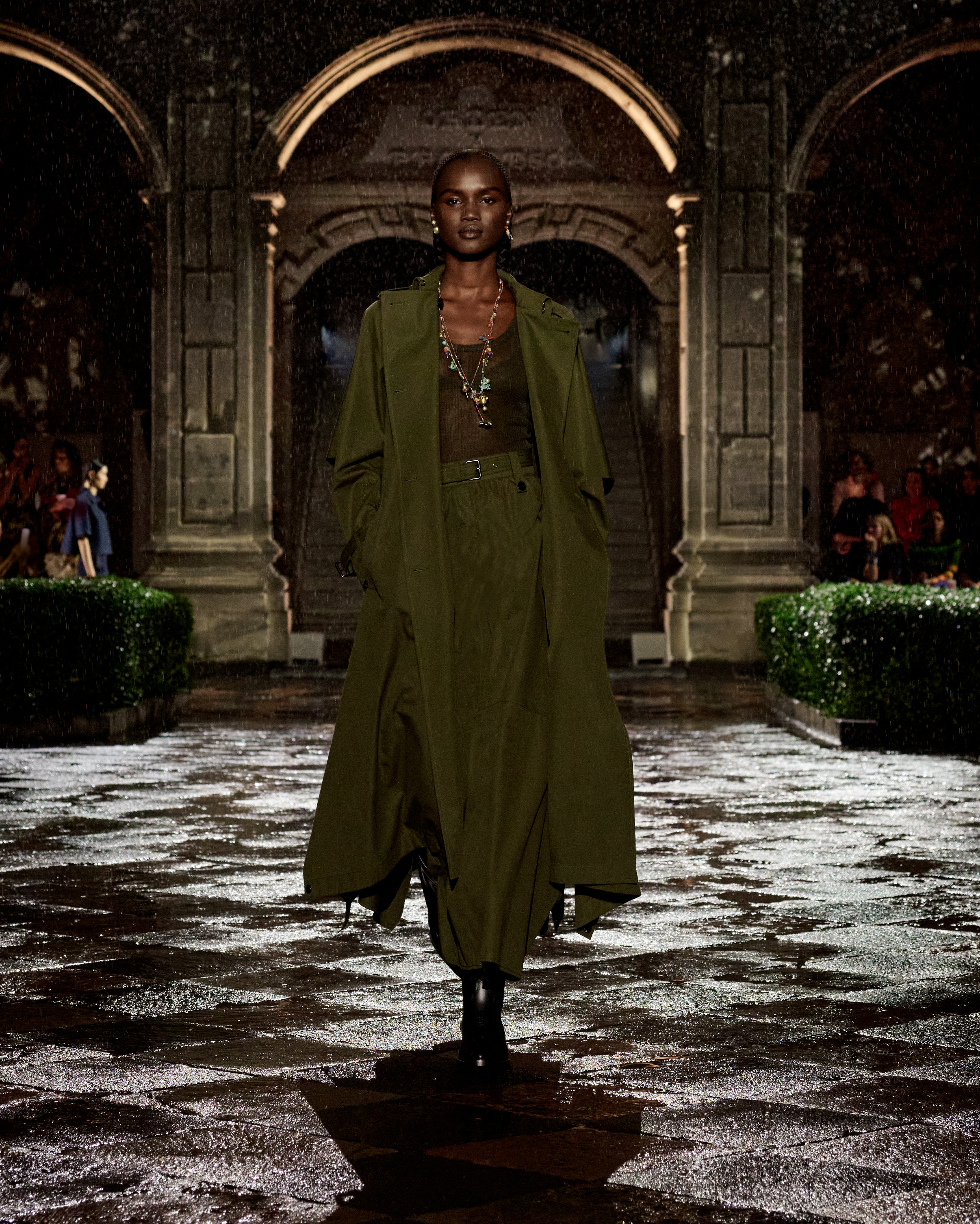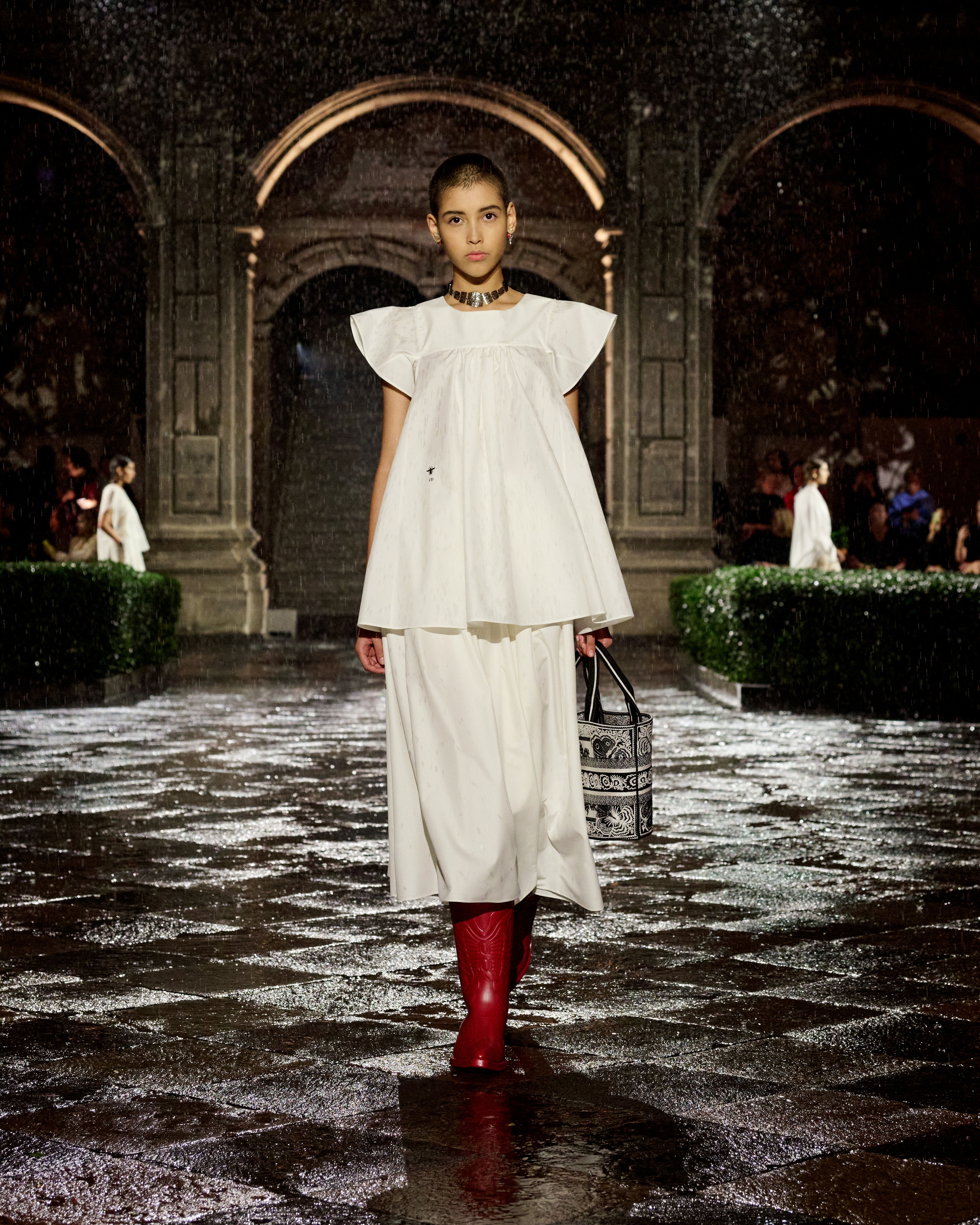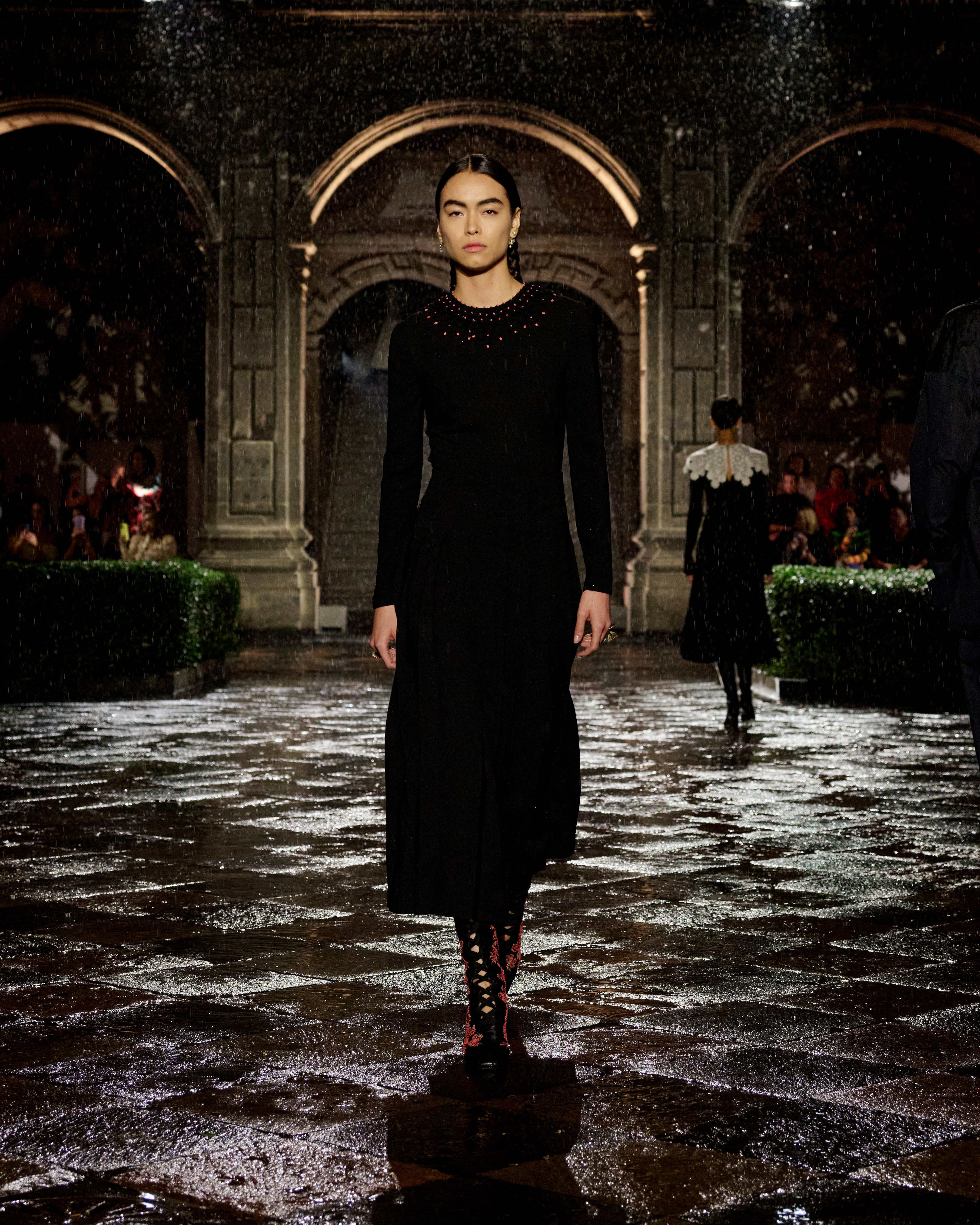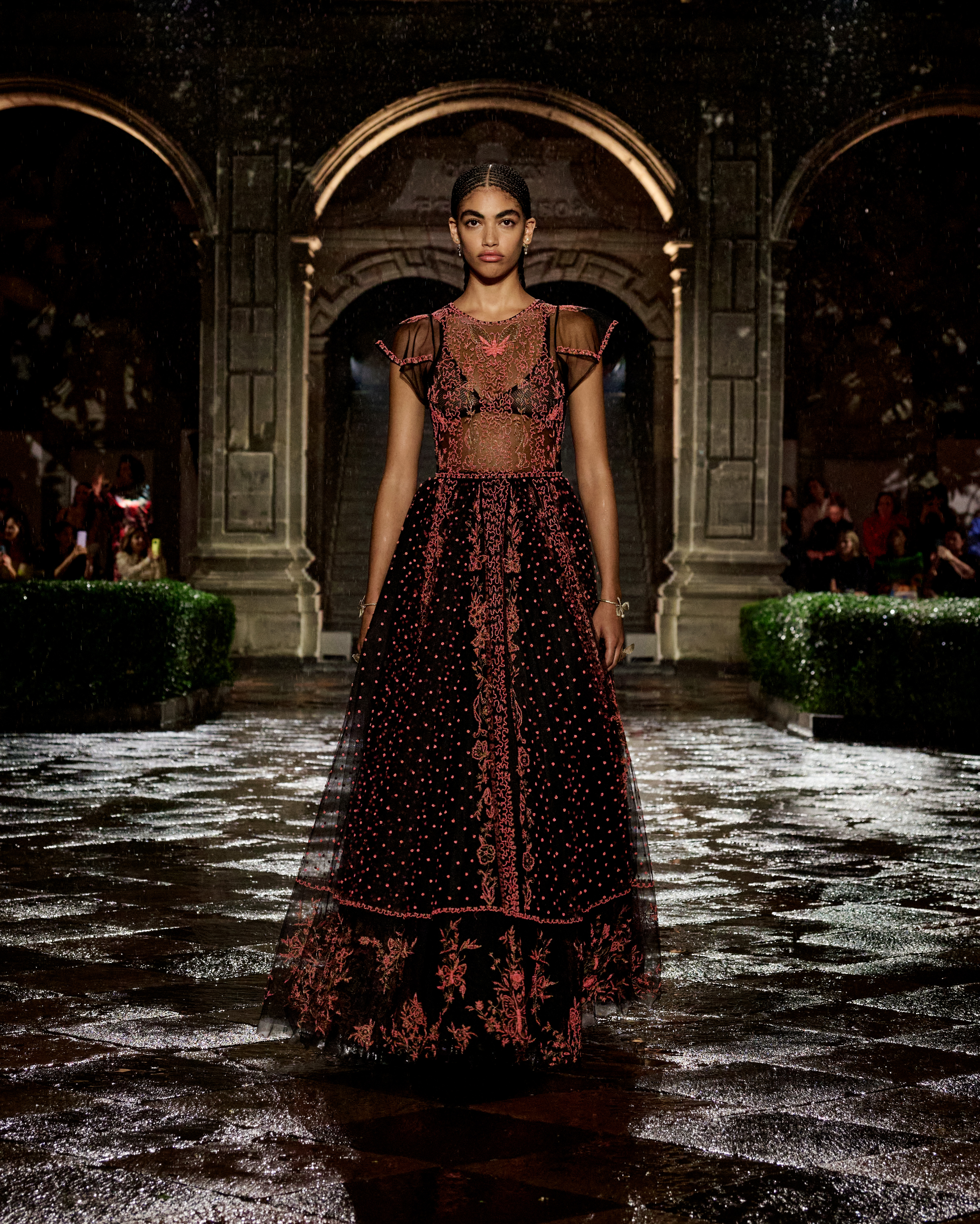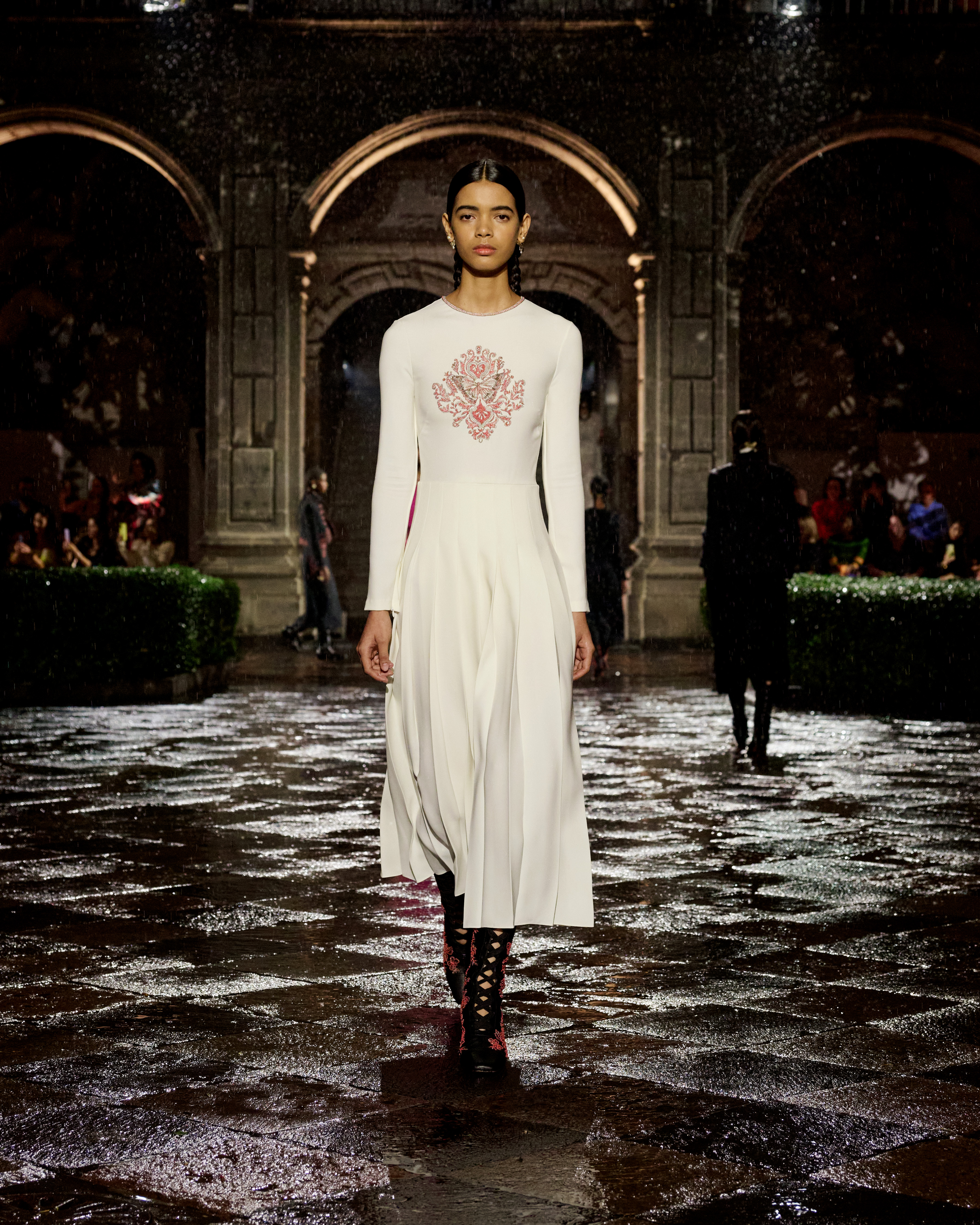 A constellation of places that spark emotions – this is what Mexico is to Maria Grazia Chiuri. A “place of the soul,” just as it was for surrealist artists. The emblematic figure of Frida Kahlo continues to offer a powerful connection to this culture, celebrated at the heart of the Dior cruise 2024 collection. The Mexican artist transcended her body through her clothes, which became representation, proclamation, protest, and affirmation. Like a precious jewel case for a broken body, a cocoon-case concealing a butterfly meta-morphed into a motif unfolding in multiple shades and forms, through a series of prints. The captivating beauty of fragility is further enhanced by the variety of cotton, hemp and silk lace selected, by the meticulous designs of the collars sublimating jersey and black velvet, and by irresistibly precious jacquards. For this new line Maria Grazia Chiuri has once again forged strong ties with local artisans: original embroideries, co-creations crafted with their ateliers, notably adorn dresses and shirts. The story of a femininity that is constructed by a relationship with the natural environment, in a balance of engagement and light-heartedness.