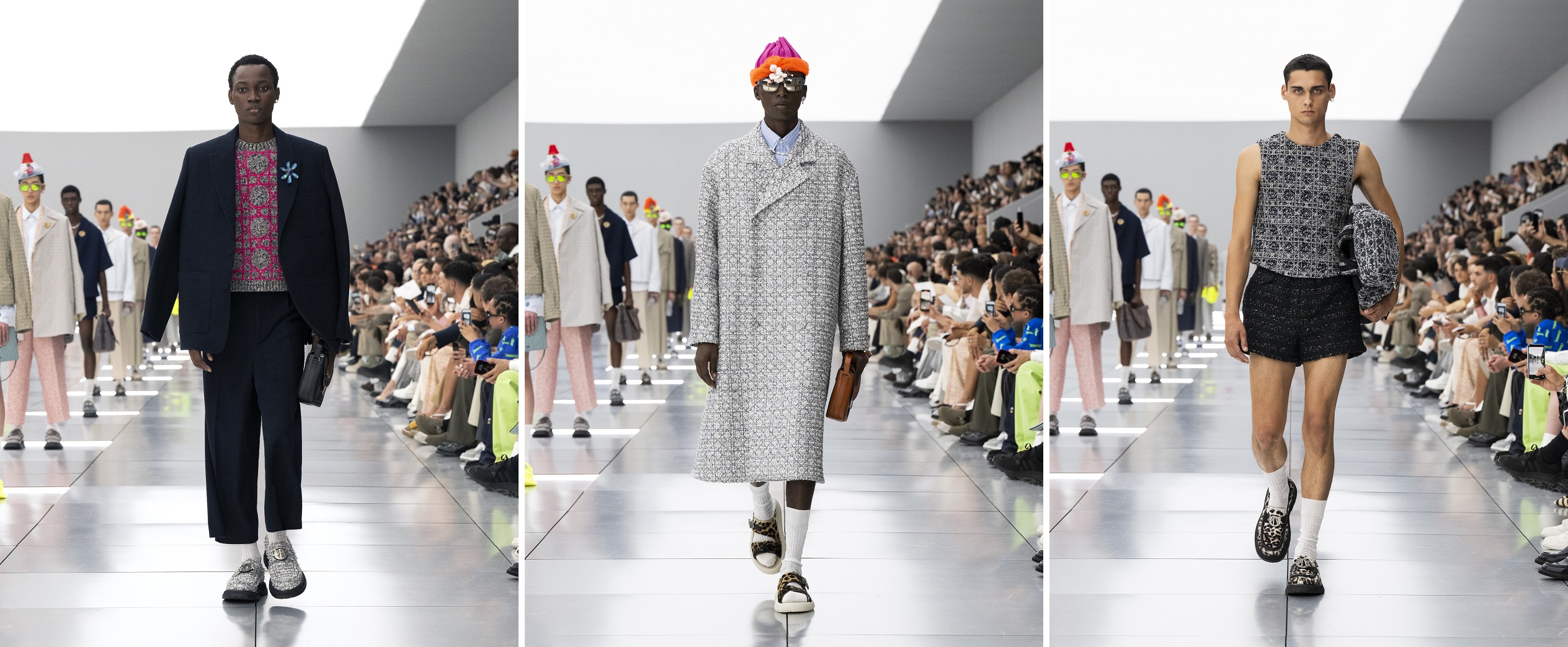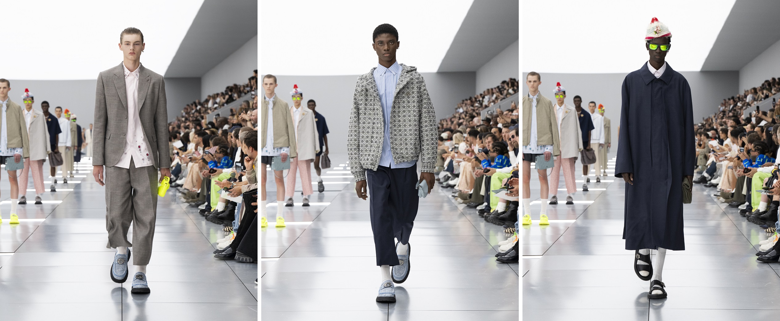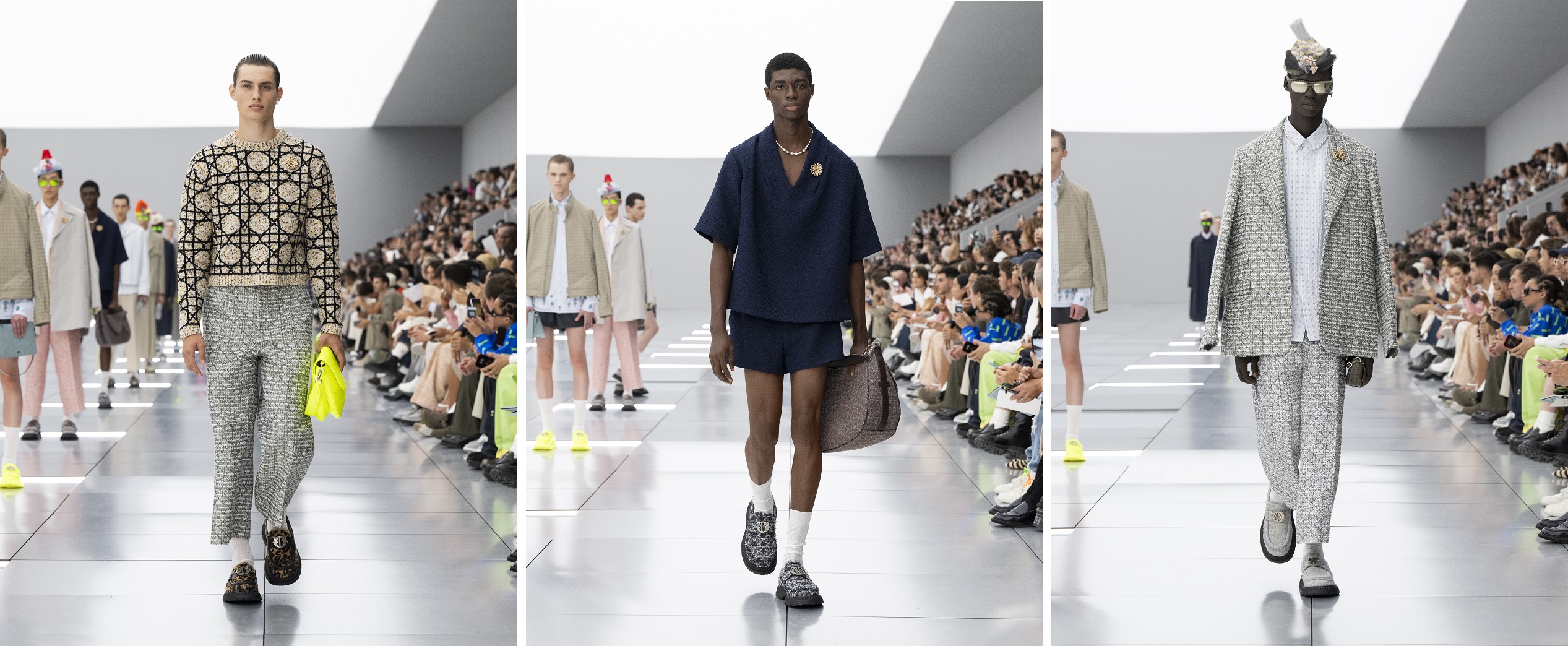 Saint Laurent's tailoring is once more transmuted into the men's world, with a particular focus on the volumes, vents, pleats and necklines from his 1959 collections. Here they appear effortless in relaxed masculine suiting, summer ensembles and sweeping coats. In contrast, shoes take on the inspiration of 1995's Lady Dior bag, with a new circular logo on heavy-soled loafers and slides that purposely conjure new wave crepe. Meanwhile, a multiplicity of bags appear in a variety of shapes, colors and textures; from pop fluorescent Saddles to cognac cannage satchels, extravagant to sober with utilitarian tweed rucksacks and leather rolled sandwich bags in between. Stephen Jones reinterprets fashion new wave beanies that are also part liberty caps. Here' the cockade is replaced by 'Ronghua', exquisite velvet flowers that have been produced in China since the Tang Dynasty (618-907). Adapting colors for the collection, Ronghua masters worked closely with the Dior ateliers to transform their tradition and celebrate the elegance of today more than ever.
