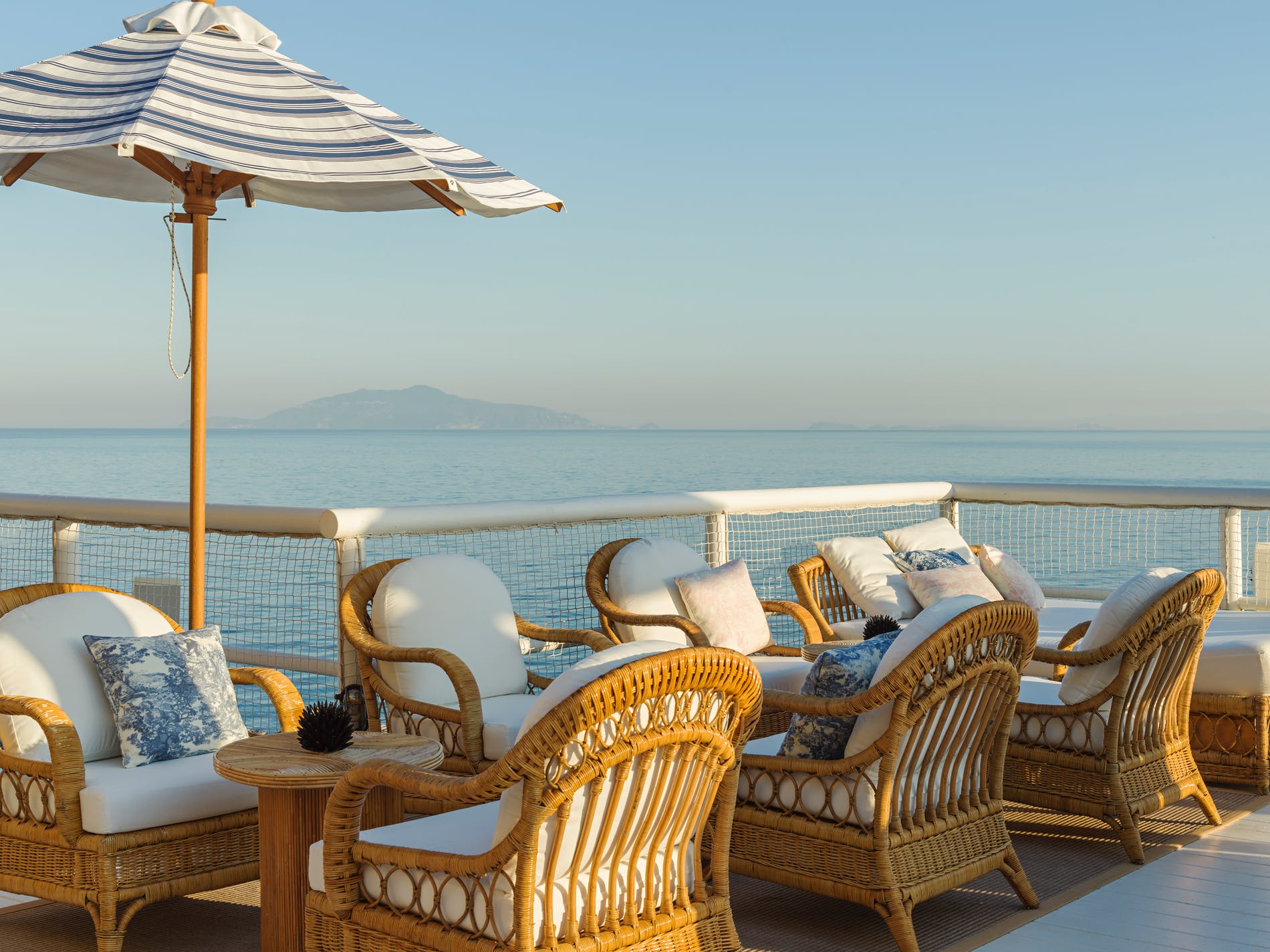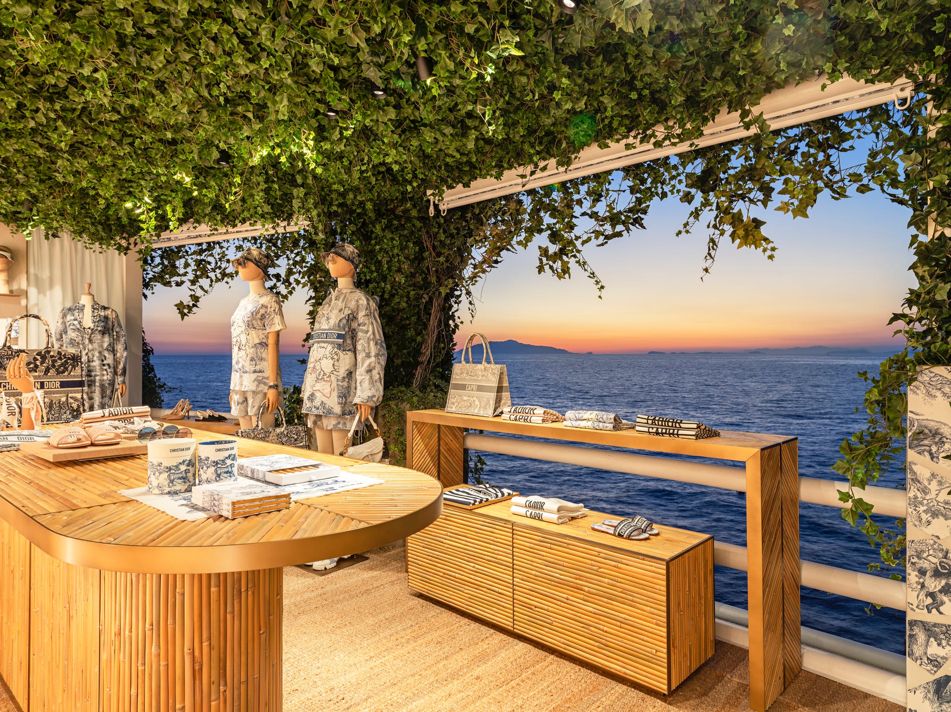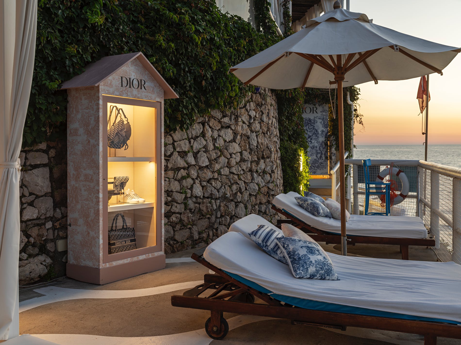 In addition to the Dior boutique on Via Camerelle, this enchanting island paradise is also playing host to an ephemeral location at Il Riccio Restaurant & Beach Club, part of the Capri Palace Jumeirah. From the cliff, overlooking the azure waters of the Mediterranean, this unique setting on a balcony perched on the rock is accessible by sea thanks to a dedicated boat service. In harmony with the surrounding nature, luxuriant planting further emphasizes the refined bamboo and cannage décor**. The embodiment of French savoir-faire and a Dior heritage emblem, blue-tinted toile de Jouy motifs cover the walls in a contemporary interpretation of traditional Italian ceramics, a tribute to the richness of local craftsmanship.