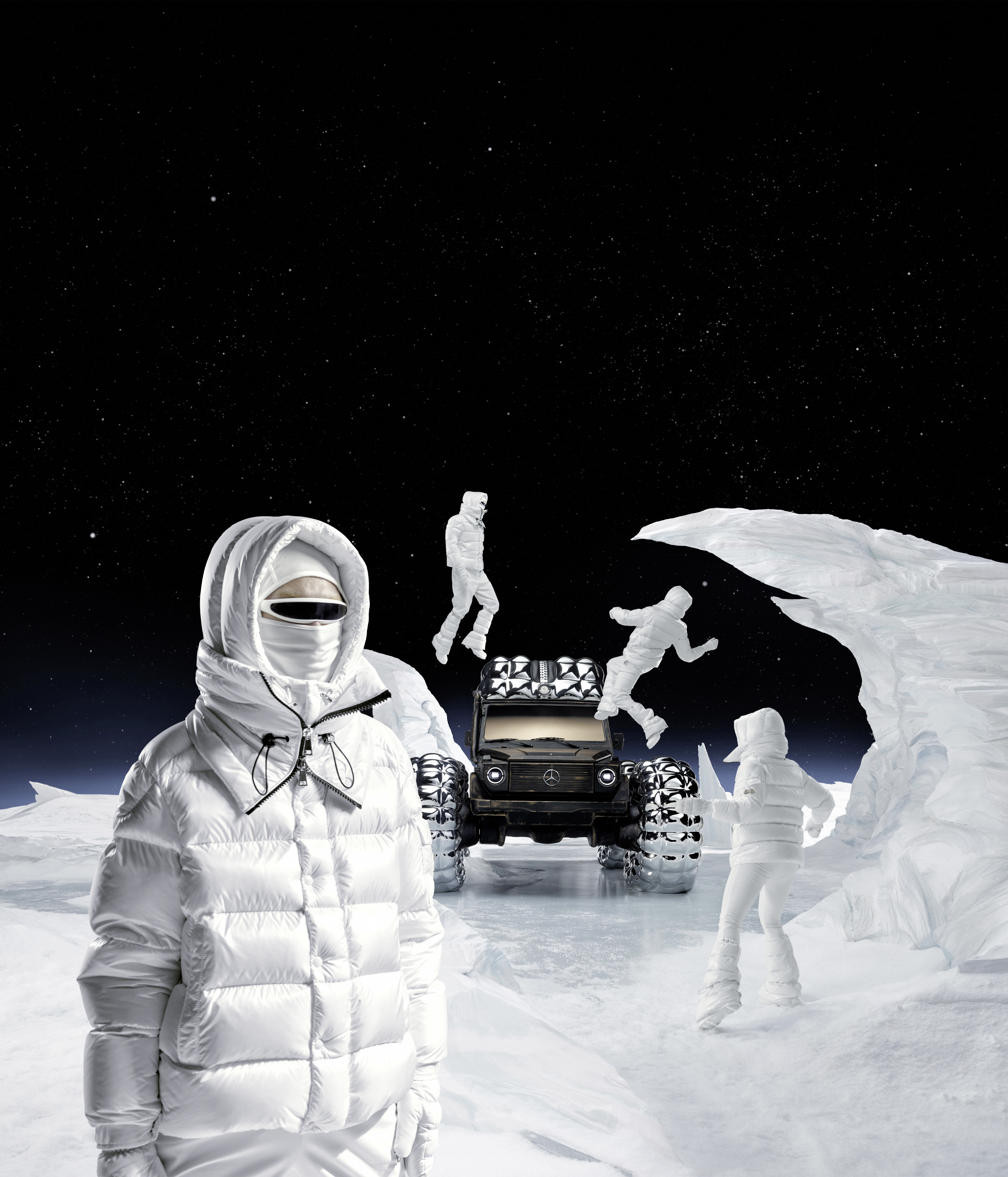 PROJECT MONDO G is the hero showcar of the campaign that accompanies the Mercedes-Benz and Moncler co-creation with social media, out of home (OOH) and PR assets for a broad global activation. The visualization stages an otherworldly winter landscape inspired by the main themes of outdoor durability and limitless discovery opportunities with the off-roader G-Class as basis of PROJECT MONDO G and the puffer jacket of Moncler. The look and feel is an imaginary universe with low gravity that interprets the art piece with fashionable moments by models wearing conceptual looks designed with Moncler collection items. The campaign set design mirrors the art piece reveal at the “The Art of Genius” show presenting the ability of the G-Class and the Moncler puffer jacket to withstand even in the harshest conditions. The campaign was lensed by the recognized director and photographer Thibaut Grevet.