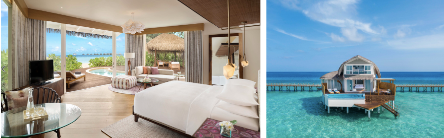 The resort features luxurious designed villas, both on land and overwater, each with private swimming pools and stunning views of the lush forest or the Indian Ocean. Inspired by the island's treasures, the overwater villas resemble graceful manta rays, while the interiors reflect the unique zones of Lagoon, Beach, Jungle, and Coastal. Guests can indulge in personalized, anticipatory rejuvenate at the award-winning Iridium Spa, which offers a holistic approach to relaxation with six overwater treatment rooms, Ayurvedic treatments, and luxury caviar treatments. Additionally, the Blue Hole, the most expansive hydrotherapy pool in the Indian Ocean, promises a unique and invigorating experience.