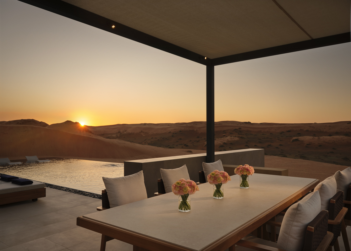 At the heart of this serene desert, the resort boasts 101 elegantly designed villas, each offering a private infinity pool, expansive deck, and panoramic desert views, blending contemporary luxury with traditional Arabian aesthetics.