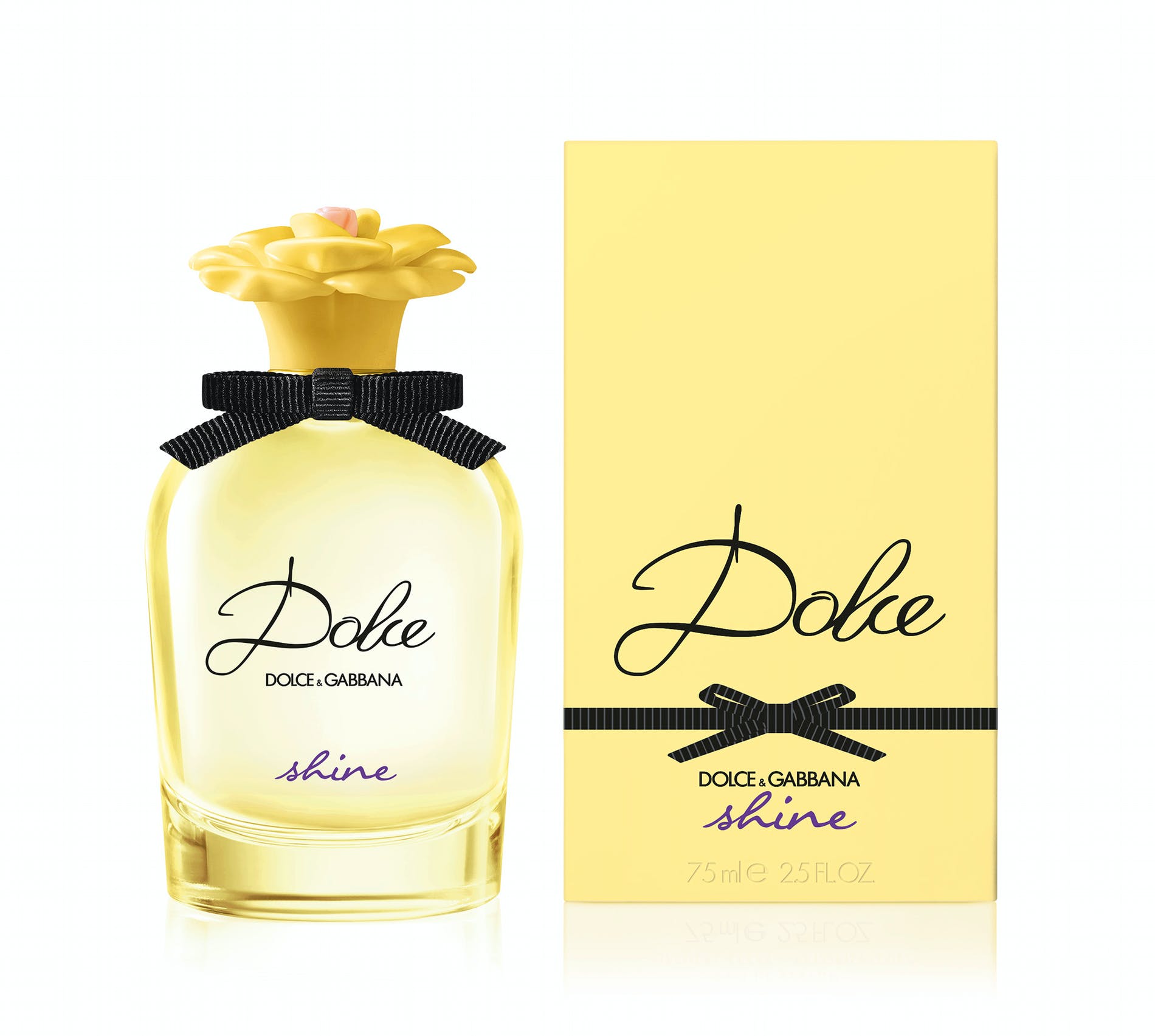 For this colourful new addition to the Dolce collection, the bottle and the iconic cap takes on a soft, sunny yellow, matched by the outer box. As always, a black grosgrain bow adorns the collar. The name of the fragrance is in a bright purple, an electric touch that accents Dolce Shine’s positive energy.