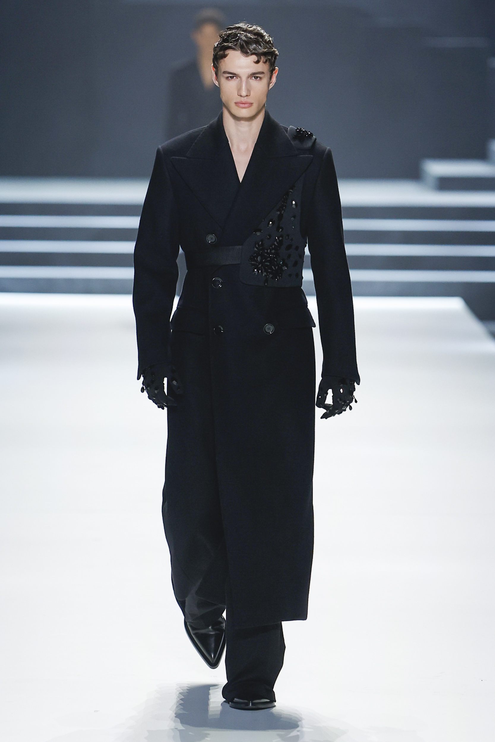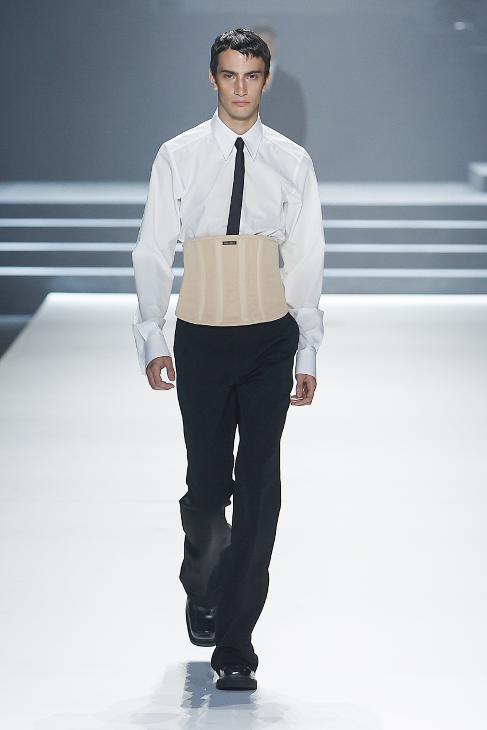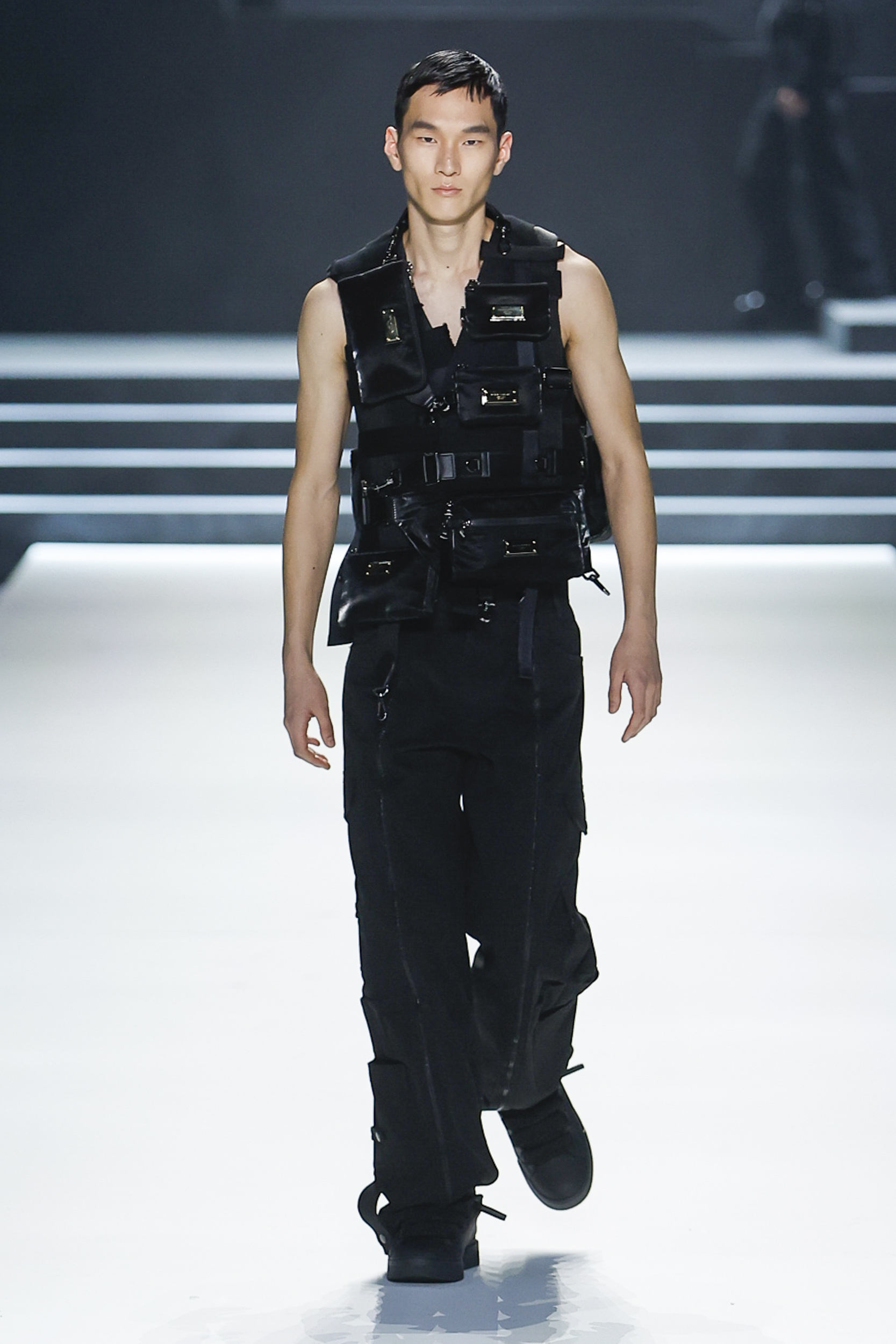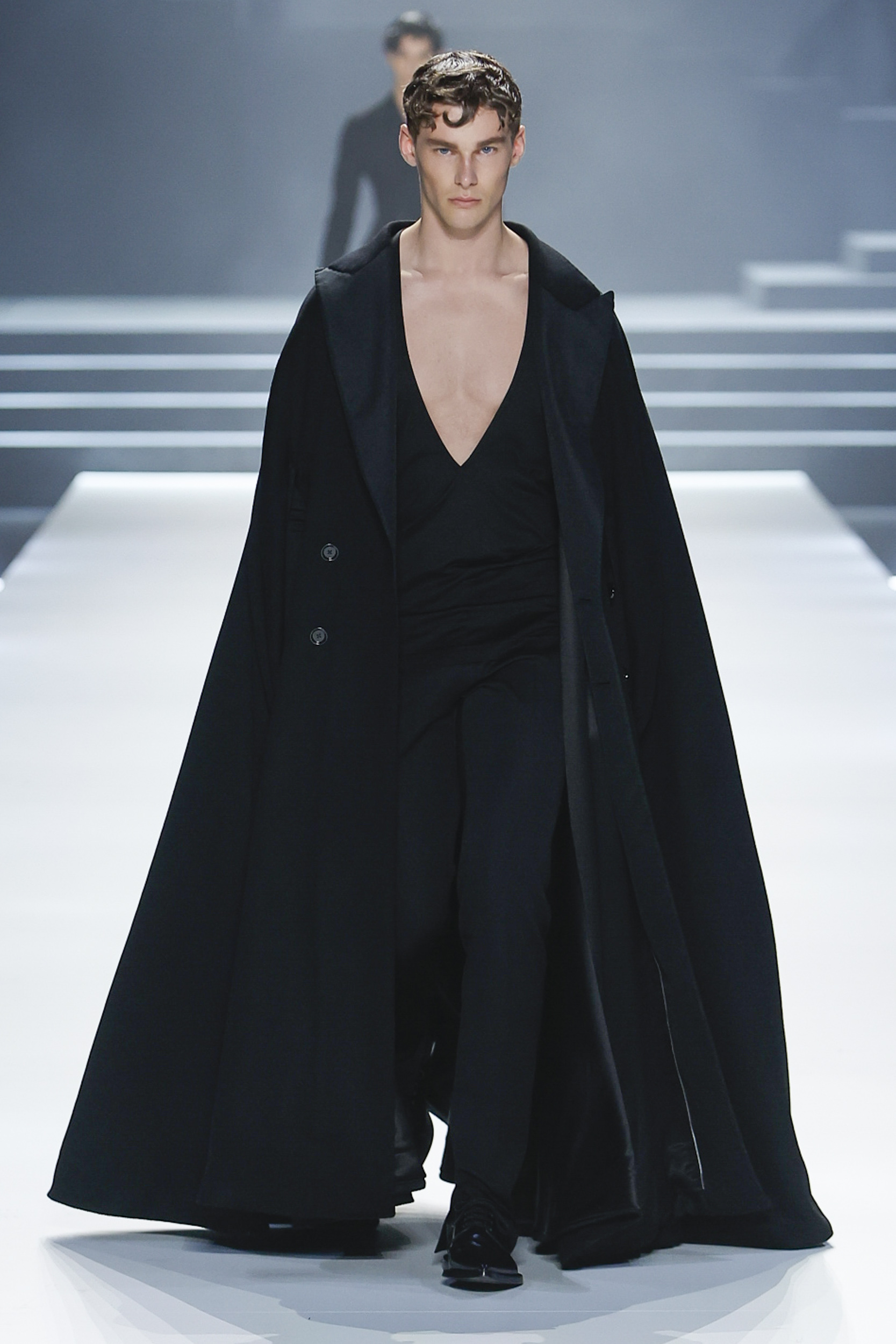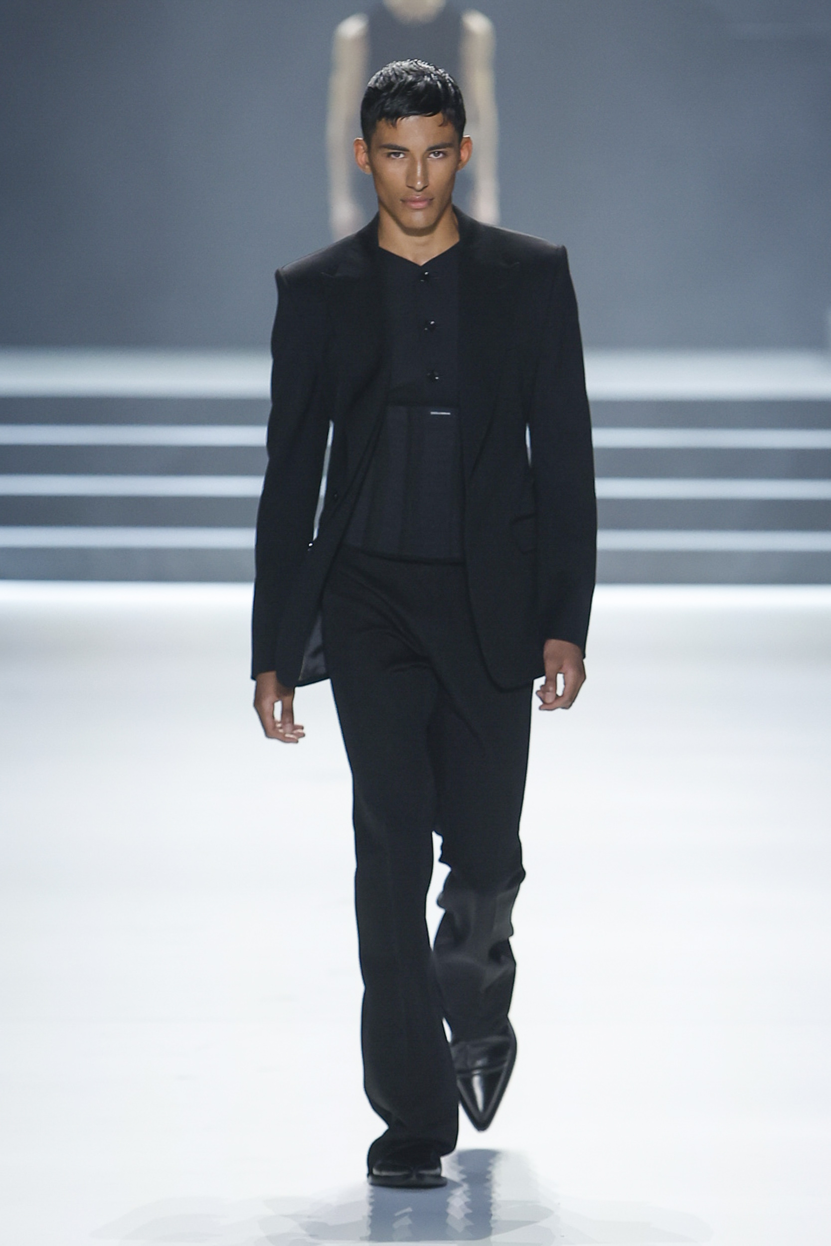 What exemplifies this essence re purity of the volumes, the tailored cut, the innovative proportions, the selection of italian fabrics and silks, and the craftsmanship of the “Fatto a Mano” (Handmade), through which the values of Italy’s cultural heritage can be rcognized. A considered exaggeration in the silhouettes and lines articulate the synthesis of perfect cut. Superstructures of girdles/corsets and bands/sashes that emphasise the waist revive elements of our Fall/Winter 1999-2000 collection, along with the micro-shirts and the double waist trousers. Black is the absolute protagonist: it represents reservdness, elegance, rigour and seduction. Expressed in various materials, it reveals to the touch and to the eye its own characteristsics light and sensuality. Black always provokes profoundly nique experiences and sensaions, even as it is lit up by embriodered crystals in the same colour that recall the wet volcanic rock of etna and stromboli.