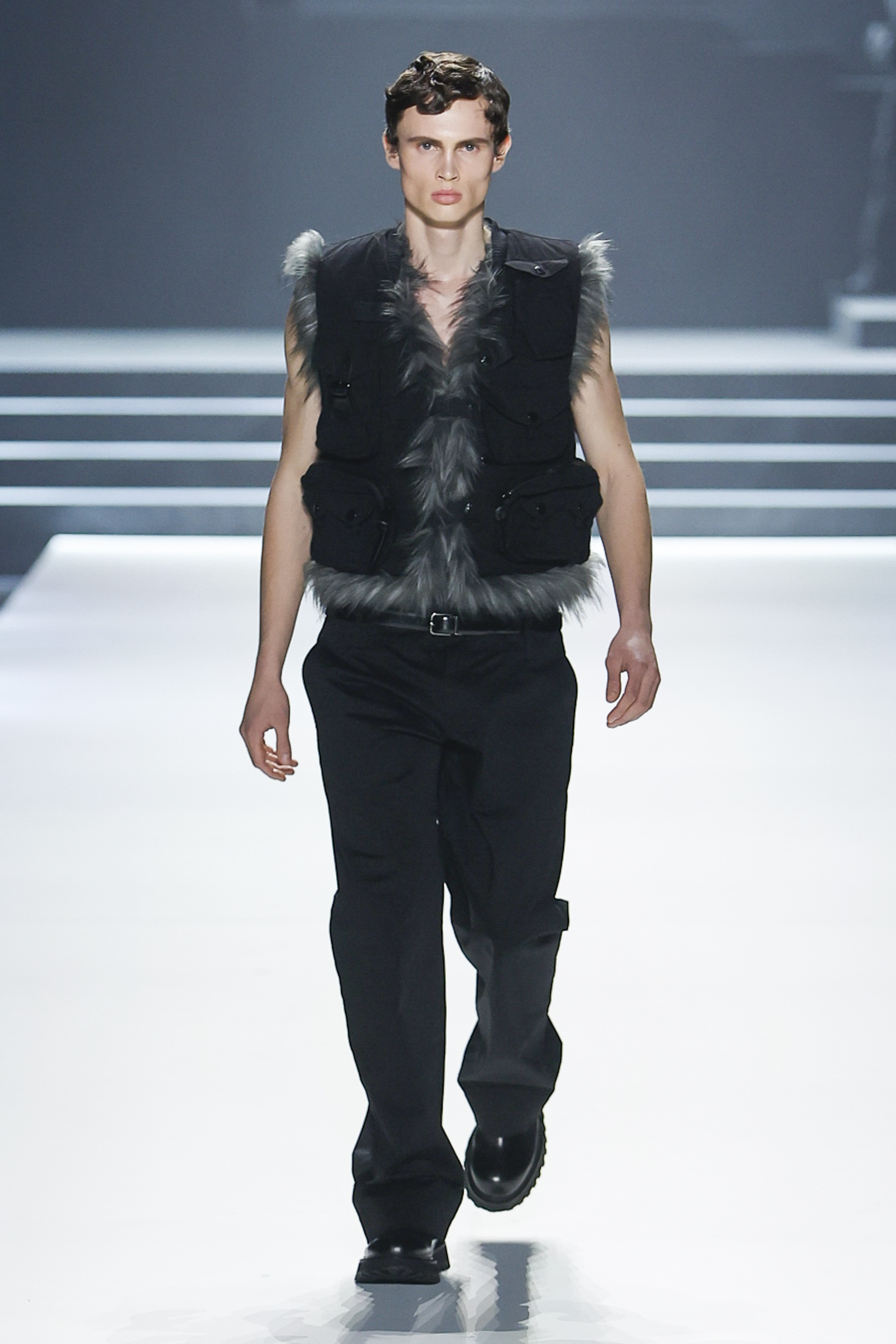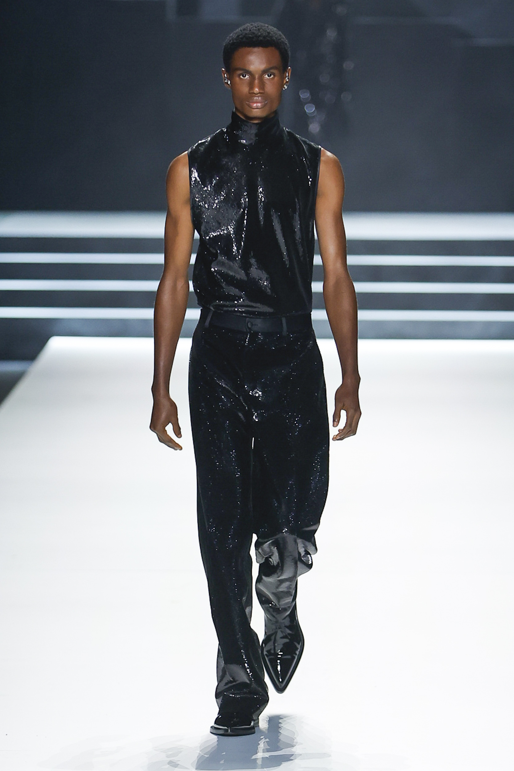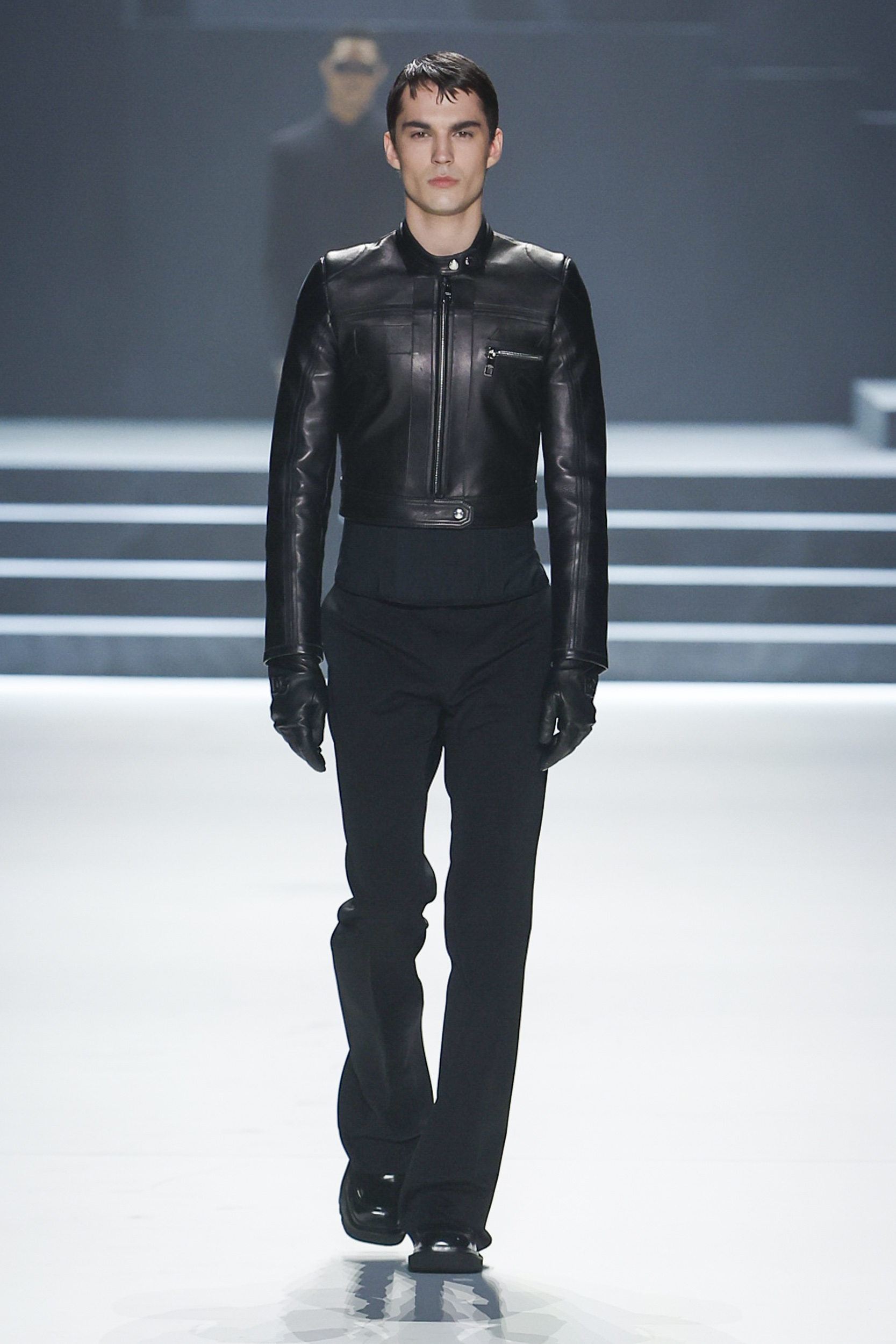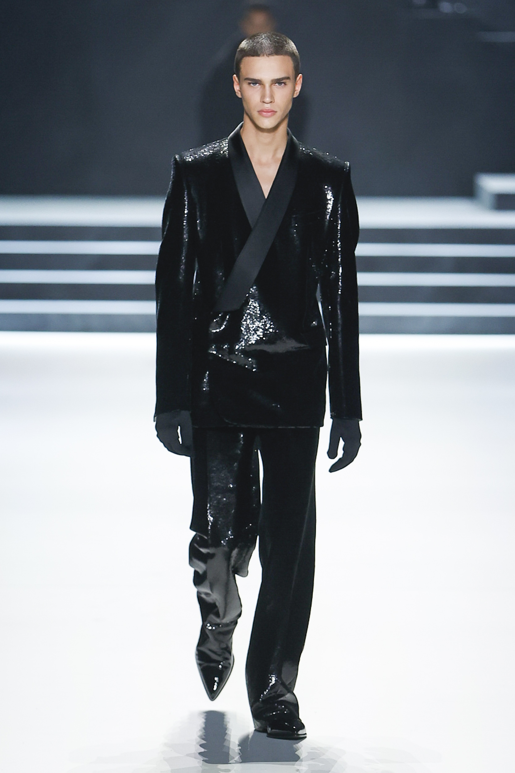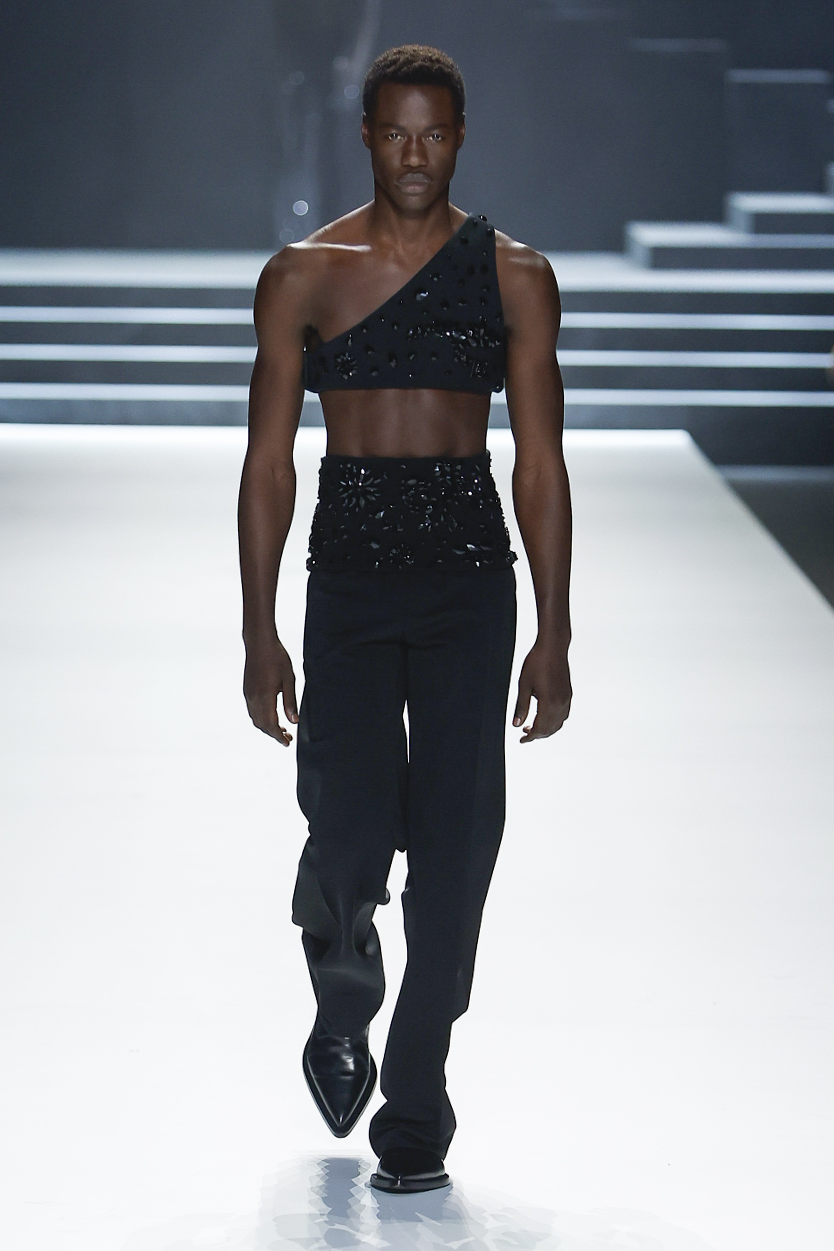 What exemplifies this essence re purity of the volumes, the tailored cut, the innovative proportions, the selection of italian fabrics and silks, and the craftsmanship of the “Fatto a Mano” (Handmade), through which the values of Italy’s cultural heritage can be rcognized. A considered exaggeration in the silhouettes and lines articulate the synthesis of perfect cut. Superstructures of girdles/corsets and bands/sashes that emphasise the waist revive elements of our Fall/Winter 1999-2000 collection, along with the micro-shirts and the double waist trousers. Black is the absolute protagonist: it represents reservdness, elegance, rigour and seduction. Expressed in various materials, it reveals to the touch and to the eye its own characteristsics light and sensuality. Black always provokes profoundly nique experiences and sensaions, even as it is lit up by embriodered crystals in the same colour that recall the wet volcanic rock of etna and stromboli.