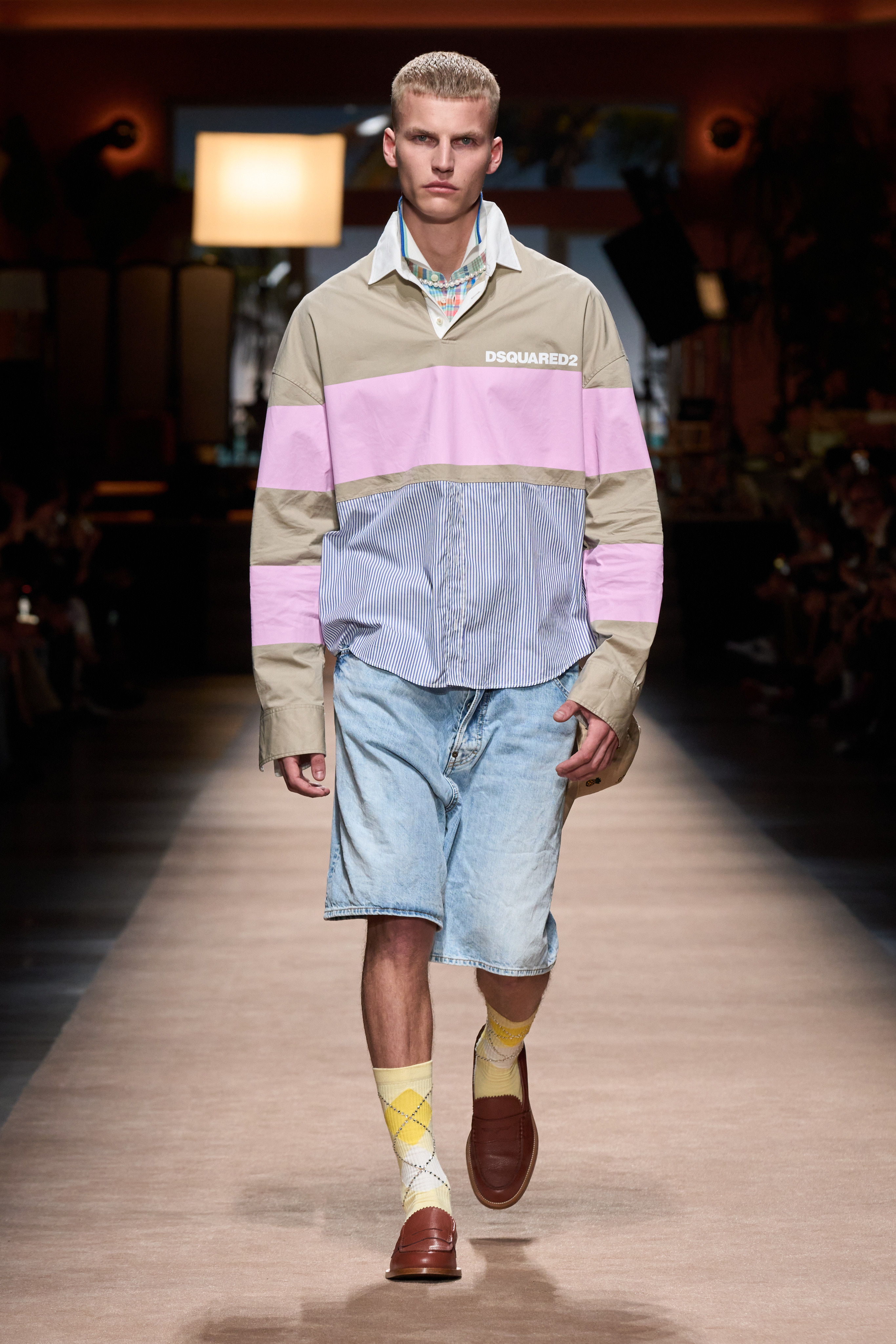 Golf and tennis inspired wear is mixed with raw signatures. A men’s striped polo is hybridized with a striped buttoned shirt, jean shorts and argyle socks, a women’s tennis skirt is mixed with an elaborate pearl necklace combined with double-breasted jacket, with metallic anklelaced sandals decorated with marijuana leaves. A familiar logo, the Rolling Stones’ iconic tongue, is given new dimension in a beaded women’s top, and as a men’s vertical sliced tank.