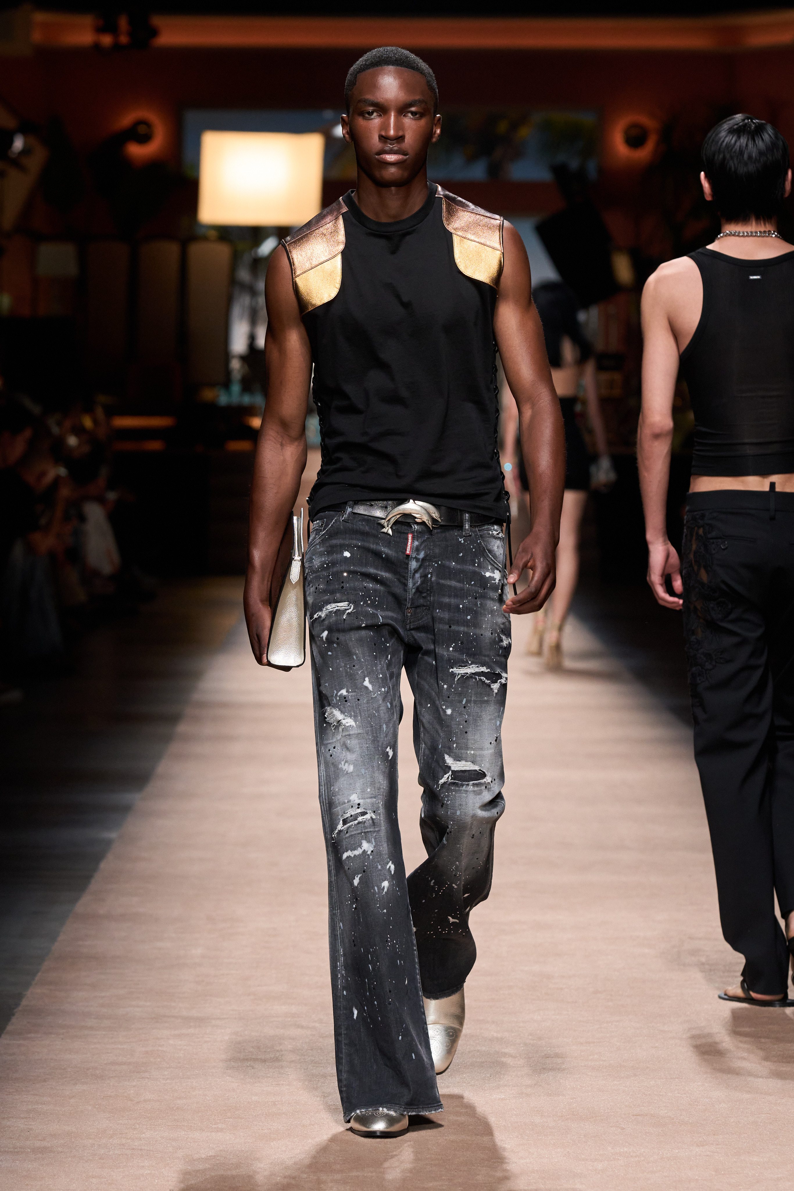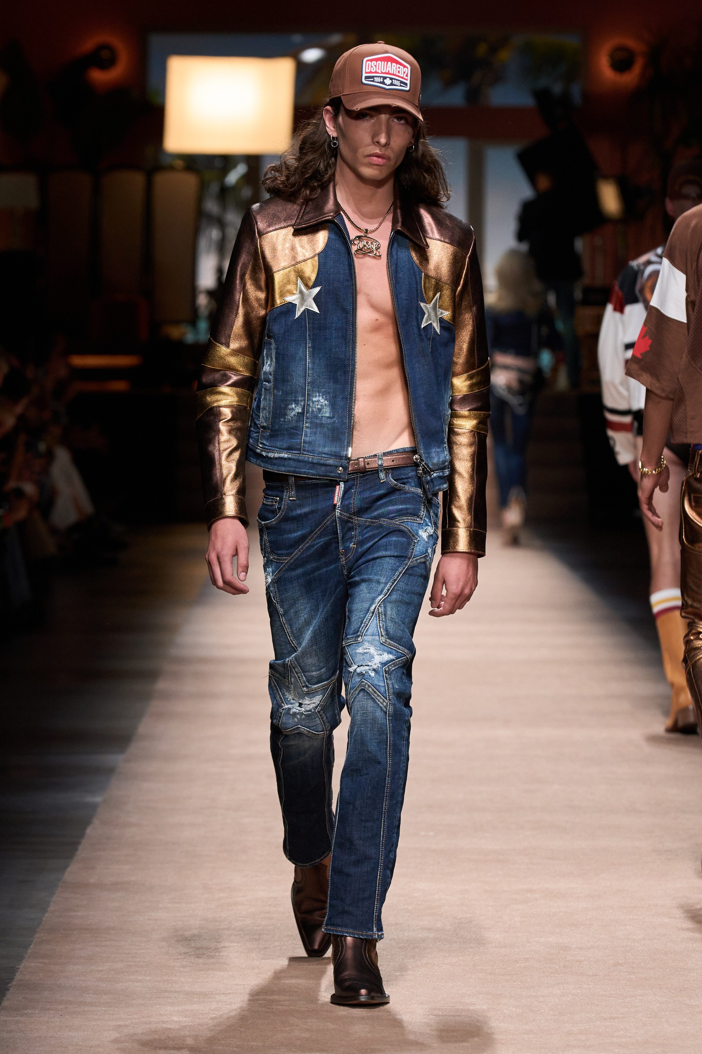 A swirling, wave-like colorful print appears on men’s bull denim jeans, on an unbuttoned-to-the-chest shirt and a tank top. Retro style floral prints, the coordinated theme carried through in a satin shorts and bomber jacket set, and bronze leather pants paired with a rugby style Tshirt. Guys carry glazed tennis and duffle bags with Americana sport style graphics.