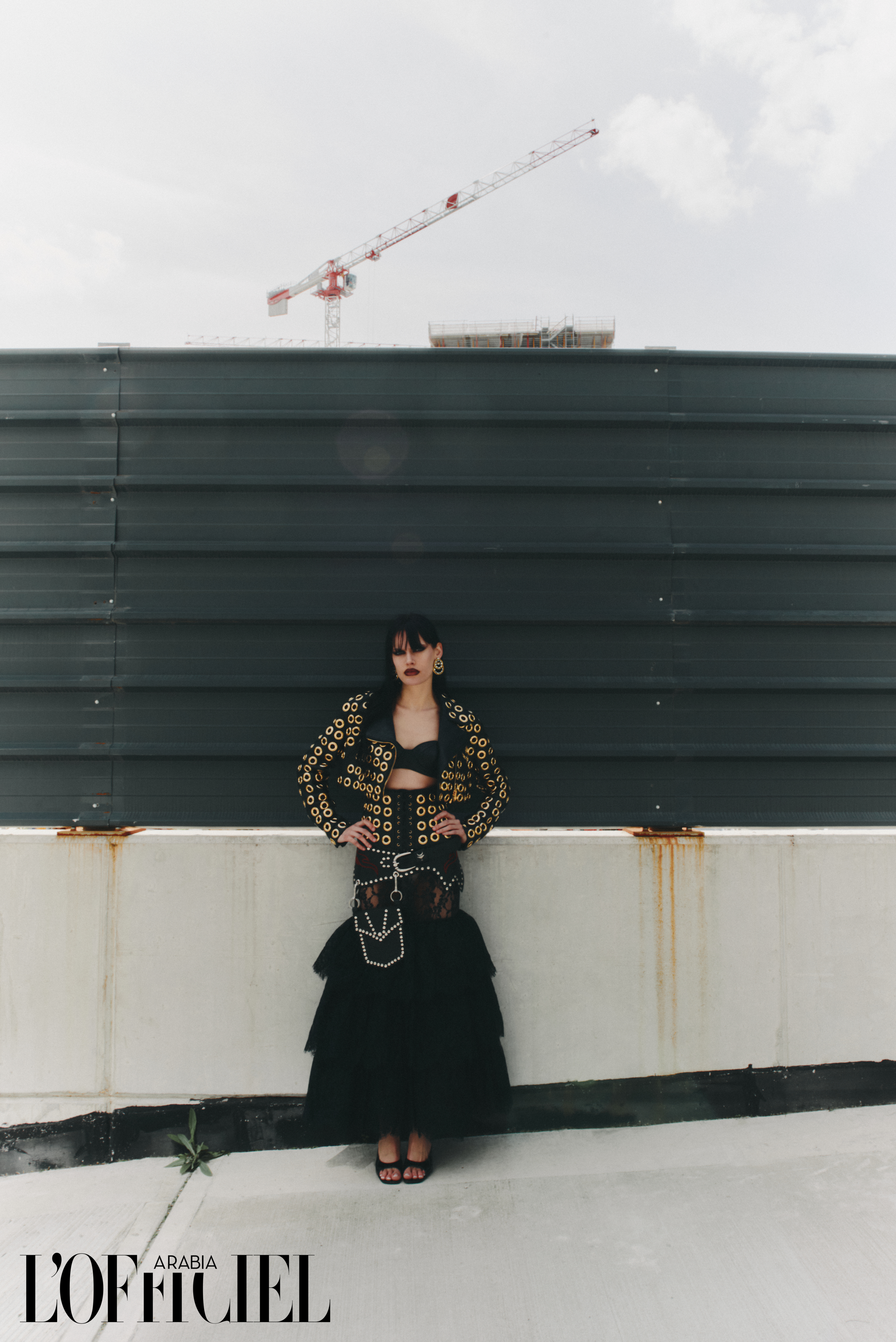 JACKET: Moschino, BRA: Moschino, SKIRT: Moschino, BUSTIER: Moschino, BELT: Inan Studio, SHOES: Sergio Rossi, EARRINGS: Chiara bcn.