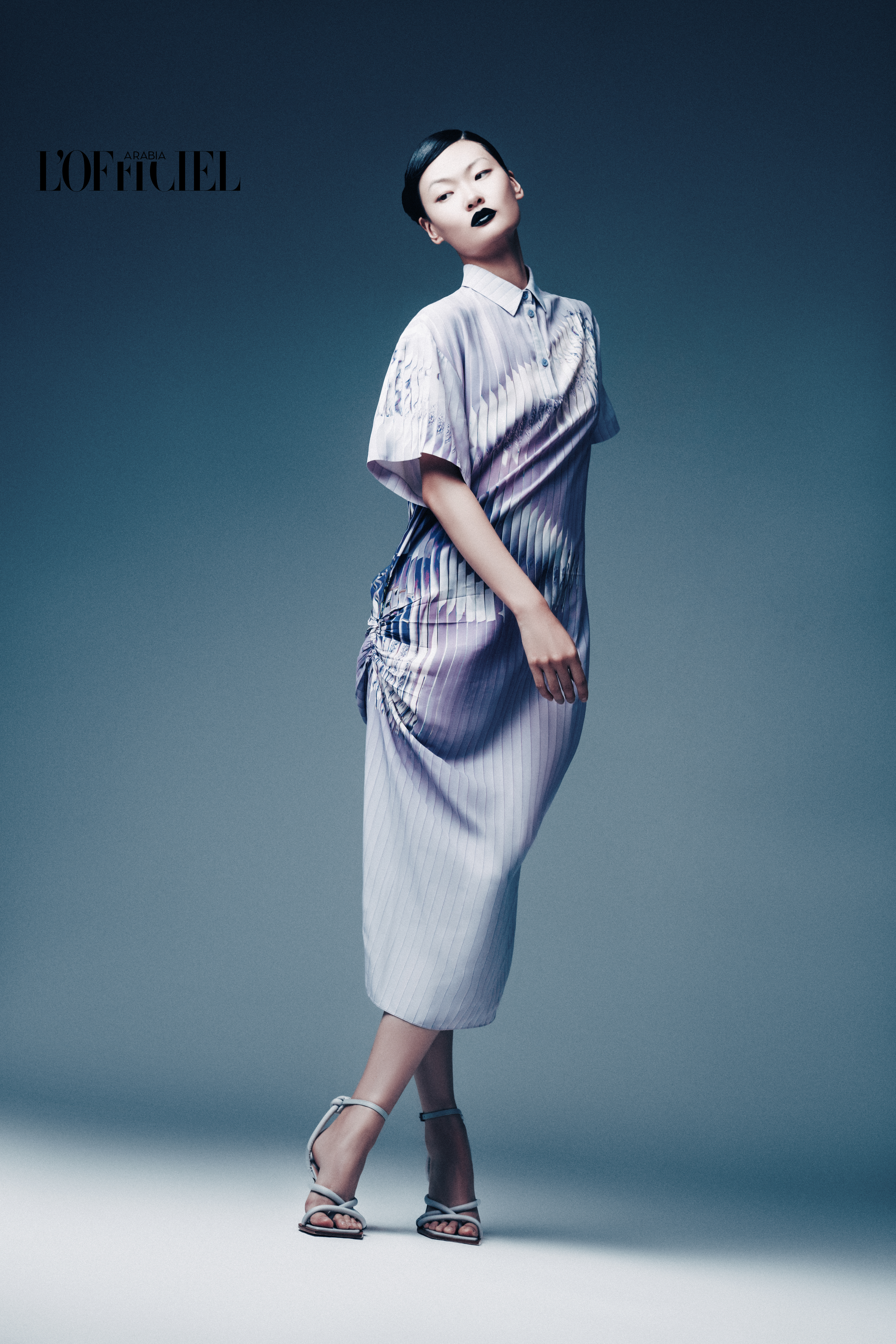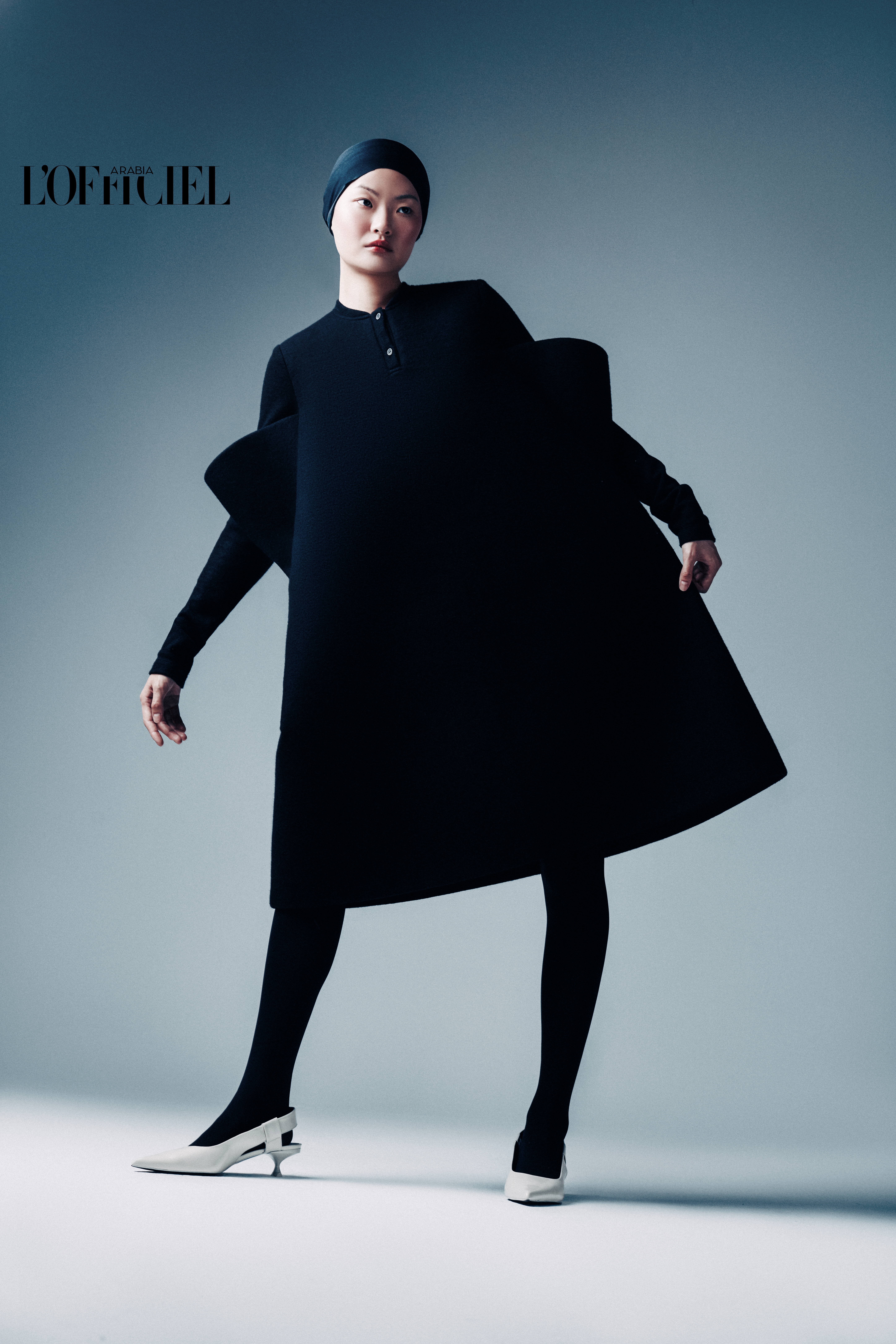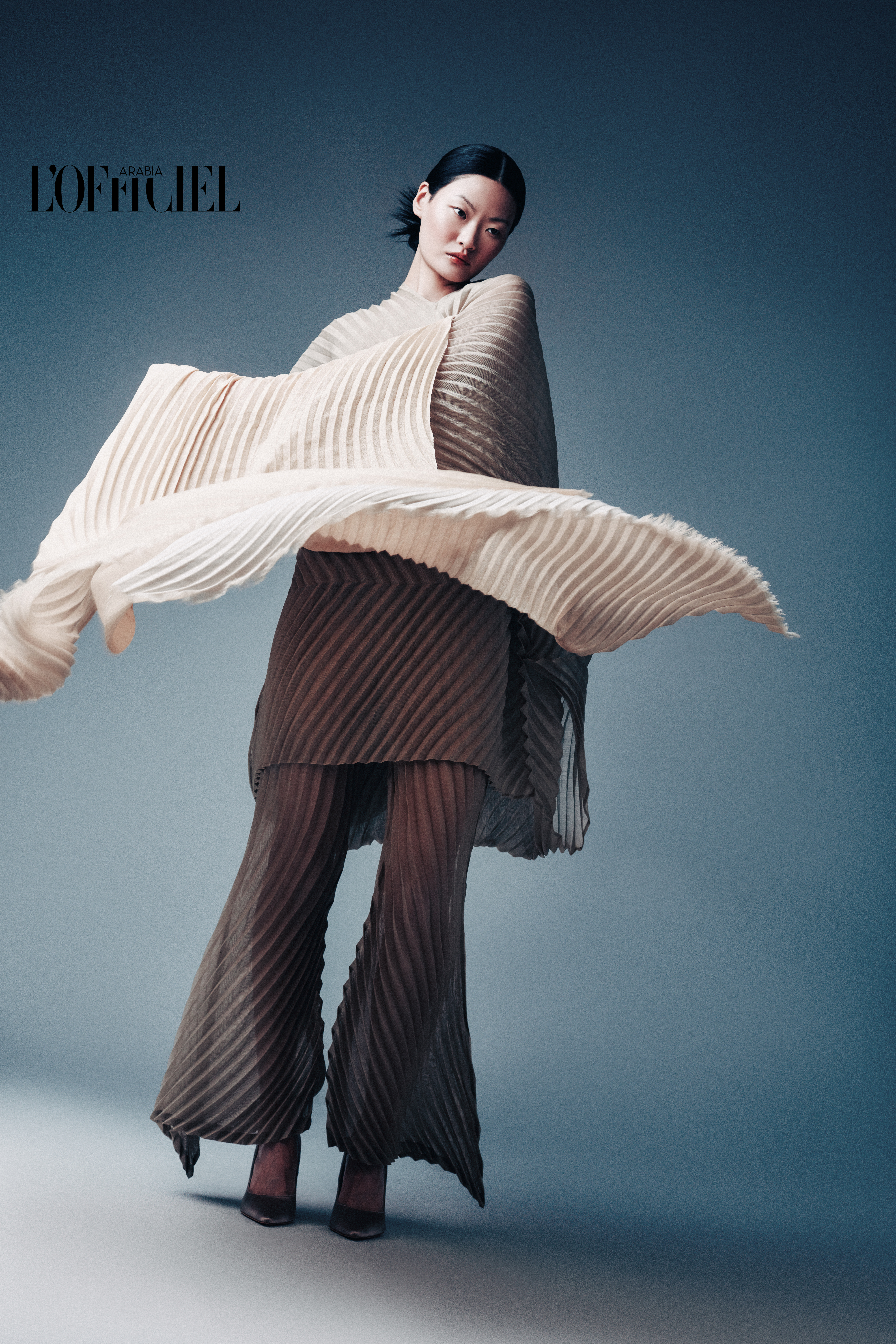 Top, shawl, and Trousers from ISSEY MIYAKE, Champagne satin shoes from LODI