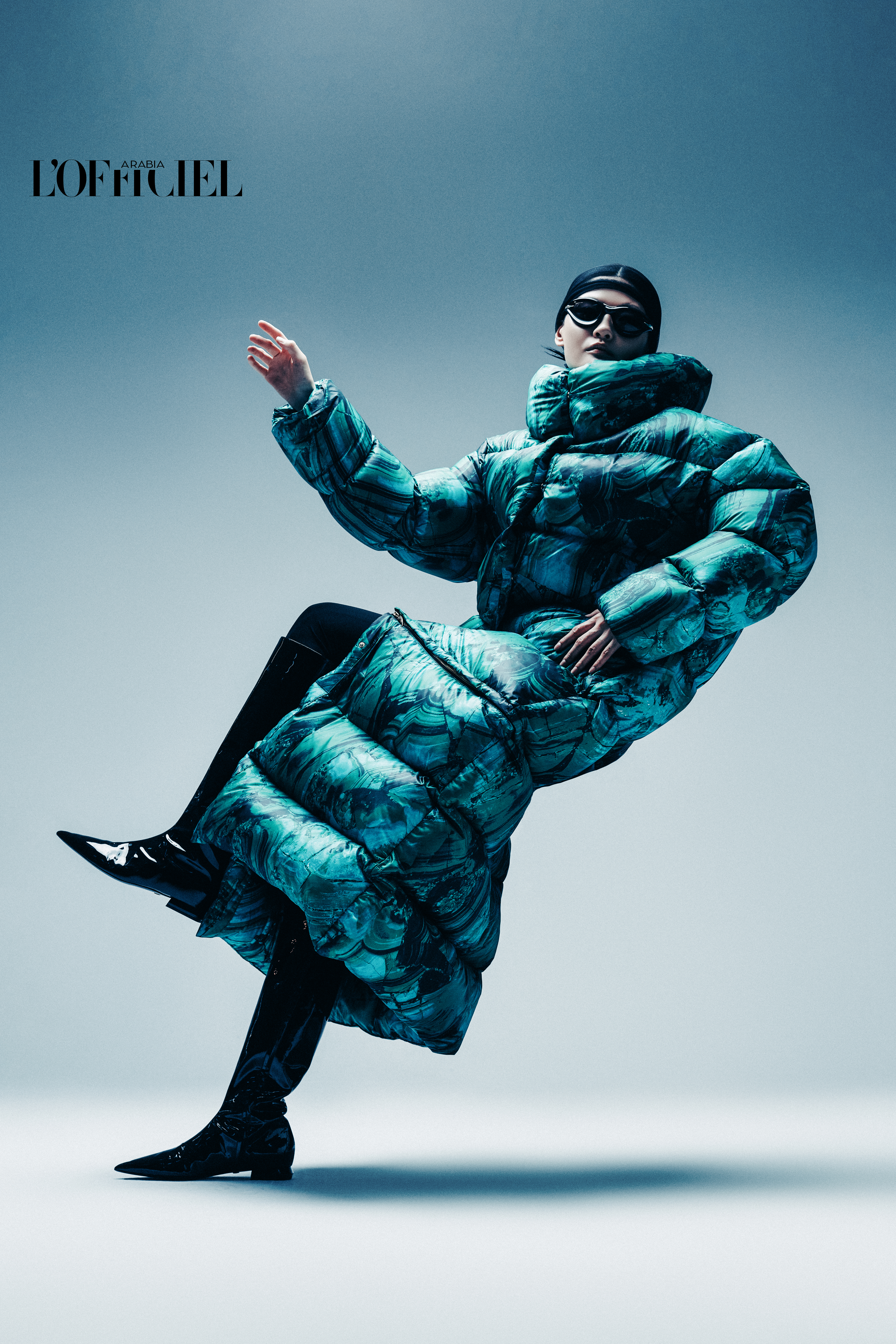 Marble-printed puffer jacket, Patent leather boots, and Sunglasses from ROBERTO CAVALLI