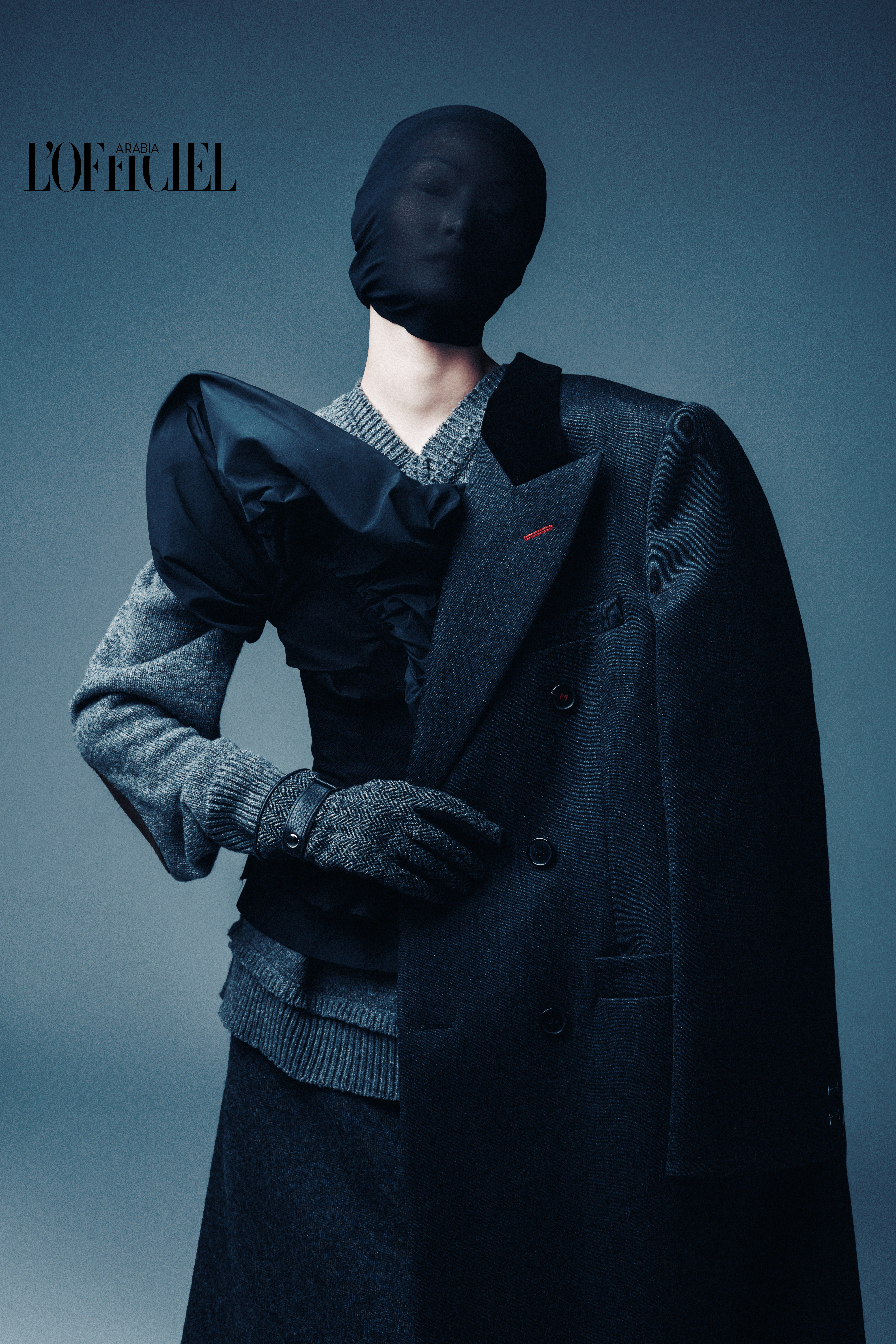 Gray sweater, Straight wool skirt, Ruffled top with tacking details, Wool coat, Herringbone gloves, and Gauze mask from MAISON MARGIELA
