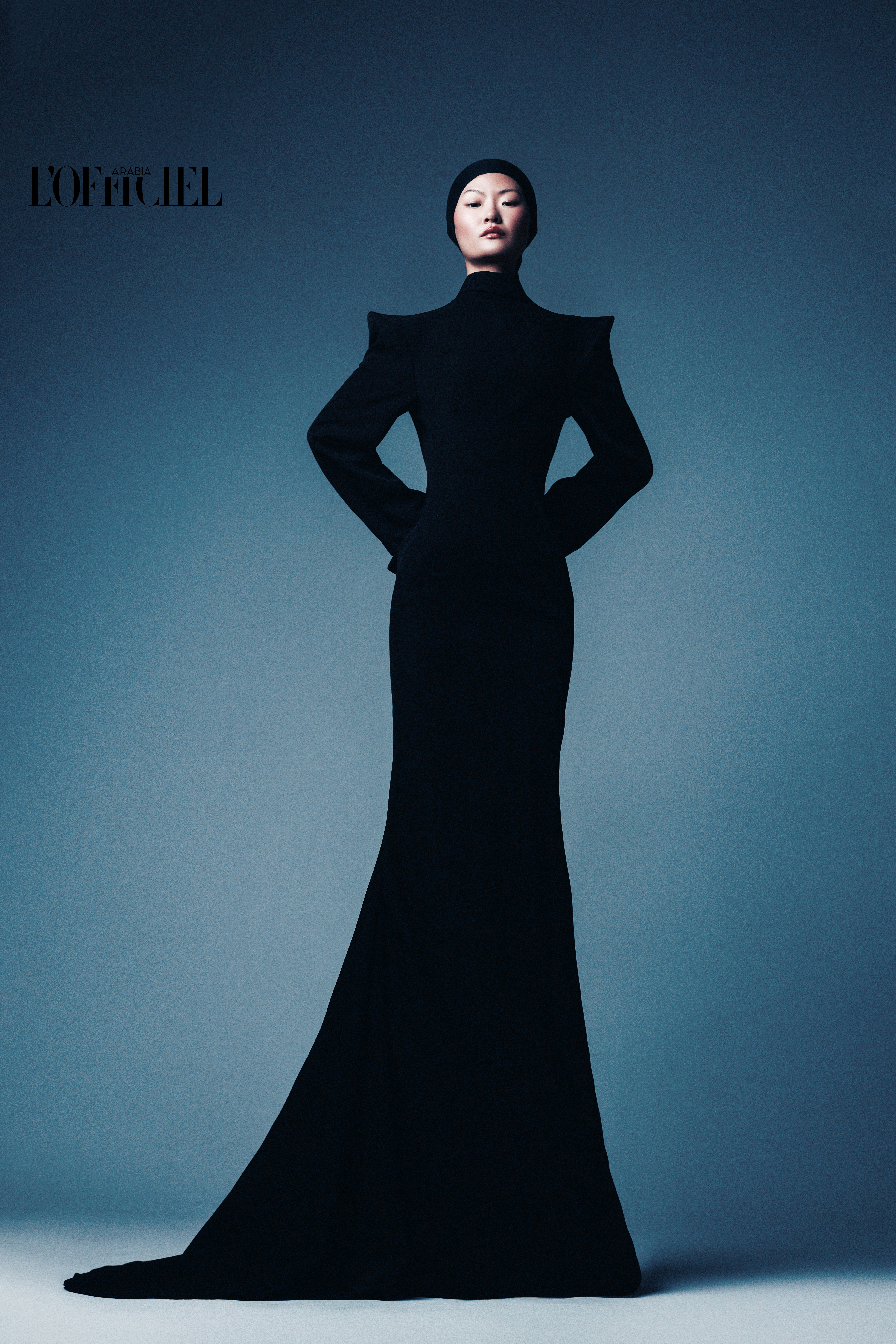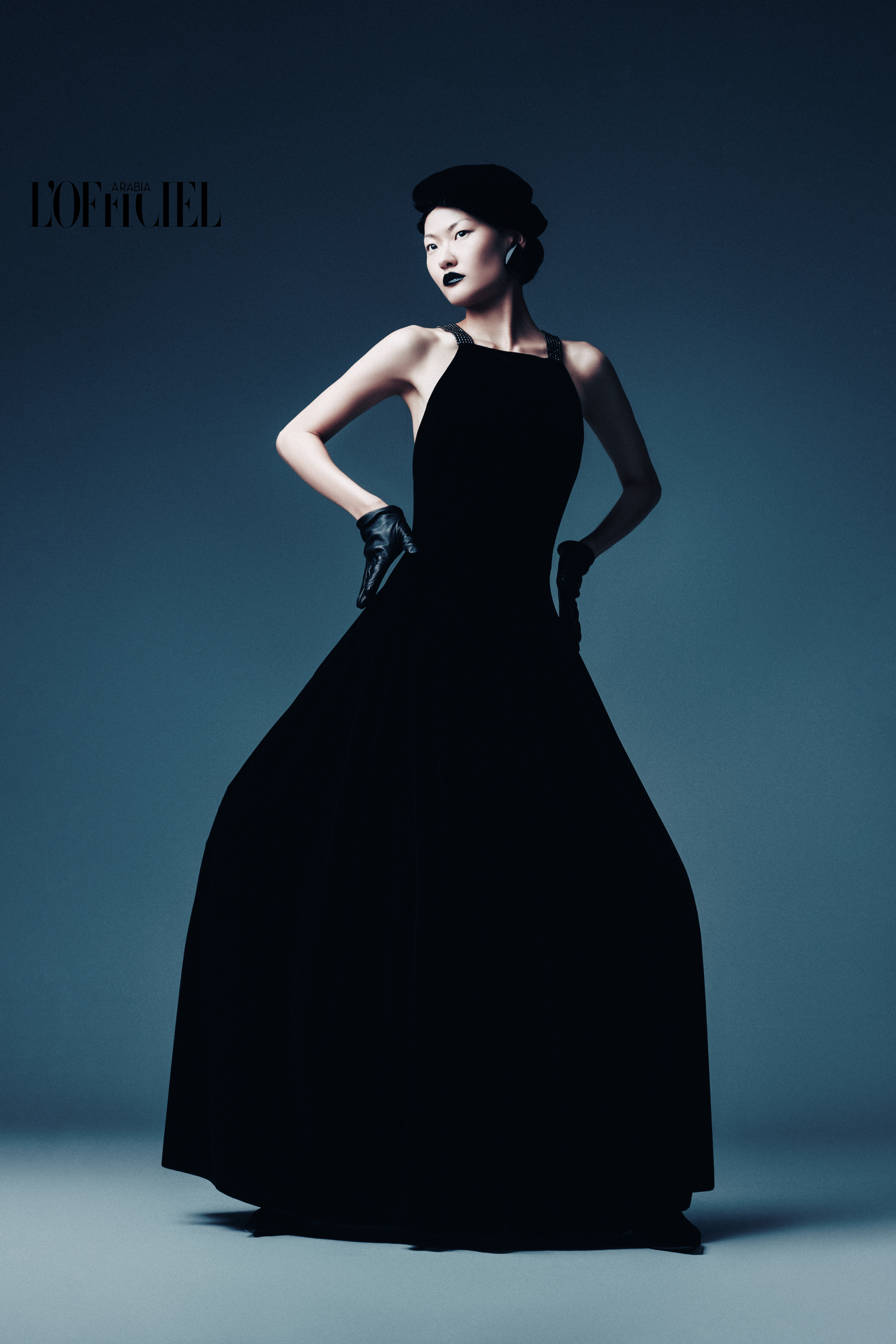 Black velvet dress, Leather gloves, Shoes, Beret, and Earrings from EMPORIO ARMANI