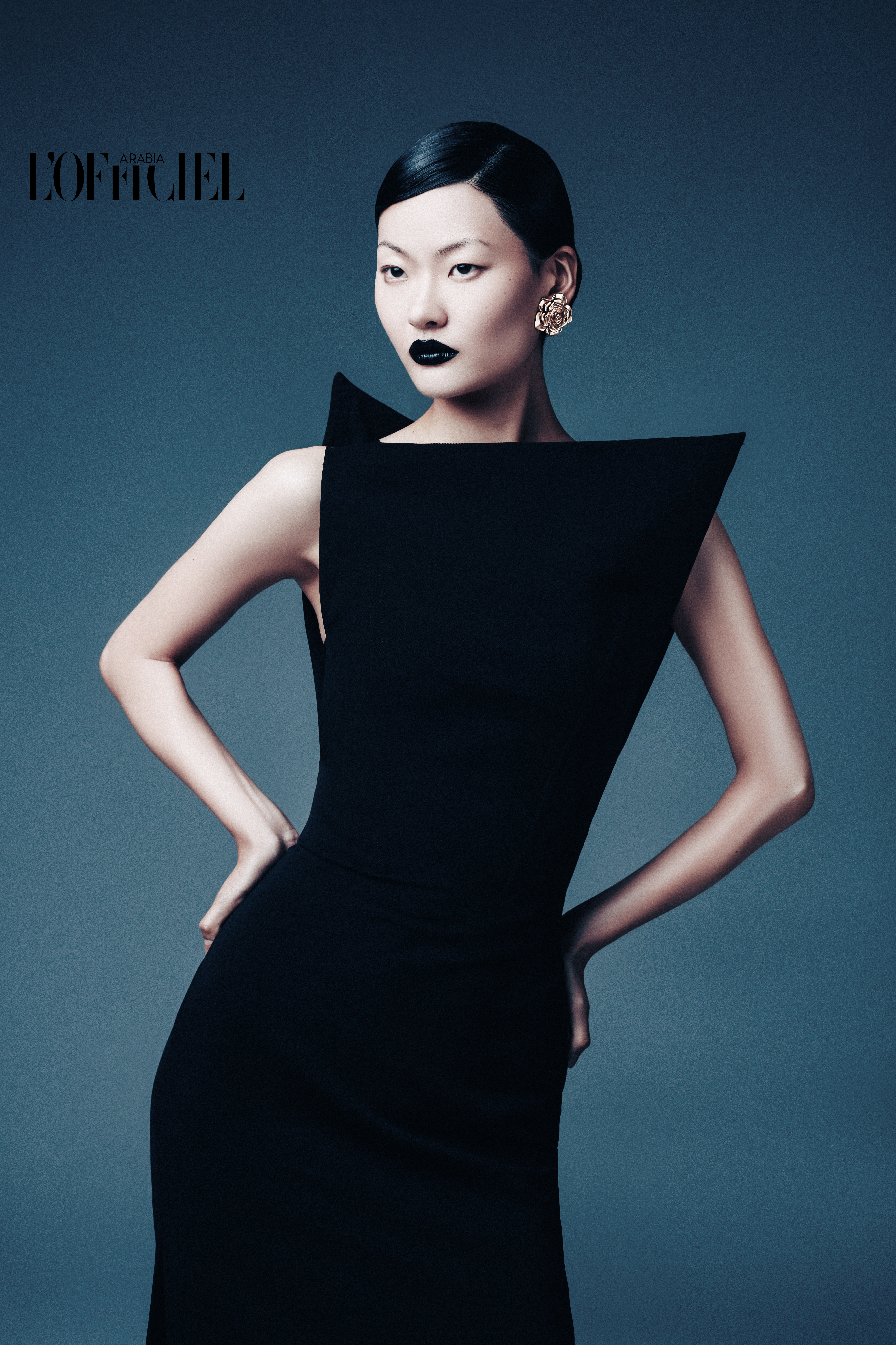 Structured neckline dress from Sportmax and Floral earrings from YVES SAINT LAURENT (VINTAGE ARCHIVE OF THE STYLIST)