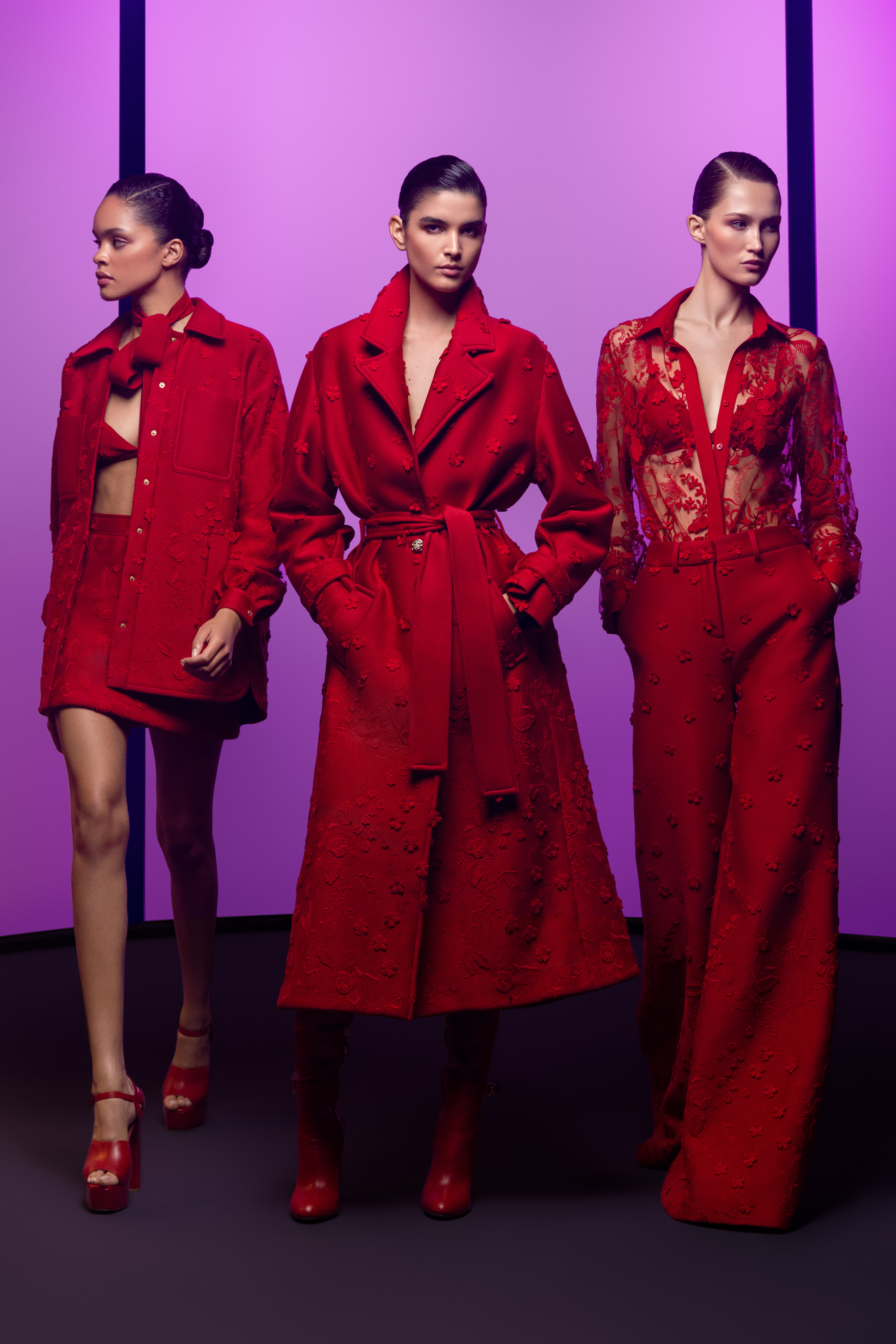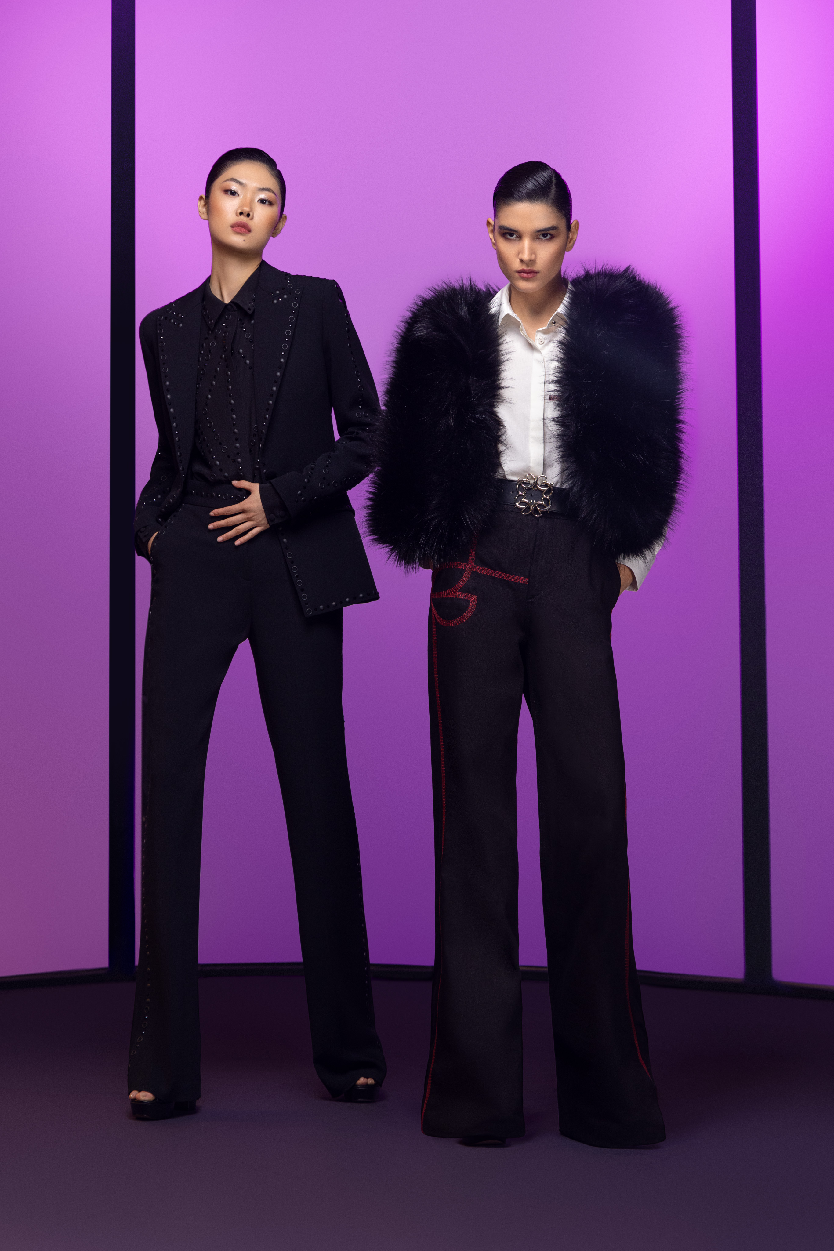 The collection of dark and sophisticated expressions invokes captivating allure, lavish opulence, and sheer power into the present moment. Vivid strokes of saturated colour add wisps of brilliance to strong silhouettes in dominant shades of black. Like bursts of elation, Sangria and Purple Magic sequins splash across tulle embroidered tailored suits. In the same breath, Fanfare Aqua and a touch of Nautical Blue cascade down strapless dresses and plunging V-neck gowns, illuminating more defined lines. Floral buds dot across New Red scuba mini-skirts and Moonflower White cotton shirts, while three-dimensional foliage blossoms out of boxy leather shirts and matching A-line skirts. Geometric embroidered monograms youthfully thread across a structured denim skirt highlighting outlines through illusions of movement.