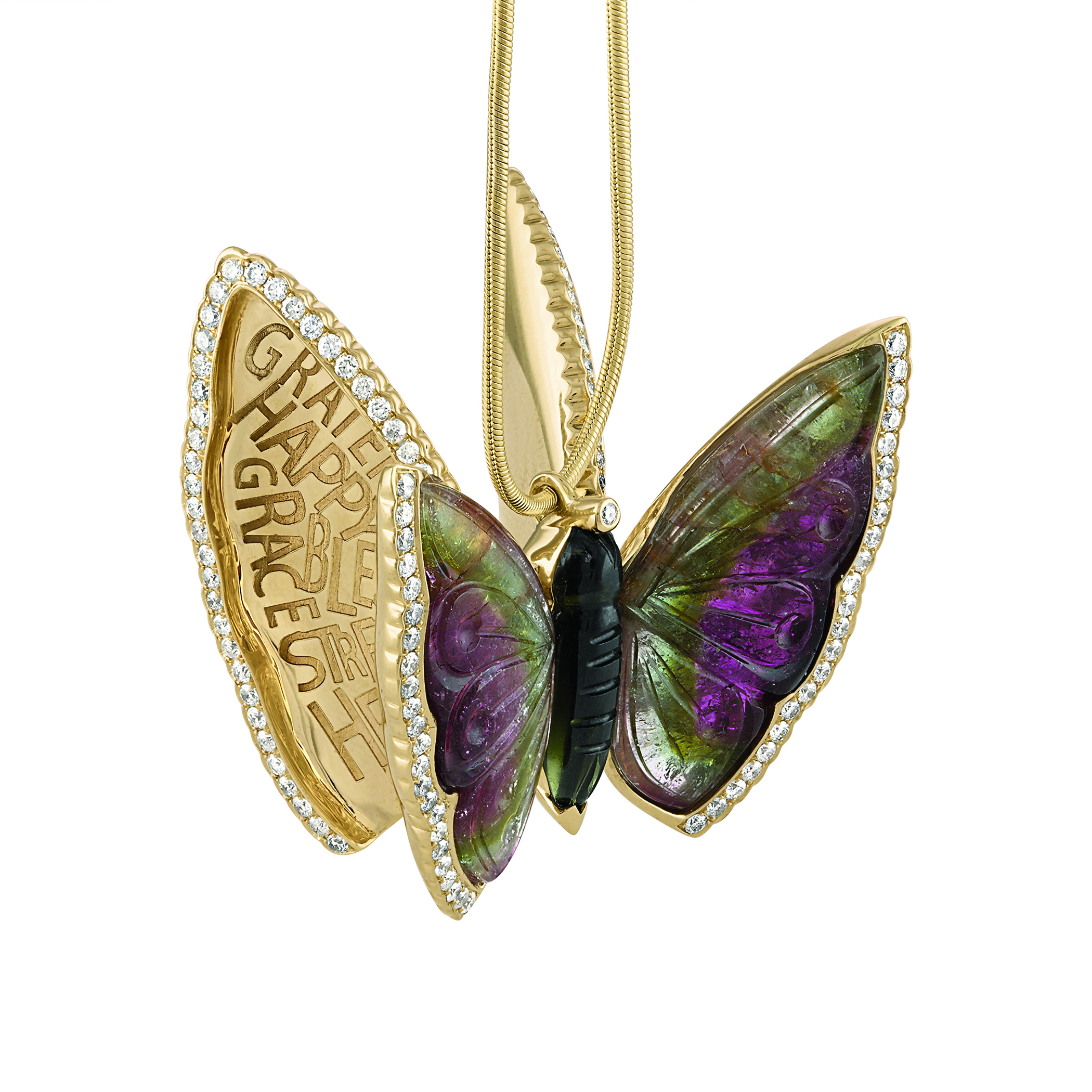 The latest collection by Eden Presley titled “Flora and Fauna” is a collection of whimsical animals and flowers with unexpected elements and one-of-a-kind designs such as the butterfly lockets. These exceptional modern heirlooms are made of carved tourmaline wings which lift up to reveal hidden words and affirmations.