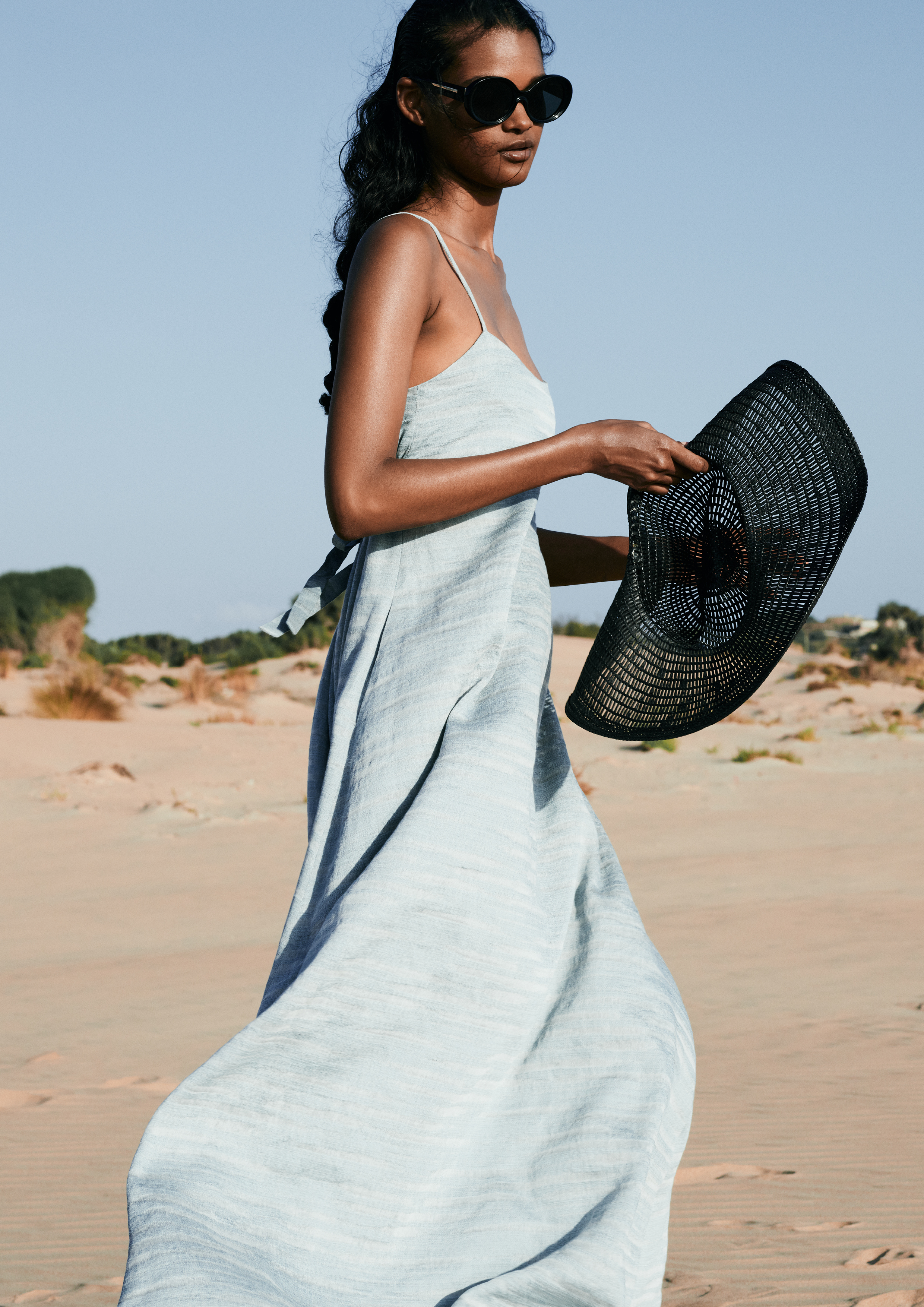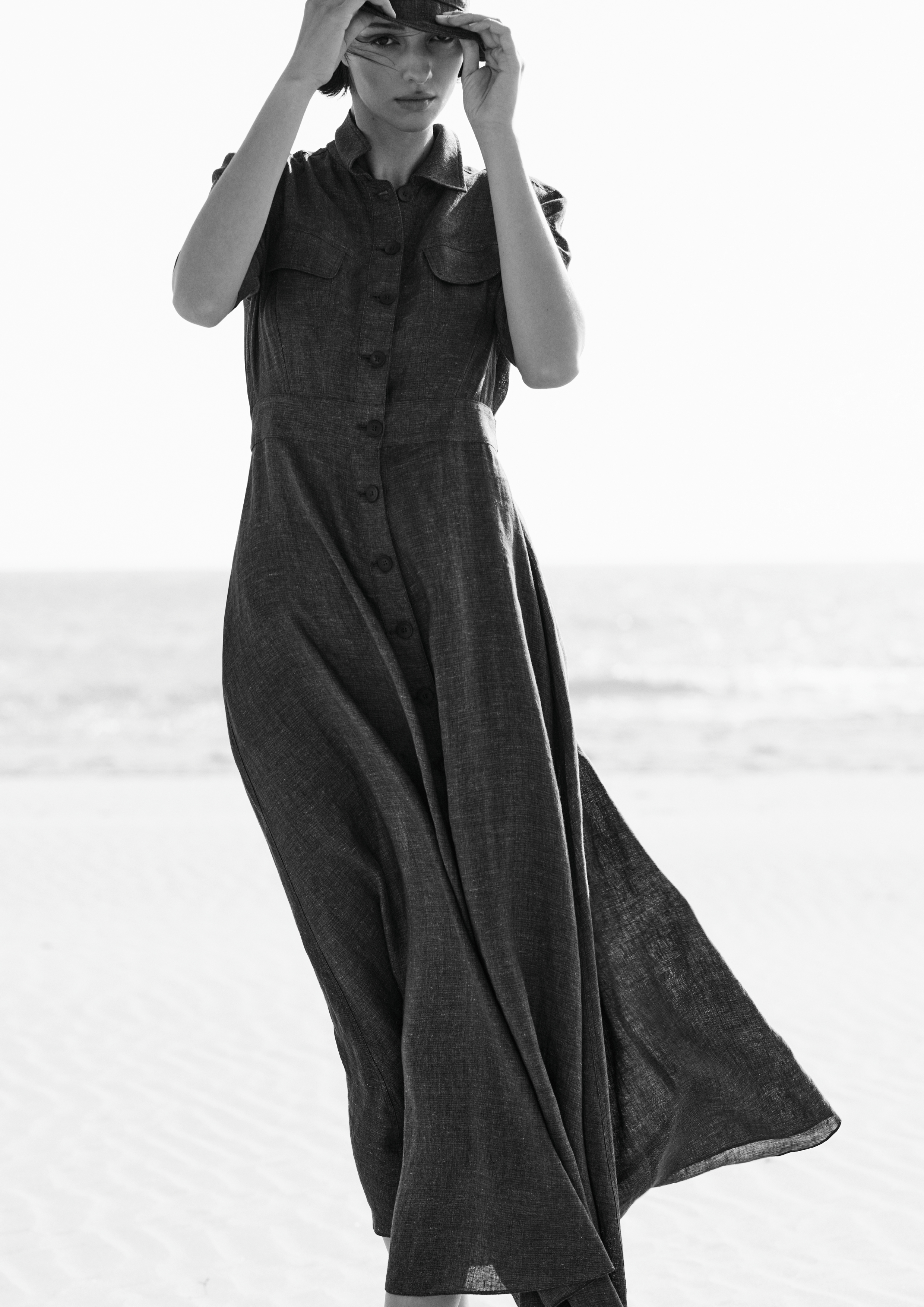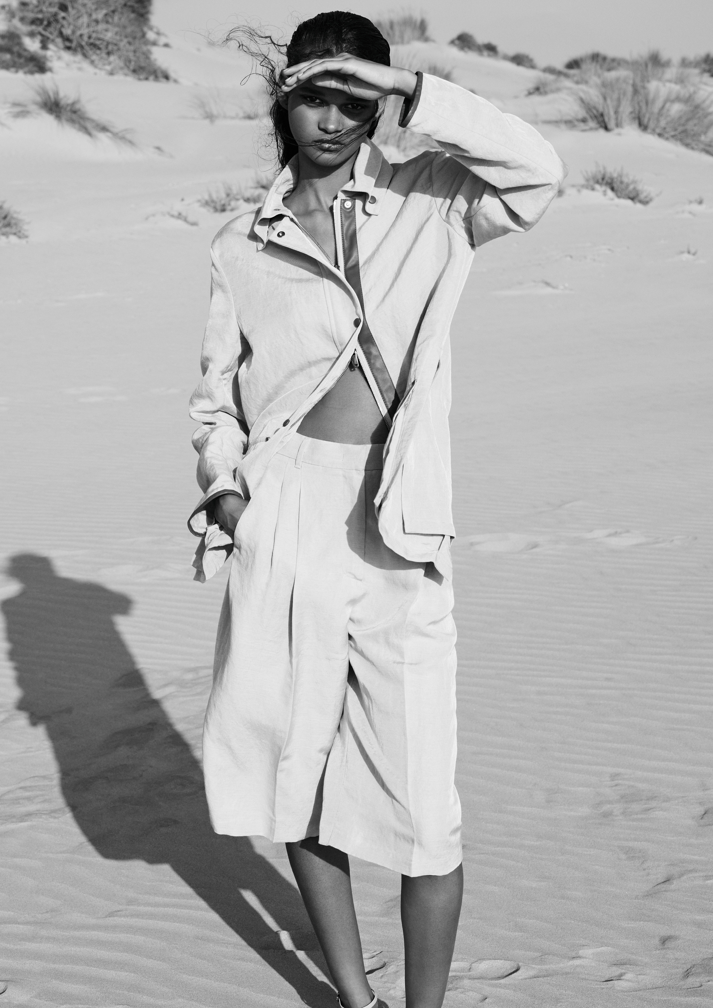 Jackets, shirts, blouses and blazers matched with soft trousers or Bermuda shorts, and loose dresses, all brought up to date in volume and materials such as linen, cotton silk blend, or denim-look cotton.