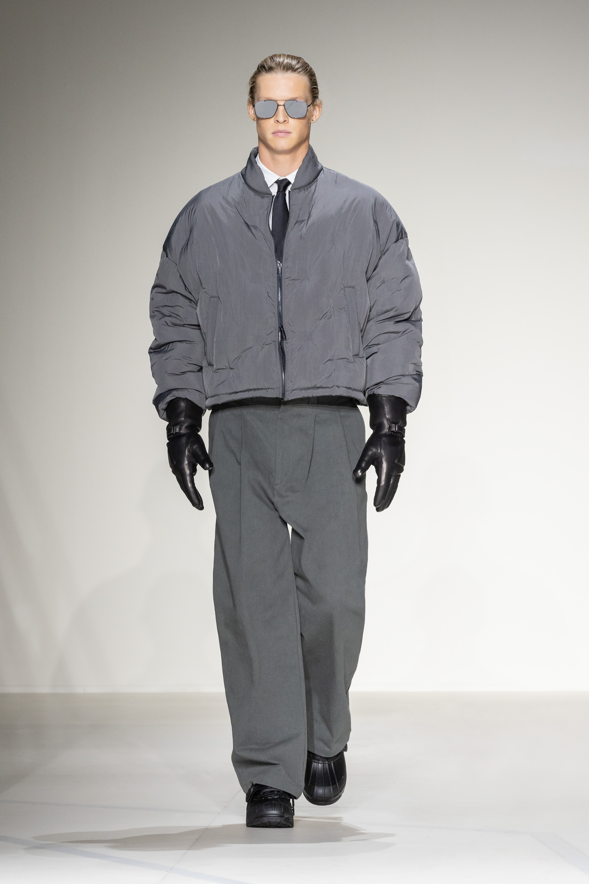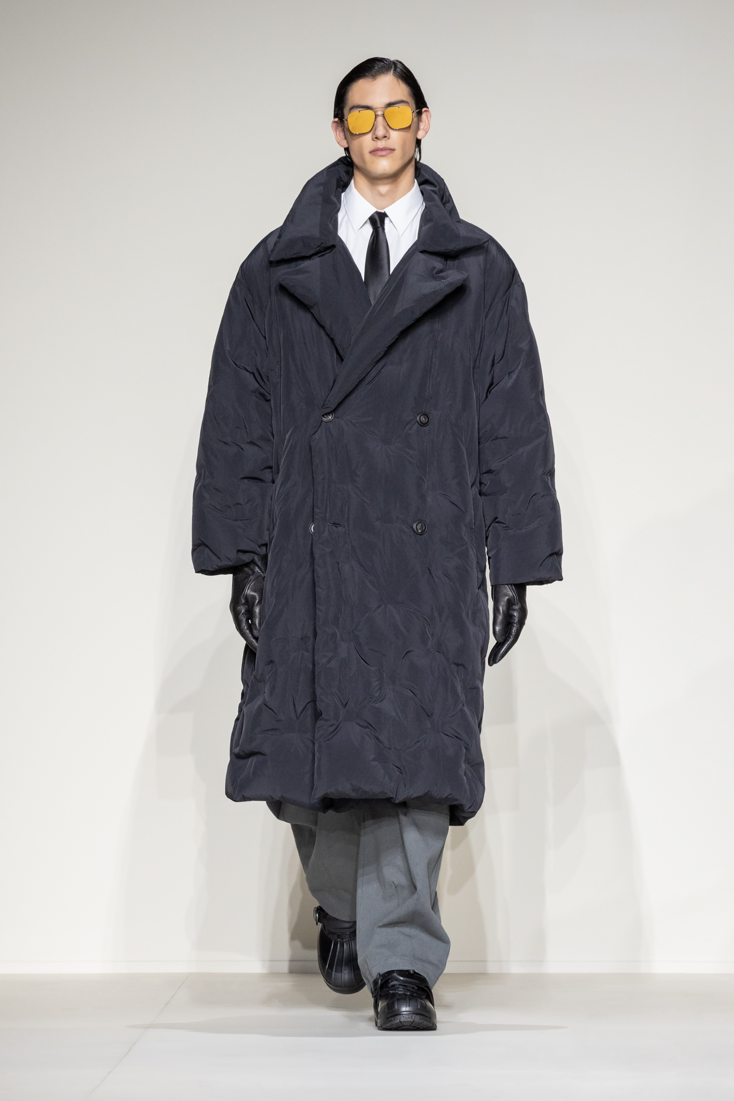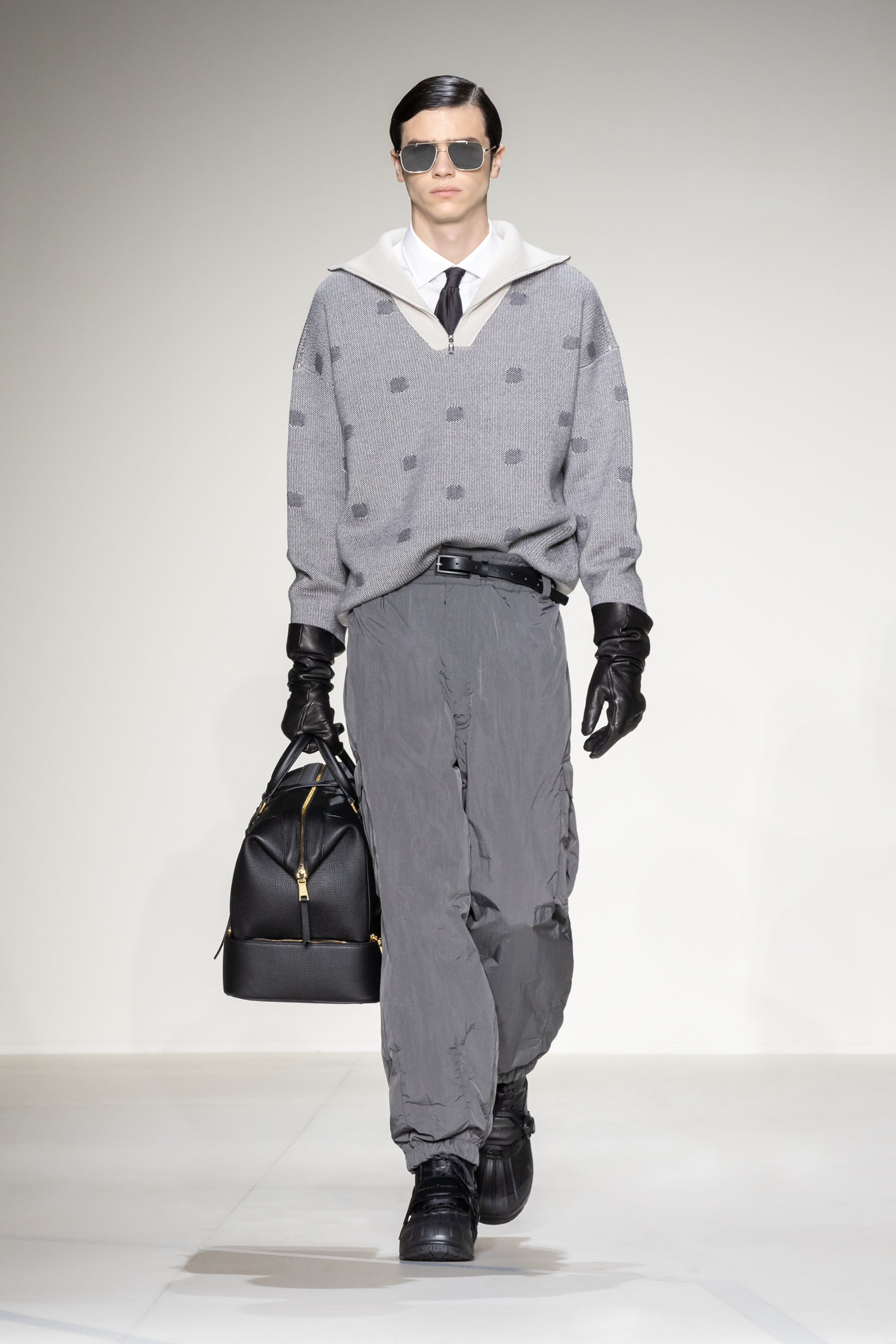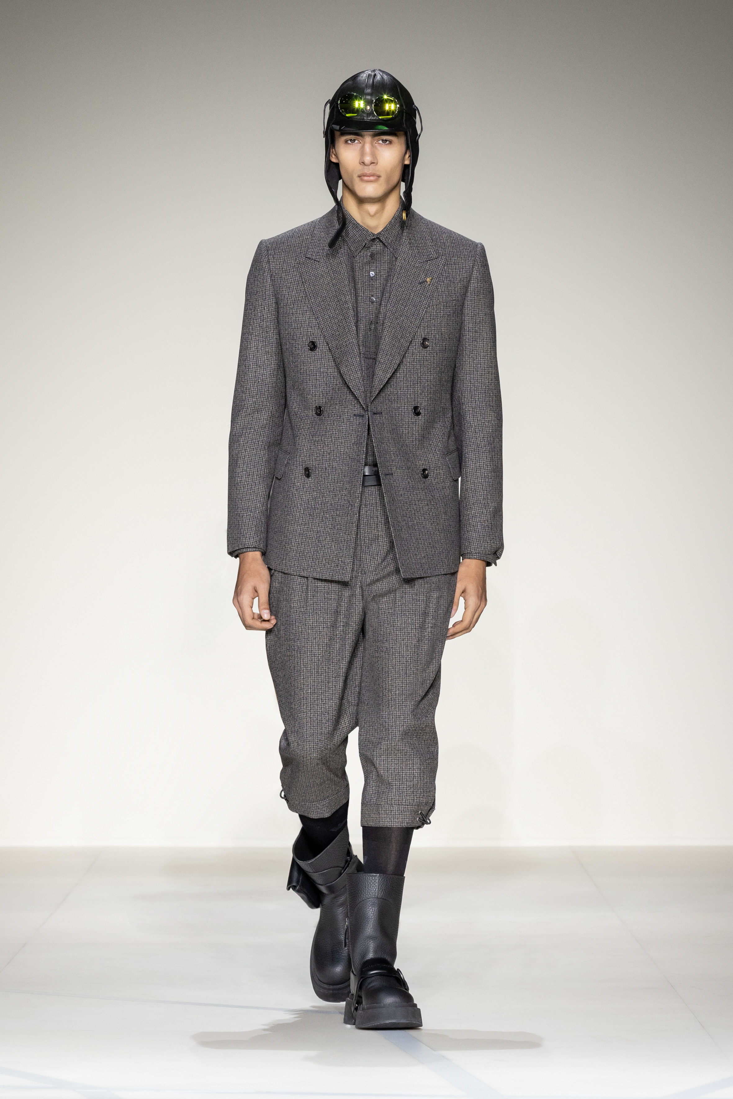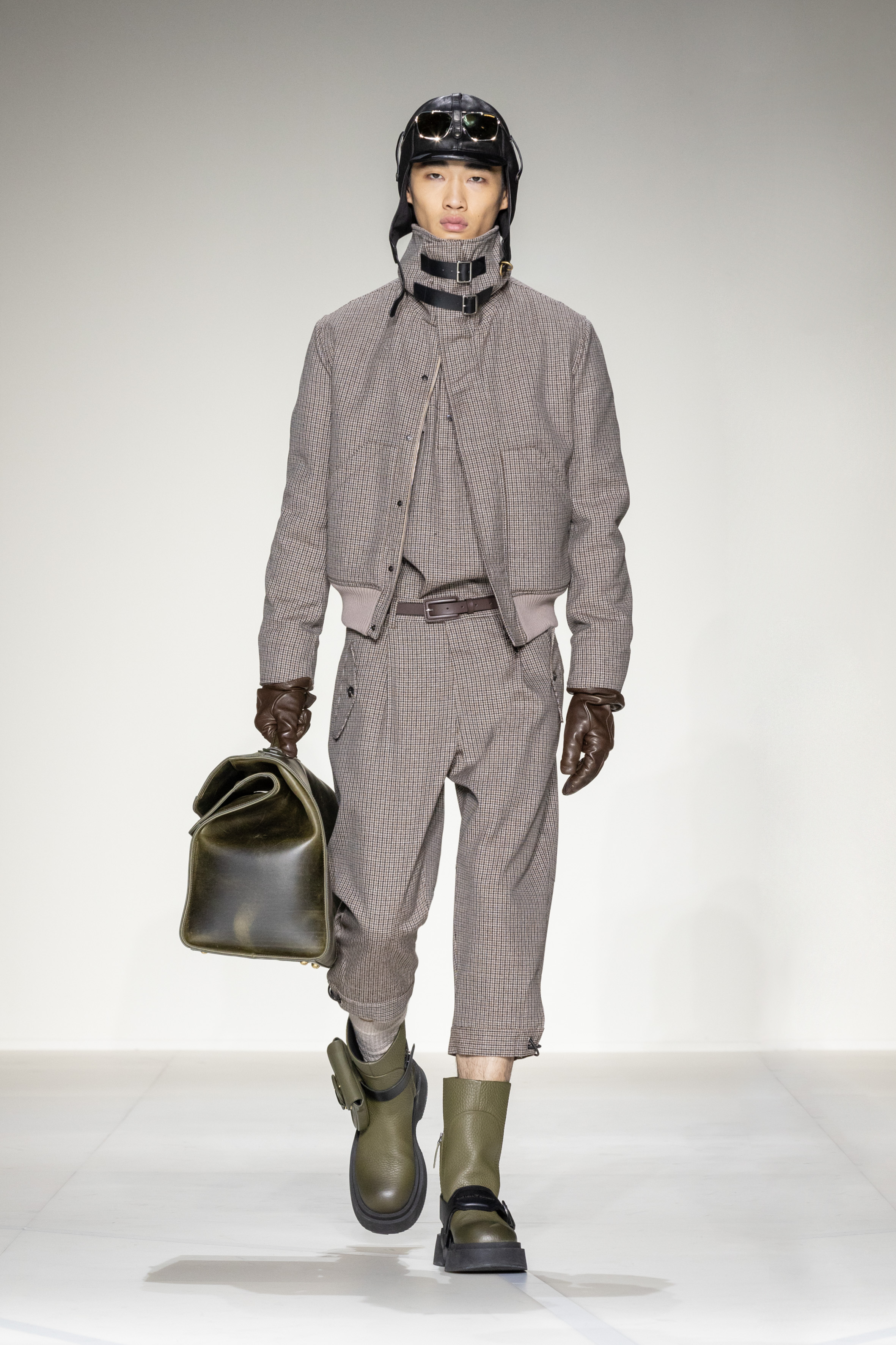 Flight reveals the city from above with the central points marked on a map as the backdrop to the brand logo. This collection is a tribute to the 1930s aviator and his world, to the sophisticated severity and adventurous precision of his style, to the metallic glints of the planes and hangars. The idea of a human in flight reinvents a figure that has always been central to the Armani imagination, dressing him in sport-inspired clothes made from soft, high-impact materials, with enveloping volumes and designs that expand and dilate the classic Prince of Wales and houndstooth checks. Silhouettes are varied: coats, trench coats, double-breasted pea coats and blousons are worn with cropped trousers, complete with boots and lace-ups that boast thick soles to mark every step. The rhythm of the patterns expands into everything else: even oversized t-shirts are made in the same wools as coats and trousers. Leather and knit are essential elements that add grit and comfort: vintage-style bomber jackets, long tricot coats, and cardigans with matching gilets to create new twin sets. This evening is no less sophisticated and the Emporio avaitor explores the pleasure of velvet and the sparkle of crystals, indulging in the languor of silk blouses with long scarf collars with no disdain for the rigour of double-breasted jackets.