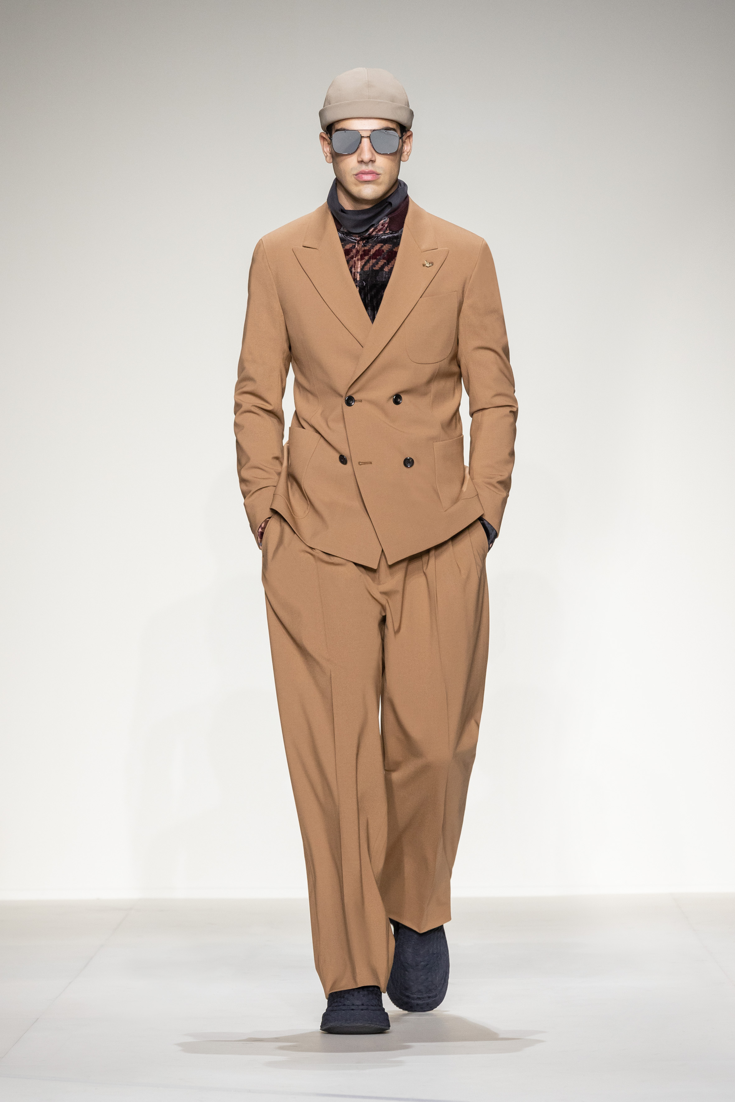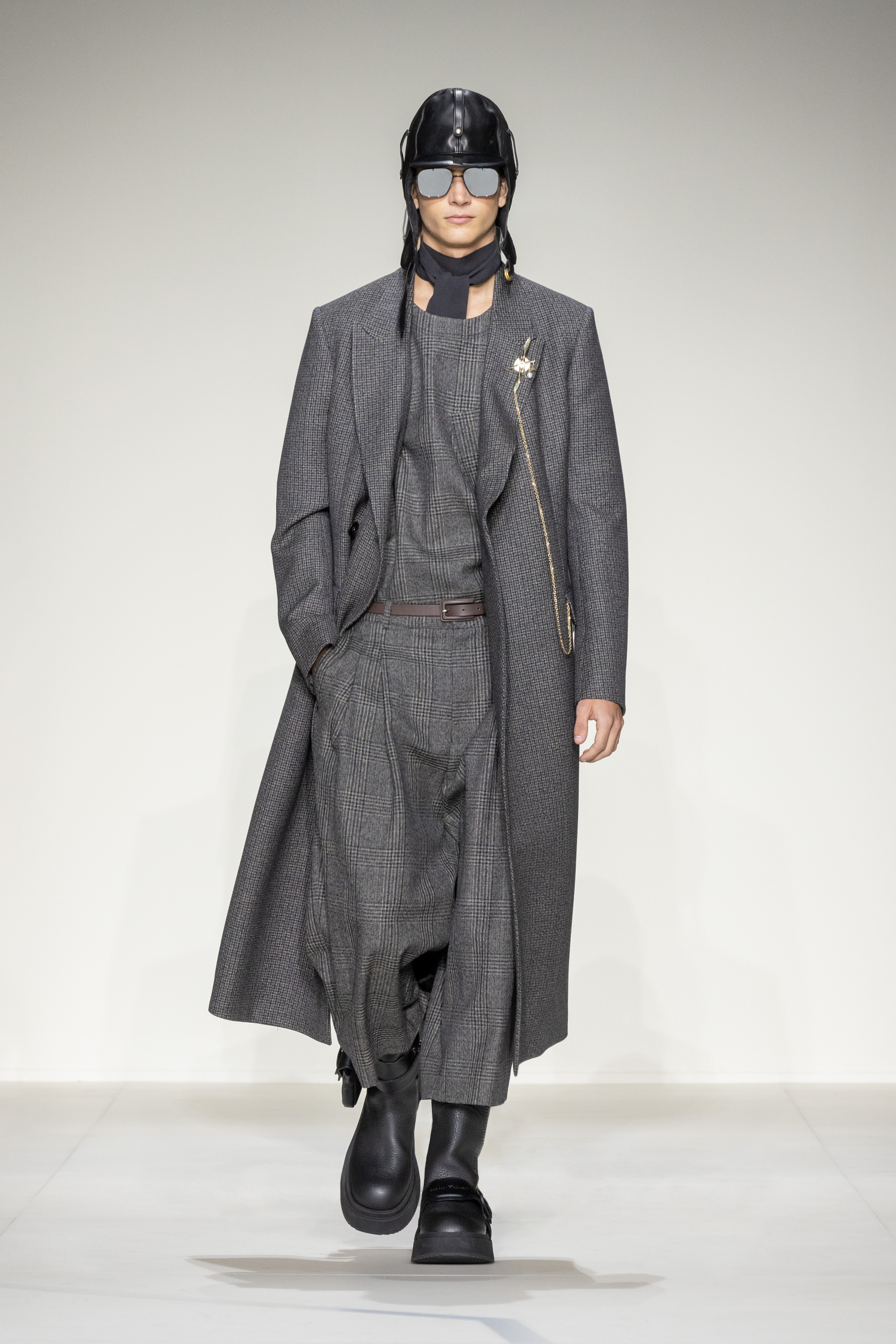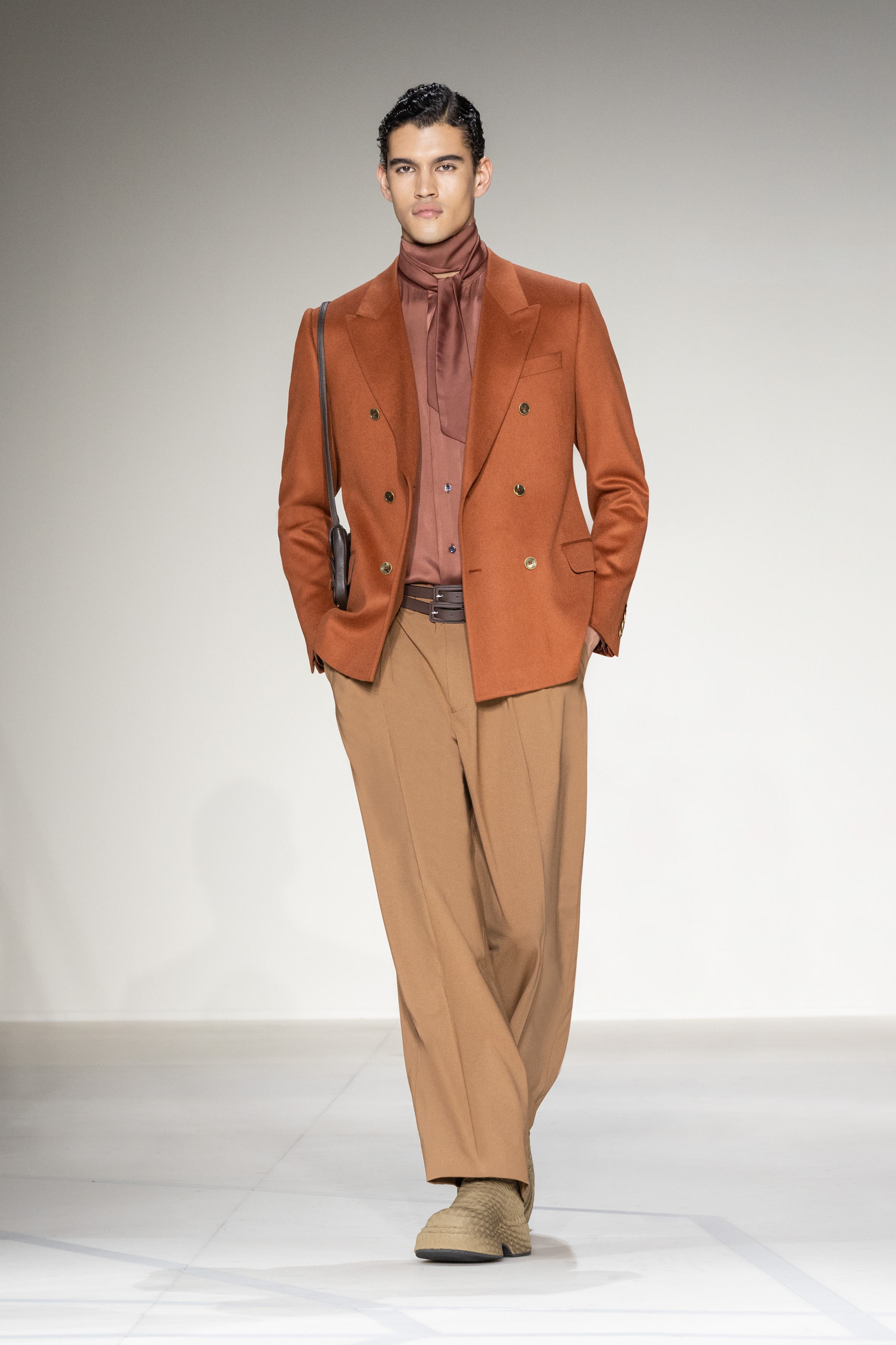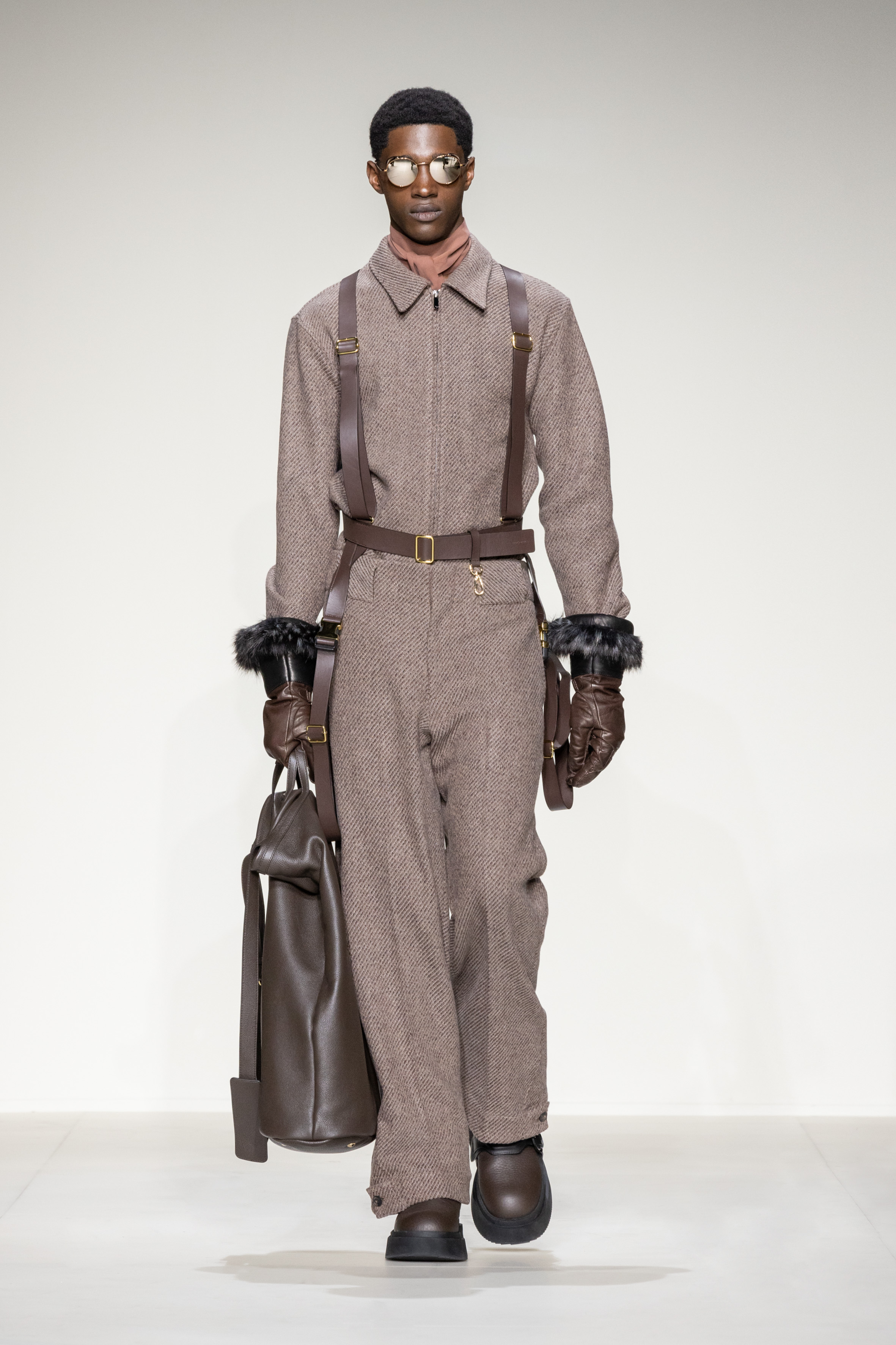 Flight reveals the city from above with the central points marked on a map as the backdrop to the brand logo. This collection is a tribute to the 1930s aviator and his world, to the sophisticated severity and adventurous precision of his style, to the metallic glints of the planes and hangars. The idea of a human in flight reinvents a figure that has always been central to the Armani imagination, dressing him in sport-inspired clothes made from soft, high-impact materials, with enveloping volumes and designs that expand and dilate the classic Prince of Wales and houndstooth checks. Silhouettes are varied: coats, trench coats, double-breasted pea coats and blousons are worn with cropped trousers, complete with boots and lace-ups that boast thick soles to mark every step. The rhythm of the patterns expands into everything else: even oversized t-shirts are made in the same wools as coats and trousers. Leather and knit are essential elements that add grit and comfort: vintage-style bomber jackets, long tricot coats, and cardigans with matching gilets to create new twin sets. This evening is no less sophisticated and the Emporio avaitor explores the pleasure of velvet and the sparkle of crystals, indulging in the languor of silk blouses with long scarf collars with no disdain for the rigour of double-breasted jackets.