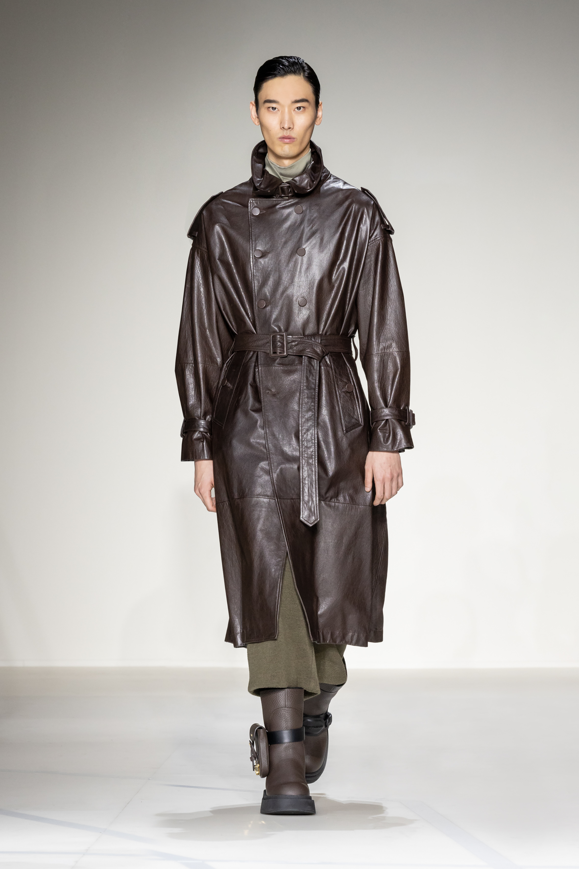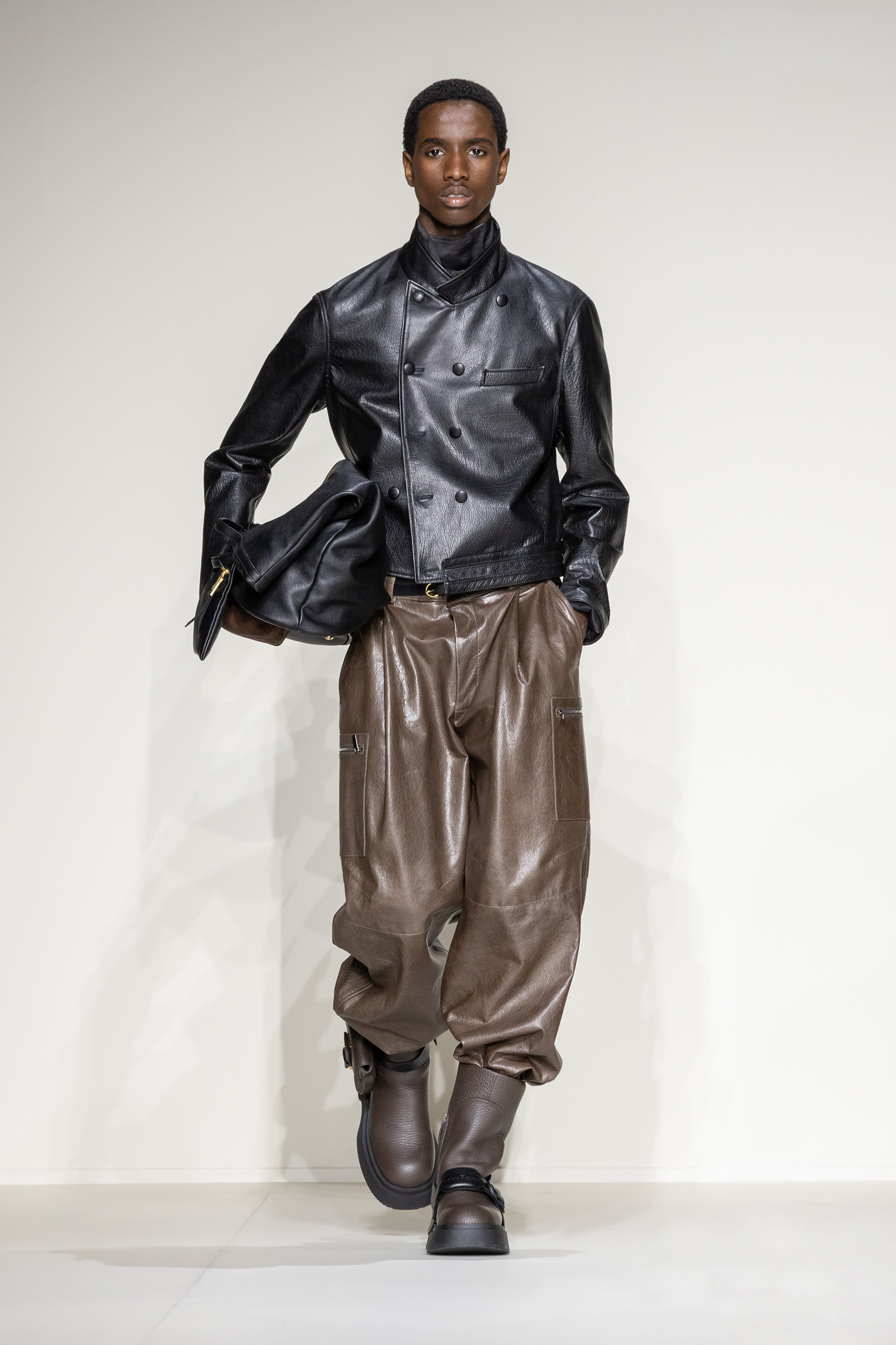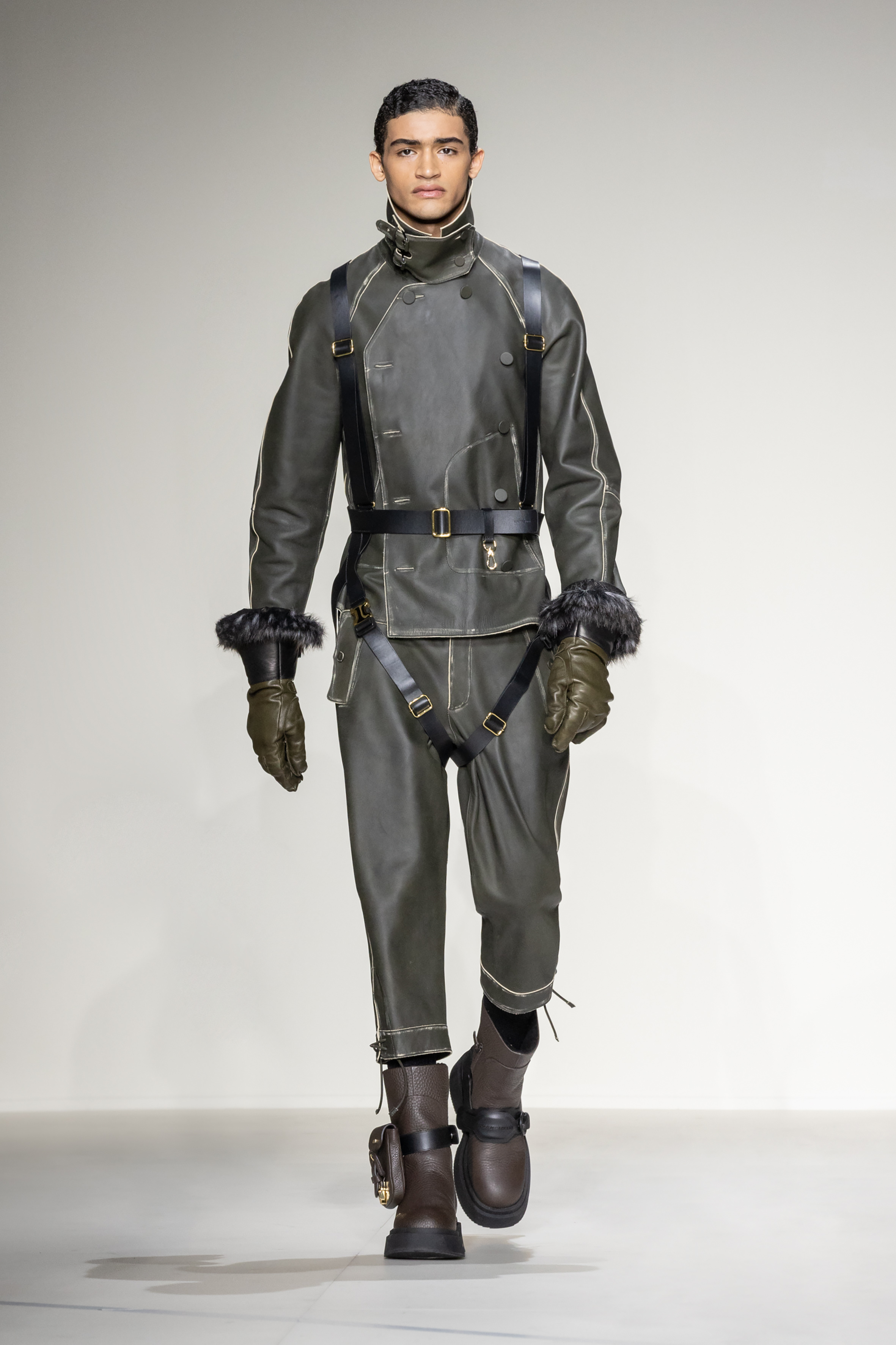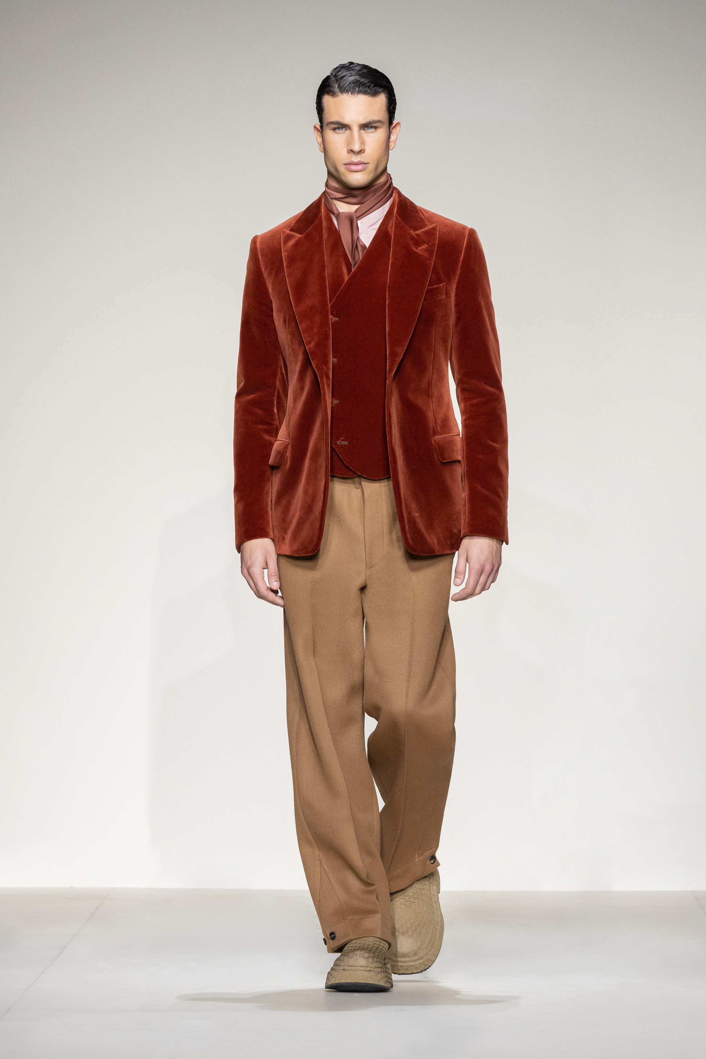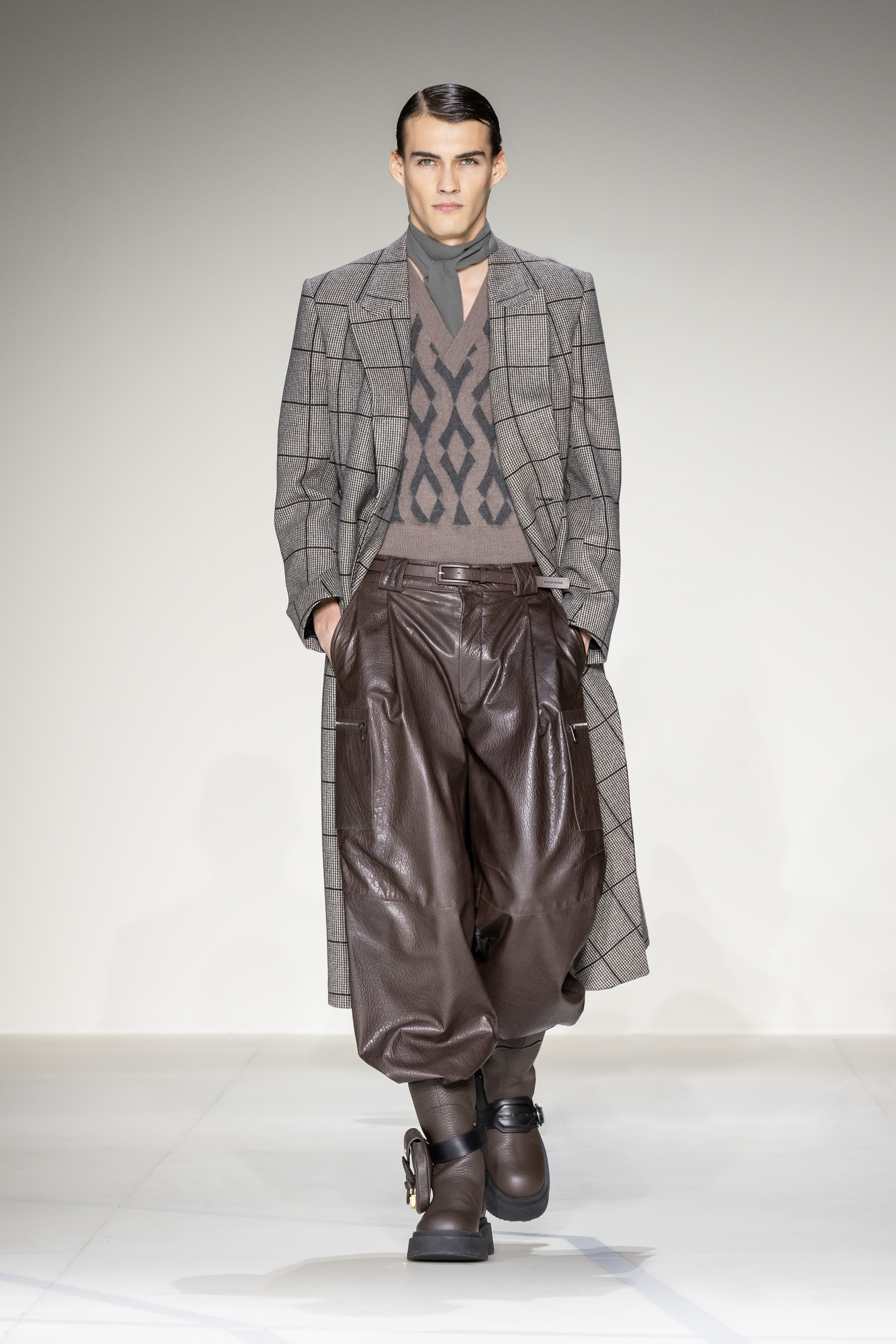 Flight reveals the city from above with the central points marked on a map as the backdrop to the brand logo. This collection is a tribute to the 1930s aviator and his world, to the sophisticated severity and adventurous precision of his style, to the metallic glints of the planes and hangars. The idea of a human in flight reinvents a figure that has always been central to the Armani imagination, dressing him in sport-inspired clothes made from soft, high-impact materials, with enveloping volumes and designs that expand and dilate the classic Prince of Wales and houndstooth checks. Silhouettes are varied: coats, trench coats, double-breasted pea coats and blousons are worn with cropped trousers, complete with boots and lace-ups that boast thick soles to mark every step. The rhythm of the patterns expands into everything else: even oversized t-shirts are made in the same wools as coats and trousers. Leather and knit are essential elements that add grit and comfort: vintage-style bomber jackets, long tricot coats, and cardigans with matching gilets to create new twin sets. This evening is no less sophisticated and the Emporio avaitor explores the pleasure of velvet and the sparkle of crystals, indulging in the languor of silk blouses with long scarf collars with no disdain for the rigour of double-breasted jackets.