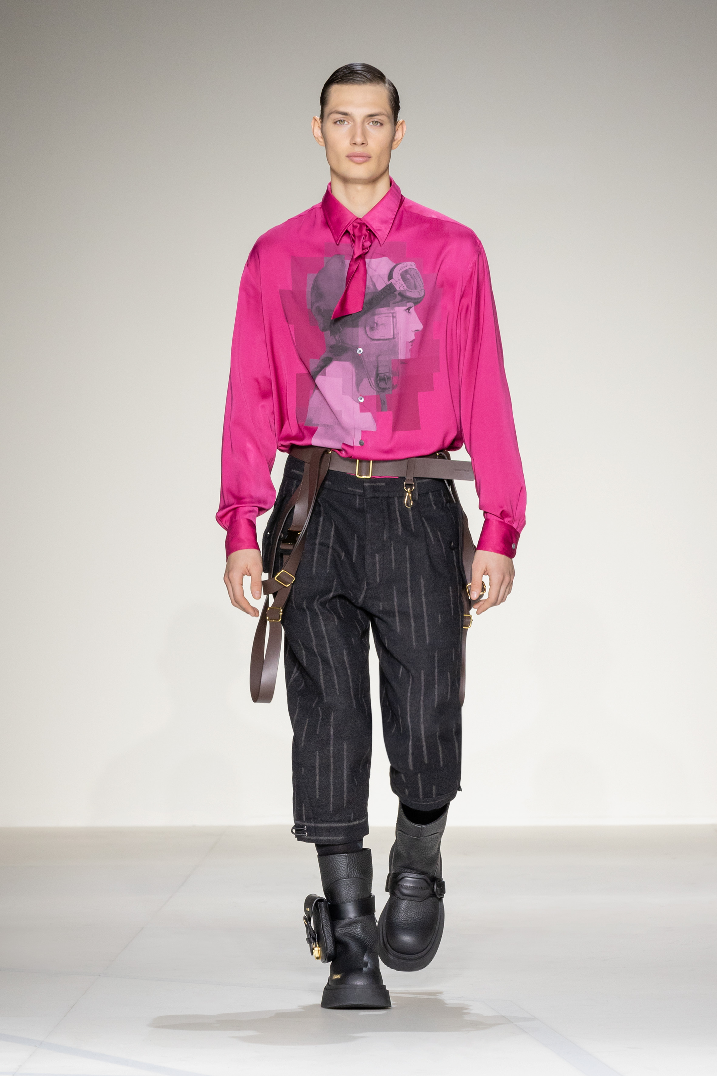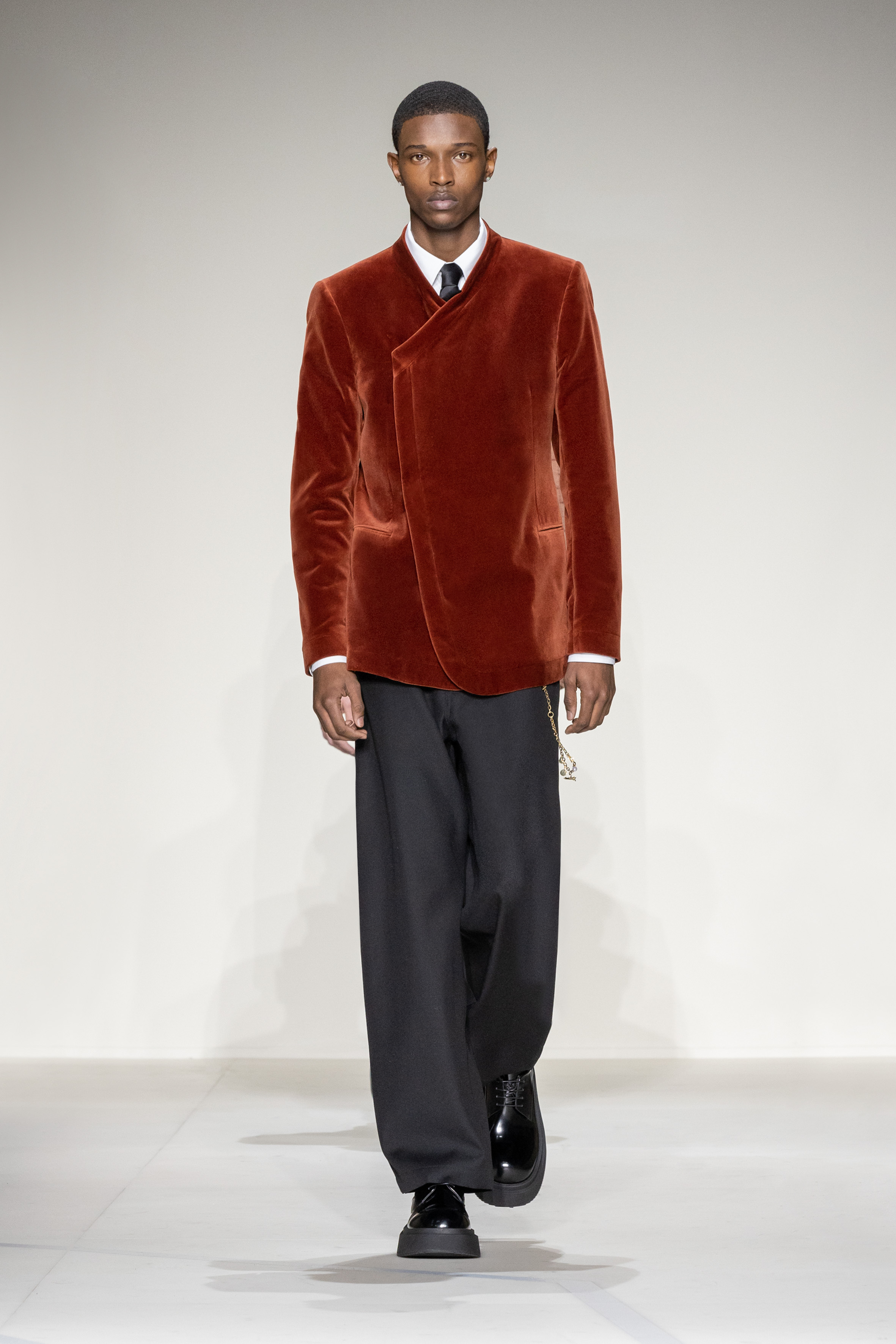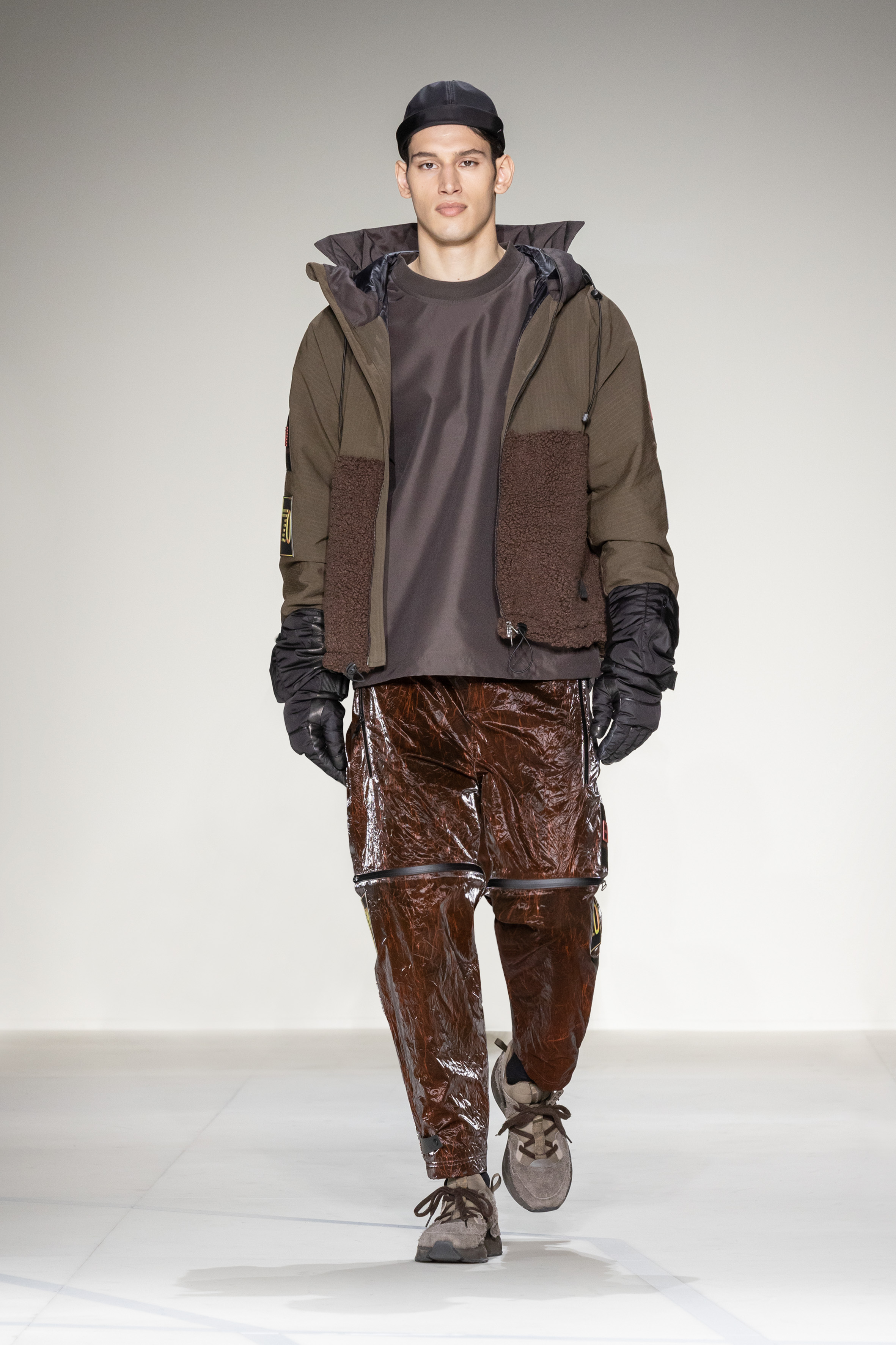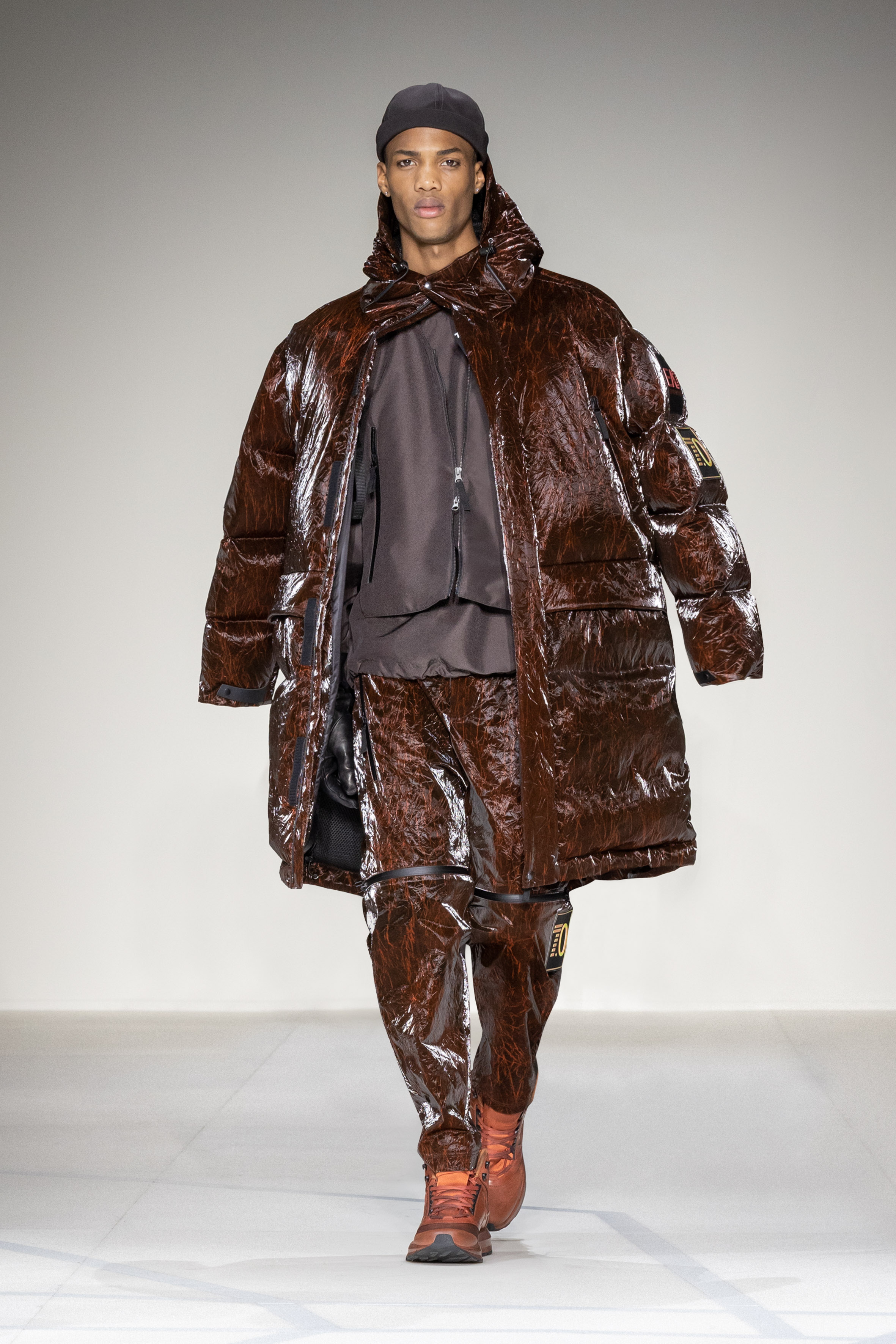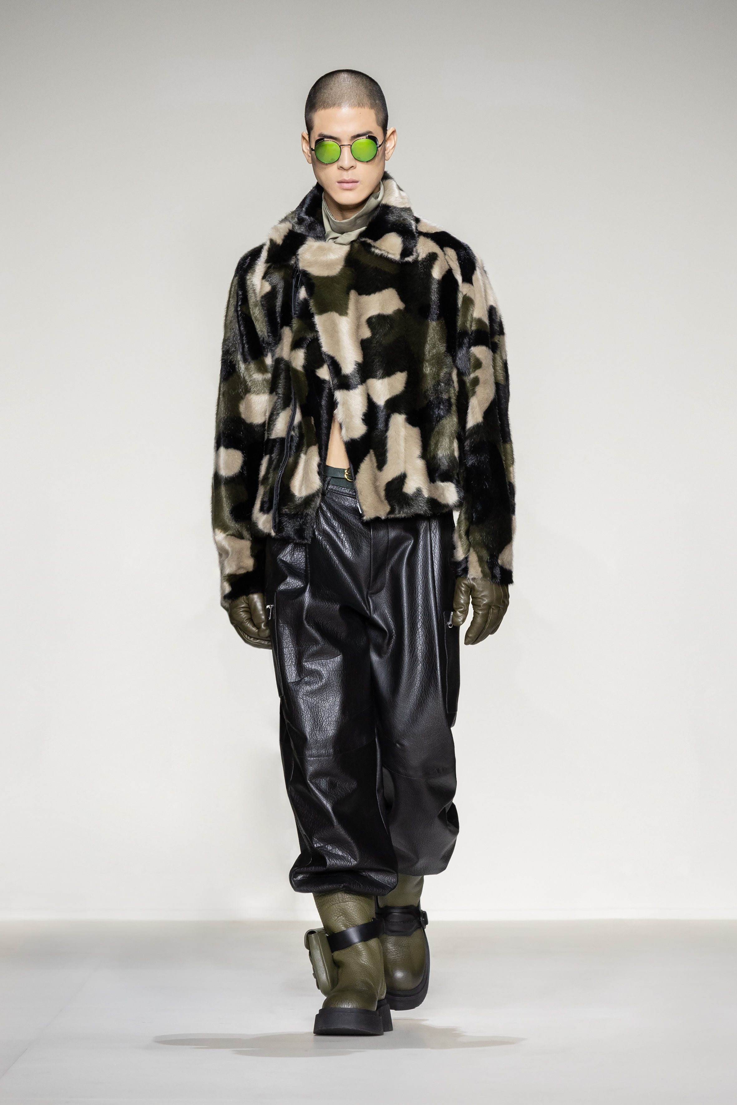 Flight reveals the city from above with the central points marked on a map as the backdrop to the brand logo. This collection is a tribute to the 1930s aviator and his world, to the sophisticated severity and adventurous precision of his style, to the metallic glints of the planes and hangars. The idea of a human in flight reinvents a figure that has always been central to the Armani imagination, dressing him in sport-inspired clothes made from soft, high-impact materials, with enveloping volumes and designs that expand and dilate the classic Prince of Wales and houndstooth checks. Silhouettes are varied: coats, trench coats, double-breasted pea coats and blousons are worn with cropped trousers, complete with boots and lace-ups that boast thick soles to mark every step. The rhythm of the patterns expands into everything else: even oversized t-shirts are made in the same wools as coats and trousers. Leather and knit are essential elements that add grit and comfort: vintage-style bomber jackets, long tricot coats, and cardigans with matching gilets to create new twin sets. This evening is no less sophisticated and the Emporio avaitor explores the pleasure of velvet and the sparkle of crystals, indulging in the languor of silk blouses with long scarf collars with no disdain for the rigour of double-breasted jackets.