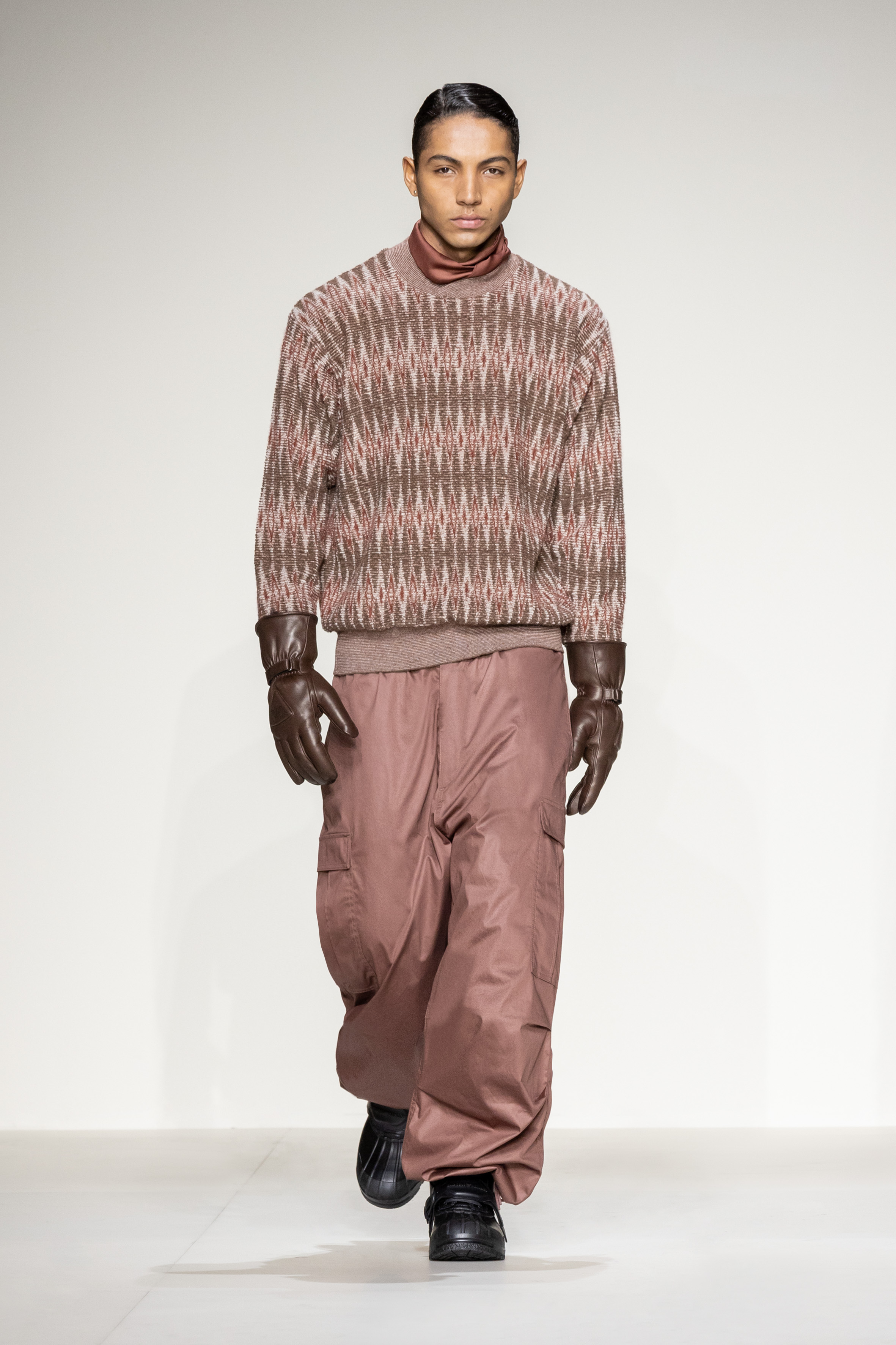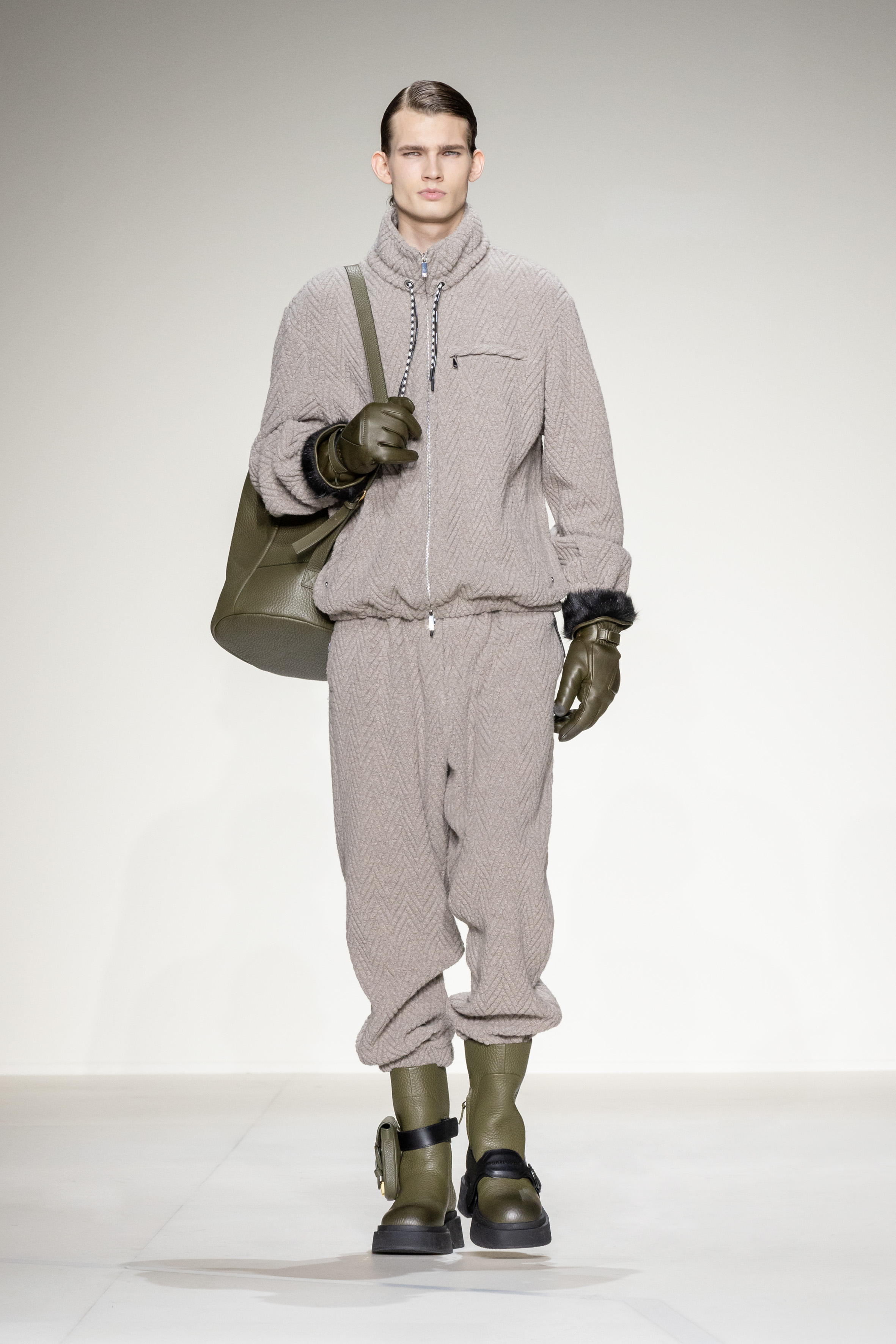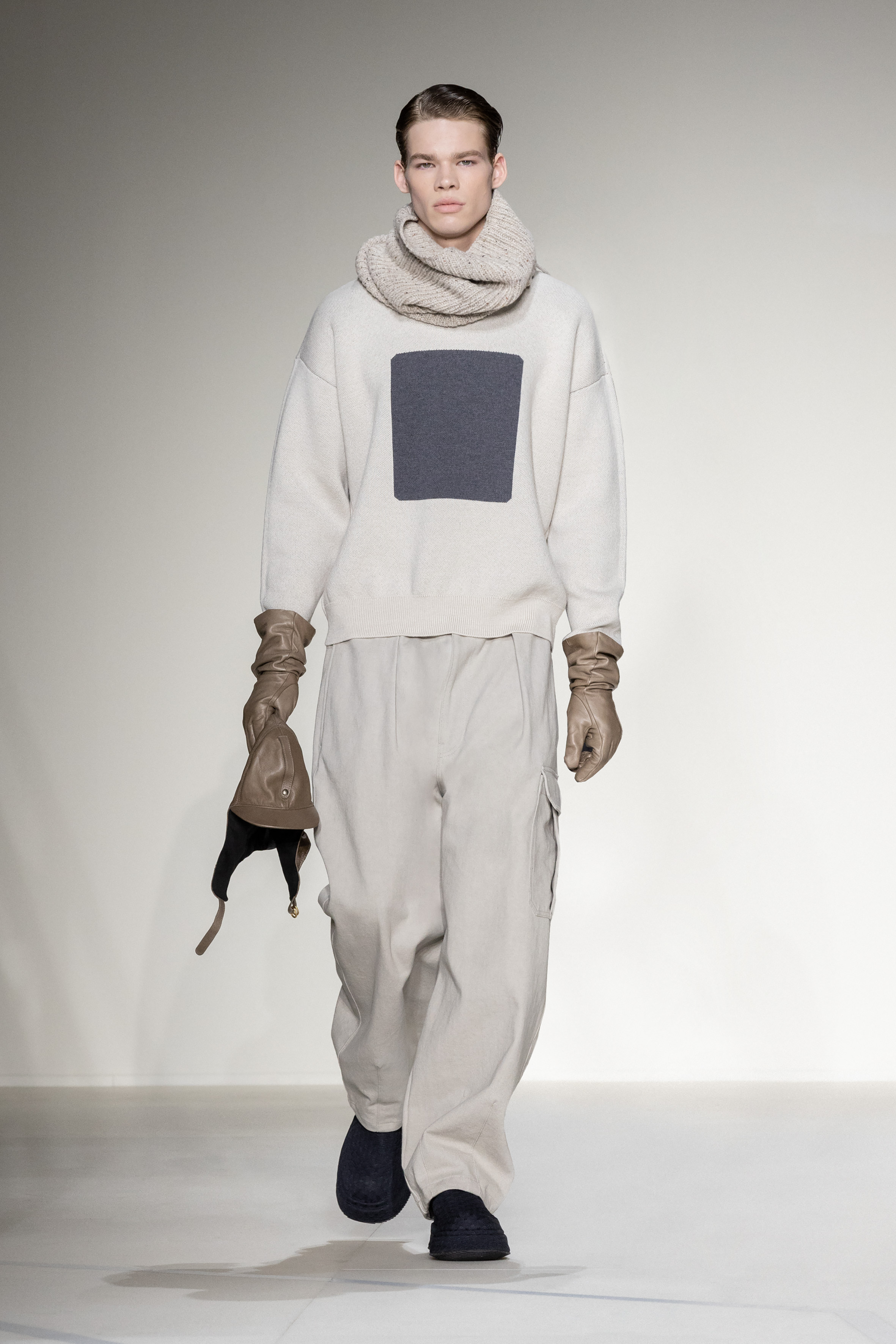 The chromatic panorama moves from greige and beige to caramel and rust tones before lighting up with flashes of colour, from intense red to geranium, with purple notes, before settling down in black. Long goves, beanies, and duffle and drawstrings bag accompany the flight.