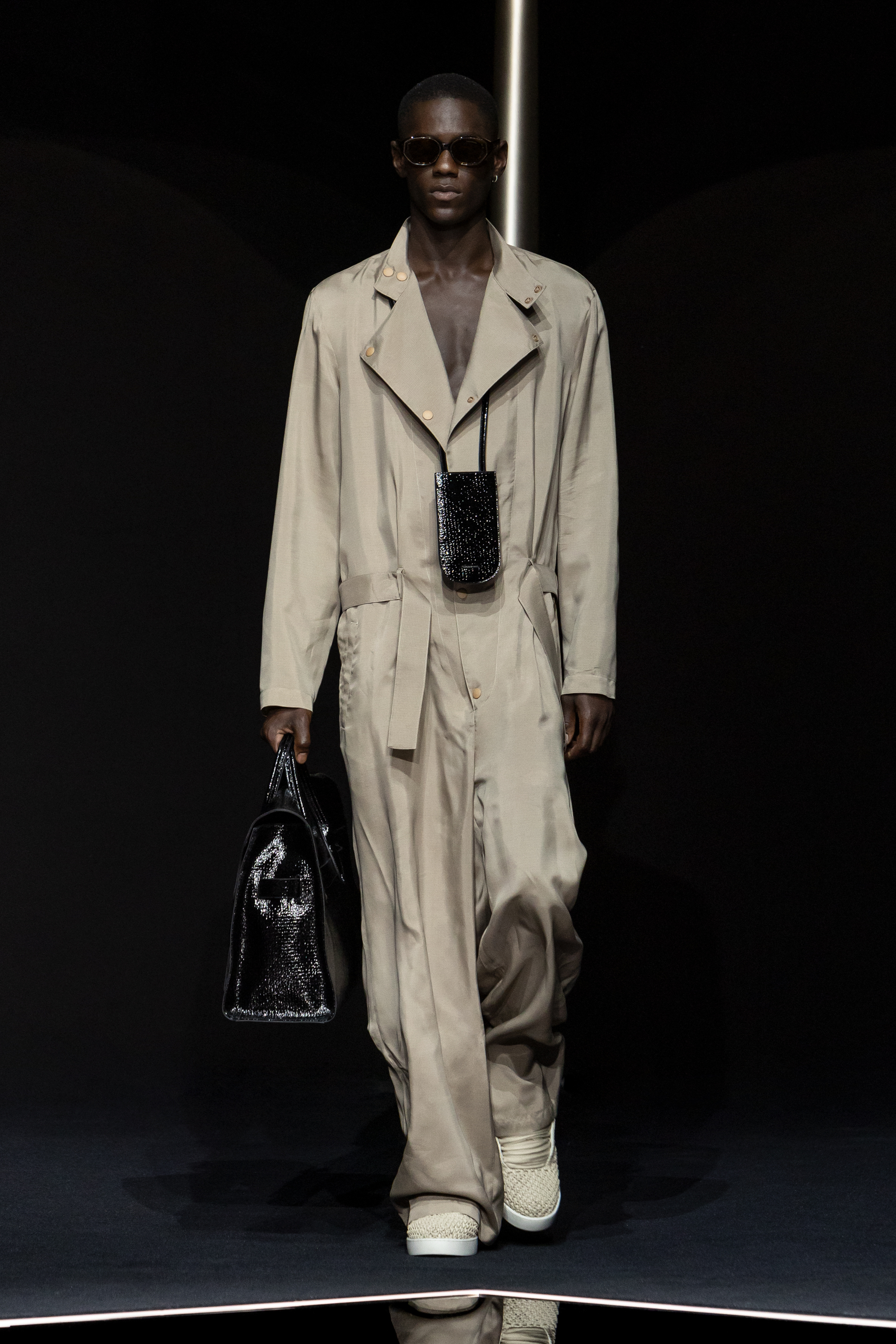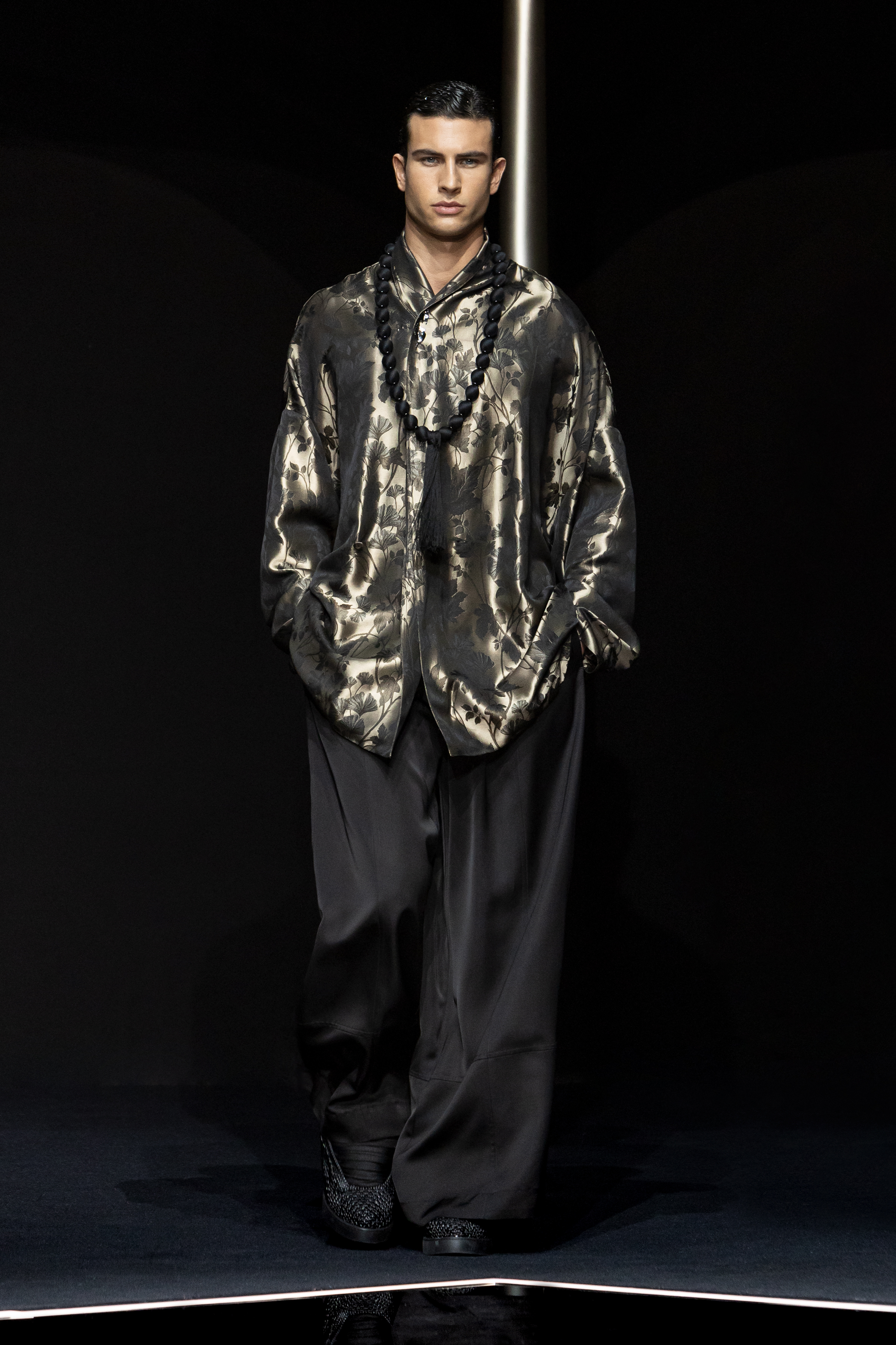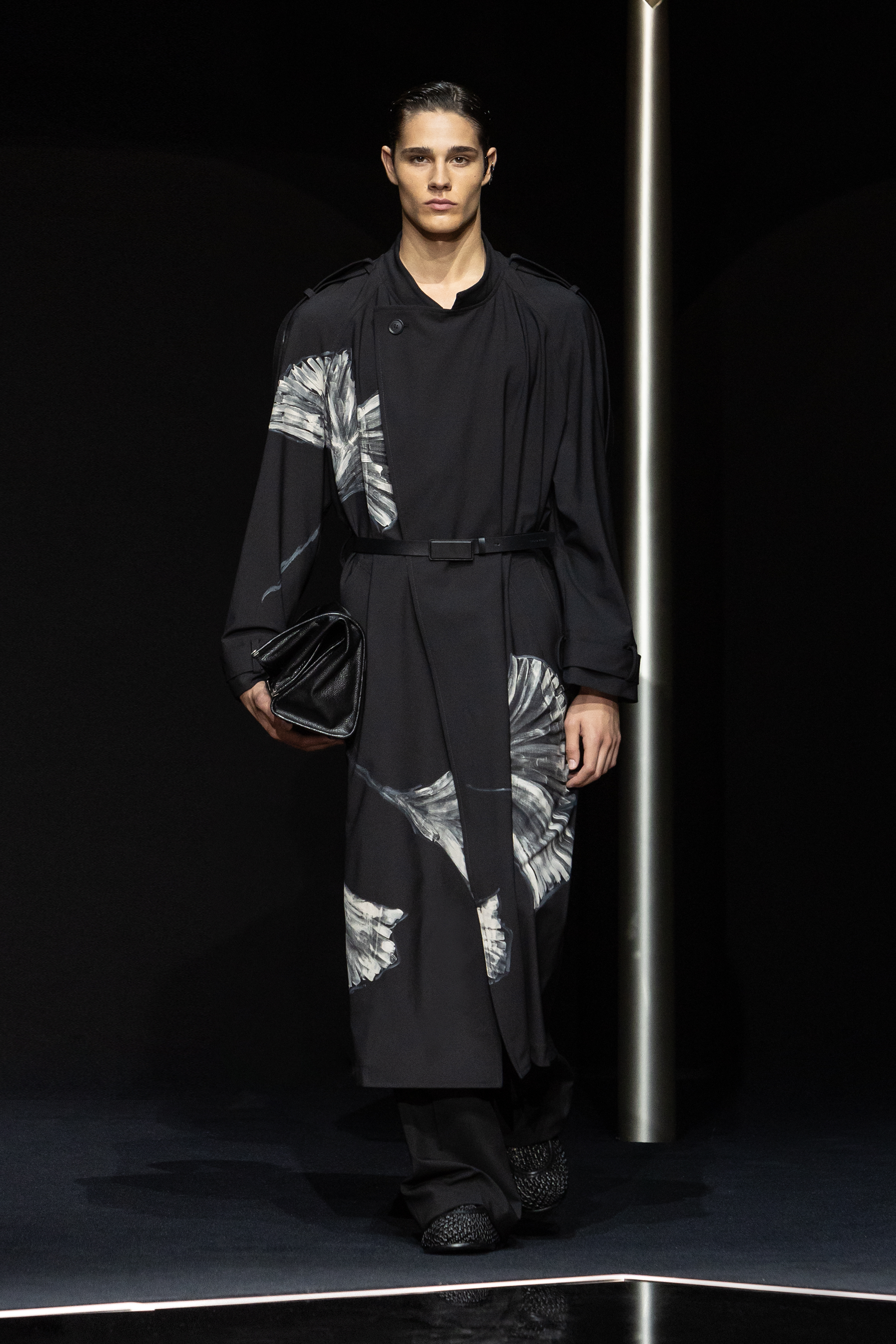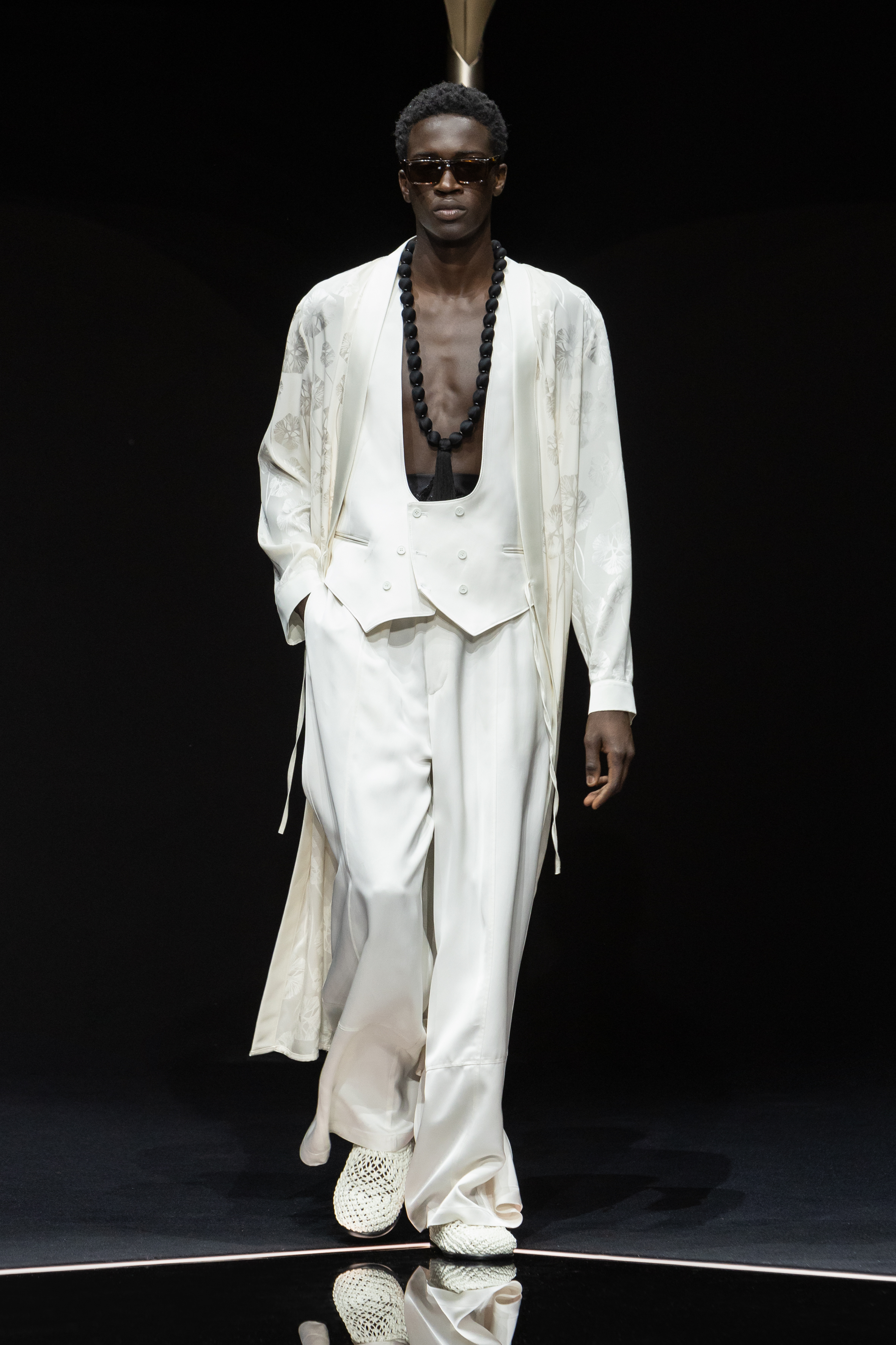 Moonlight glints over a seascape, parched rocks and desert scenes. Darkness spreads, diluted by a light that makes surfaces oily and shimmering. This collection is a return to the essence of Emporio Armani, purified to the core and seen through the filter of moonlight. A dry yet vibrant romanticism moves between the extreme east and a hypothetical North Africa. And yet these are the only traces, imperceptible echoes inspired by fluid forms, of pure and elemental energy. Exoticism fades, transfigured by the night effect of garments designed to flow at all hours, because the evening is a way of life, and it is possible to shine in daytime too. The palette is contracted and compact: white, sand, black, mixed together or deployed in monochrome. The space between body and dress is alive and pulsating, made of liquid lines that barely touch the muscles: robe jackets, long duster coats, very wide trousers and sleeveless tunics, as well as embroideres sweaters, shorts and blazers. Shoes with solid soles and bags with shiny surfaces complete the silhouette. In this taut, sensual play of reduction, the only recurring motif - in print, jacquard, and jewellery - is a stylised Ginkgo. With a history of 250 million years and the ability to adapt to both eras and environments, here the Ginkgo is a symbol of elegance and endurance, a metaphor for a style at once timely and timeless.