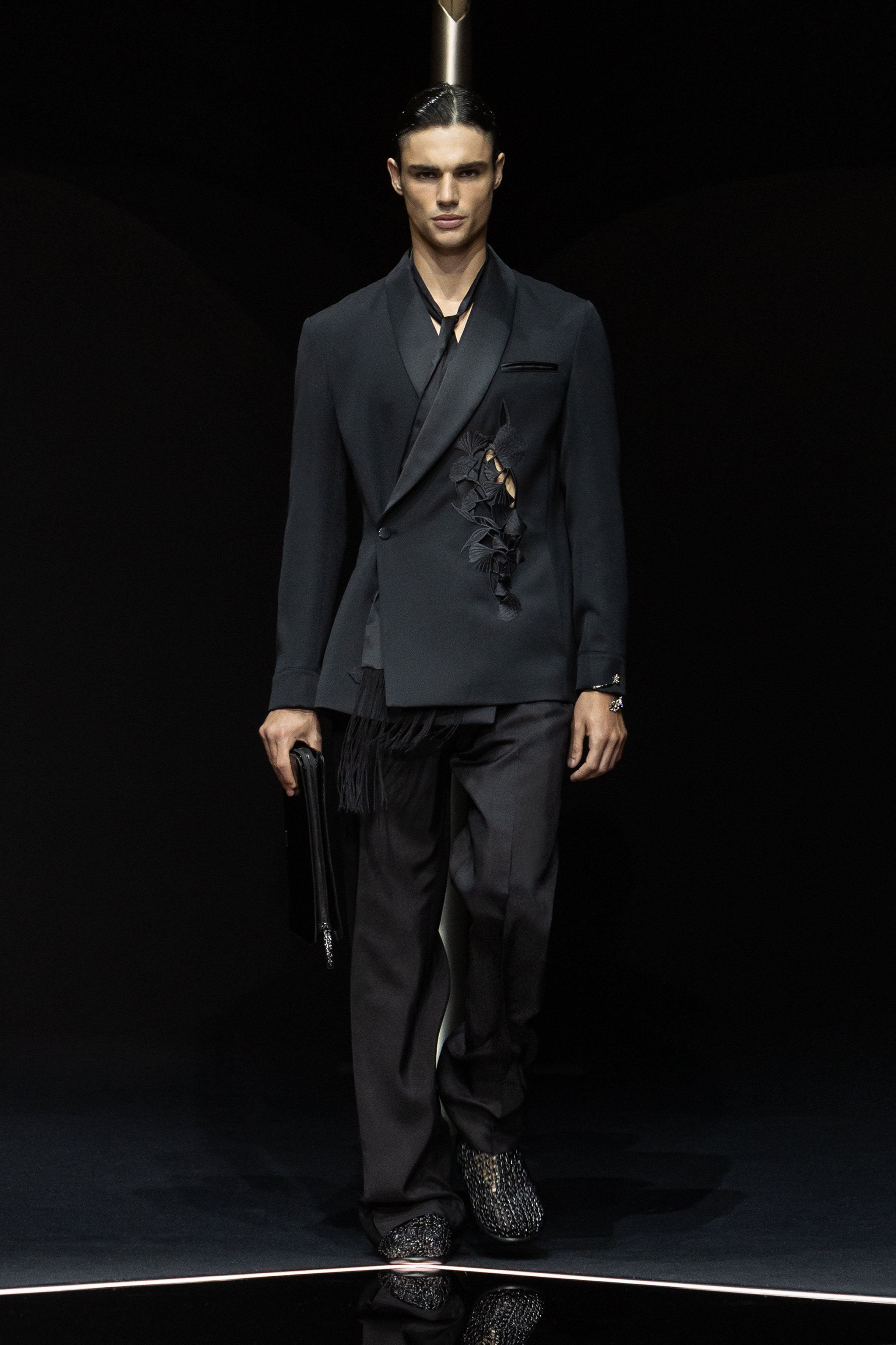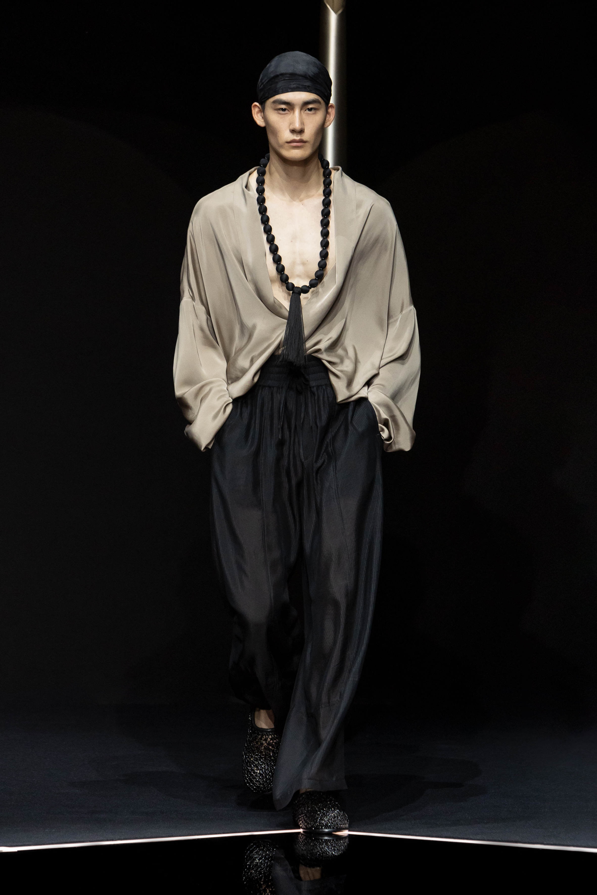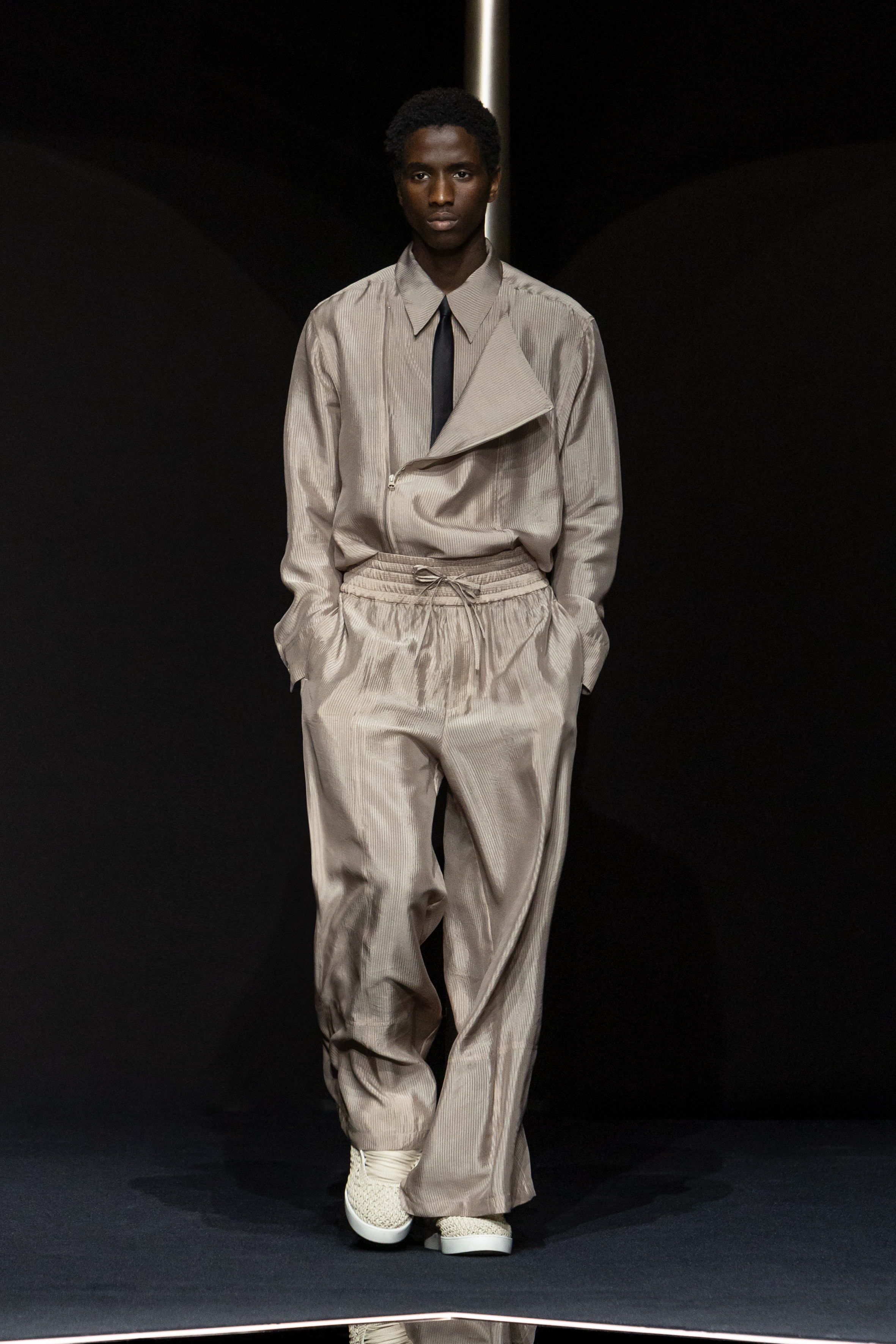 Moonlight glints over a seascape, parched rocks and desert scenes. Darkness spreads, diluted by a light that makes surfaces oily and shimmering. This collection is a return to the essence of Emporio Armani, purified to the core and seen through the filter of moonlight. A dry yet vibrant romanticism moves between the extreme east and a hypothetical North Africa. And yet these are the only traces, imperceptible echoes inspired by fluid forms, of pure and elemental energy. Exoticism fades, transfigured by the night effect of garments designed to flow at all hours, because the evening is a way of life, and it is possible to shine in daytime too. The palette is contracted and compact: white, sand, black, mixed together or deployed in monochrome. The space between body and dress is alive and pulsating, made of liquid lines that barely touch the muscles: robe jackets, long duster coats, very wide trousers and sleeveless tunics, as well as embroideres sweaters, shorts and blazers. Shoes with solid soles and bags with shiny surfaces complete the silhouette. In this taut, sensual play of reduction, the only recurring motif - in print, jacquard, and jewellery - is a stylised Ginkgo. With a history of 250 million years and the ability to adapt to both eras and environments, here the Ginkgo is a symbol of elegance and endurance, a metaphor for a style at once timely and timeless.