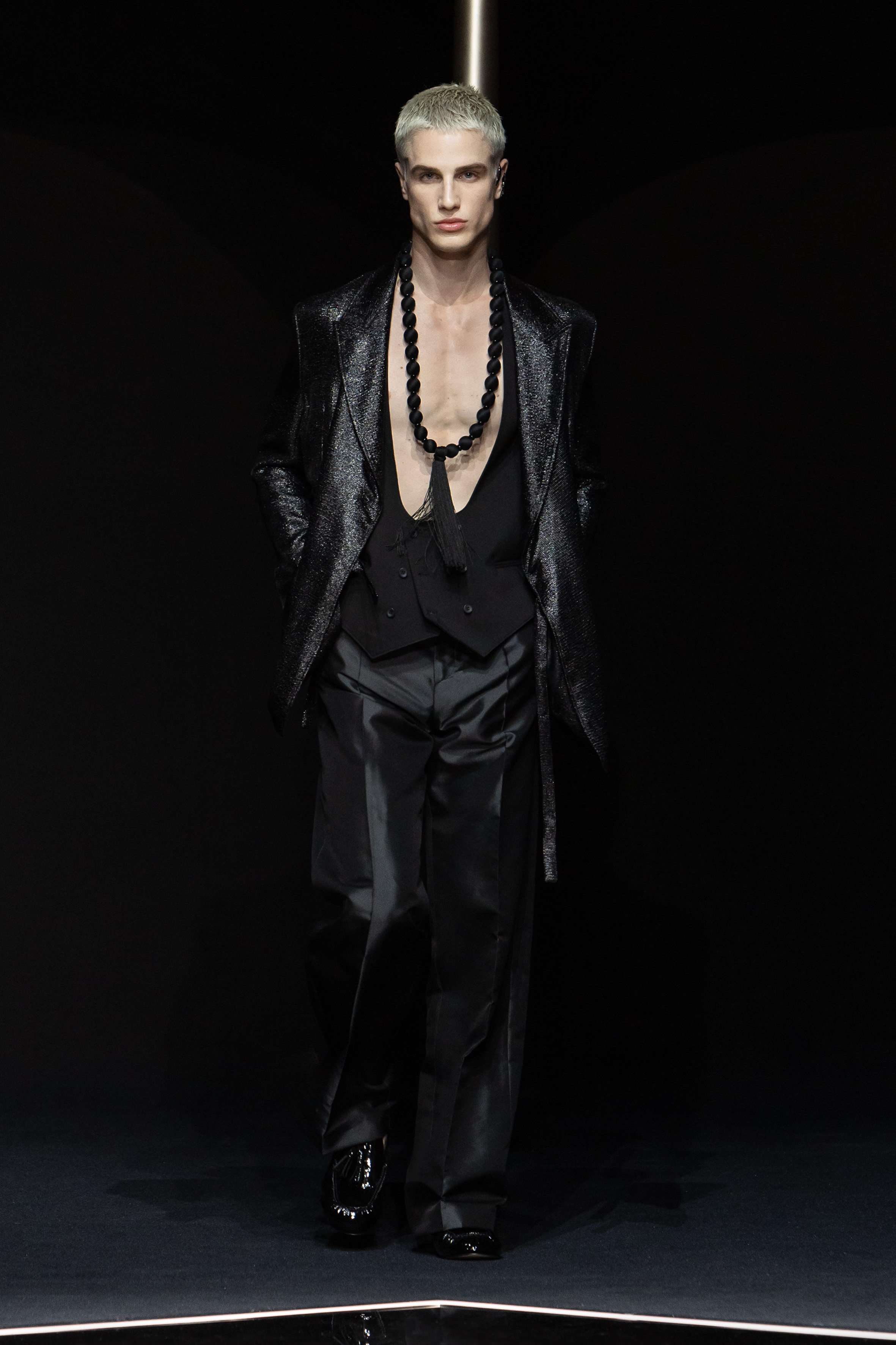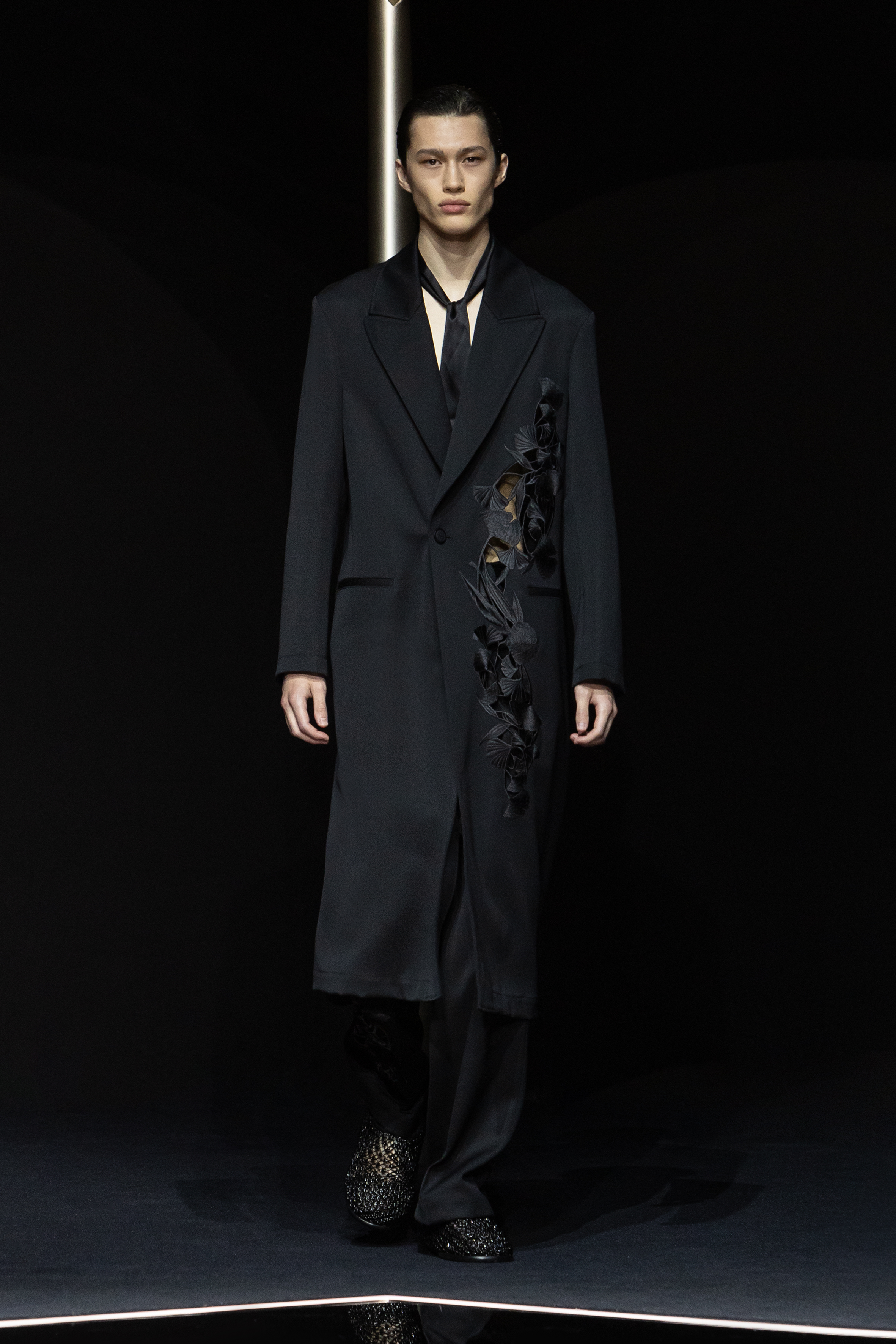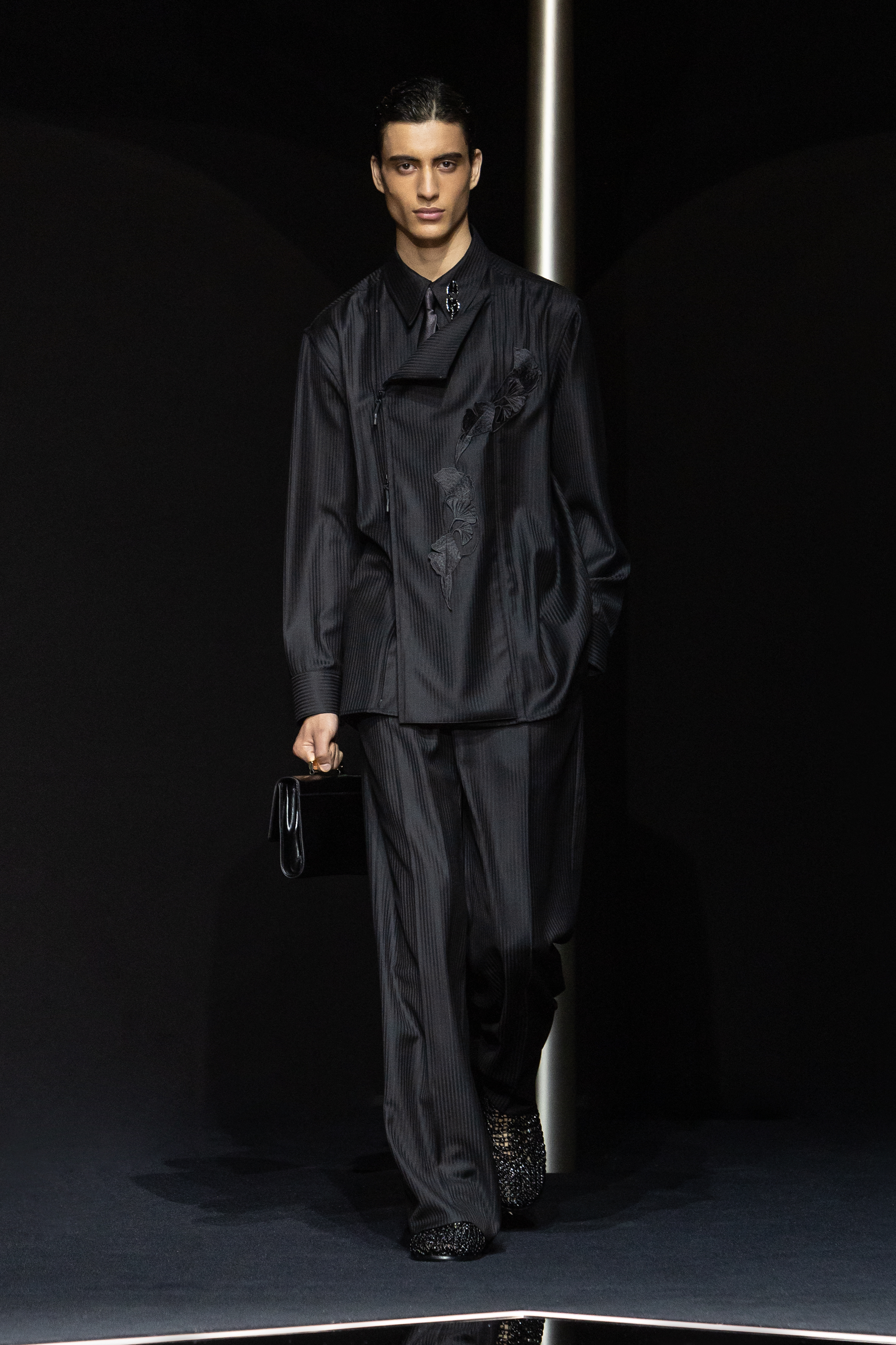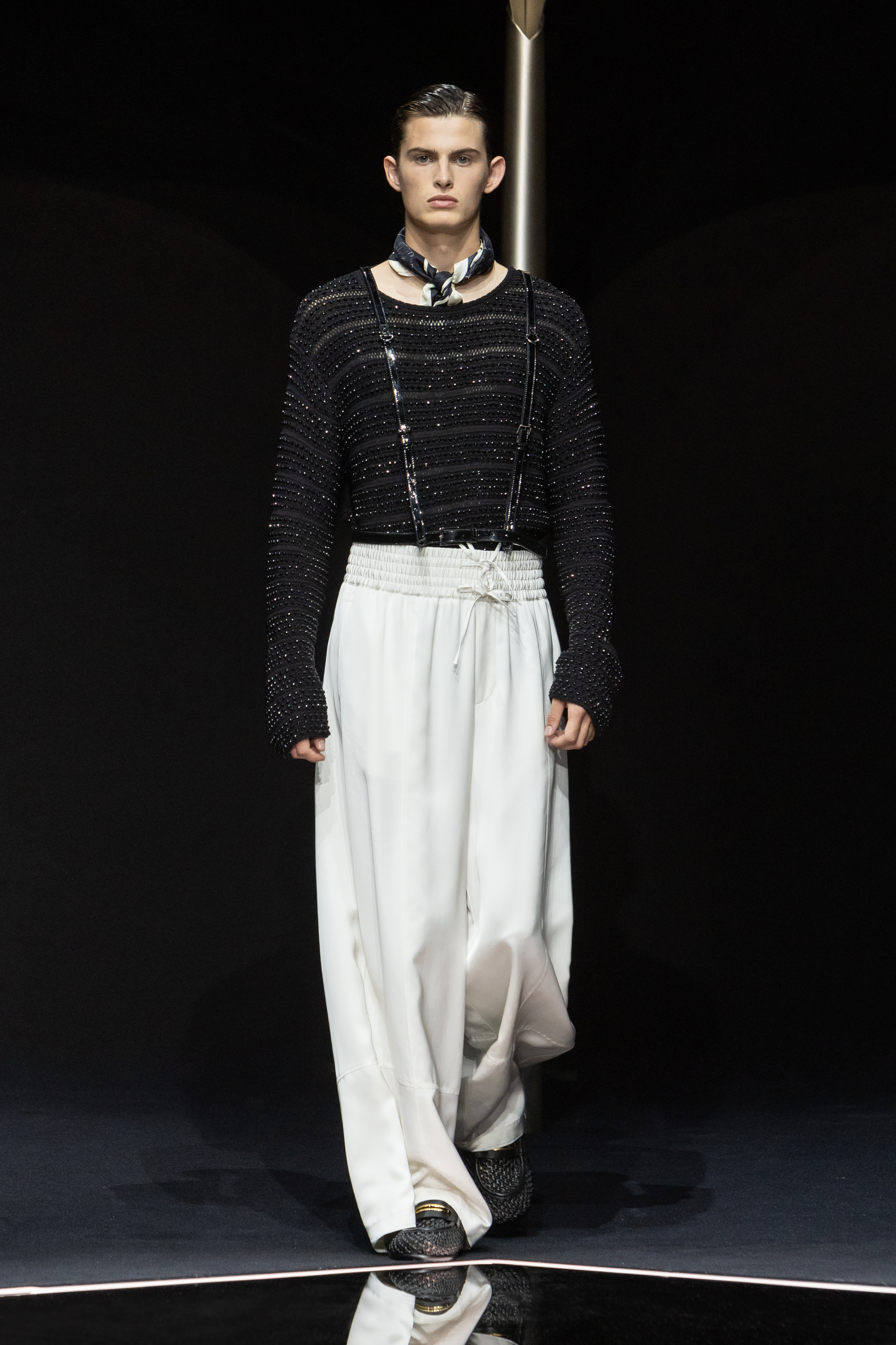 Moonlight glints over a seascape, parched rocks and desert scenes. Darkness spreads, diluted by a light that makes surfaces oily and shimmering. This collection is a return to the essence of Emporio Armani, purified to the core and seen through the filter of moonlight. A dry yet vibrant romanticism moves between the extreme east and a hypothetical North Africa. And yet these are the only traces, imperceptible echoes inspired by fluid forms, of pure and elemental energy. Exoticism fades, transfigured by the night effect of garments designed to flow at all hours, because the evening is a way of life, and it is possible to shine in daytime too. The palette is contracted and compact: white, sand, black, mixed together or deployed in monochrome. The space between body and dress is alive and pulsating, made of liquid lines that barely touch the muscles: robe jackets, long duster coats, very wide trousers and sleeveless tunics, as well as embroideres sweaters, shorts and blazers. Shoes with solid soles and bags with shiny surfaces complete the silhouette. In this taut, sensual play of reduction, the only recurring motif - in print, jacquard, and jewellery - is a stylised Ginkgo. With a history of 250 million years and the ability to adapt to both eras and environments, here the Ginkgo is a symbol of elegance and endurance, a metaphor for a style at once timely and timeless.