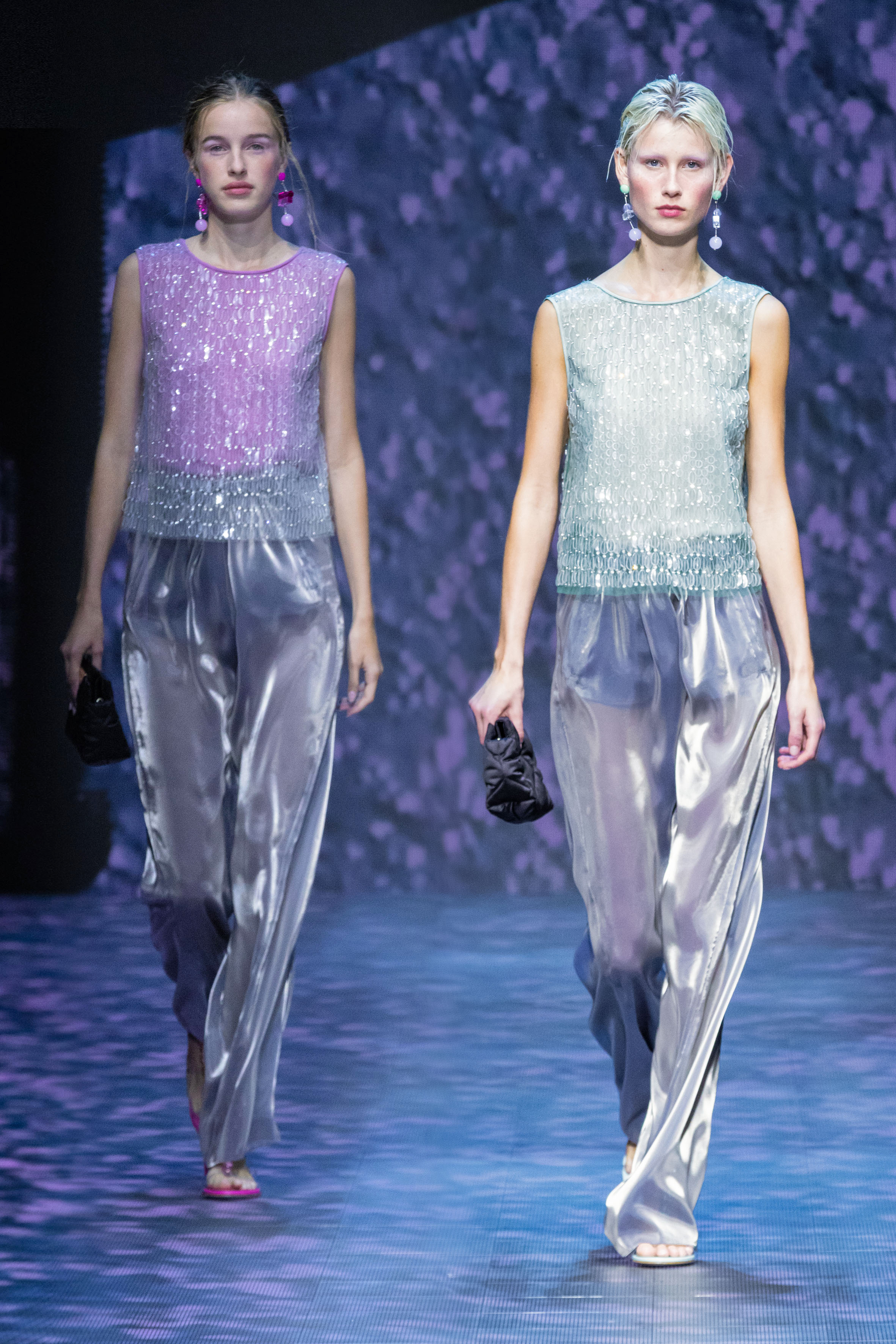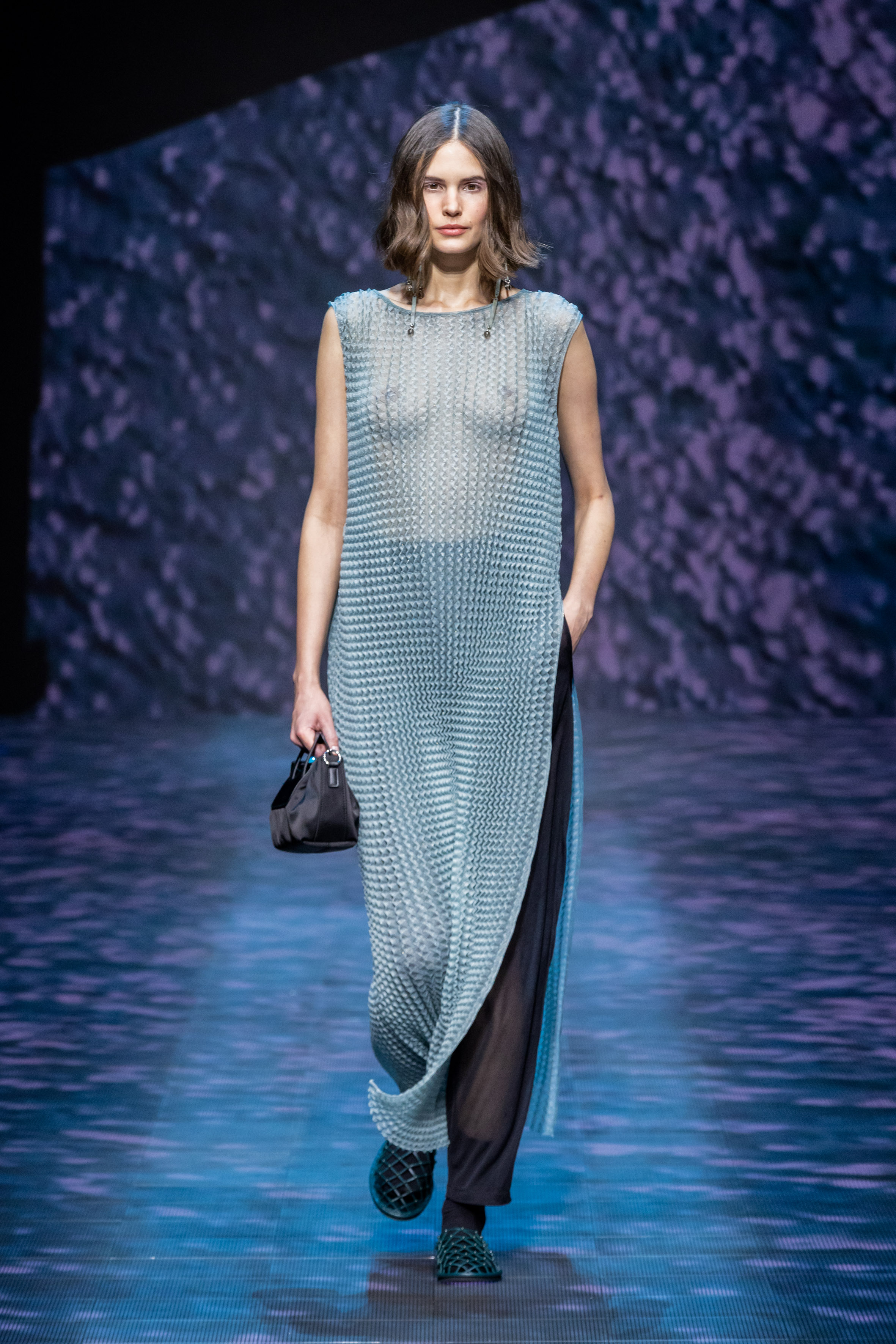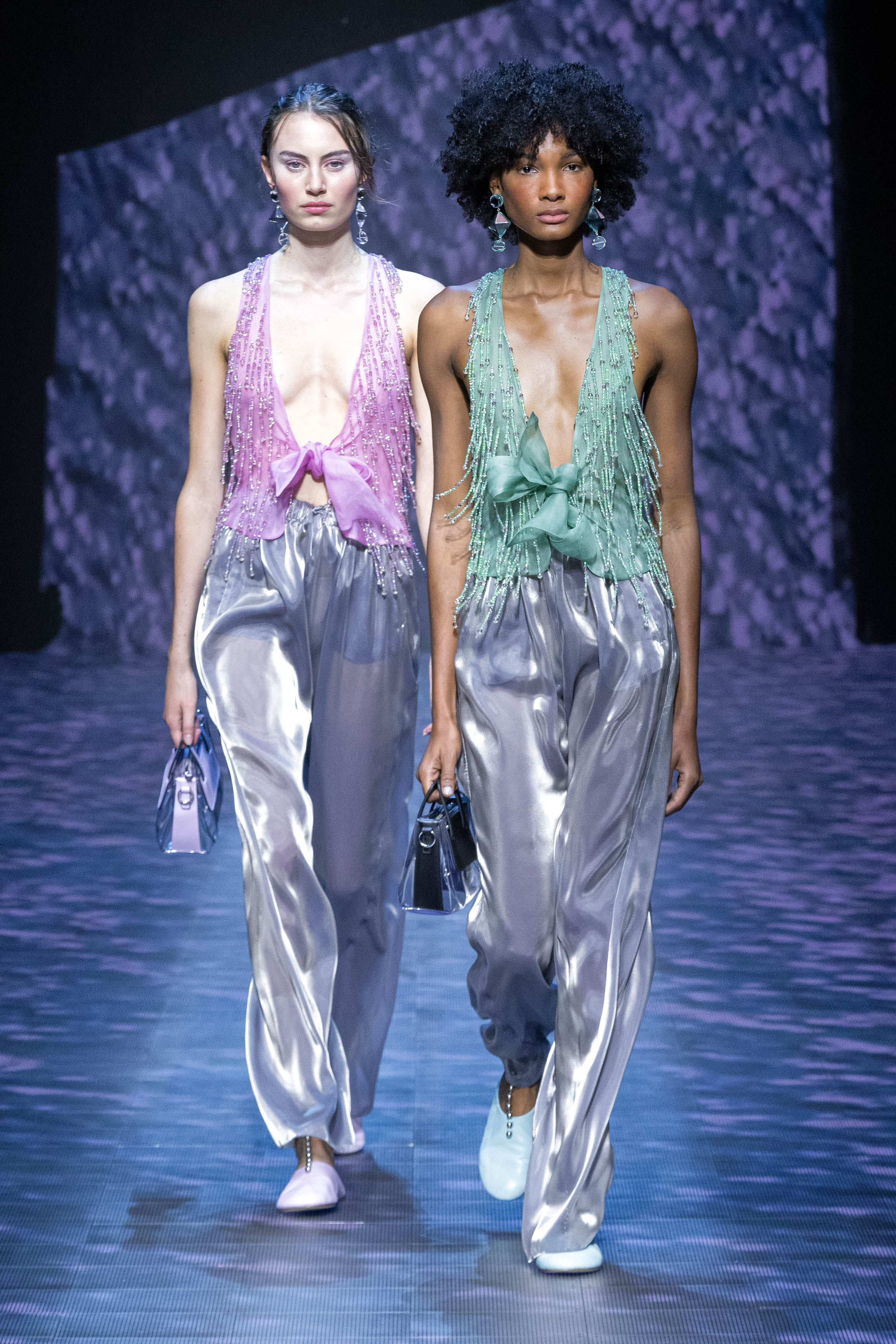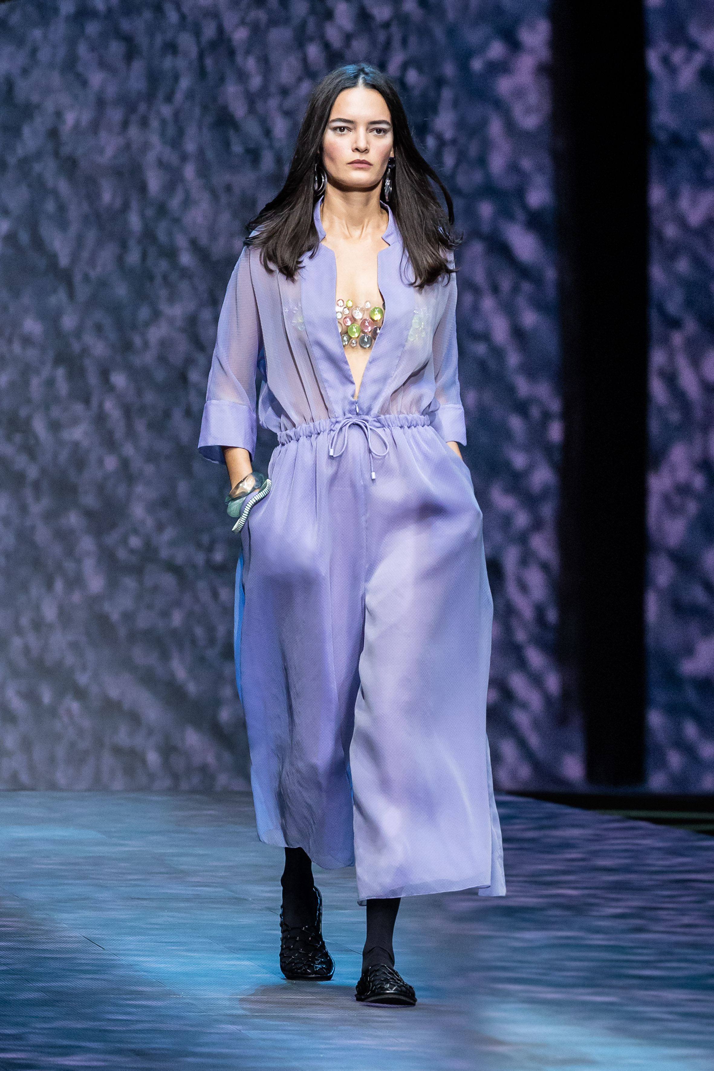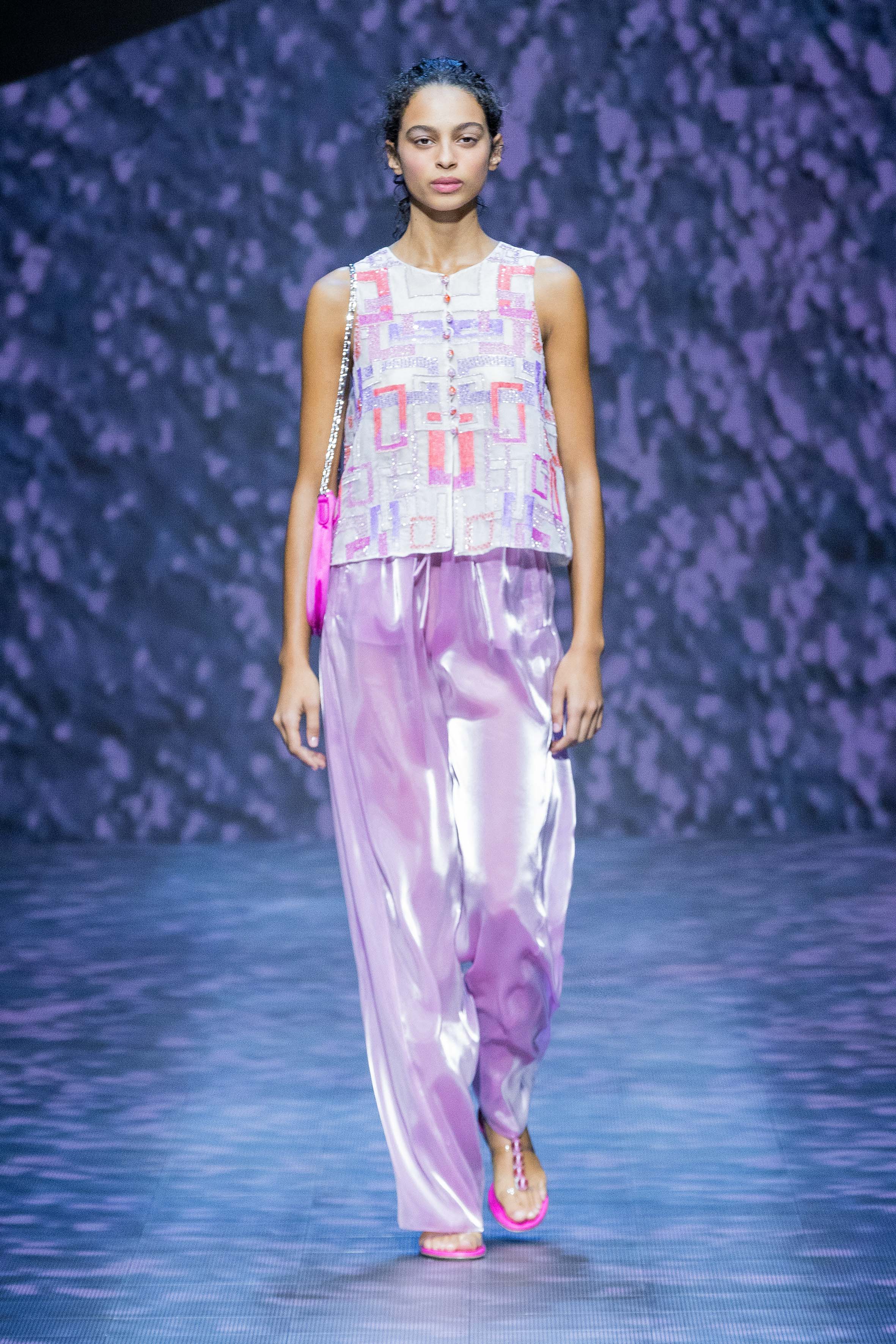 There is movement in the colour palette too, with urban neutrals and black and white shifting into pastel tones of mauve and green and then igniting with sparkling nocturnal shimmers over long dresses and weightless jumpsuits. A recurring detail, the black of small accessories, recalls the faint underlining of a story written freehand.