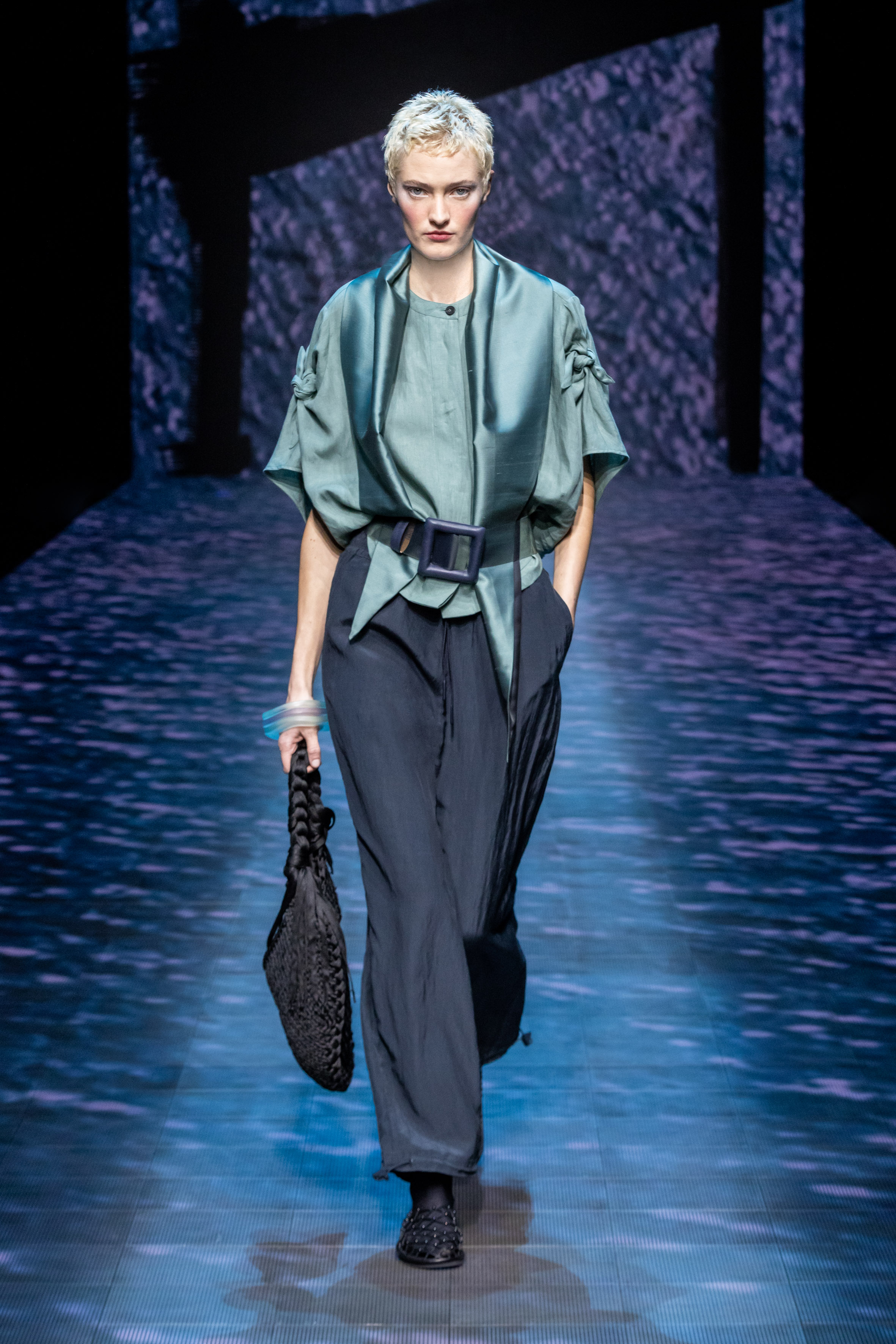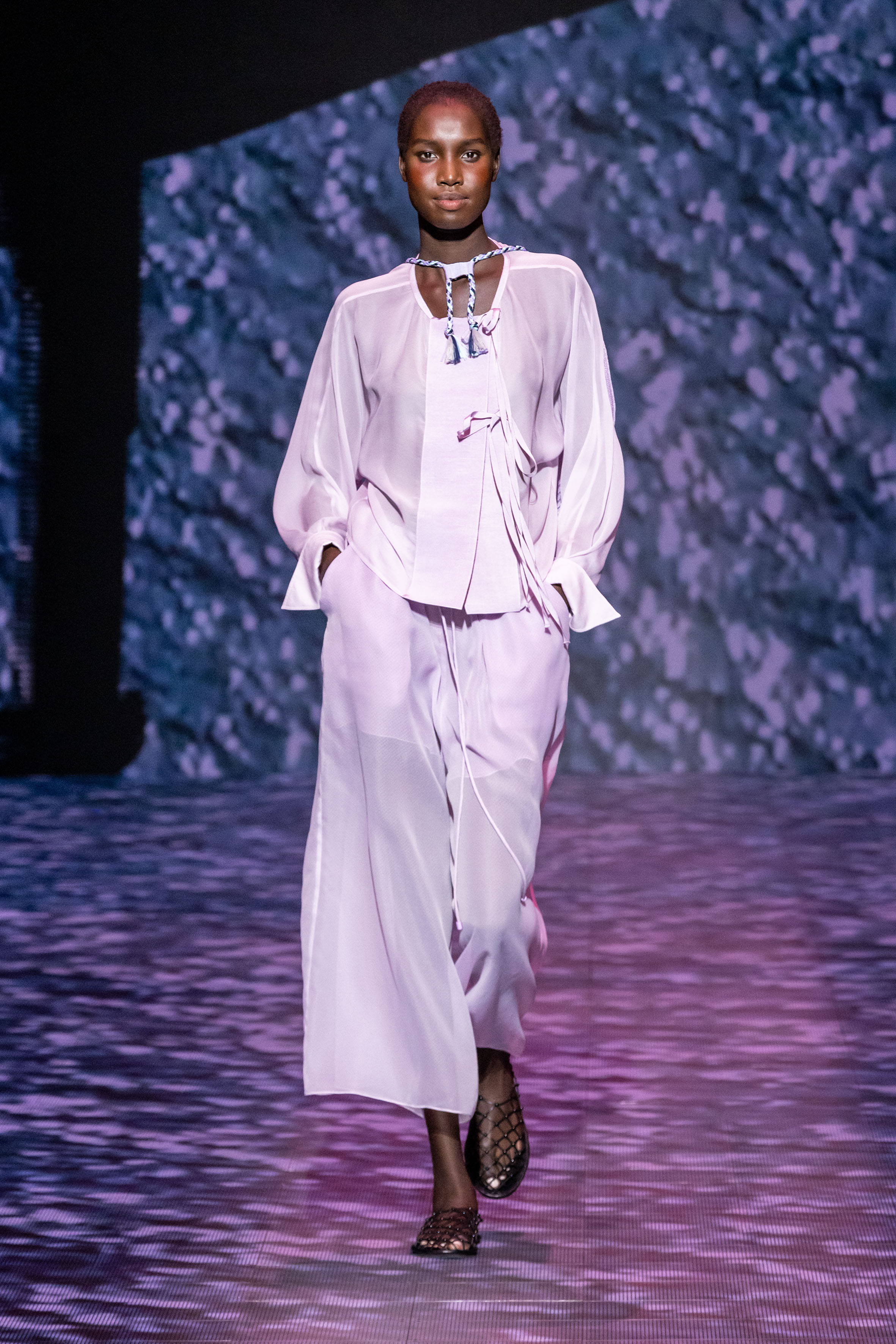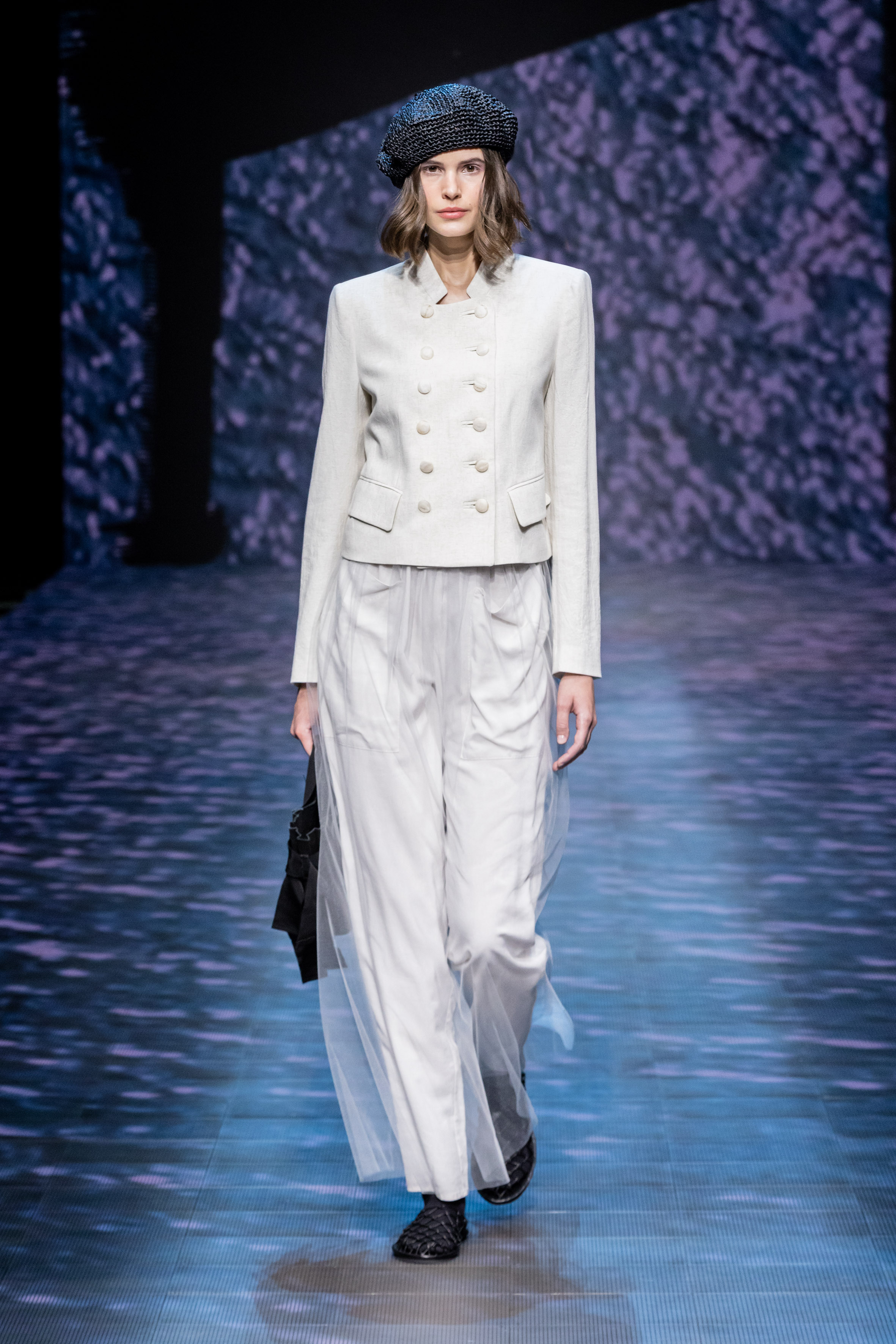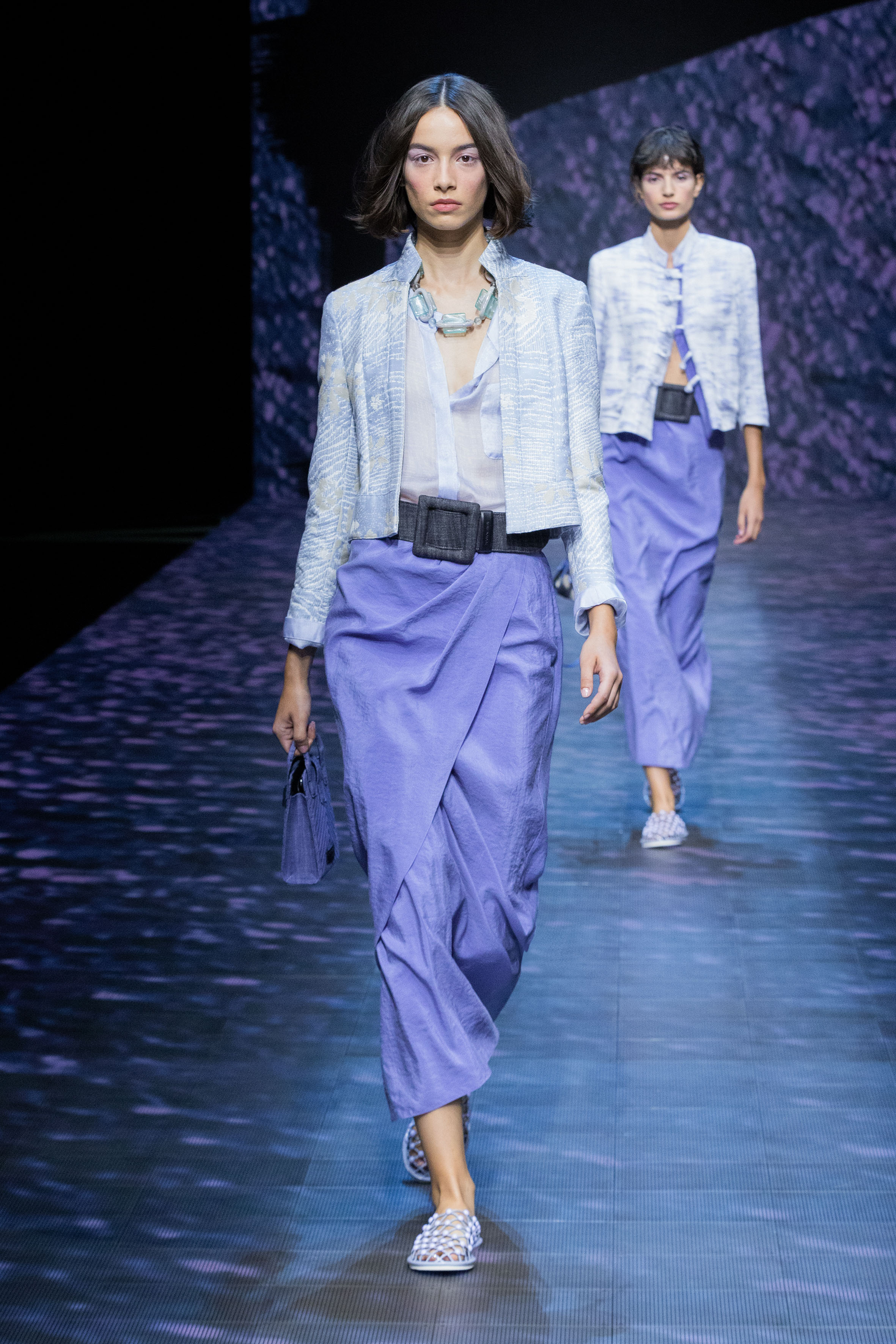 There is movement in the colour palette too, with urban neutrals and black and white shifting into pastel tones of mauve and green and then igniting with sparkling nocturnal shimmers over long dresses and weightless jumpsuits. A recurring detail, the black of small accessories, recalls the faint underlining of a story written freehand.