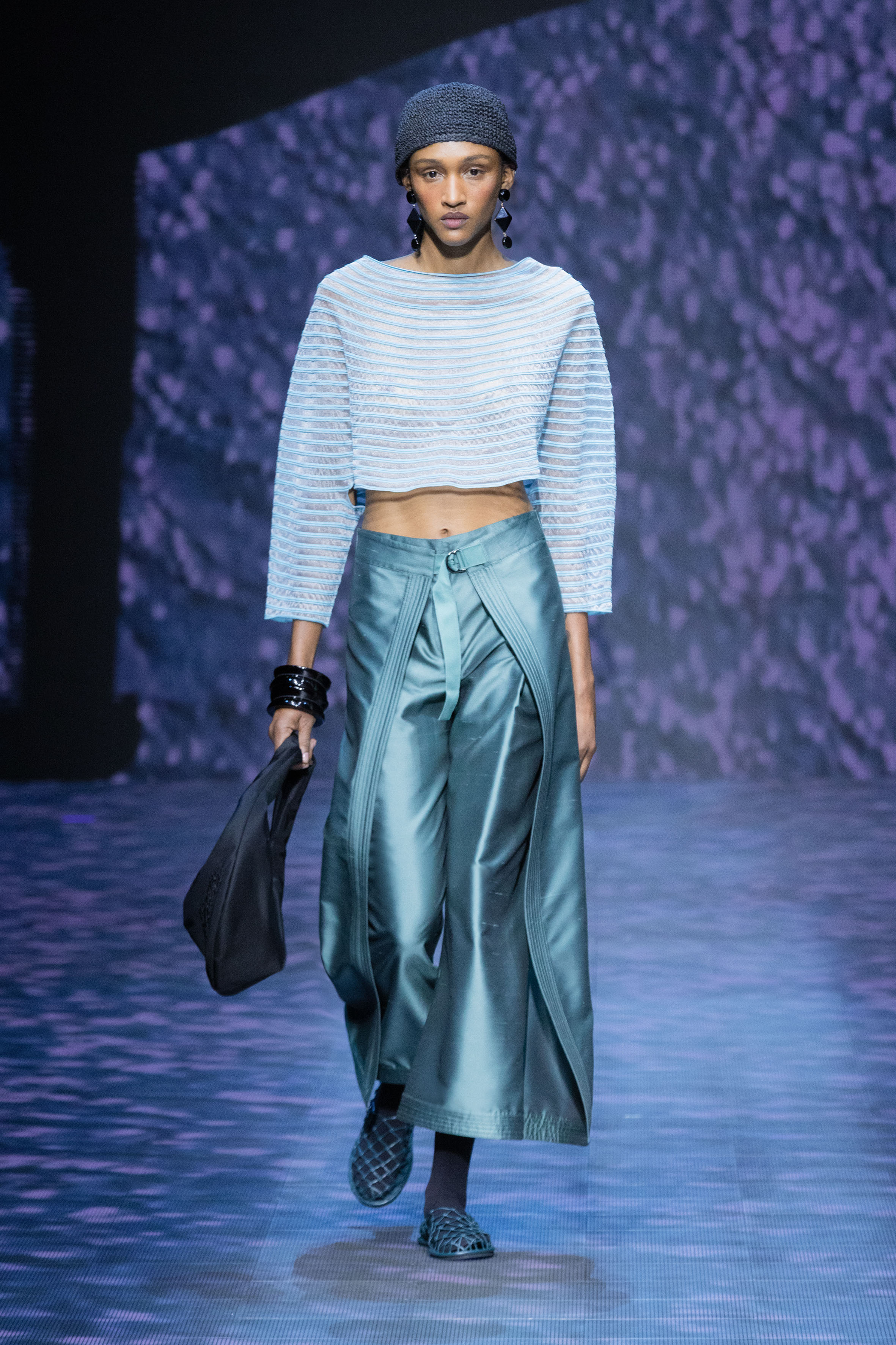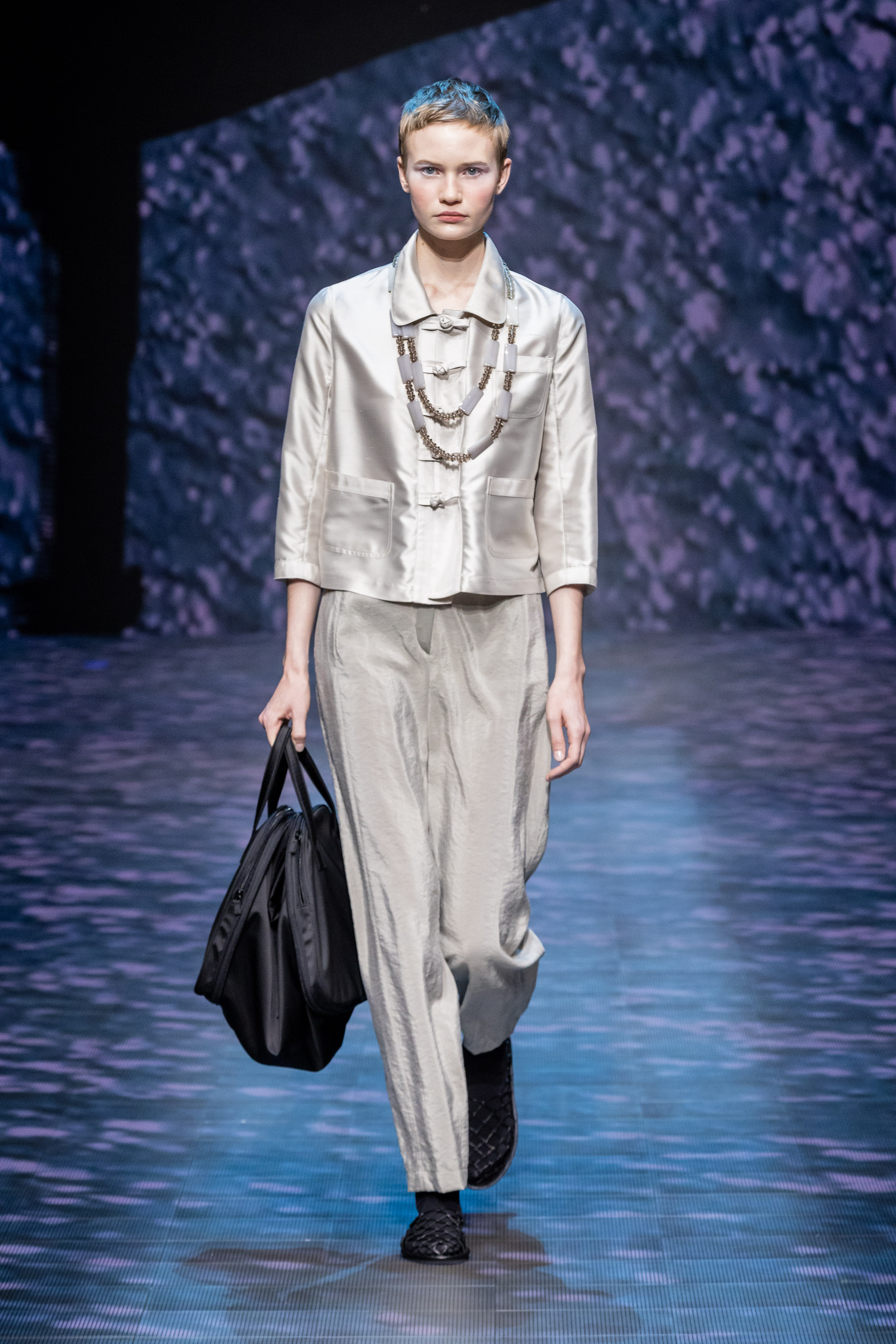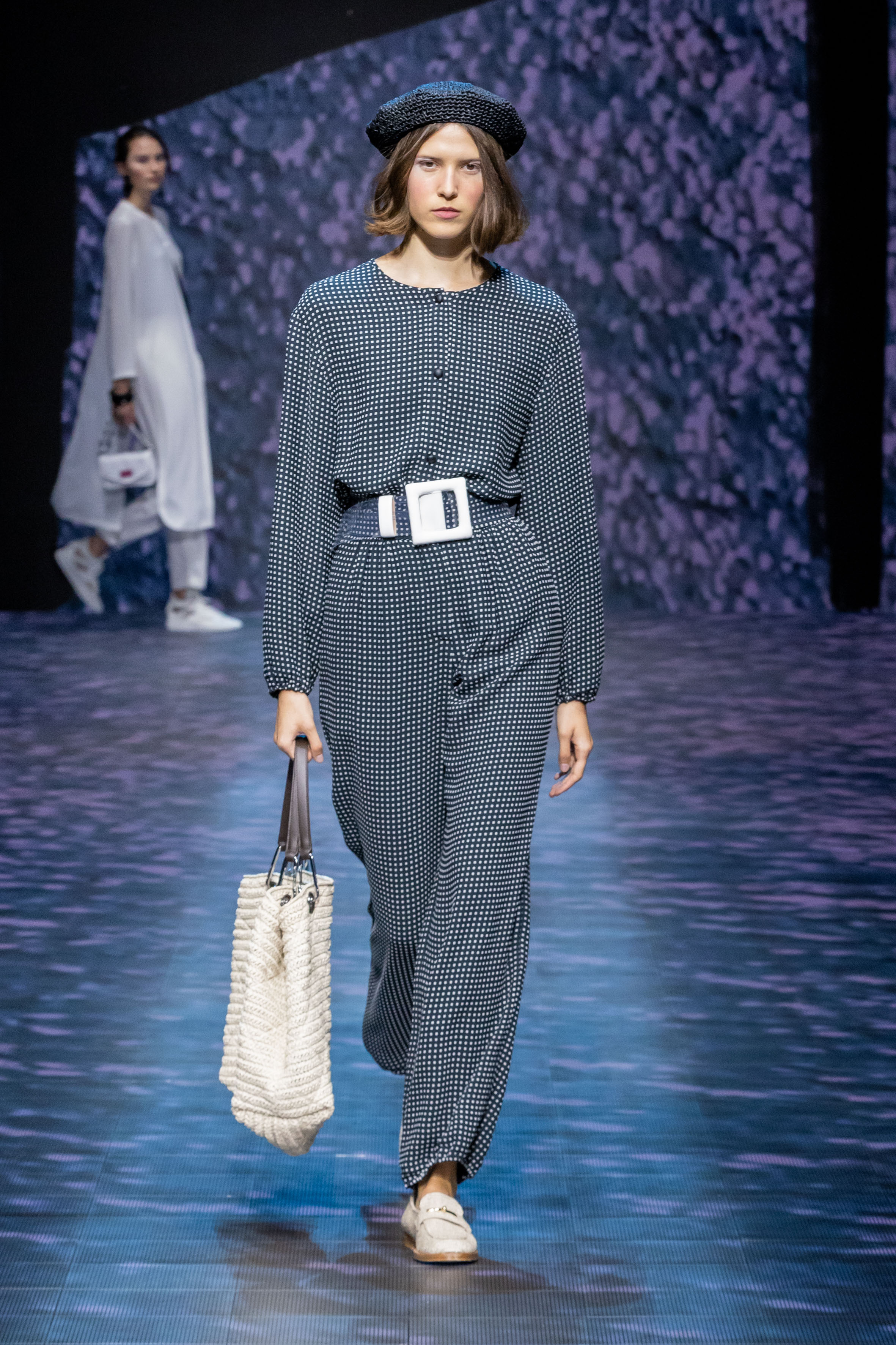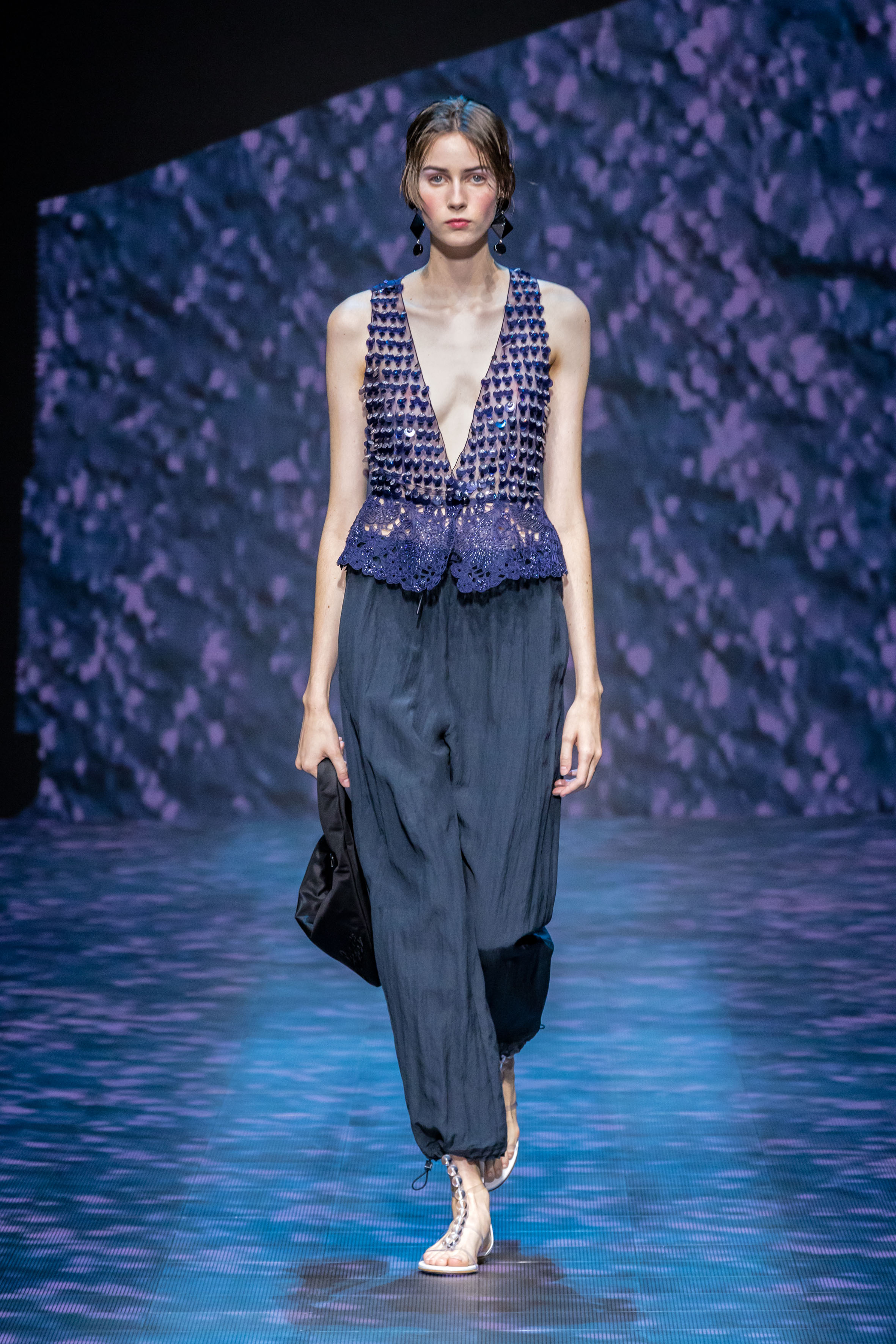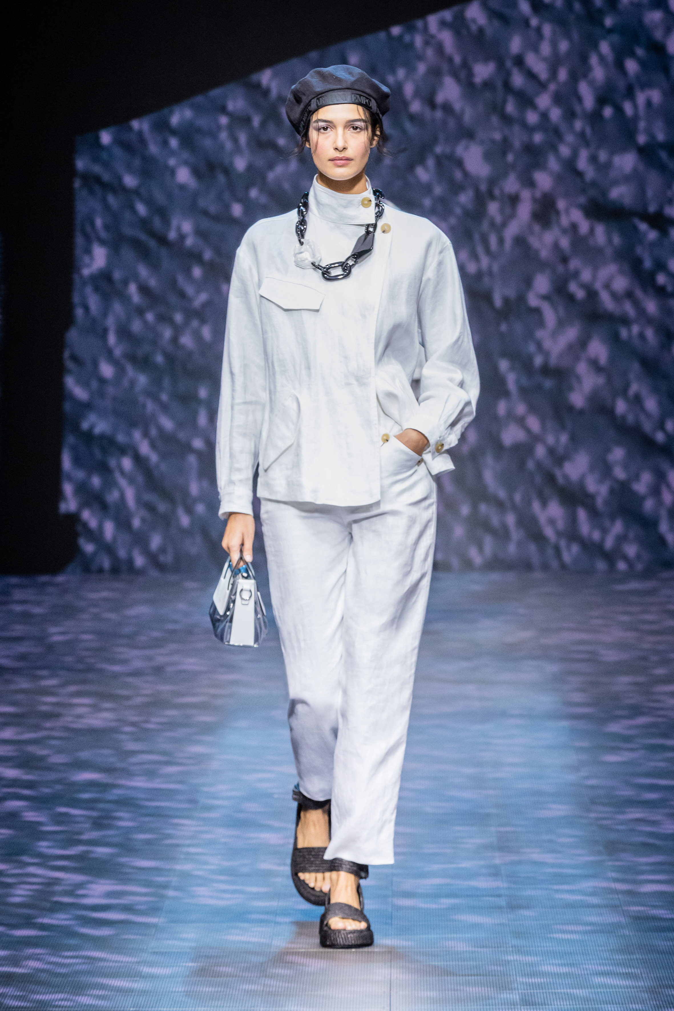 There is movement in the colour palette too, with urban neutrals and black and white shifting into pastel tones of mauve and green and then igniting with sparkling nocturnal shimmers over long dresses and weightless jumpsuits. A recurring detail, the black of small accessories, recalls the faint underlining of a story written freehand.