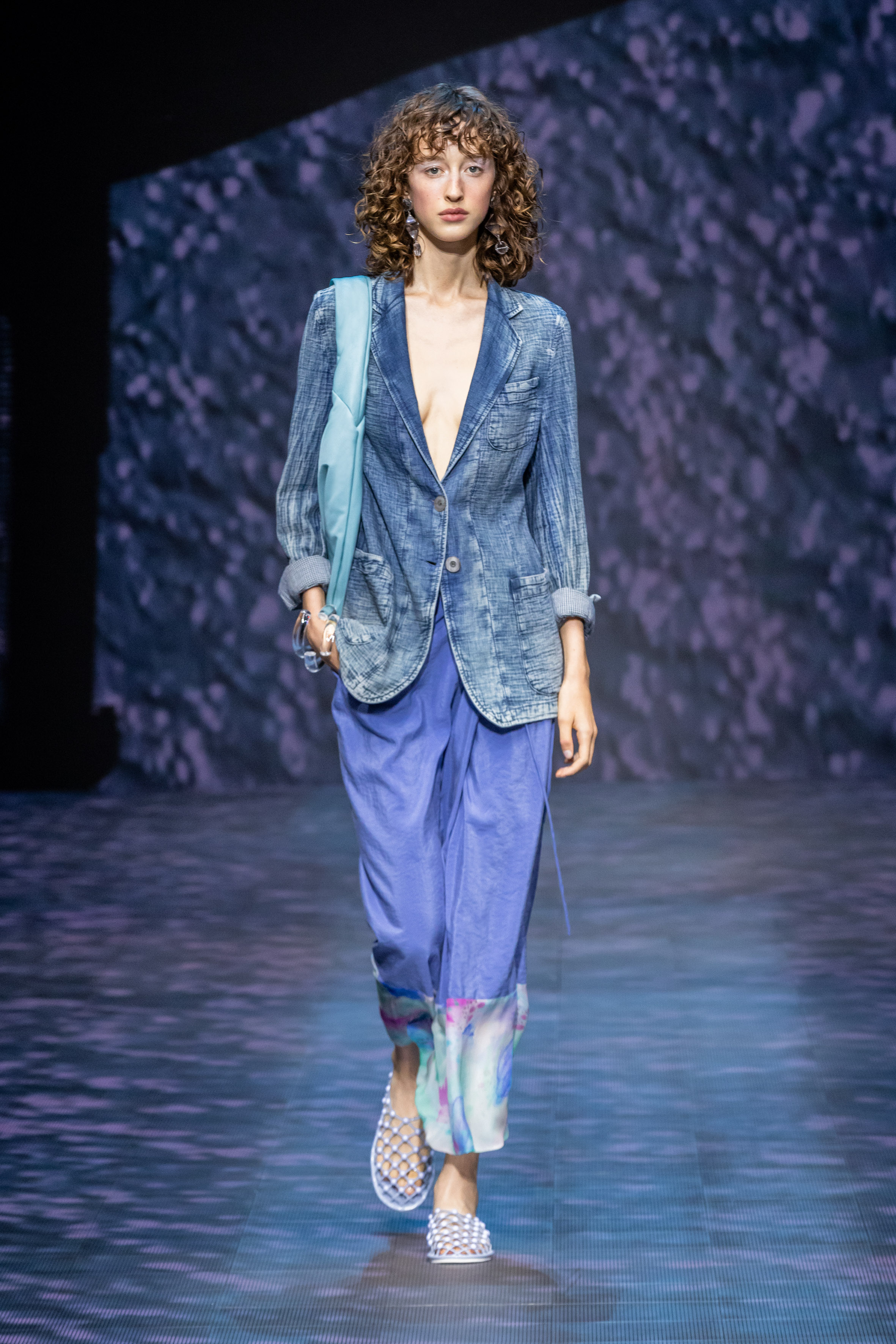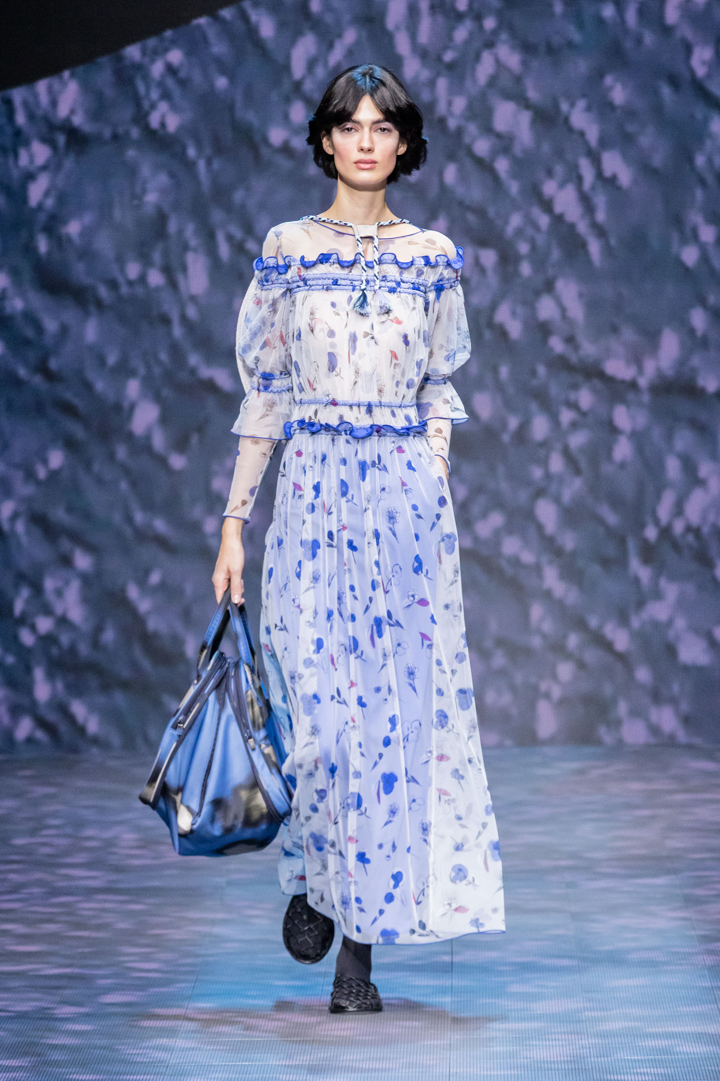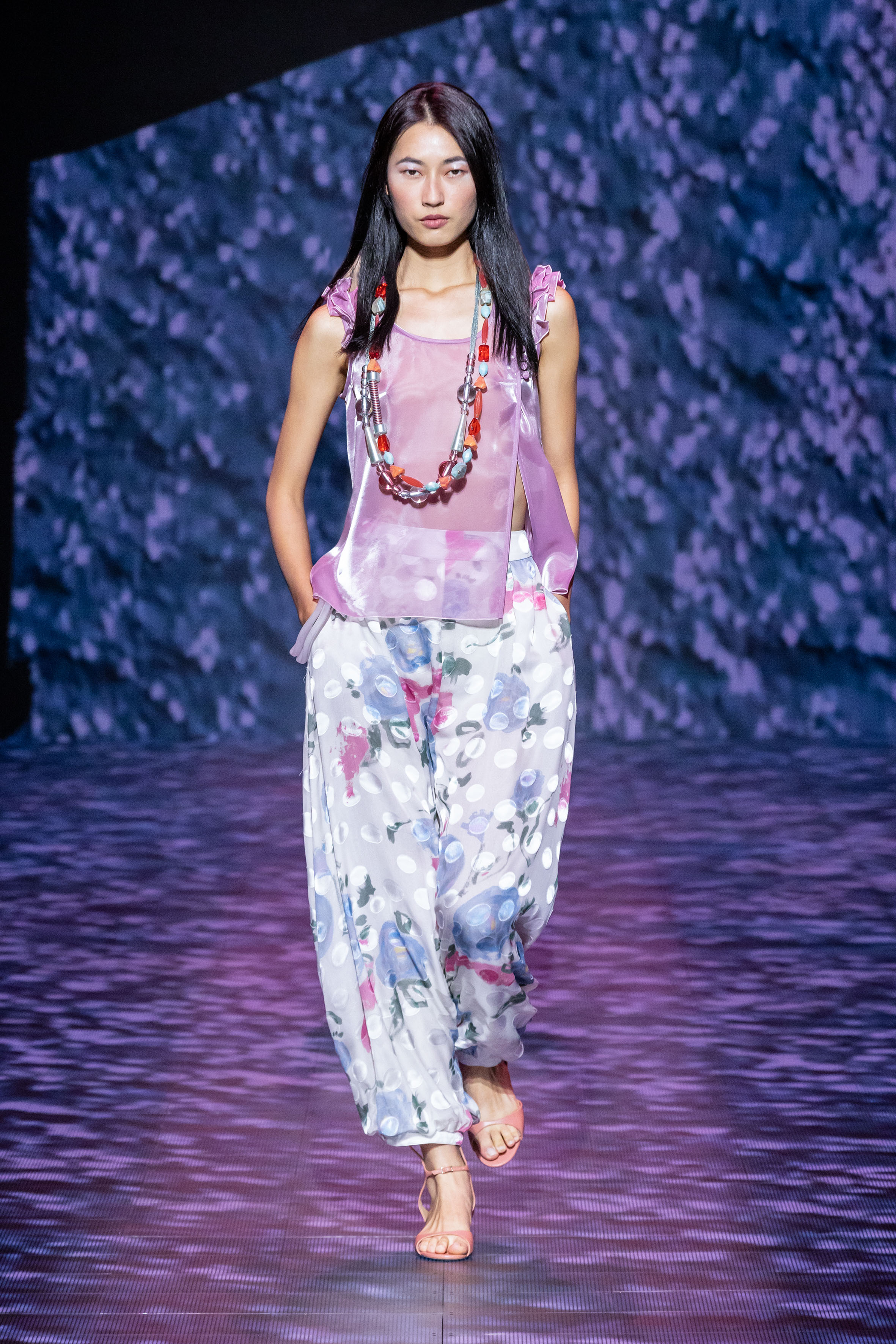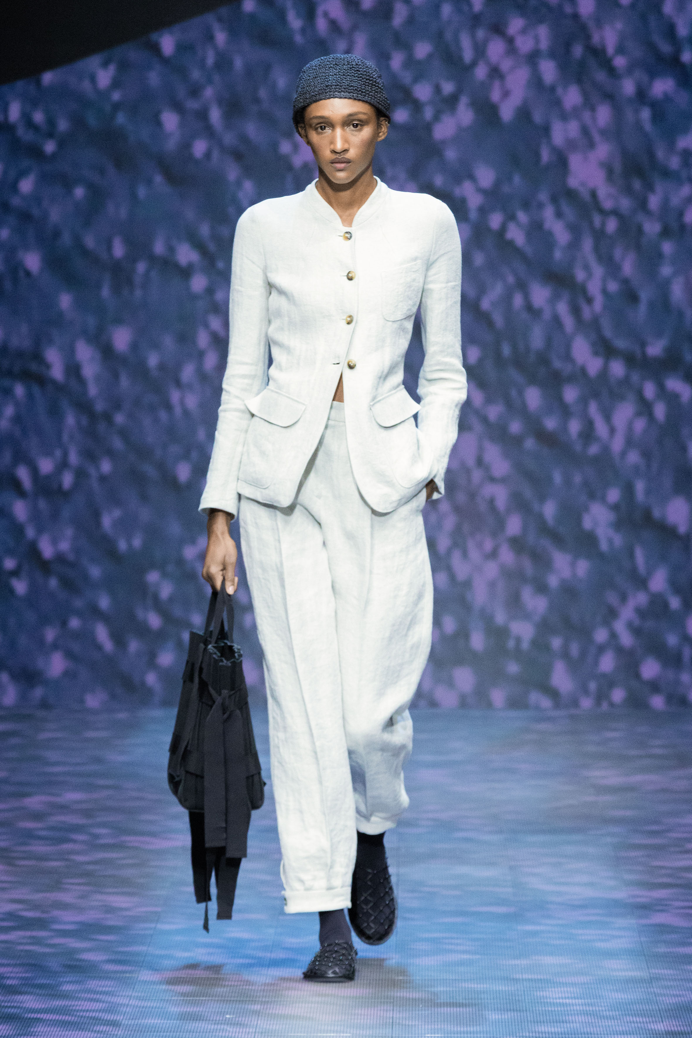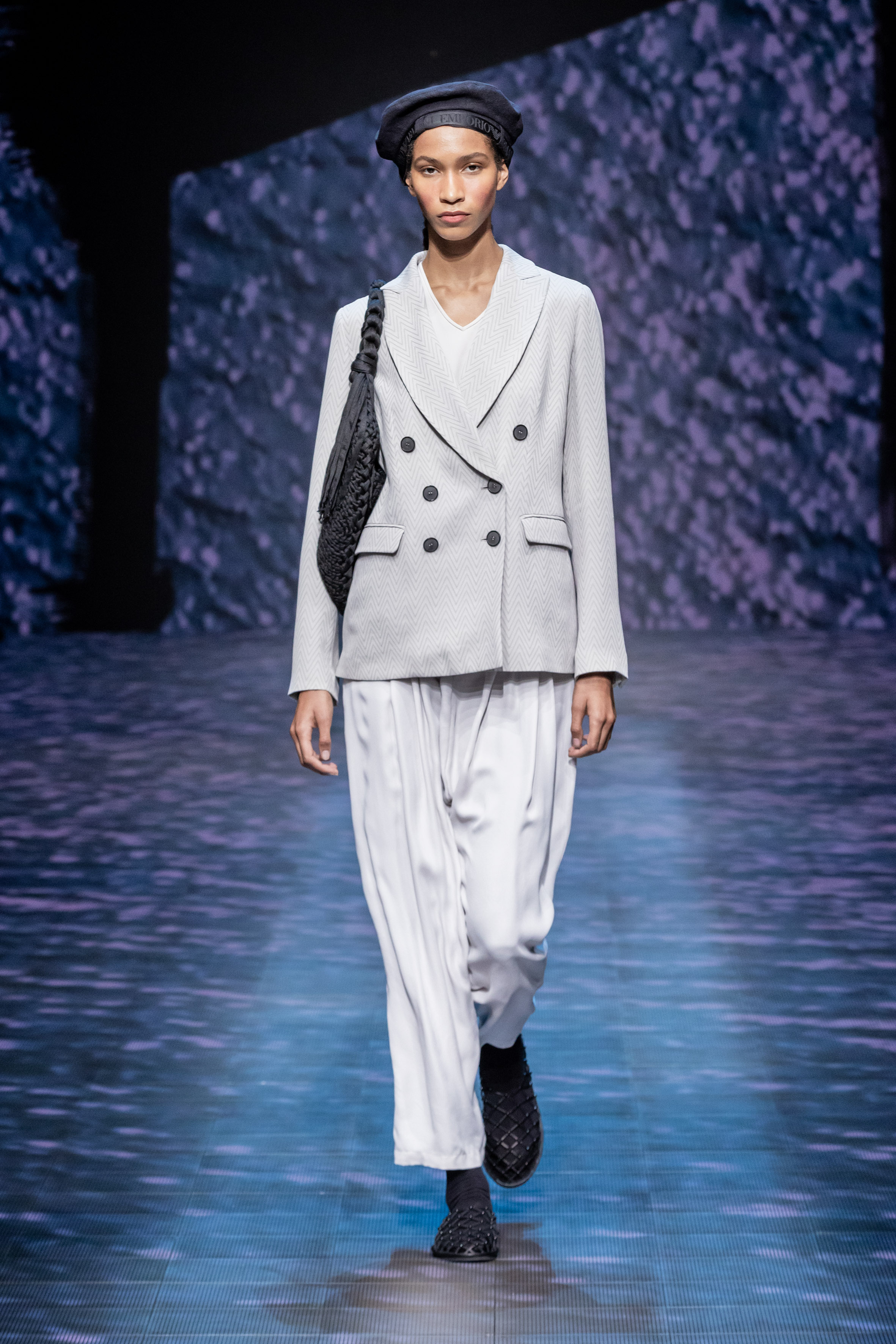 There is movement in the colour palette too, with urban neutrals and black and white shifting into pastel tones of mauve and green and then igniting with sparkling nocturnal shimmers over long dresses and weightless jumpsuits. A recurring detail, the black of small accessories, recalls the faint underlining of a story written freehand.