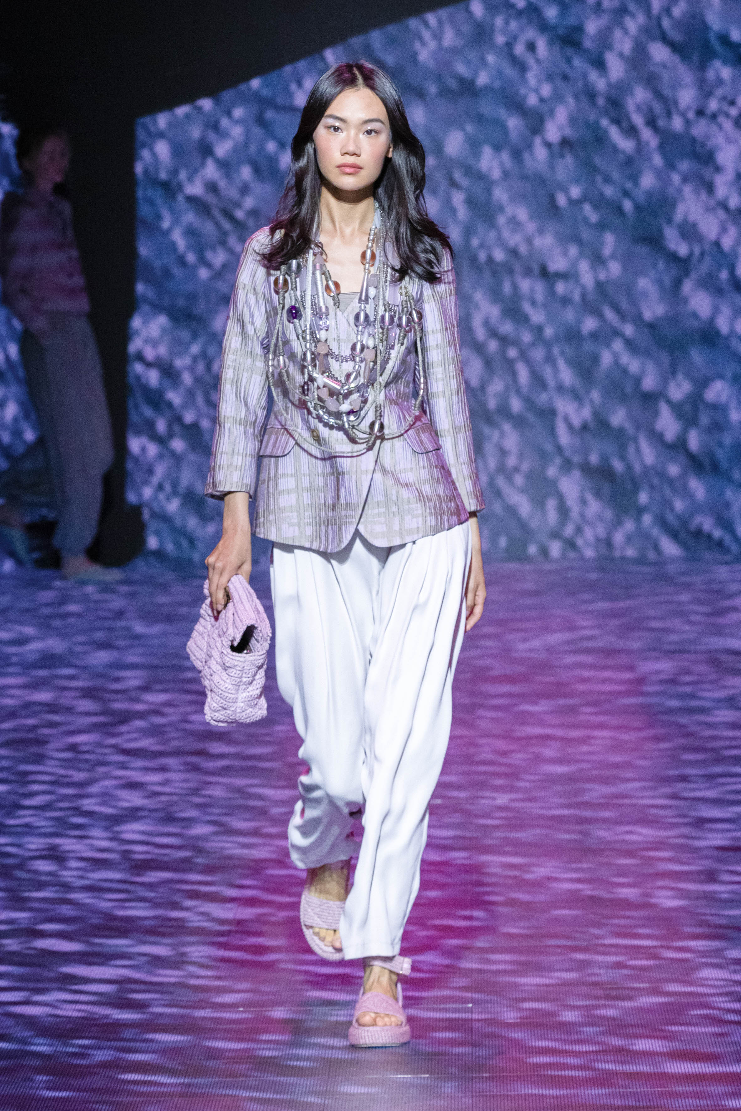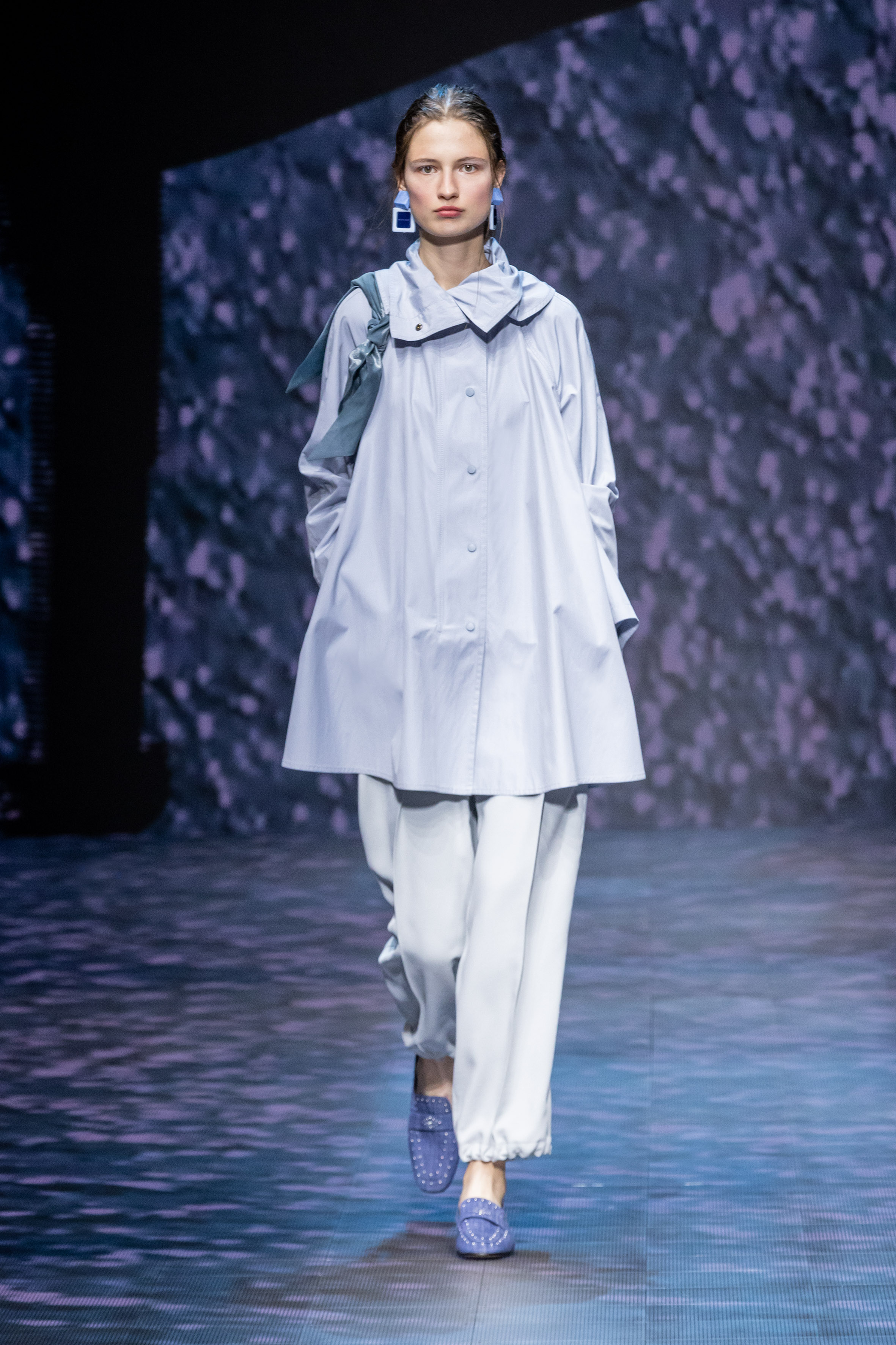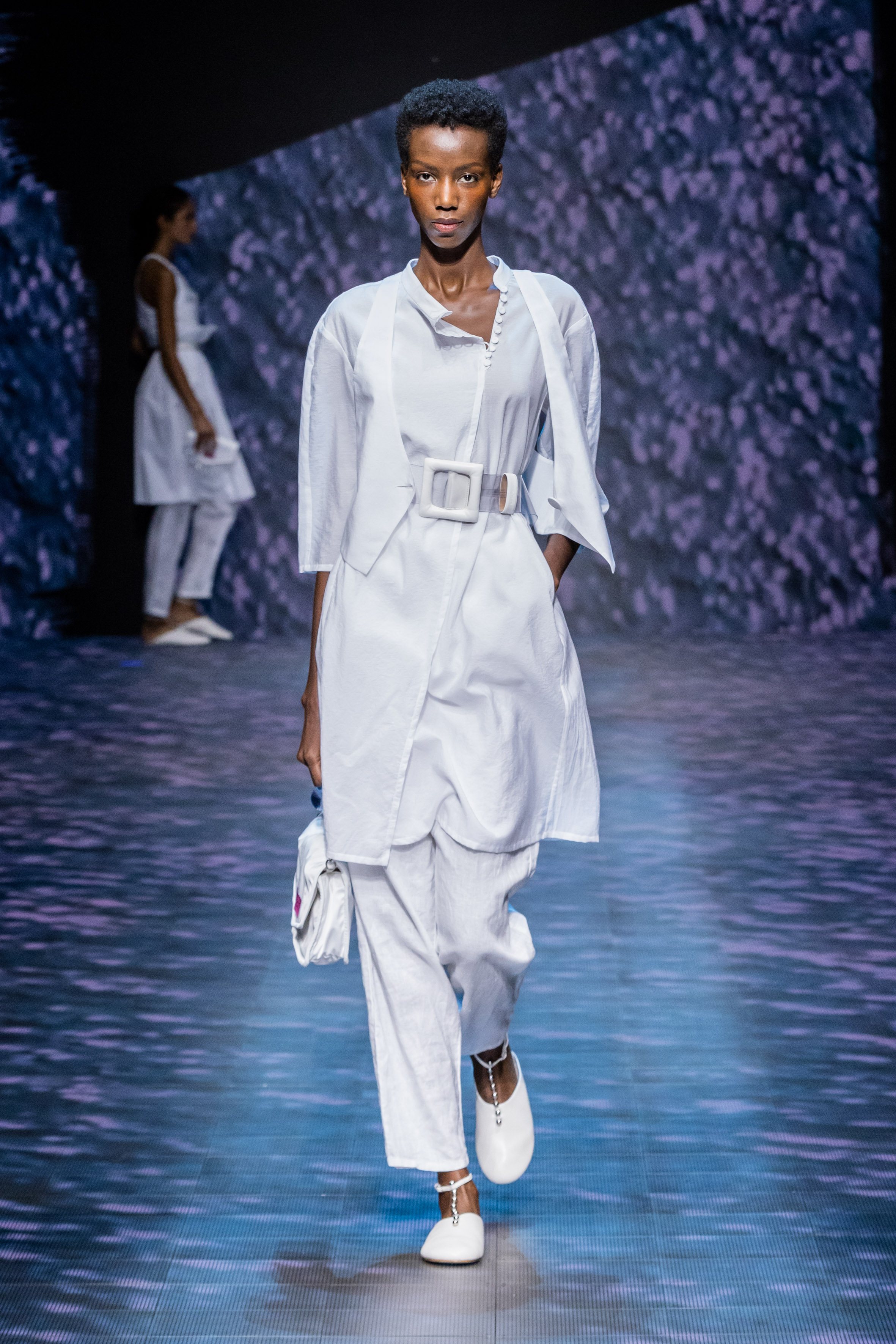 The collection is renewed affirmation of this inherent nature, established with lightness and linearity. The soft precision of jackets, pea coats, and duster jackets conceived for city life meets the liquid languor, rhythmic patterns, and elongated volumes of a hypothetical and unspecified destination somewhere to the east. The collection feels put together in the same way that a trip ends. Pulling objects picked up and fallen in love with along the way from the suitcase to mix with existing treasures. This is how blazers end up over sarongs, while shirts lengthen into outerwear; everything fluctuates, moving lightly aroung the body, outlining a soft, vertical silhouette that is emphasised, at all times, by flat shoes.