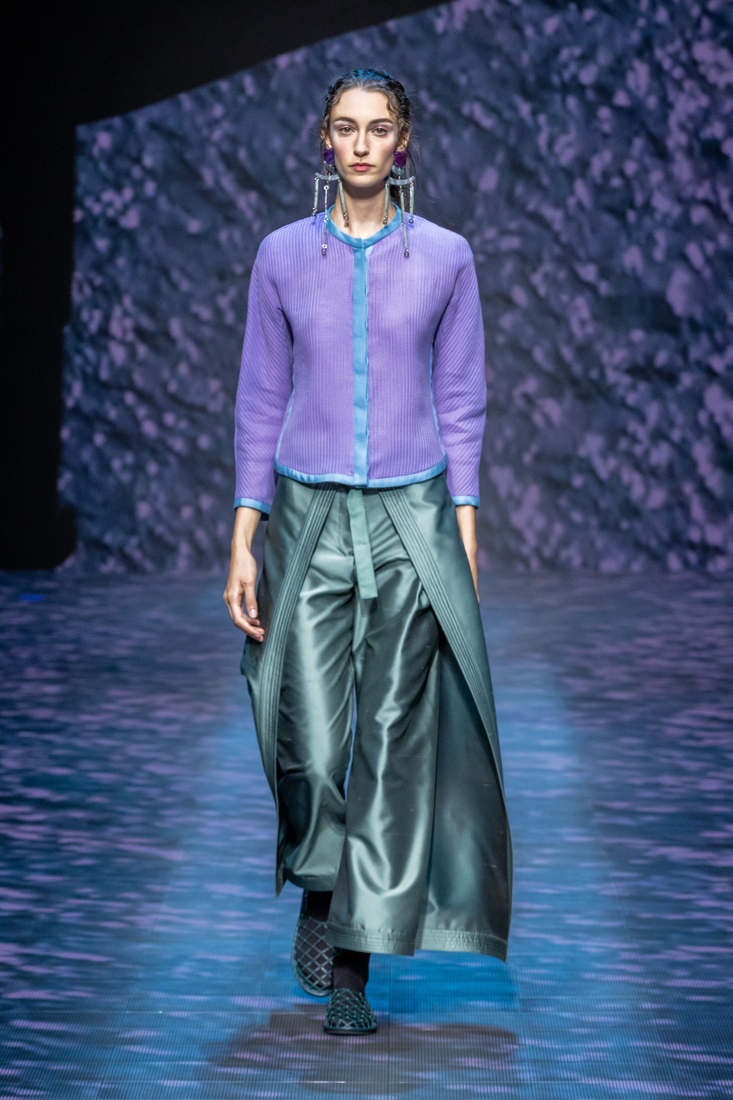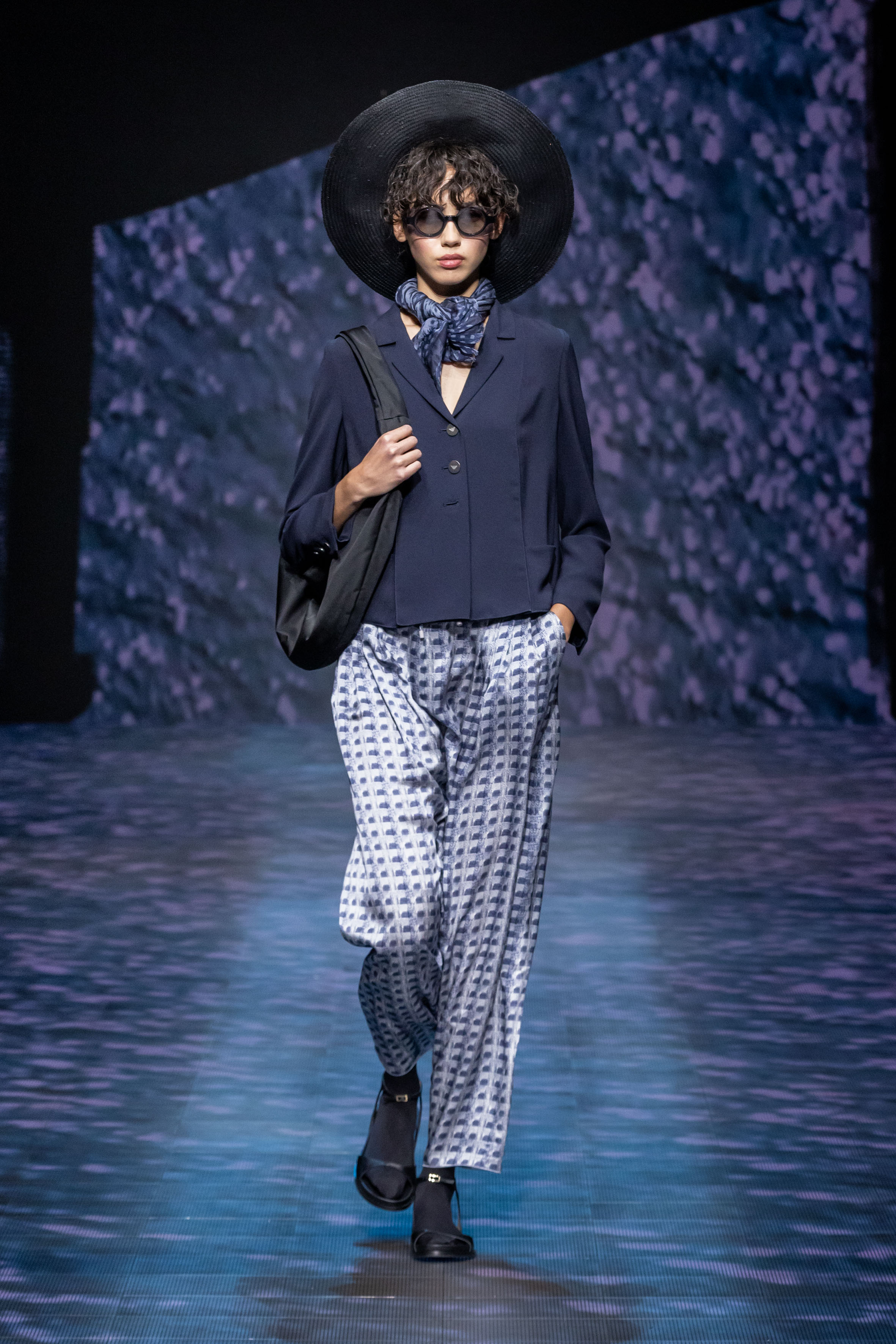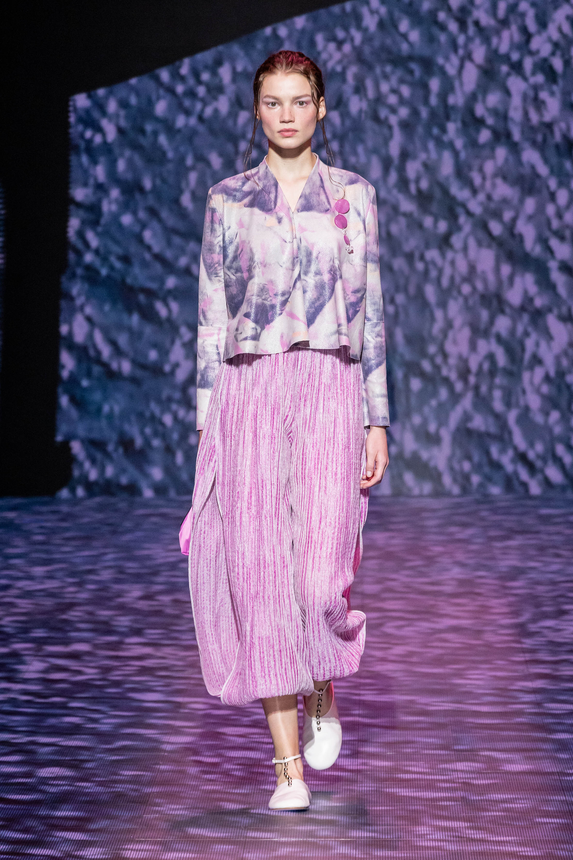 The collection is renewed affirmation of this inherent nature, established with lightness and linearity. The soft precision of jackets, pea coats, and duster jackets conceived for city life meets the liquid languor, rhythmic patterns, and elongated volumes of a hypothetical and unspecified destination somewhere to the east. The collection feels put together in the same way that a trip ends. Pulling objects picked up and fallen in love with along the way from the suitcase to mix with existing treasures. This is how blazers end up over sarongs, while shirts lengthen into outerwear; everything fluctuates, moving lightly aroung the body, outlining a soft, vertical silhouette that is emphasised, at all times, by flat shoes.