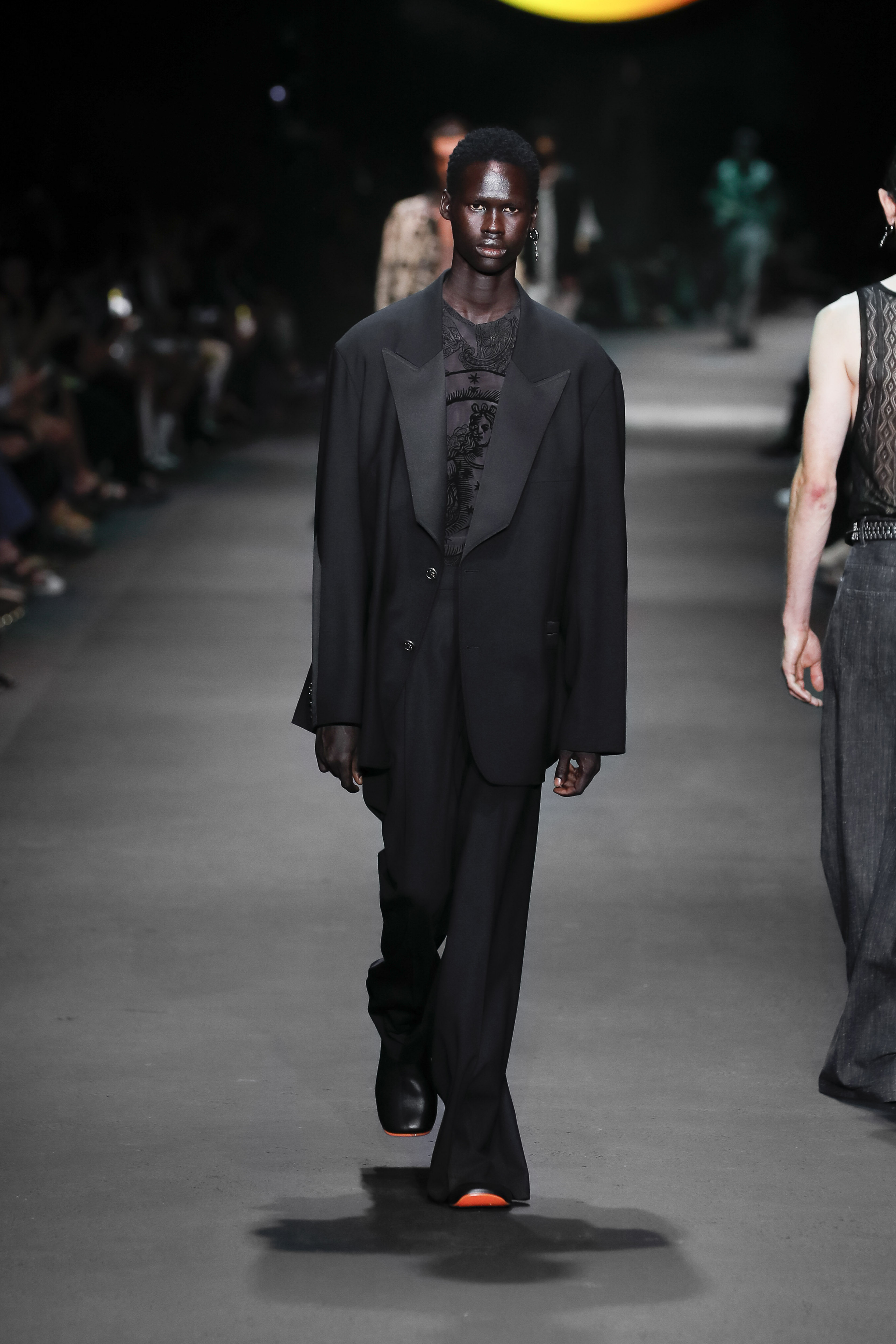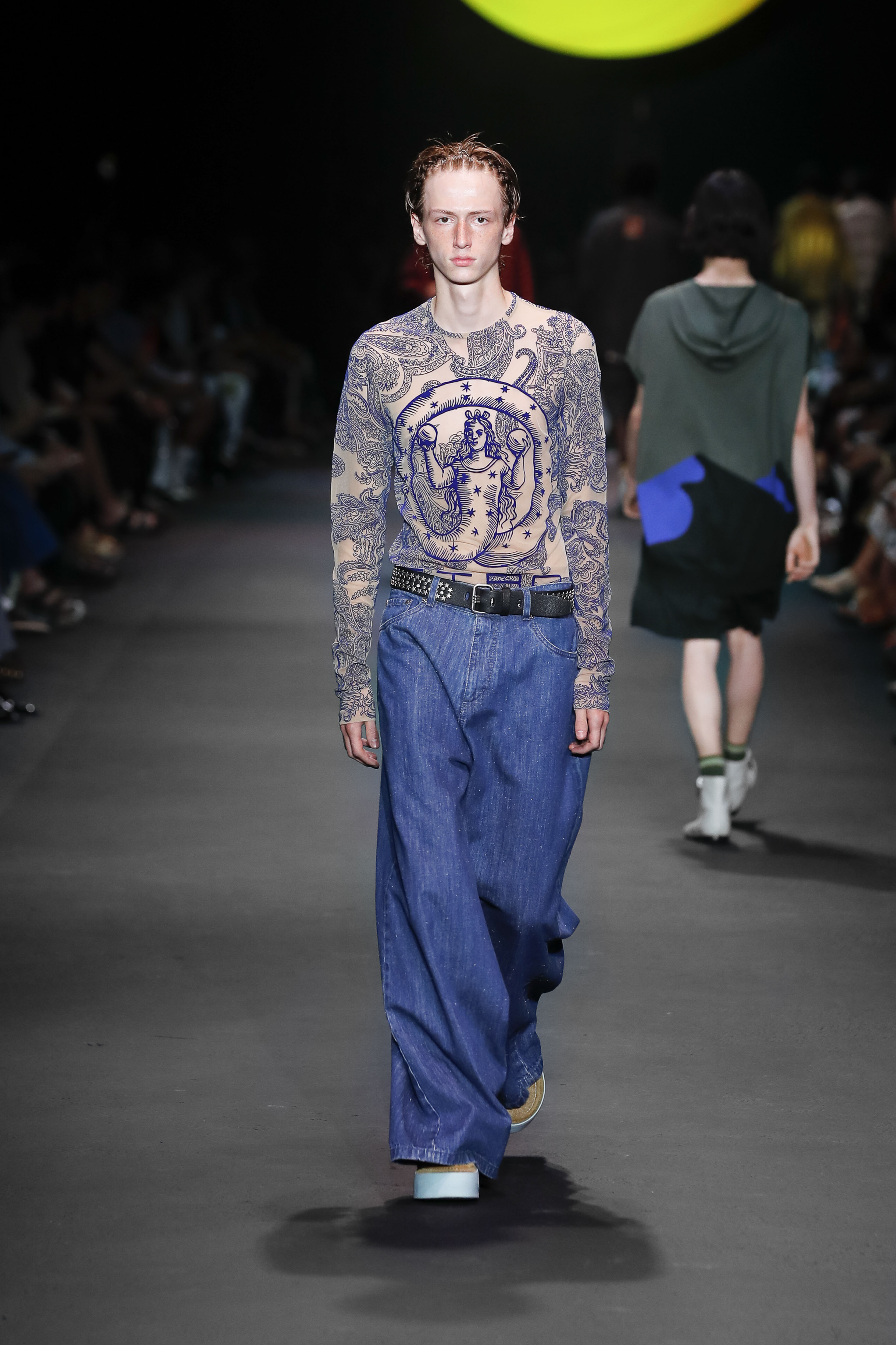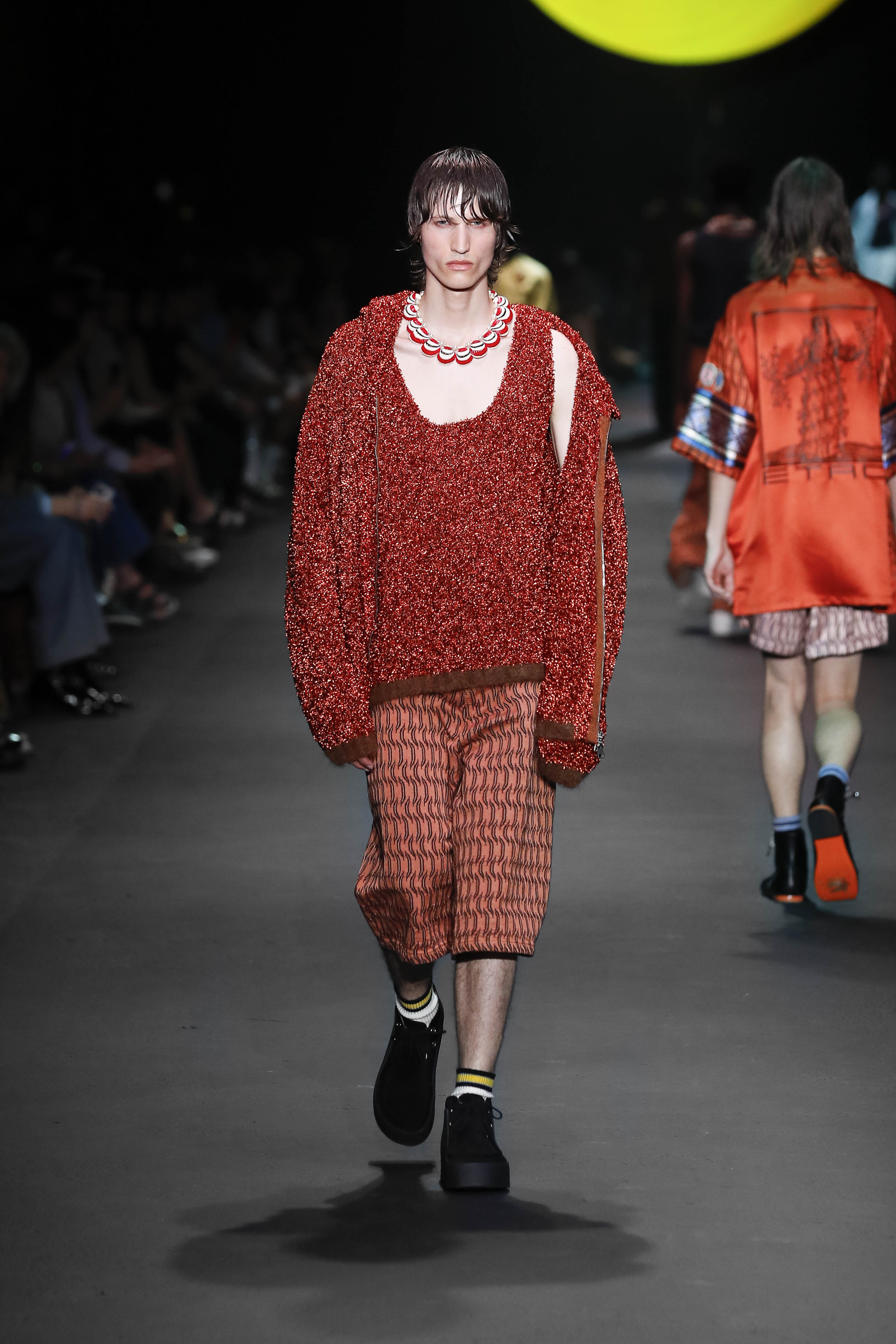 Allegoric images of Augurio Buono, Bellezza, Eternità, Lussuria, Tenacità pop up here and there, among the glittery touches, as prints or jacquards. Solemnity and playfulness come to the fore, sealed by the accessories: hyper-vulcanized wallabees, square-toed doll shoes, intarsia bags.