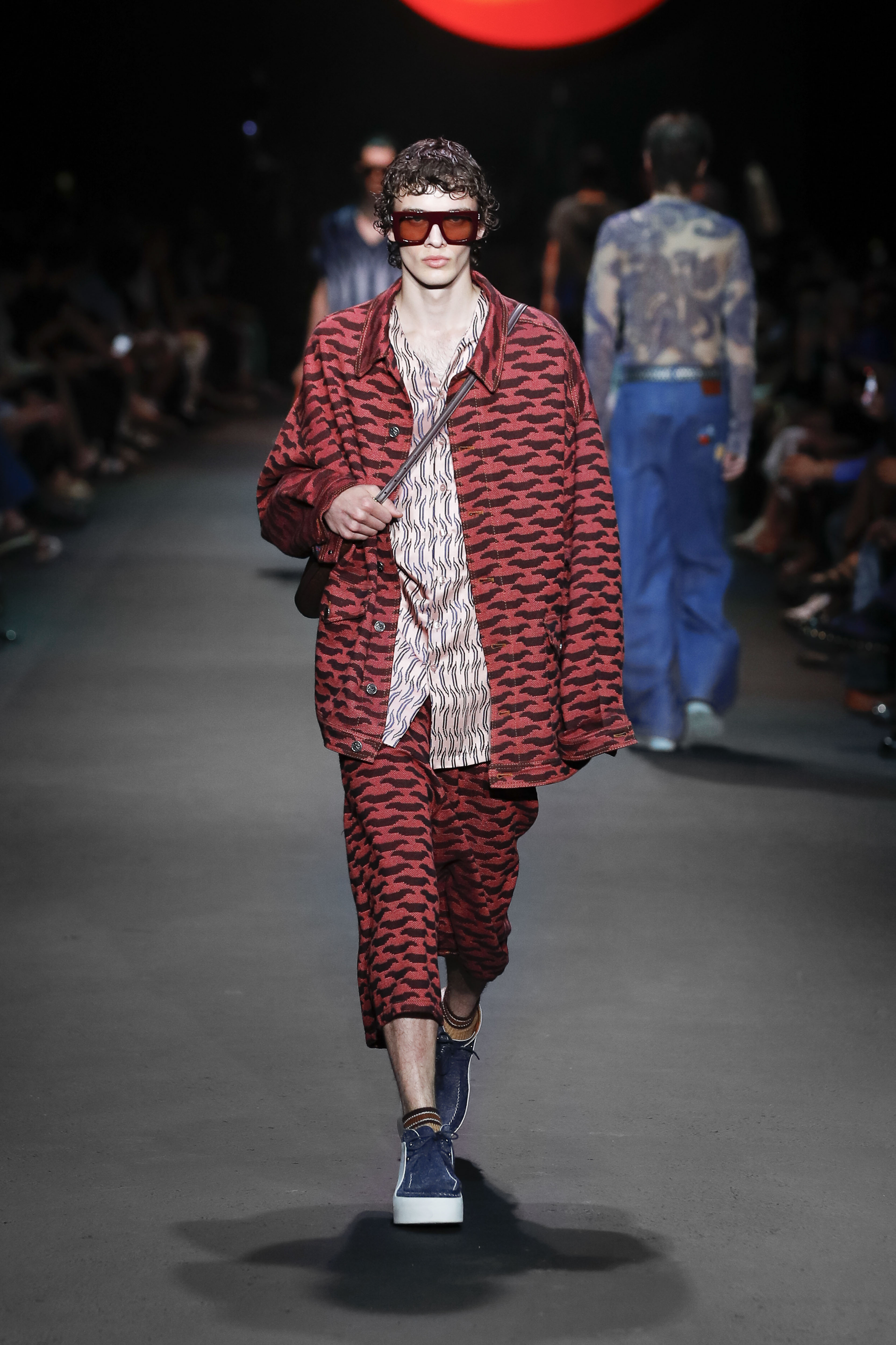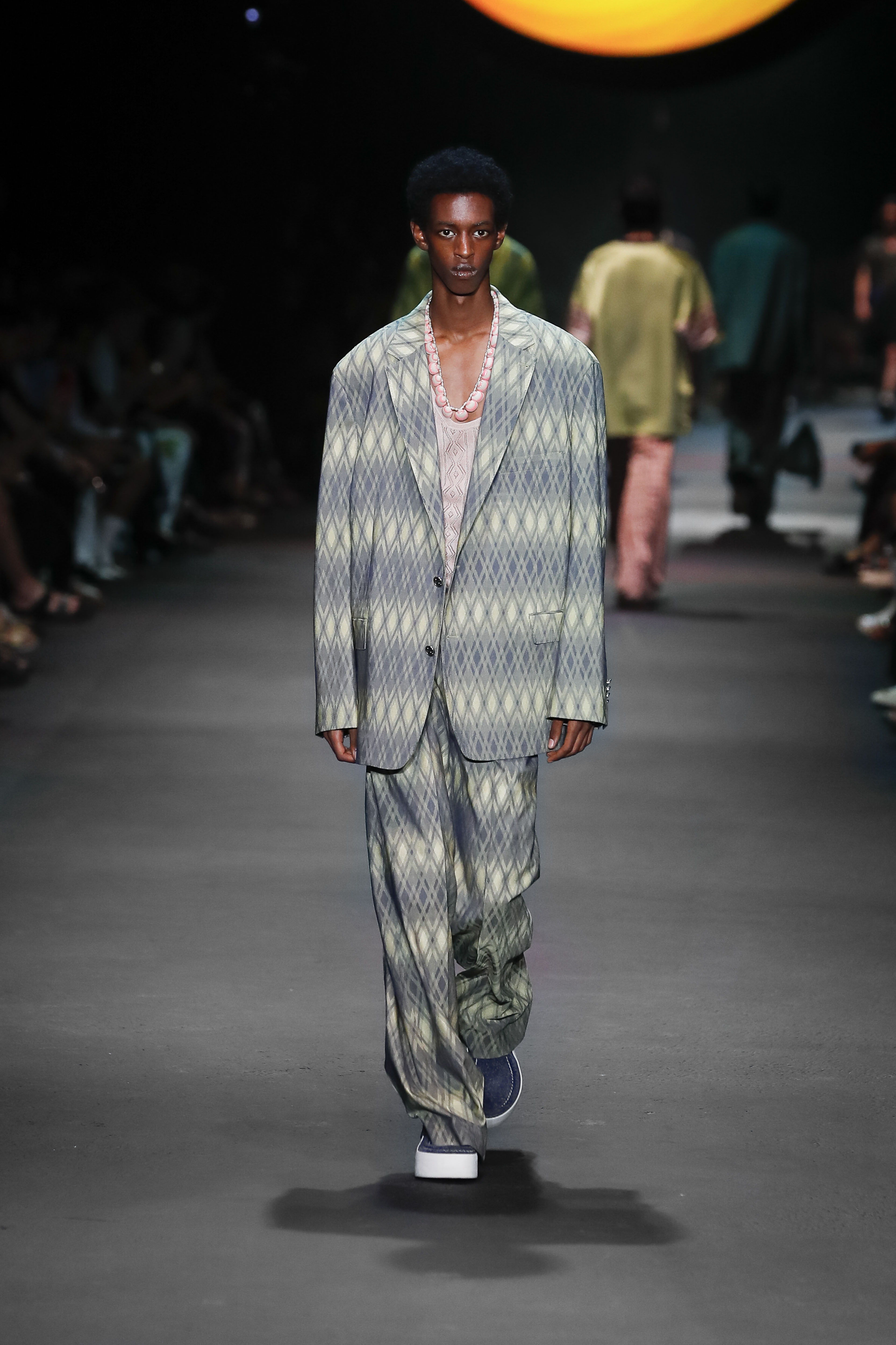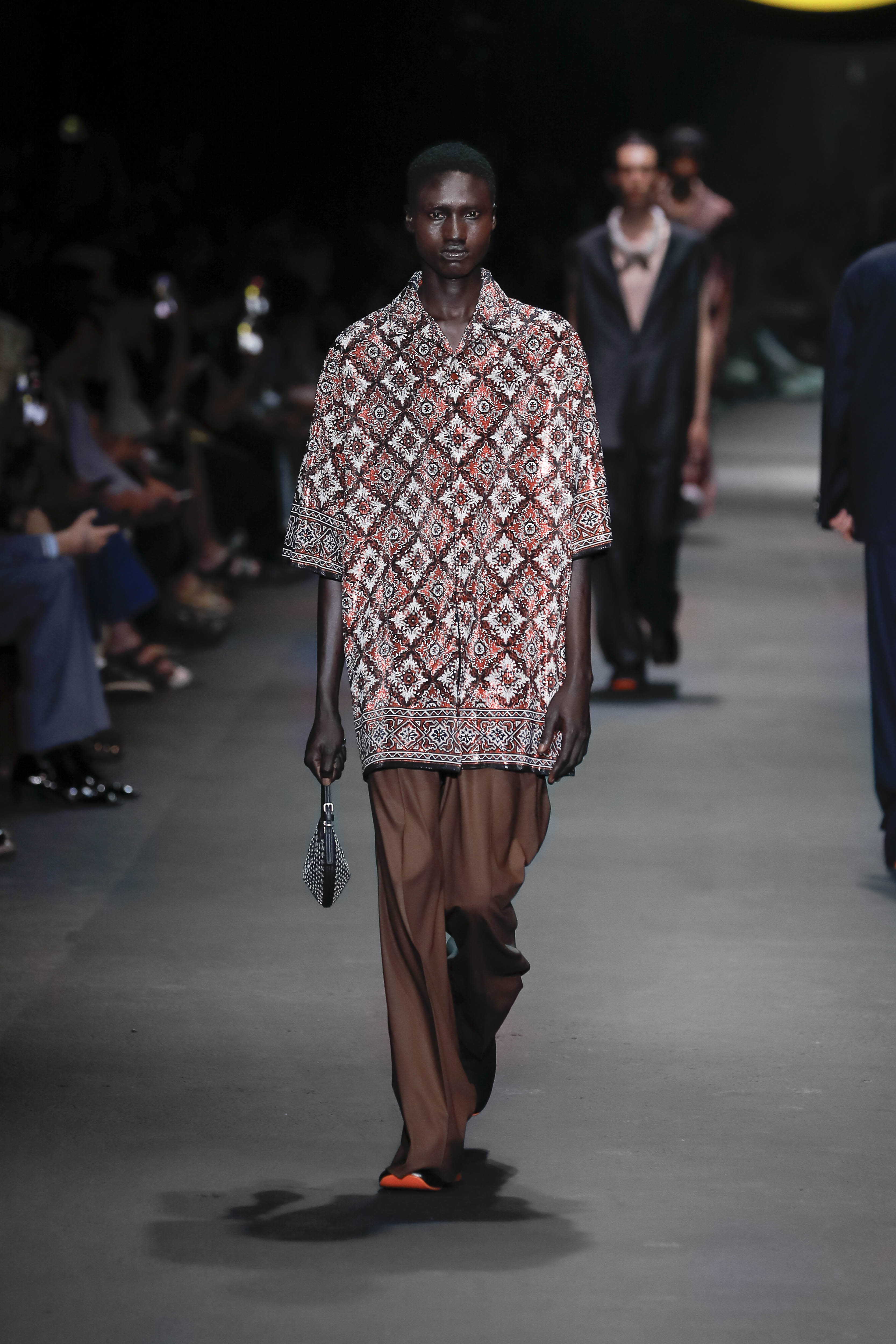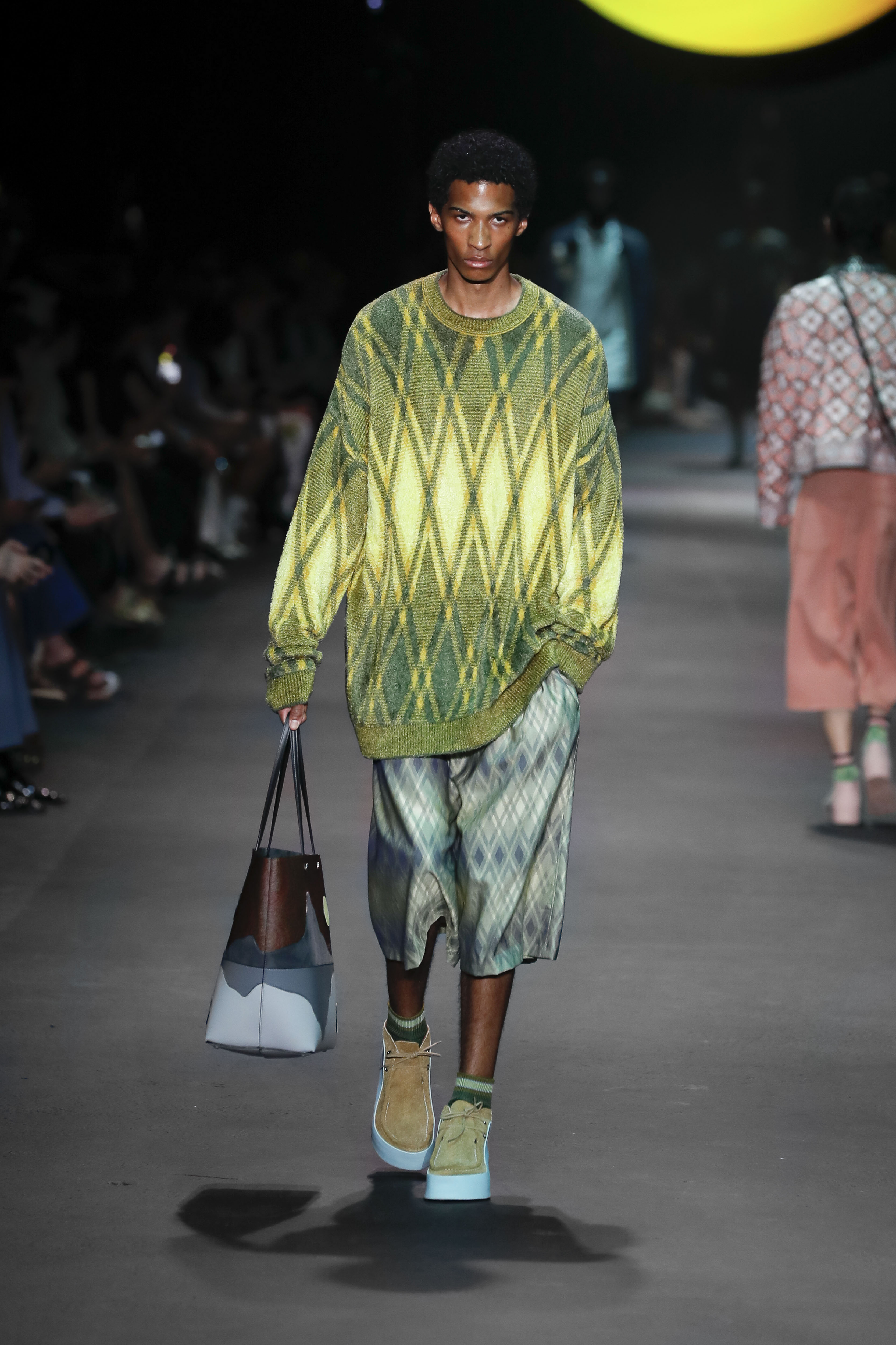 The new Etro collection stems from such intuitive, deliberately non-scientific thinking. It is imbued with both ease and sacrality, condensed in flowing shapes that barely touch the body and rhythmic patterns that swarm all over it, either mixed or matched. Generous blazers, bermudas, jumpsuits, fuzzy jumpers, football tops are mixed with long cardigans and thick blankets that turn into coats.