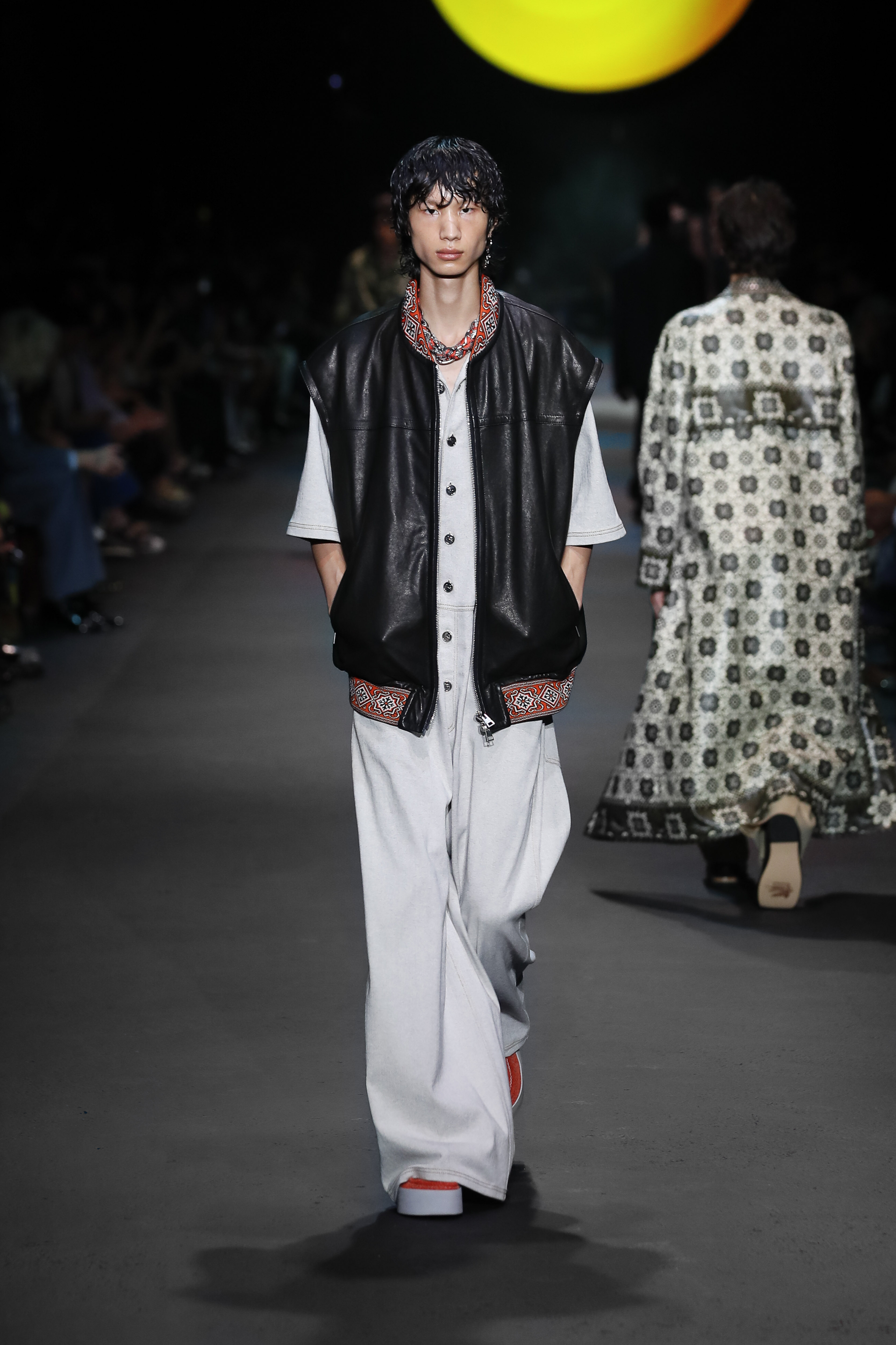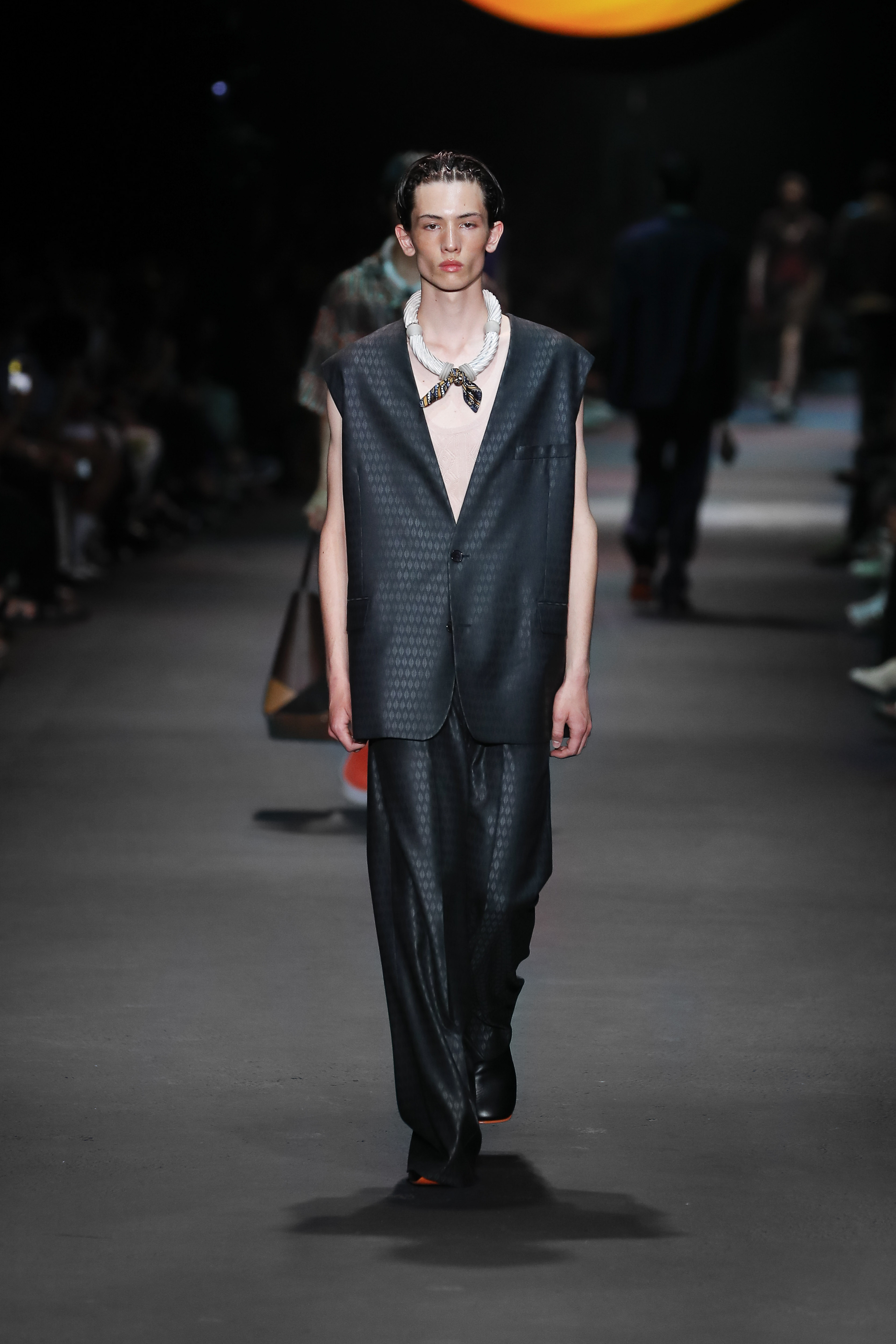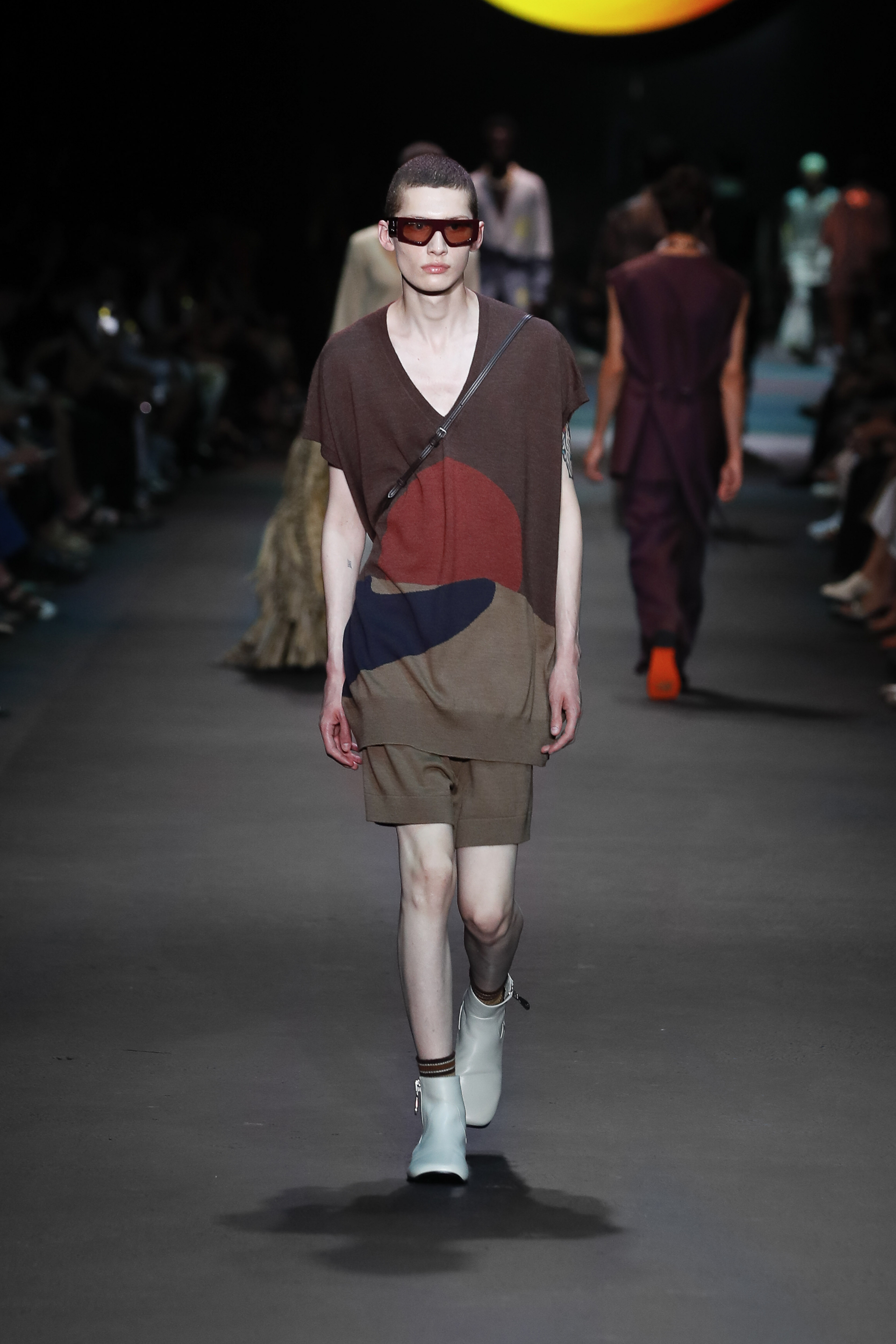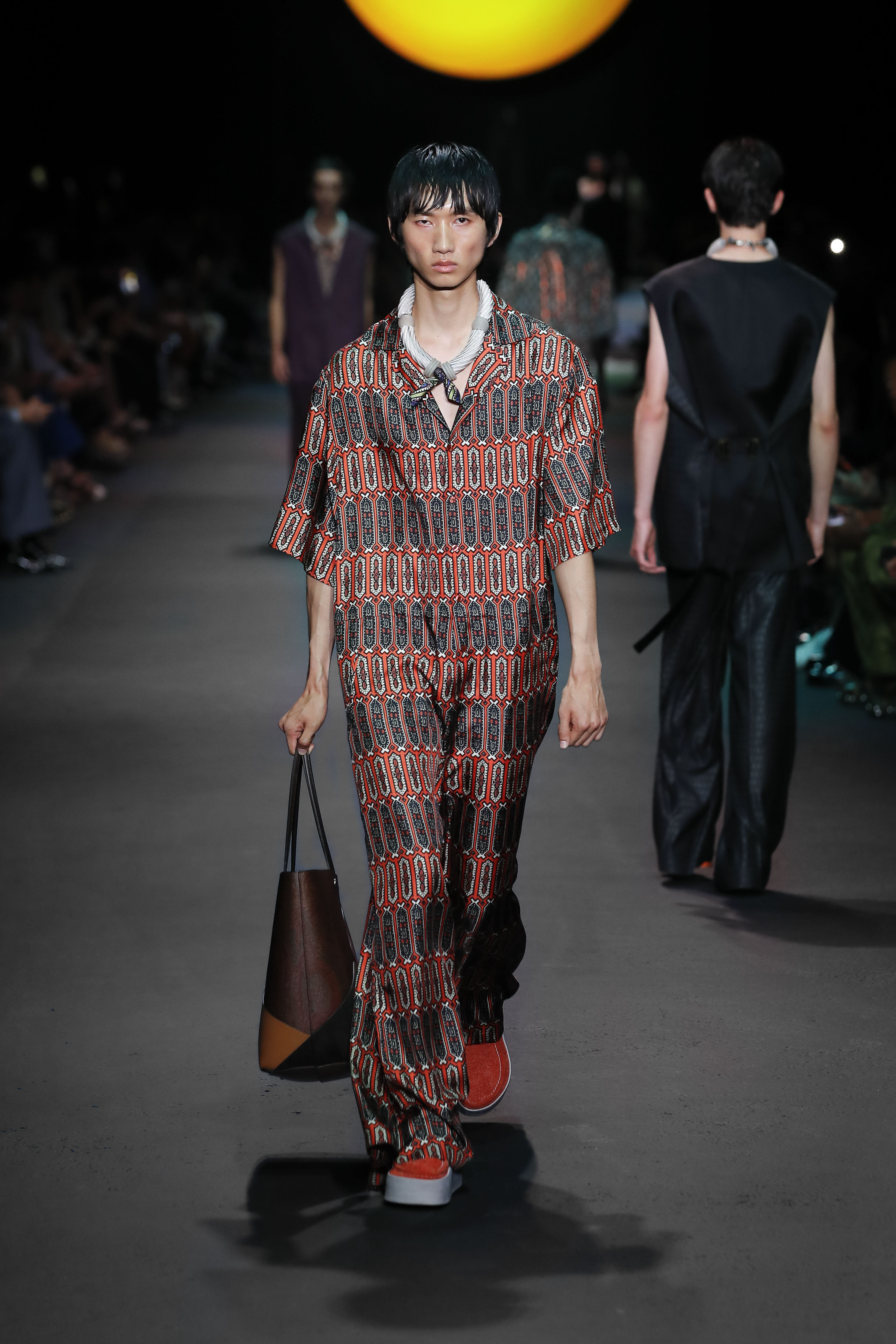 The new Etro collection stems from such intuitive, deliberately non-scientific thinking. It is imbued with both ease and sacrality, condensed in flowing shapes that barely touch the body and rhythmic patterns that swarm all over it, either mixed or matched. Generous blazers, bermudas, jumpsuits, fuzzy jumpers, football tops are mixed with long cardigans and thick blankets that turn into coats.