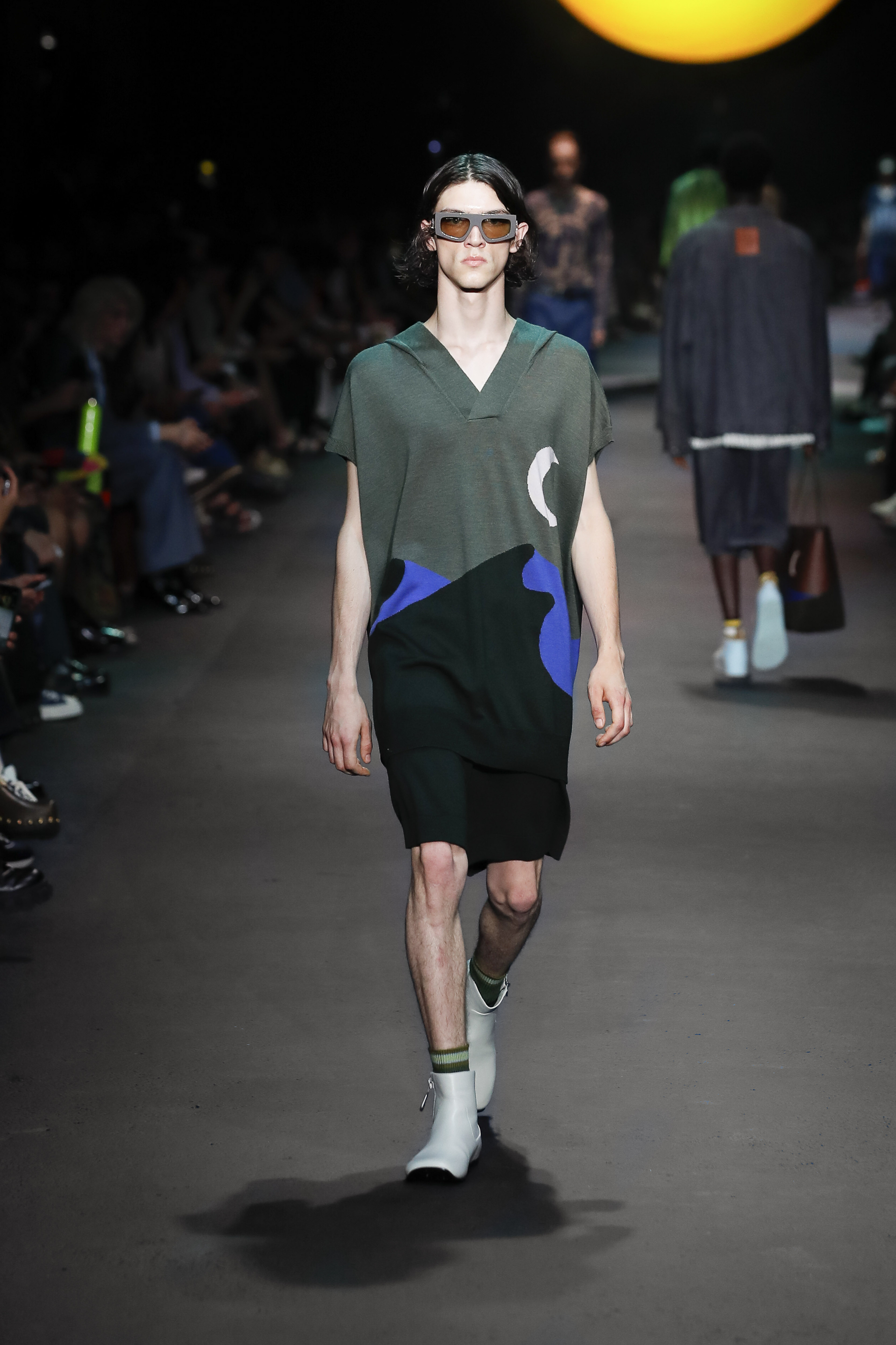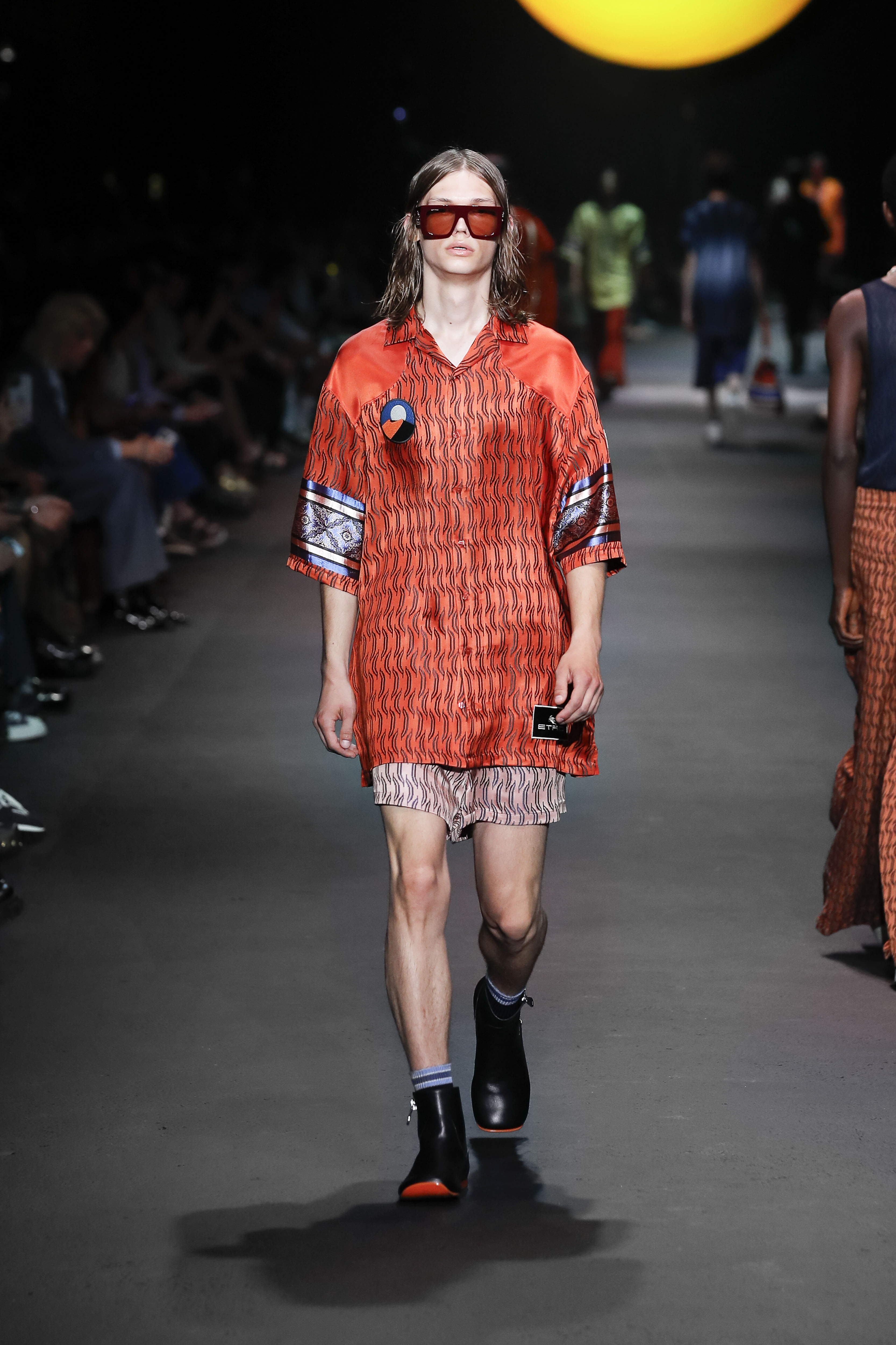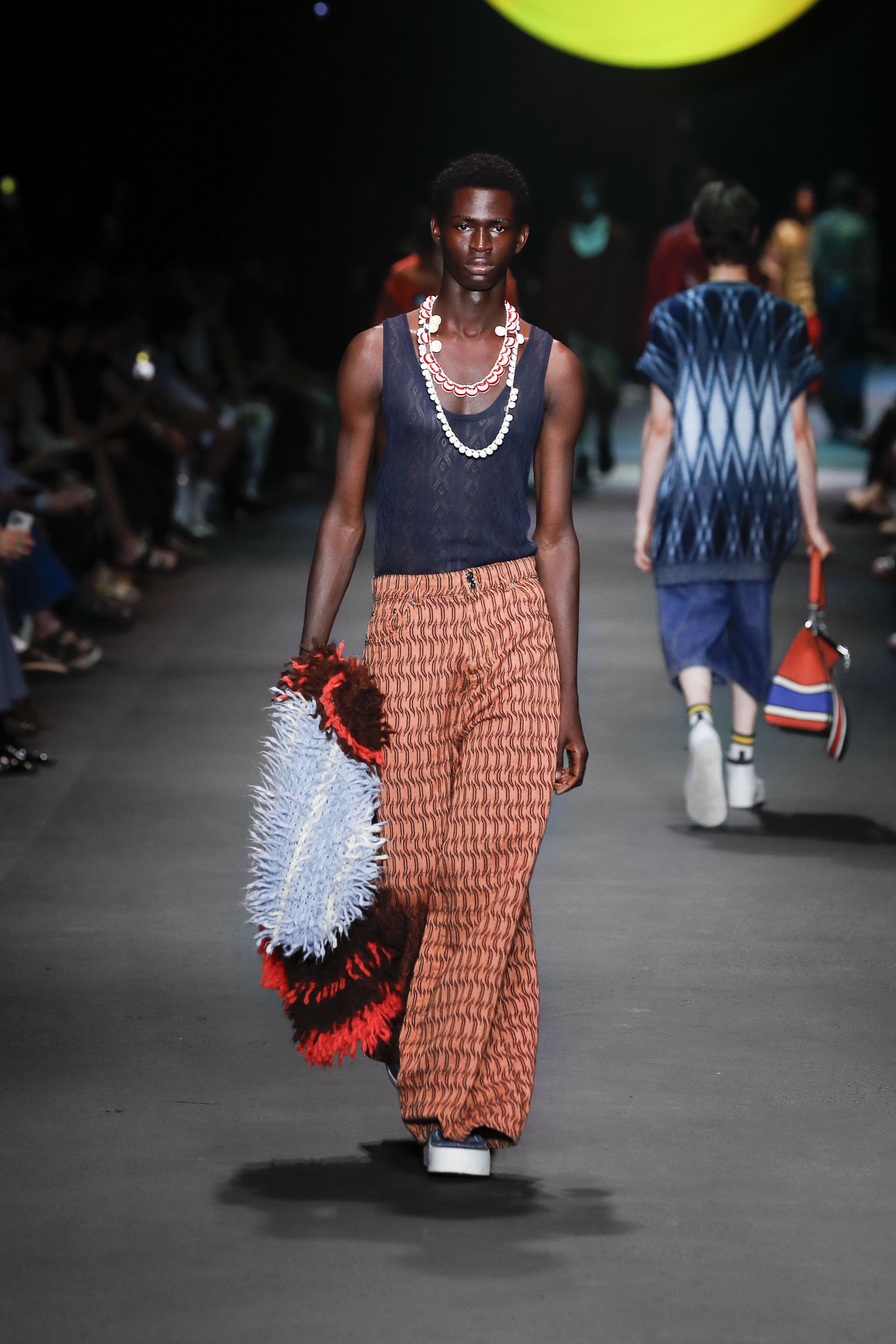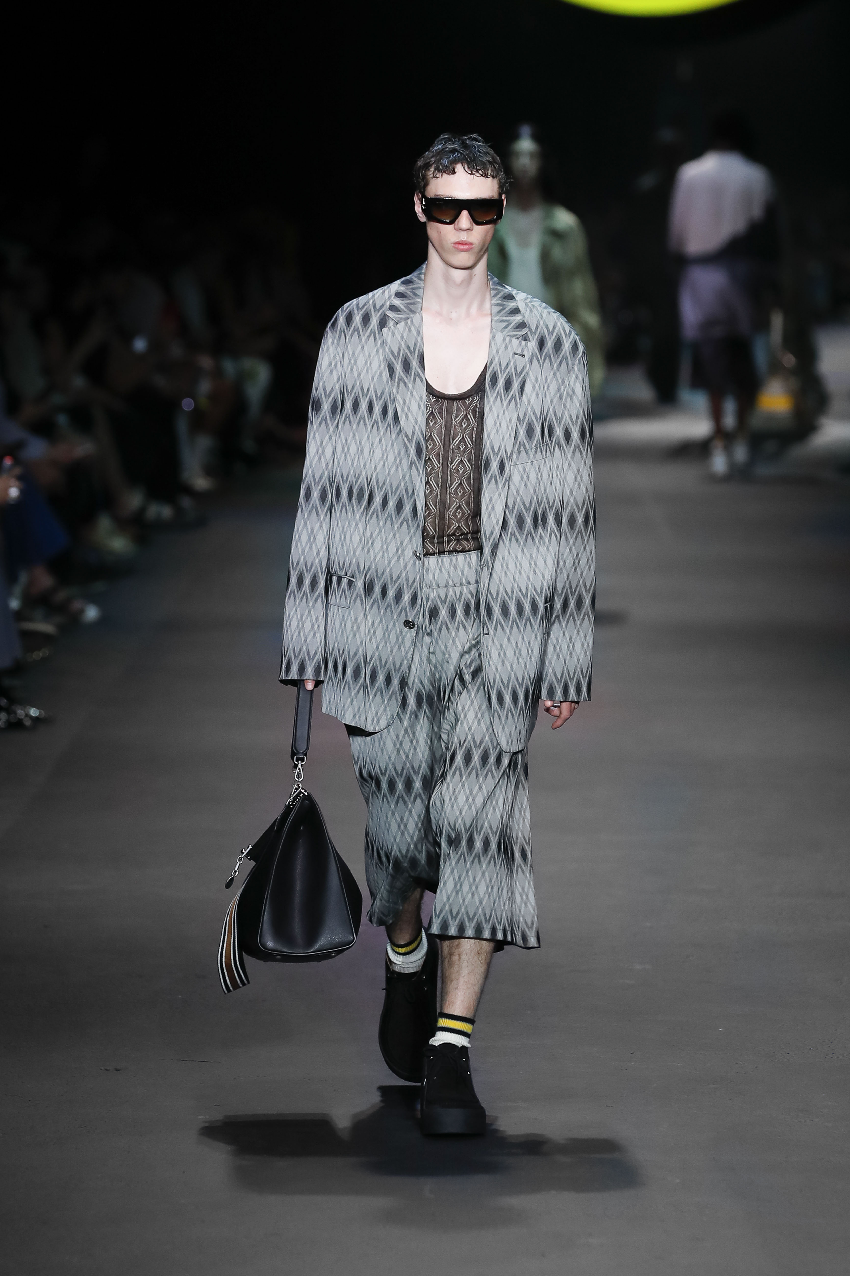 The new Etro collection stems from such intuitive, deliberately non-scientific thinking. It is imbued with both ease and sacrality, condensed in flowing shapes that barely touch the body and rhythmic patterns that swarm all over it, either mixed or matched. Generous blazers, bermudas, jumpsuits, fuzzy jumpers, football tops are mixed with long cardigans and thick blankets that turn into coats.
