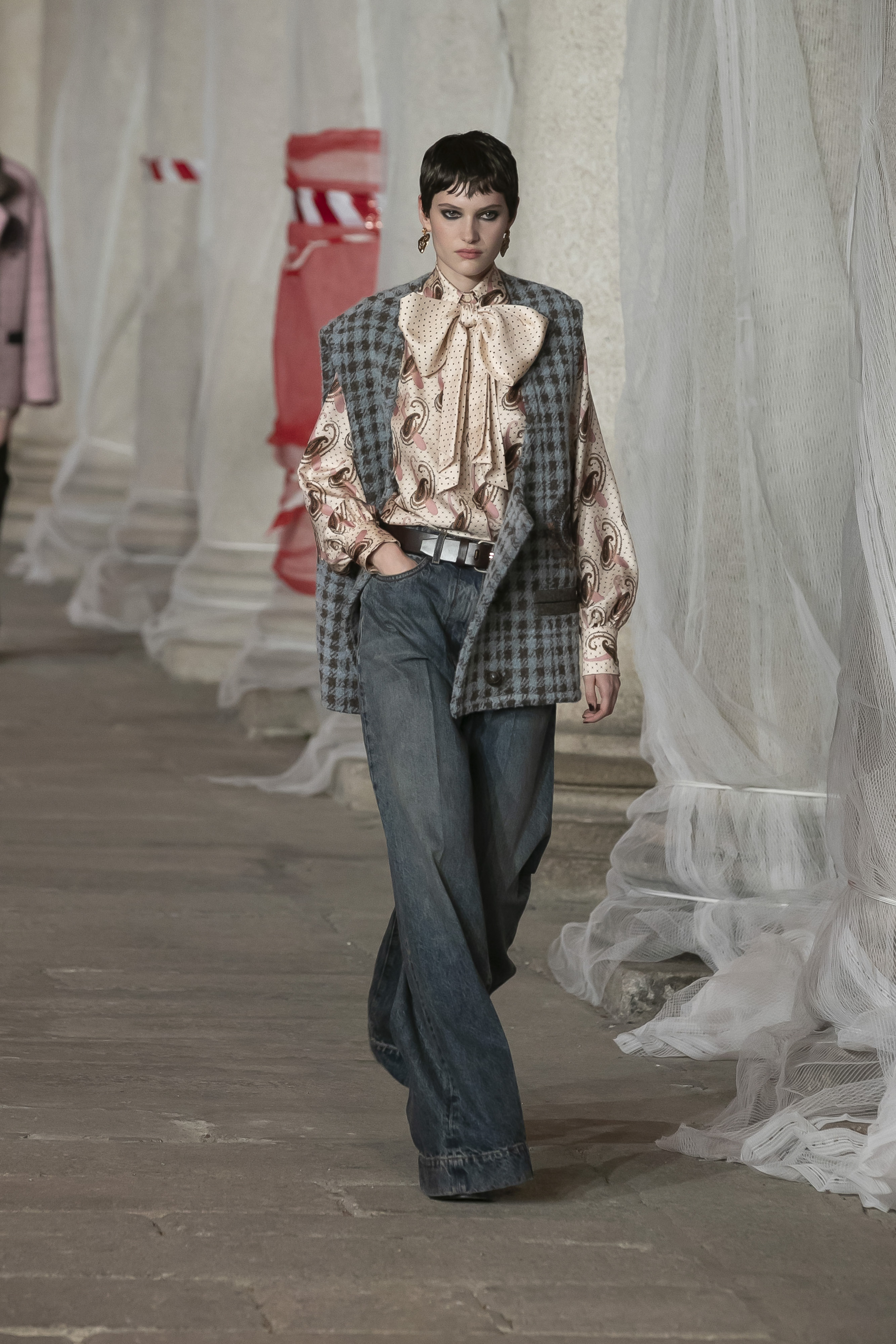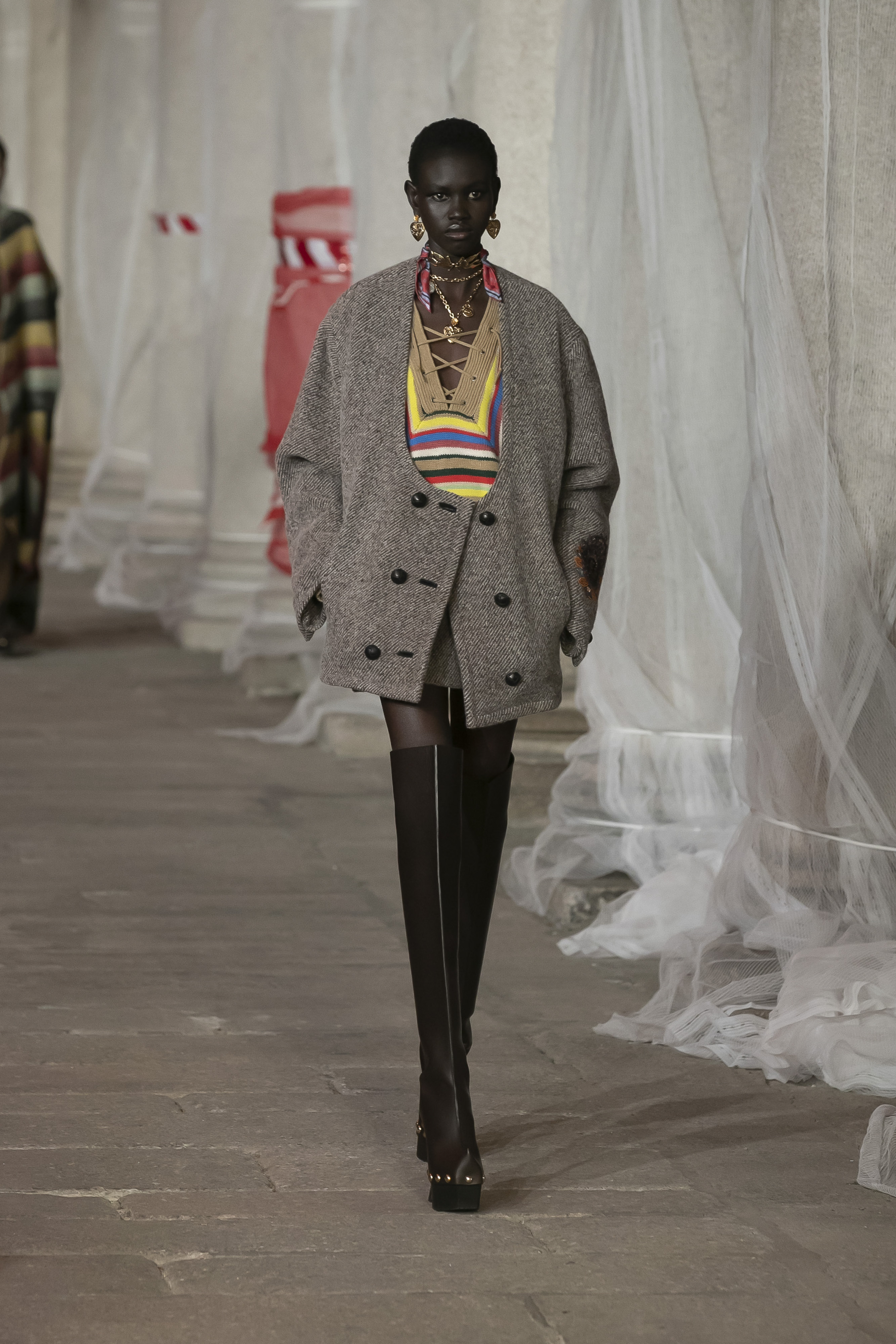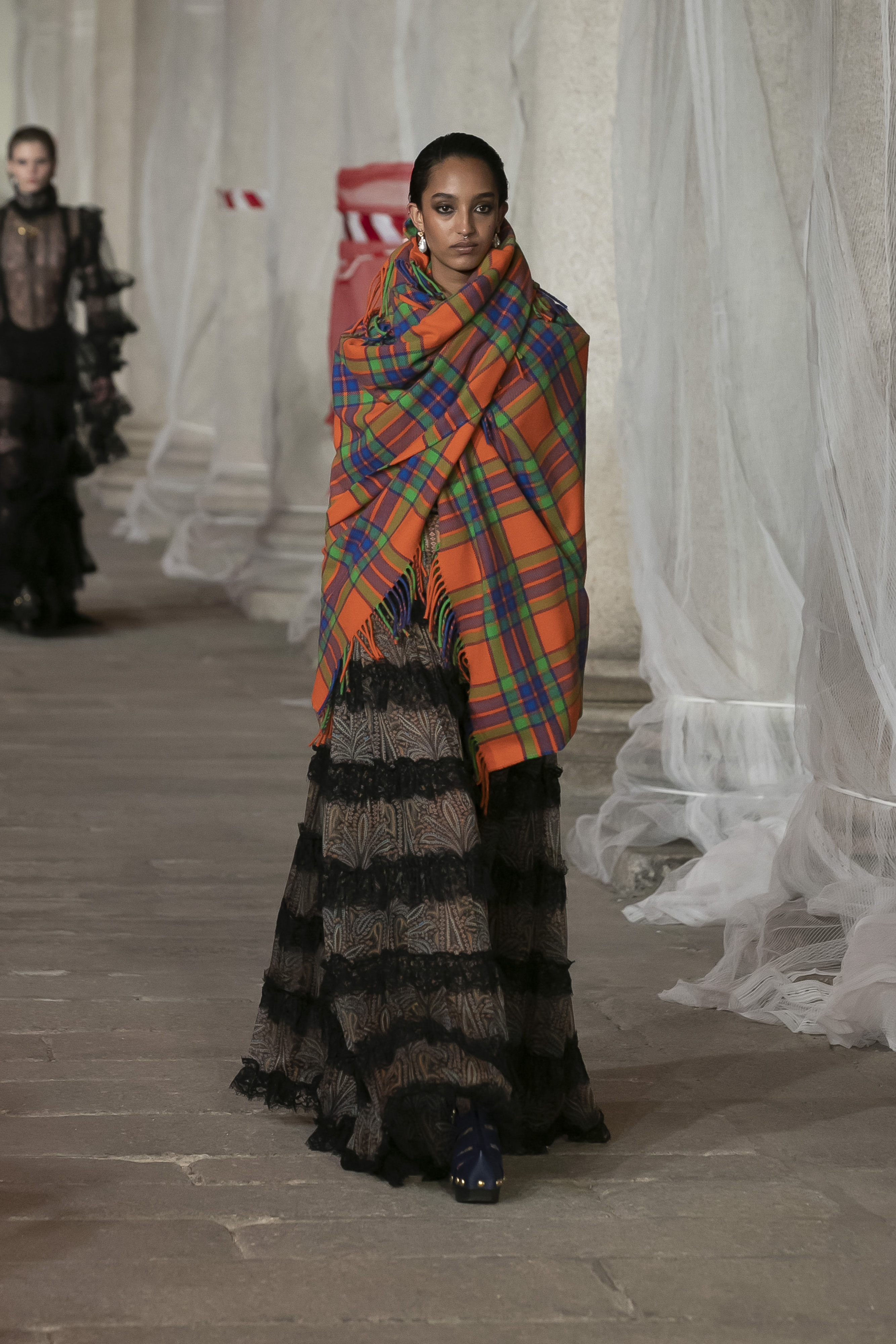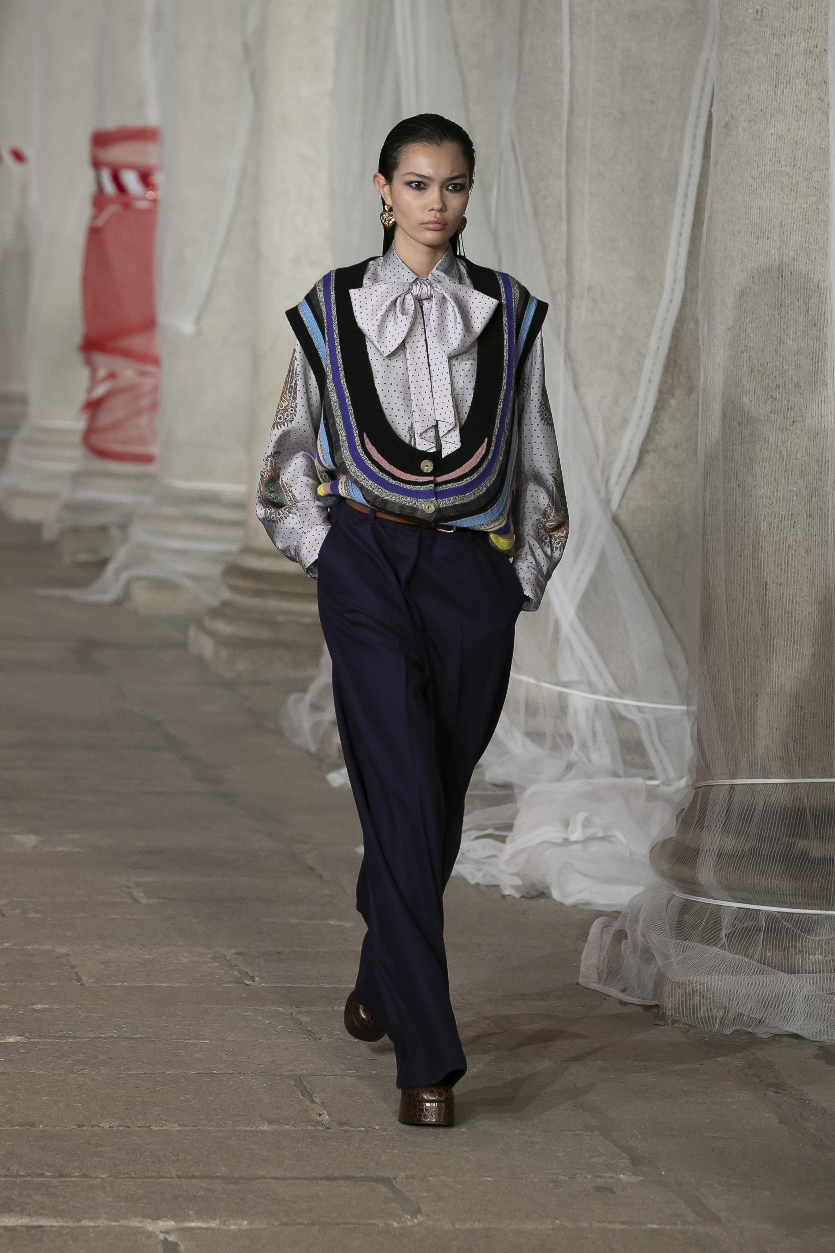 For sure, this choice is quite radical, which is exactly the spirit Marco De Vincenzo is after. Radical as a moment in history which coincides with the foundation of Etro in 1968. Radical, most of all, in the original sense of the word. The origin of radical, in fact, isn’t at all radical. Borrowed from Late Latin radicalis, it means root. The roots of Etro are in fabric and print: tartans, cravatteria motifs and, of course, paisley. All of it comes back today, framed by a new sense of precision, by a psychedelic proclivity for sharp cuts and the rhythm of patterns. Things come together instinctively, as long billowy dresses are paired with droopy, chunky knits, and androgynous trousers and vests are mingled with silk blouses. Tailoring is tall and precise, in opulent fabrications. Necktie motifs swarm on enveloping coats with contrast prints on the inside. Denim pants peek a boo, hinting, indeed, at a radical look. Etro being a whole world, elements of home furnishing are borrowed, with blankets wrapped on light dresses. Fringes dance along the hem of chunky polos and scarves, while applique gives argyle knit a three-dimensional charm.