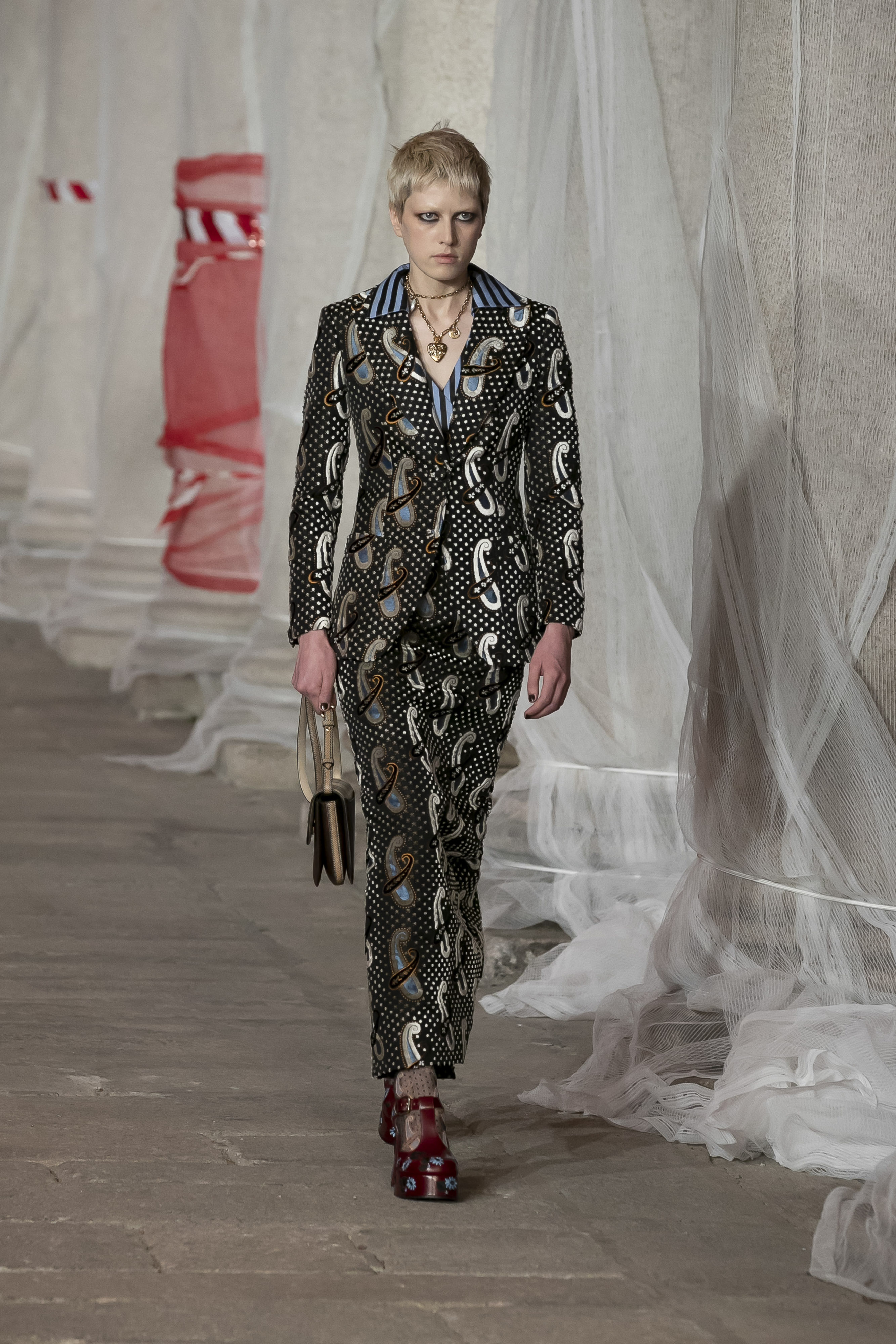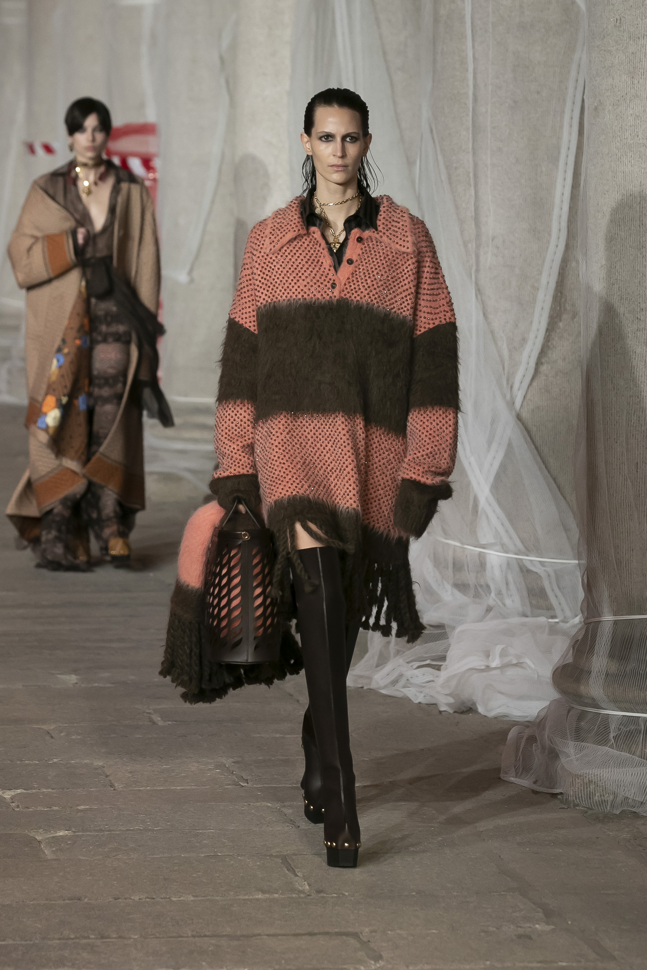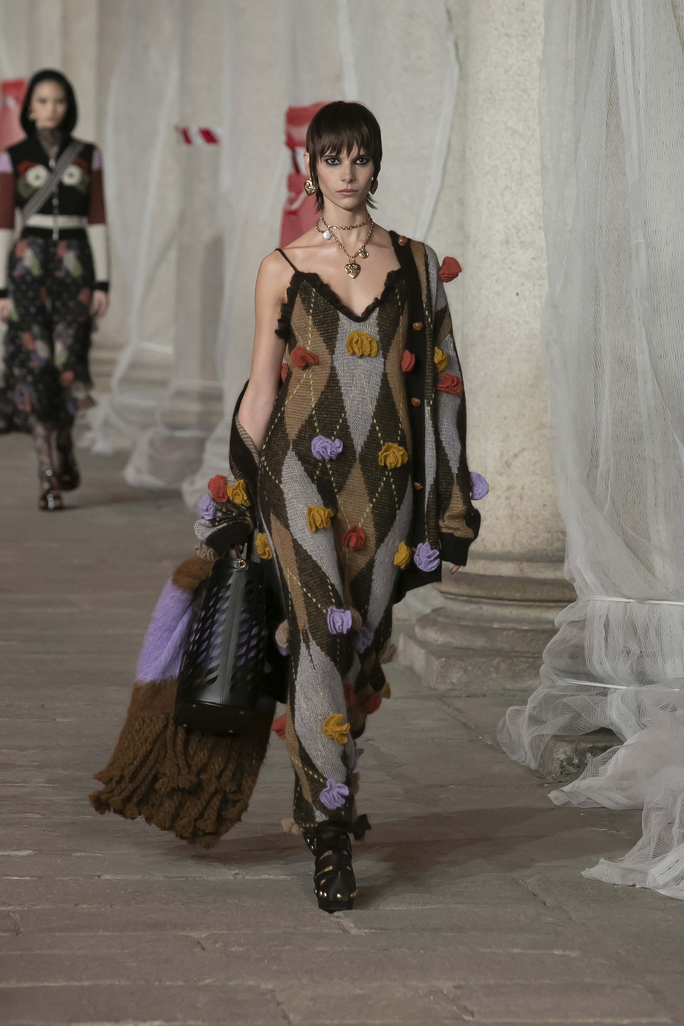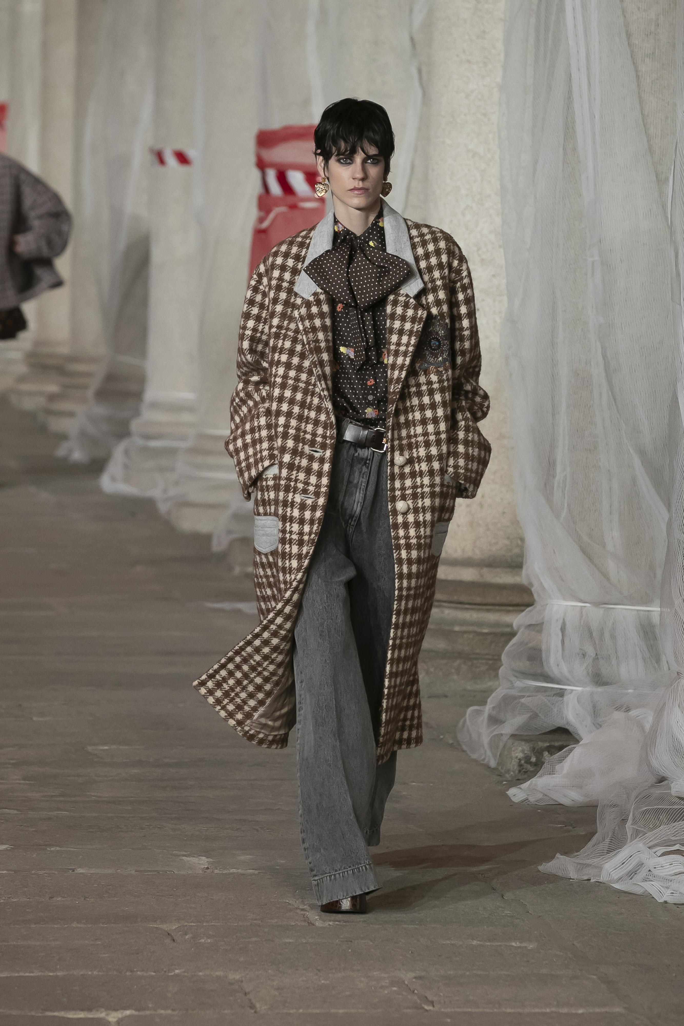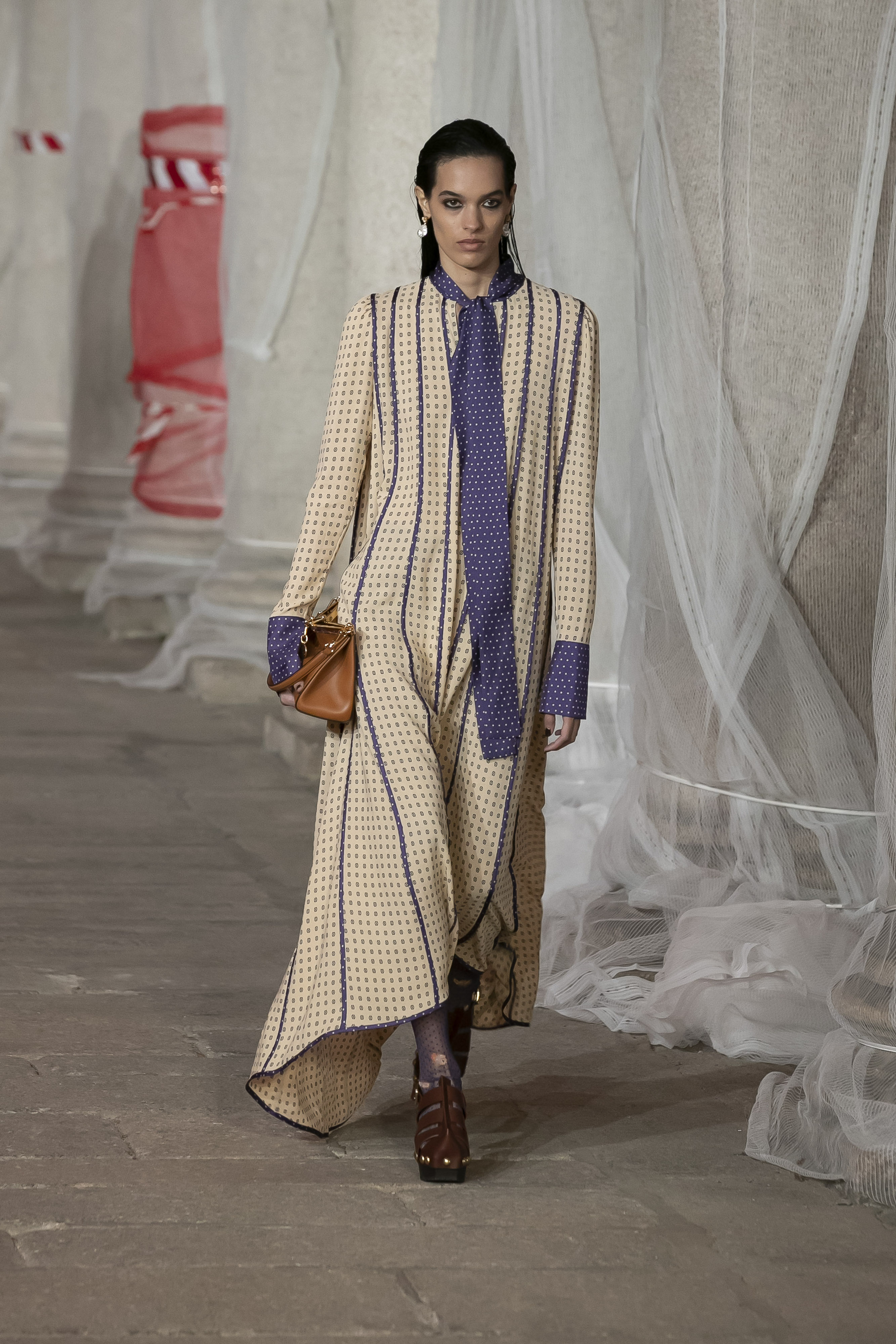 For sure, this choice is quite radical, which is exactly the spirit Marco De Vincenzo is after. Radical as a moment in history which coincides with the foundation of Etro in 1968. Radical, most of all, in the original sense of the word. The origin of radical, in fact, isn’t at all radical. Borrowed from Late Latin radicalis, it means root. The roots of Etro are in fabric and print: tartans, cravatteria motifs and, of course, paisley. All of it comes back today, framed by a new sense of precision, by a psychedelic proclivity for sharp cuts and the rhythm of patterns. Things come together instinctively, as long billowy dresses are paired with droopy, chunky knits, and androgynous trousers and vests are mingled with silk blouses. Tailoring is tall and precise, in opulent fabrications. Necktie motifs swarm on enveloping coats with contrast prints on the inside. Denim pants peek a boo, hinting, indeed, at a radical look. Etro being a whole world, elements of home furnishing are borrowed, with blankets wrapped on light dresses. Fringes dance along the hem of chunky polos and scarves, while applique gives argyle knit a three-dimensional charm.